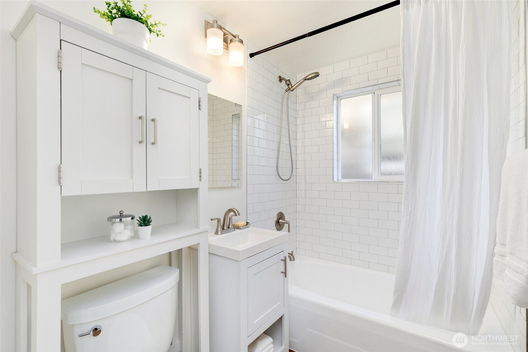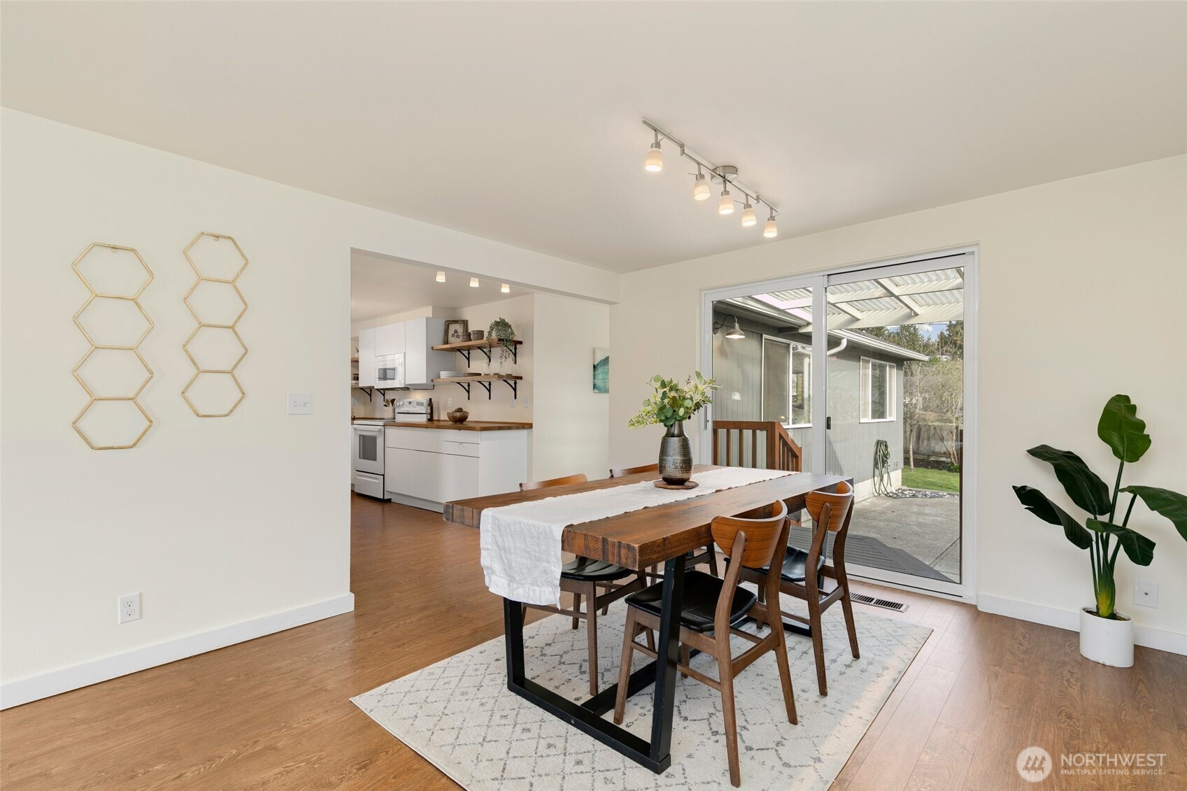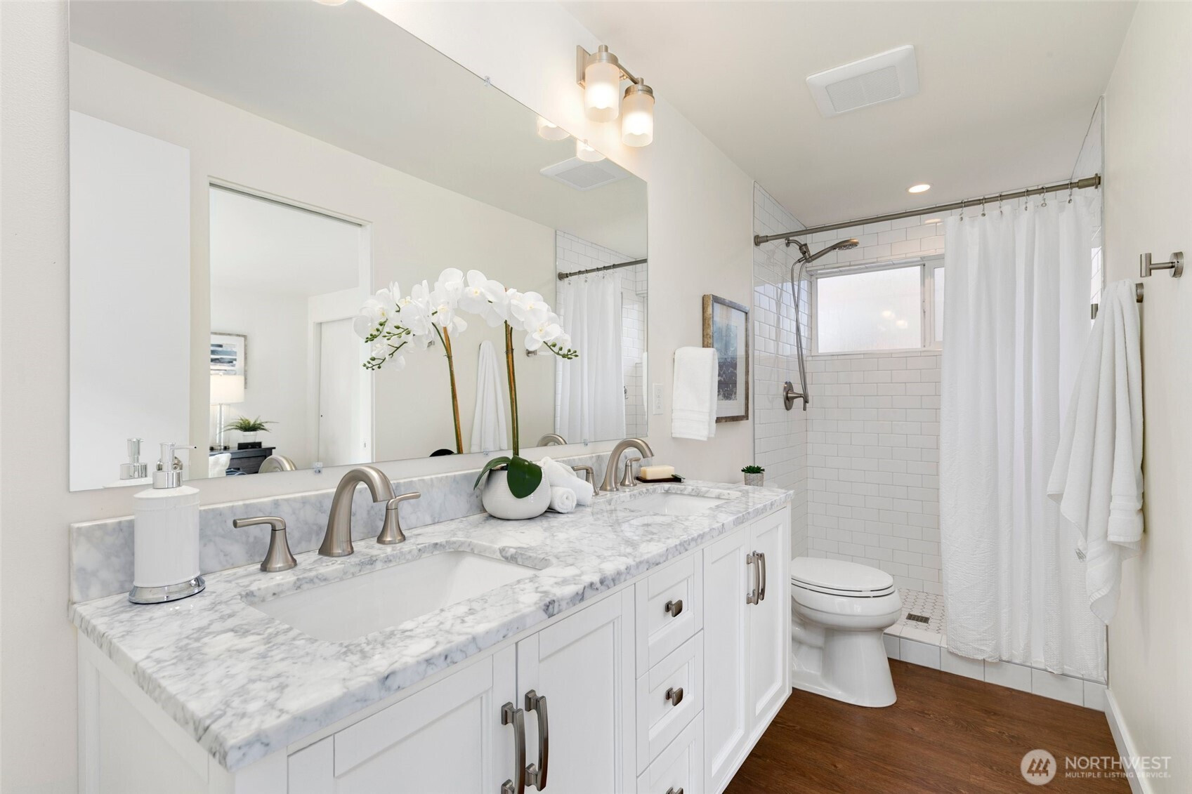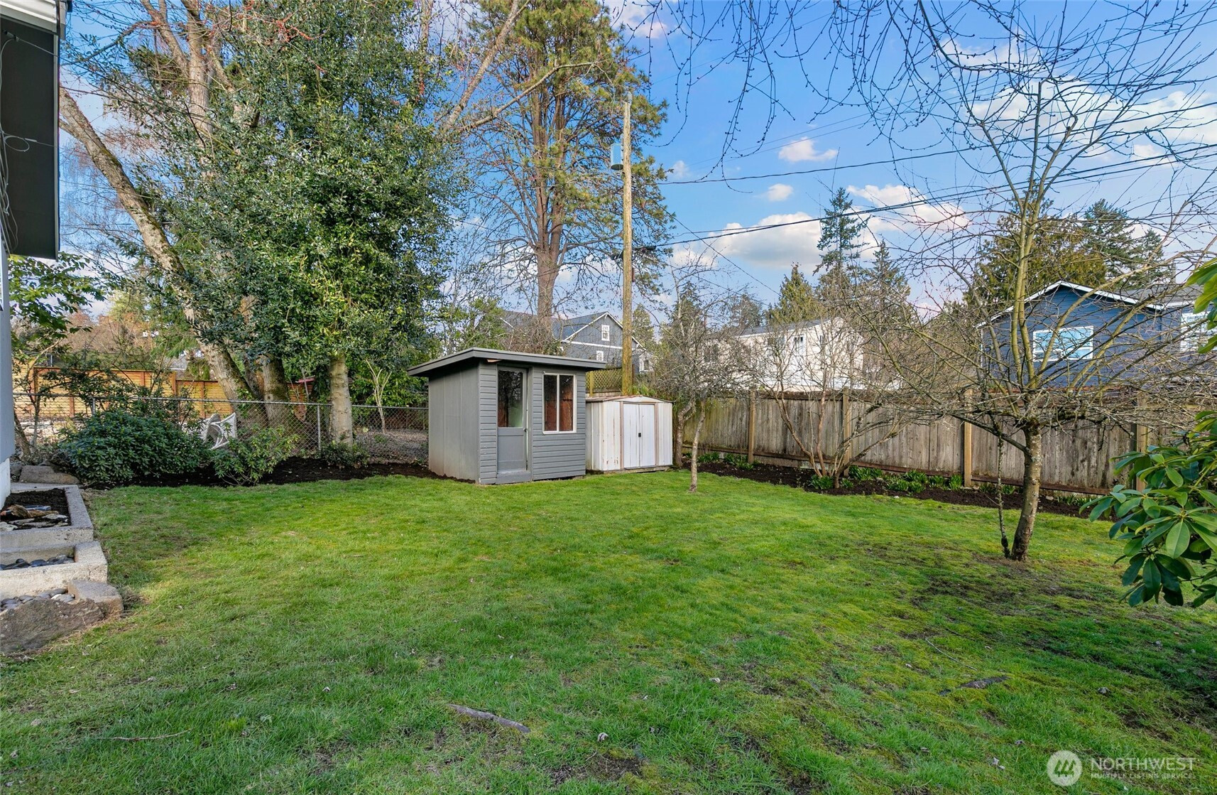 Tucked along a quiet Hawthorne Hills street, this refreshed Midcentury rambler offers effortless one-level living on a generous 6,750 sq ft lot. Sunlight pours through expansive windows highlighting wide-plank luxury vinyl flooring and a classic brick fireplace that anchors the living space. The open layout flows seamlessly into a thoughtfully updated kitchen with crisp cabinetry, butcher block counters, and modern finishes. Sliding doors extend the dining area outdoors to an oversized patio, perfect for summer dinners and relaxed entertaining. The fully fenced backyard features mature landscaping, garden space, and room to roam. Three bedrooms include a spacious primary suite with en-suite bath, plus an additional full guest bath. Attached garage with lofted storage. Updated systems, roof, paint, and stylish kitchen/baths make this move-in ready. Located in sought-after Hawthorne Hills with top-rated schools and unbeatable convenience, you're just minutes to Metropolitan Market, PCC, University Village, neighborhood parks, and everyday amenities. Enjoy quick access to downtown Seattle, the Eastside, UW, and Children's Hospital—making this an exceptional place to call home.