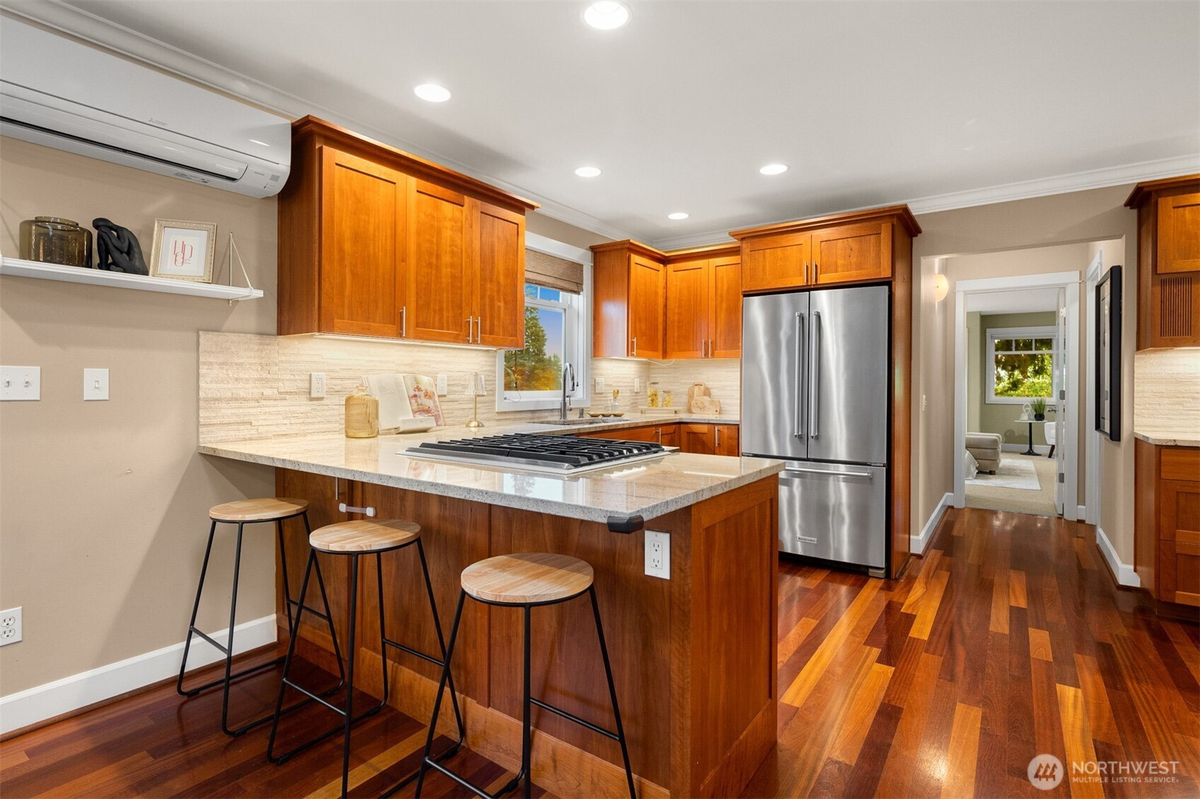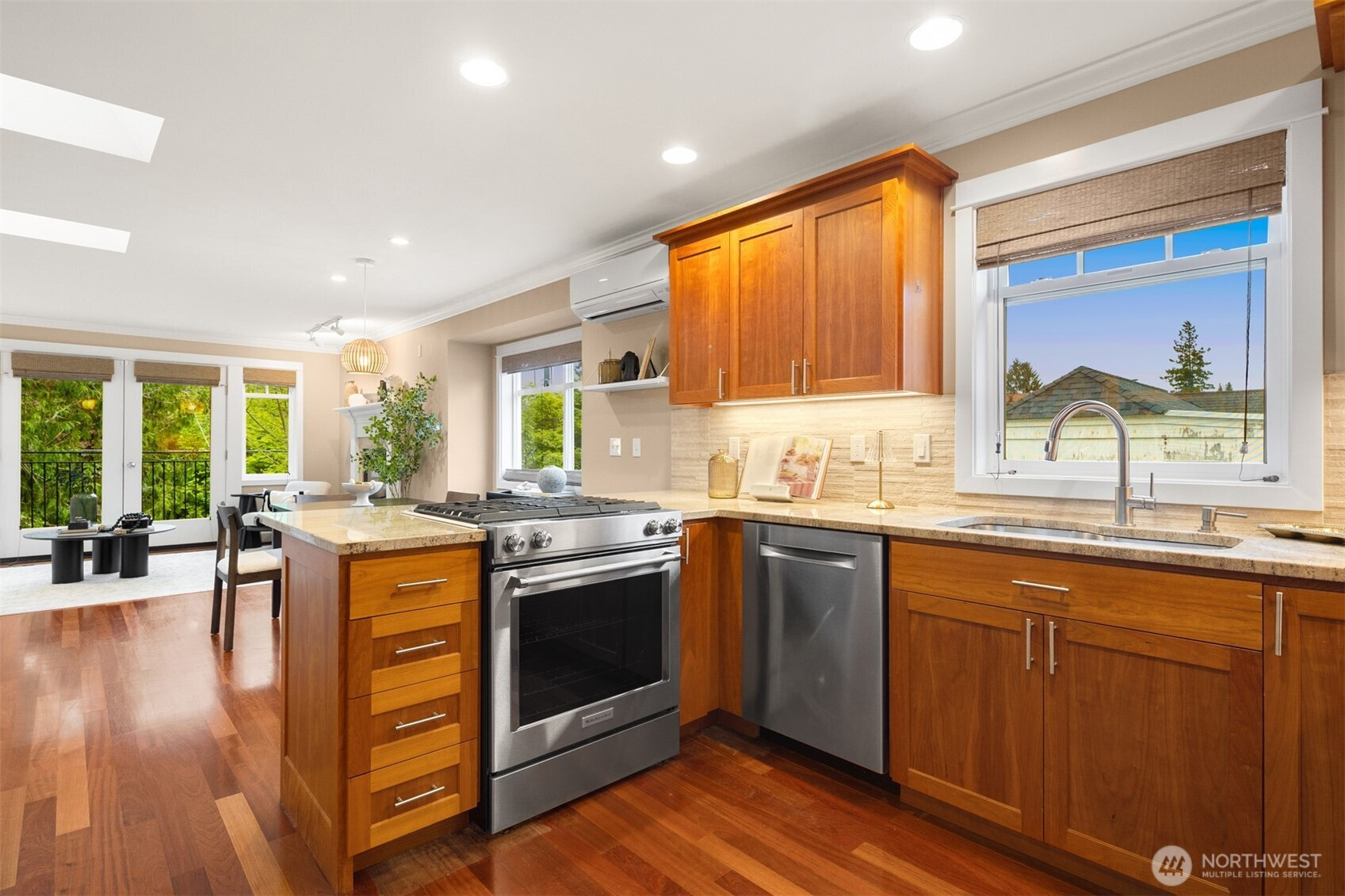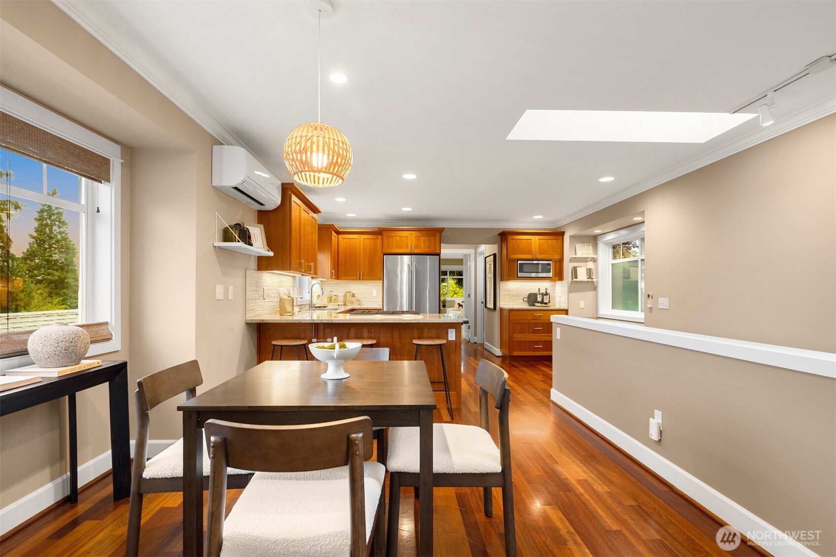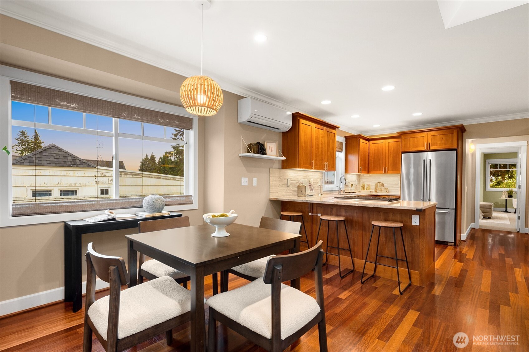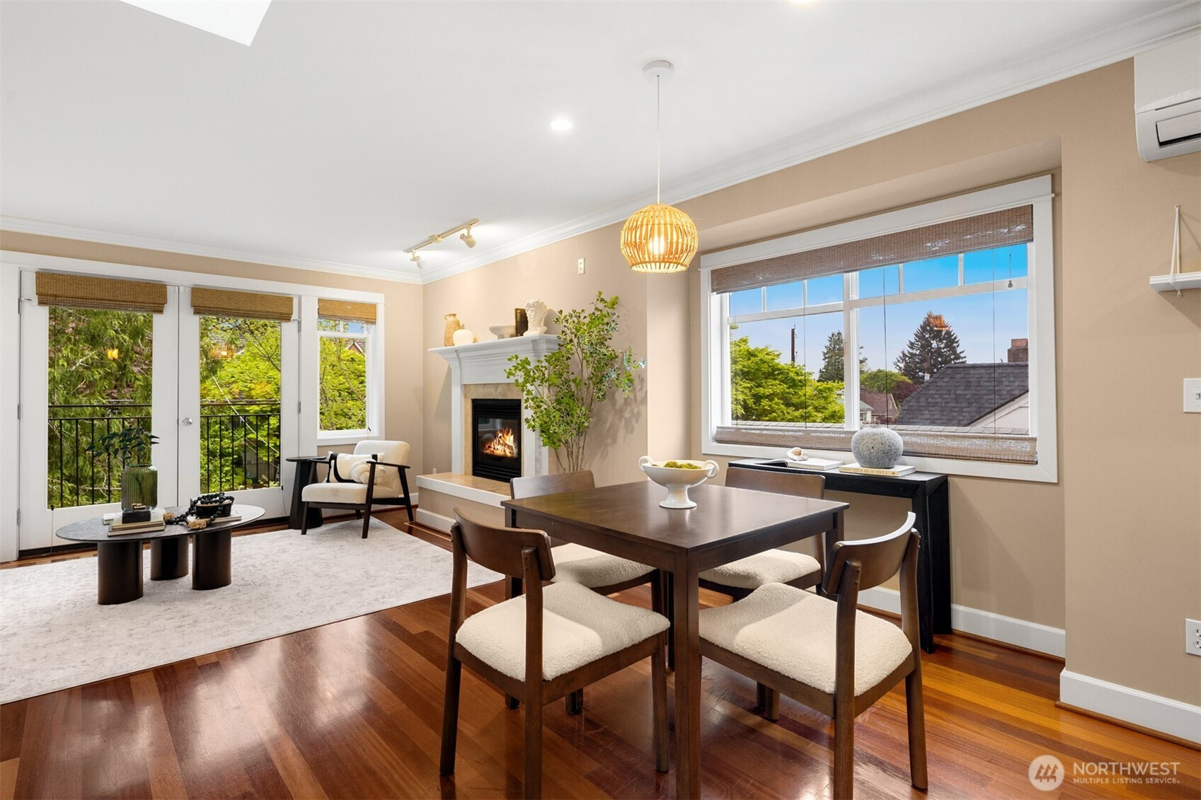 Welcome to this beautifully maintained 2001 Craftsman in the heart of Bryant, offering 1,827 sqft of warm, light-filled living. The upper level features an open-concept layout with rich hardwood floors, a cozy gas fireplace, and seamless flow between the living, dining, and kitchen spaces. The kitchen includes a gas range, bar seating, ample cabinetry, and a bar nook, perfect for entertaining or everyday living. The large primary suite features an ensuite bath, oversized walk-in shower and dual closets. Downstairs, enjoy a second living room with another gas fireplace, two additional bedrooms, and a full bath, ideal for guests, work-from-home, or flexible living. Mini-split heat pump A/C provides efficient comfort throughout. Step outside down the spiral staircase to your private, low-maintenance backyard oasis with a paver patio, creating the perfect setting to relax or host. A 2-car tandem garage offers over 800 sqft with two large storage rooms, giving you plenty of space for parking and storage. Just minutes from University Village, the Burke-Gilman Trail, Metropolitan Market, parks, cafes, and top-rated schools, this home offers incredible walkability with easy access to some of Northeast Seattle’s best amenities. Welcome home!