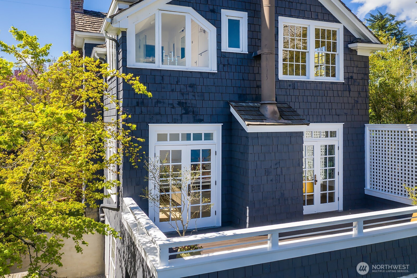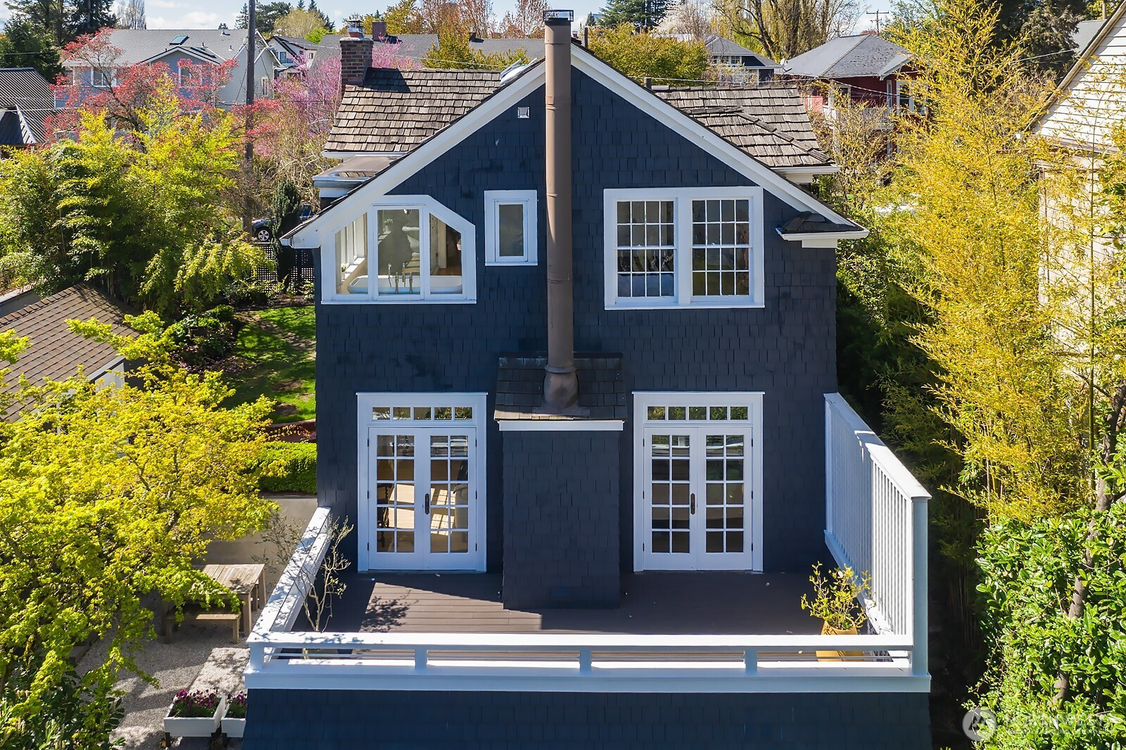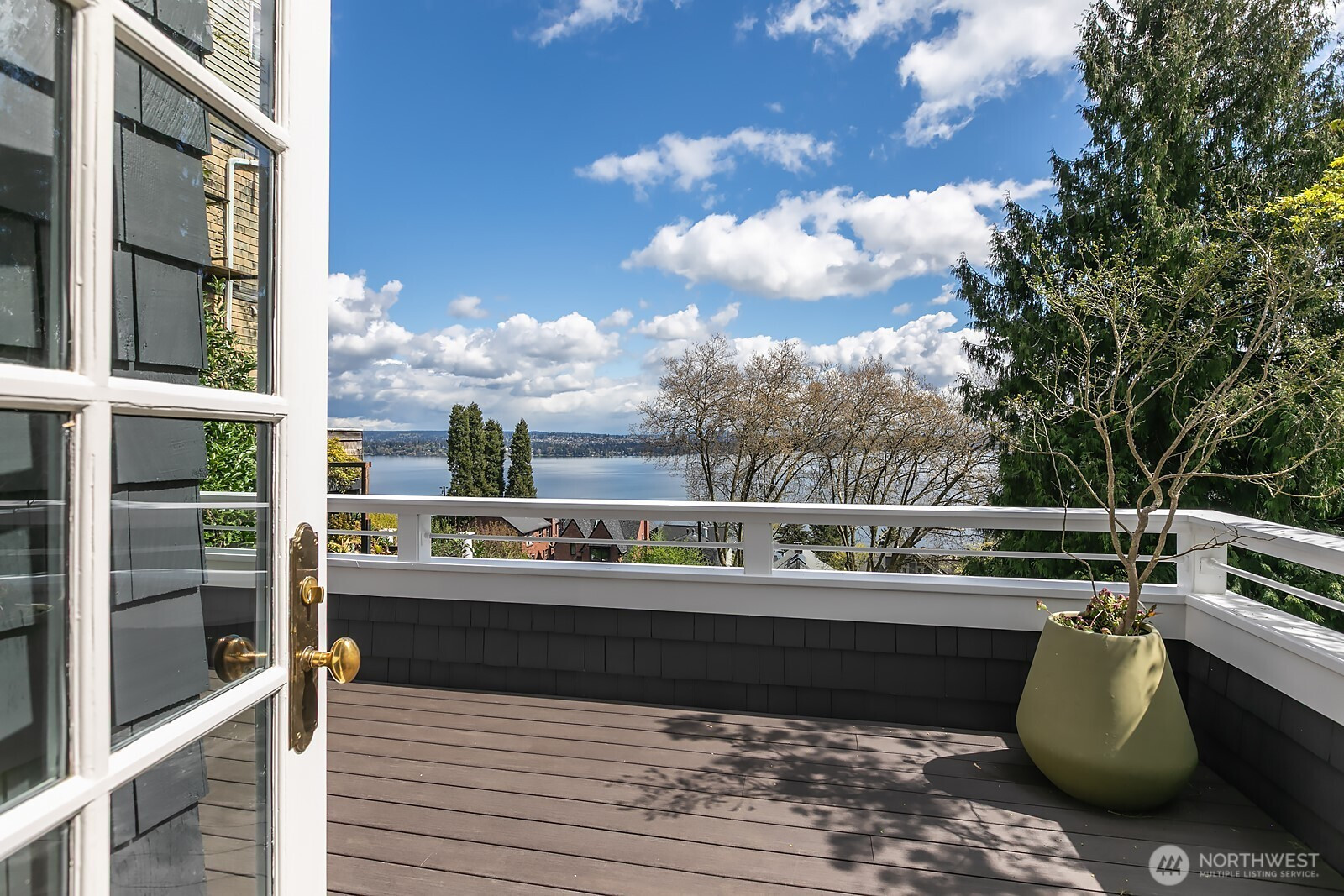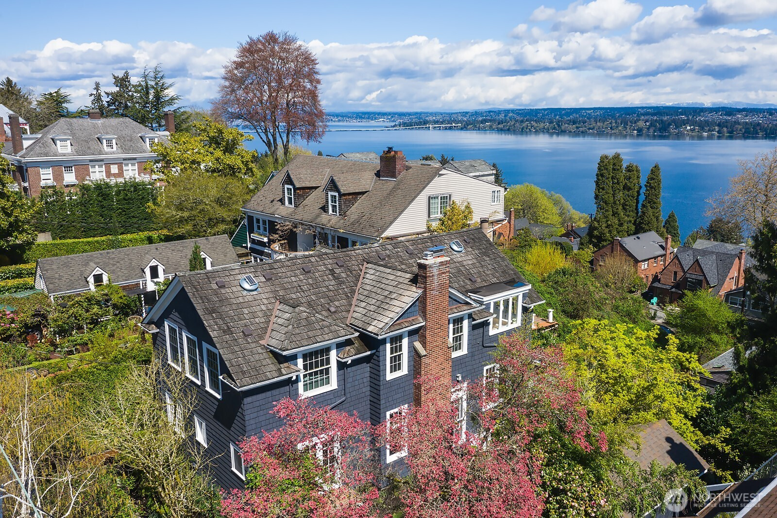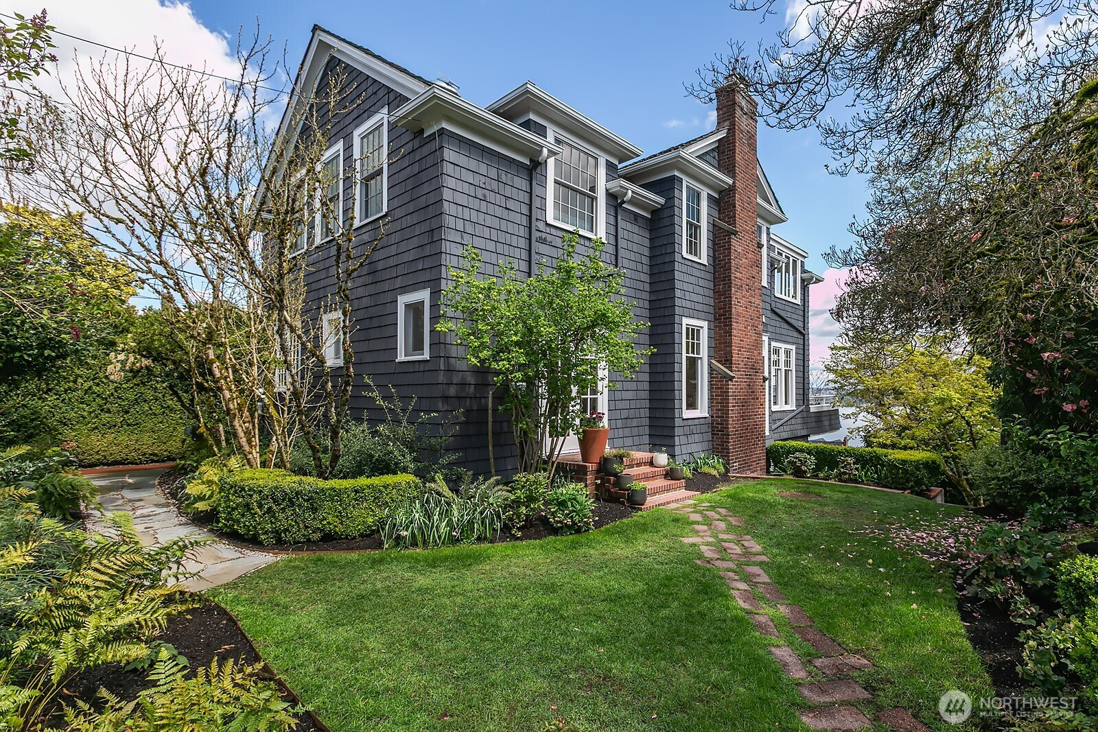 On a quiet, tree-lined street just steps from the lookout point on coveted 35th Avenue in Madrona, this stately 1906 Colonial, architecturally reminiscent of Ellsworth Storey, blends timeless character with refined modern living. Tucked behind a latched gate surrounded by private gardens, the home opens to soaring ceilings and a sweeping staircase. The formal living room features beamed ceilings and a wood-burning fireplace, with French doors opening to an outdoor terrace with treetop and Lake Washington views. A sun-filled study with built-ins and fireplace, elegant powder room, and formal dining room with garden access maintain the character of the home with classic period details. The kitchen offers floor-to-ceiling cabinetry, granite counters, luxury appliances, and western light. Upstairs, two bedrooms share a classic black and white tiled full bath, while the primary suite features a fireplace with original mural intact. A newly installed ensuite bath showcases a walk-in marble shower and elegant porcelain Waterworks tub set beneath a bay of windows with picturesque lake views. The spacious lower level offers a recreation area and a separate entry with ADU potential. Fully enclosed gardens with charming flagstone path, mature plantings, and a lower seating area beneath a majestic maple. A/C, alarm system, electric charging station. Stroll to Madrona shops, trails, and shores of Lake Washington. A sophisticated and private residence in a charming neighborhood setting.