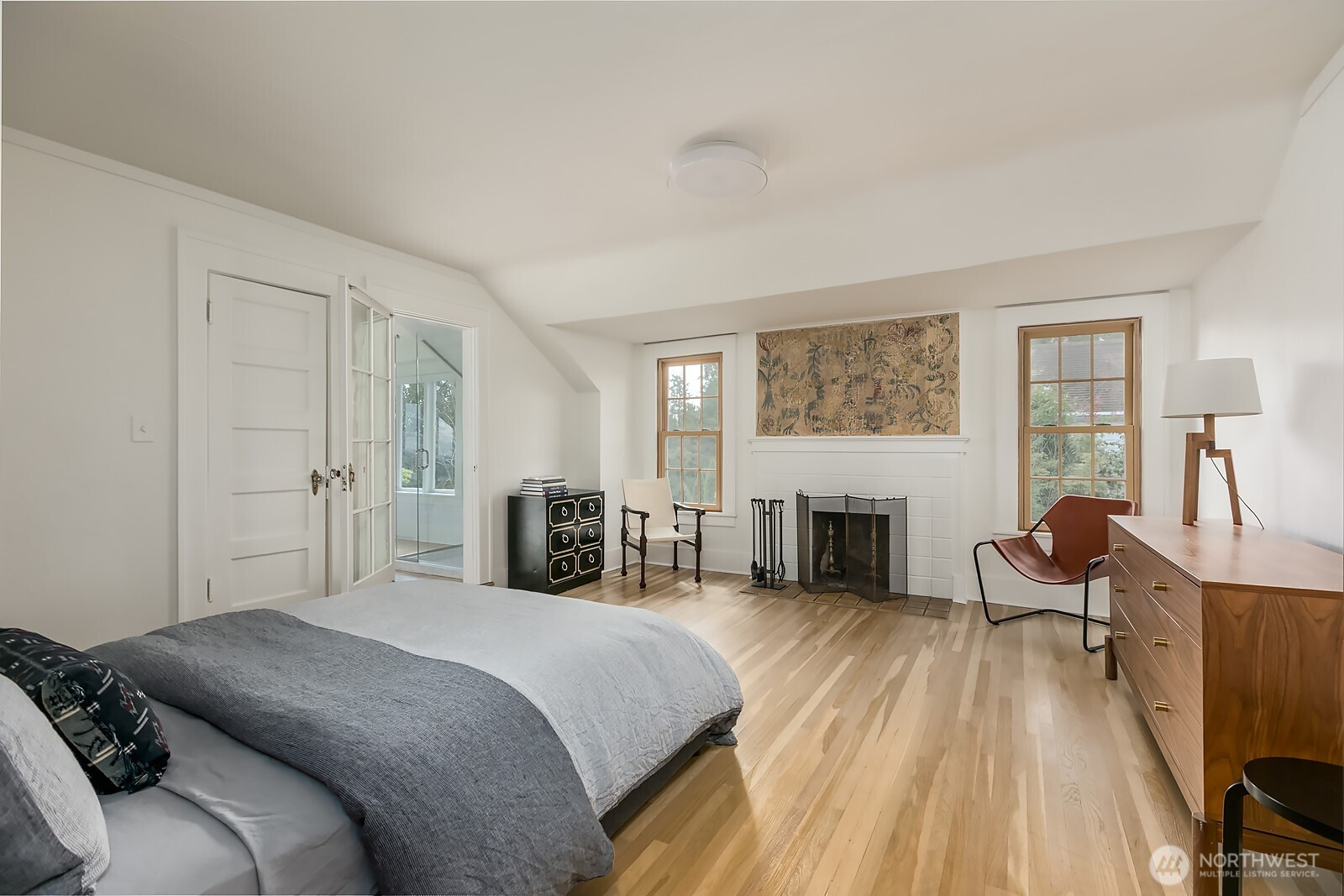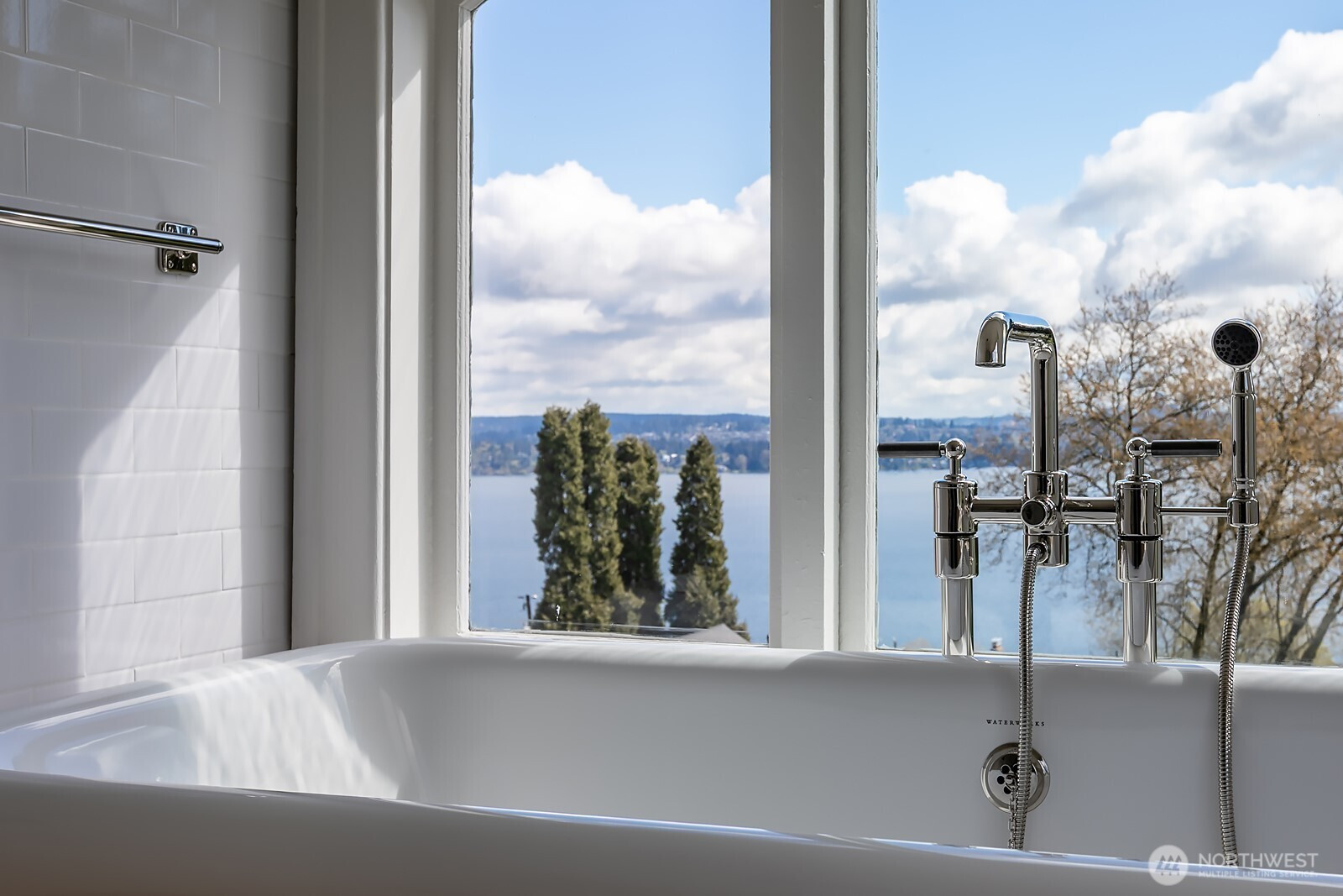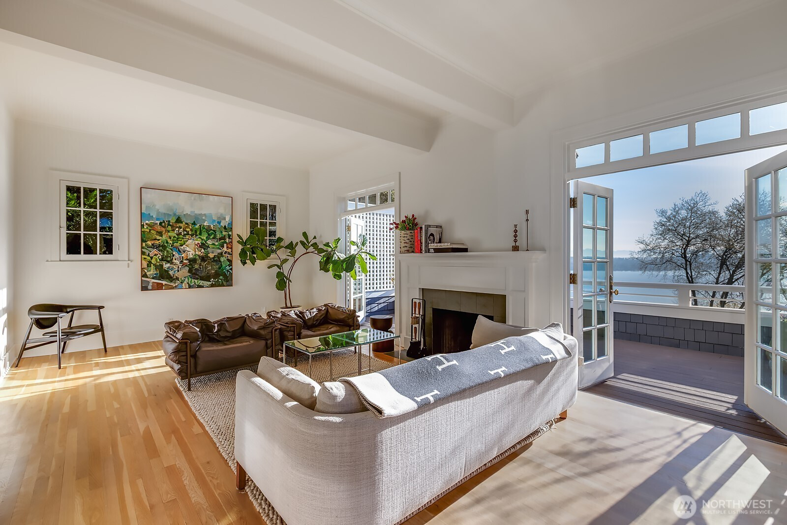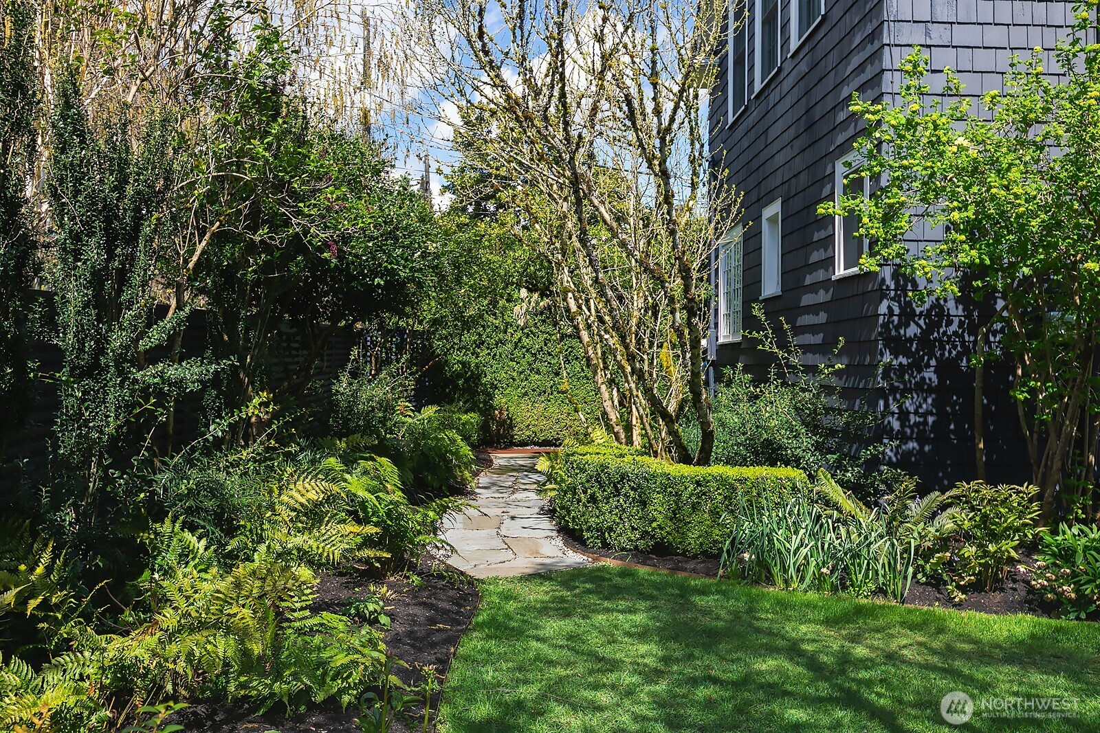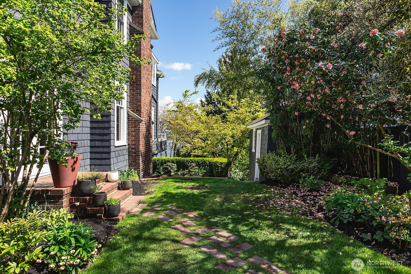 On a quiet, tree-lined street just steps from the lookout point on coveted 35th Avenue in Madrona, this stately 1906 Colonial, architecturally reminiscent of Ellsworth Storey, blends timeless character with refined modern living. Tucked behind a latched gate surrounded by private gardens, the home opens to soaring ceilings and a sweeping staircase. The formal living room features beamed ceilings and a wood-burning fireplace, with French doors opening to an outdoor terrace with treetop and Lake Washington views. A sun-filled study with built-ins and fireplace, elegant powder room, and formal dining room with garden access maintain the character of the home with classic period details. The kitchen offers floor-to-ceiling cabinetry, granite counters, luxury appliances, and western light. Upstairs, two bedrooms share a classic black and white tiled full bath, while the primary suite features a fireplace with original mural intact. A newly installed ensuite bath showcases a walk-in marble shower and elegant porcelain Waterworks tub set beneath a bay of windows with picturesque lake views. The spacious lower level offers a recreation area and a separate entry with ADU potential. Fully enclosed gardens with charming flagstone path, mature plantings, and a lower seating area beneath a majestic maple. A/C, alarm system, electric charging station. Stroll to Madrona shops, trails, and shores of Lake Washington. A sophisticated and private residence in a charming neighborhood setting.
