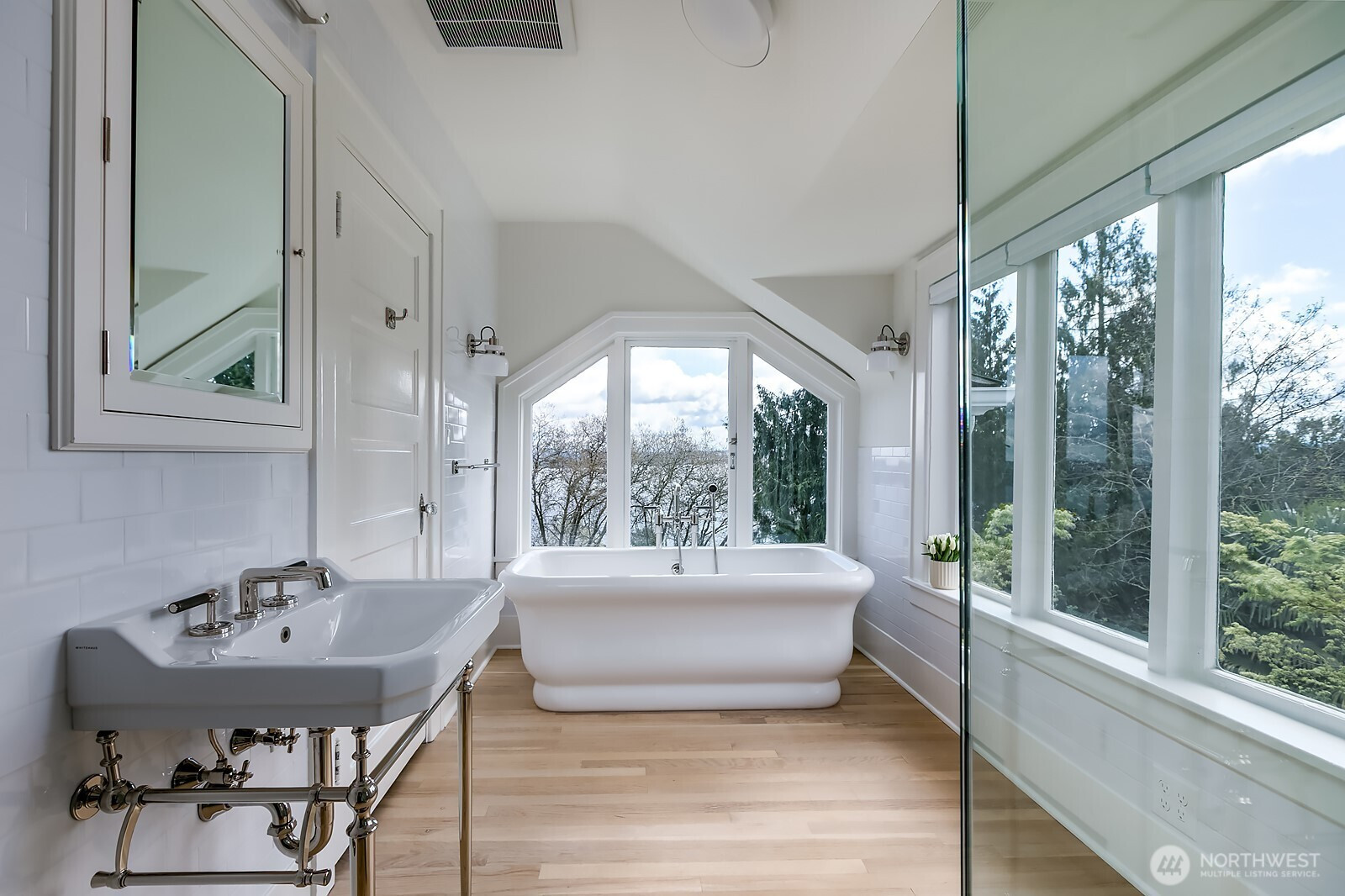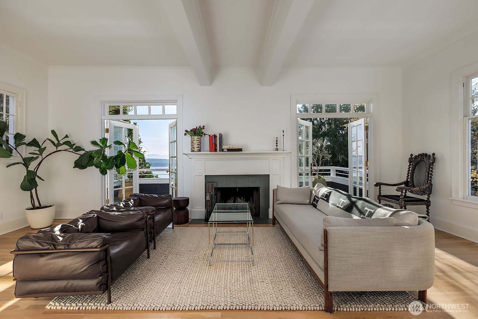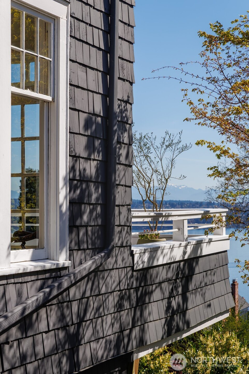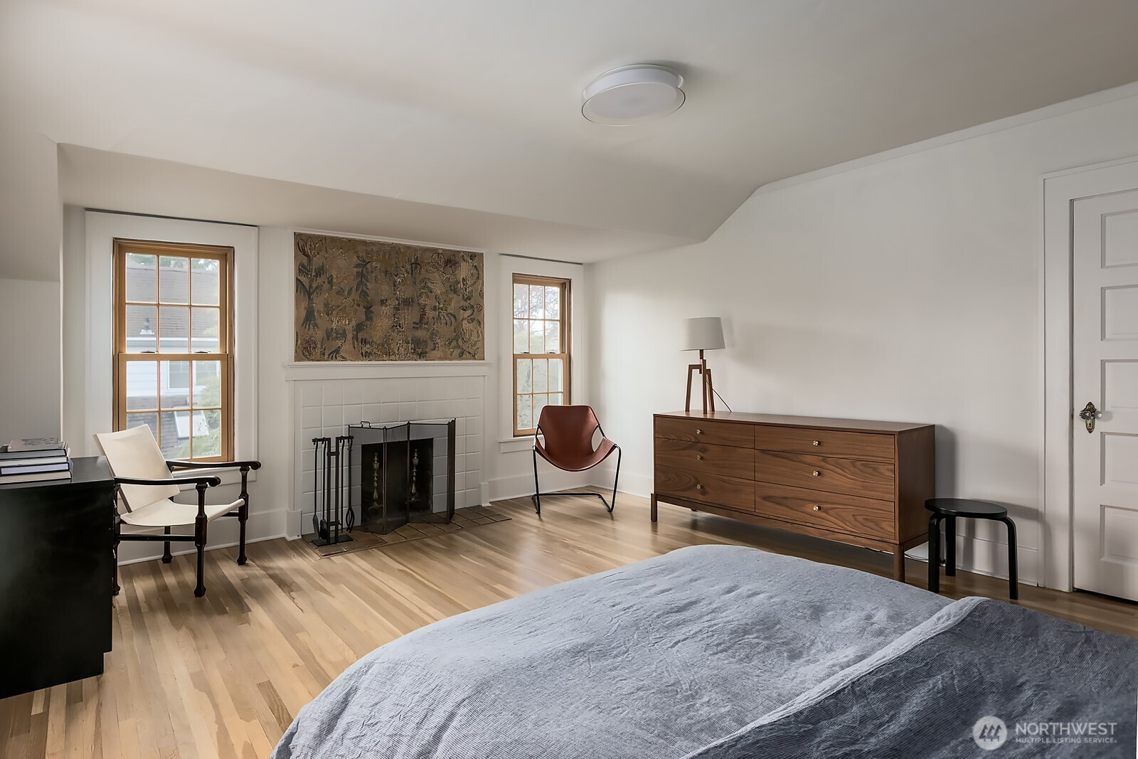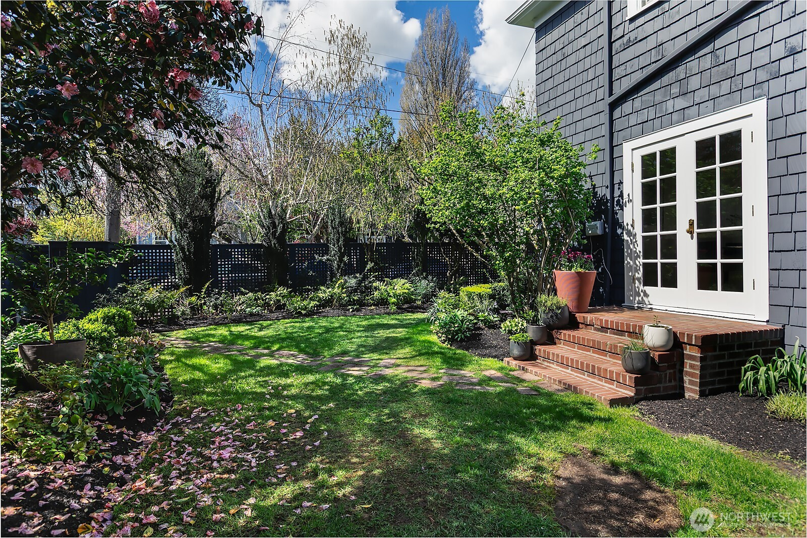 On a quiet, tree-lined street just steps from the lookout point on coveted 35th Avenue in Madrona, this stately 1906 Colonial, architecturally reminiscent of Ellsworth Storey, blends timeless character with refined modern living. Tucked behind a latched gate surrounded by private gardens, the home opens to soaring ceilings and a sweeping staircase. The formal living room features beamed ceilings and a wood-burning fireplace, with French doors opening to an outdoor terrace with treetop and Lake Washington views. A sun-filled study with built-ins and fireplace, elegant powder room, and formal dining room with garden access maintain the character of the home with classic period details. The kitchen offers floor-to-ceiling cabinetry, granite counters, luxury appliances, and western light. Upstairs, two bedrooms share a classic black and white tiled full bath, while the primary suite features a fireplace with original mural intact. A newly installed ensuite bath showcases a walk-in marble shower and elegant porcelain Waterworks tub set beneath a bay of windows with picturesque lake views. The spacious lower level offers a recreation area and a separate entry with ADU potential. Fully enclosed gardens with charming flagstone path, mature plantings, and a lower seating area beneath a majestic maple. A/C, alarm system, electric charging station. Stroll to Madrona shops, trails, and shores of Lake Washington. A sophisticated and private residence in a charming neighborhood setting.