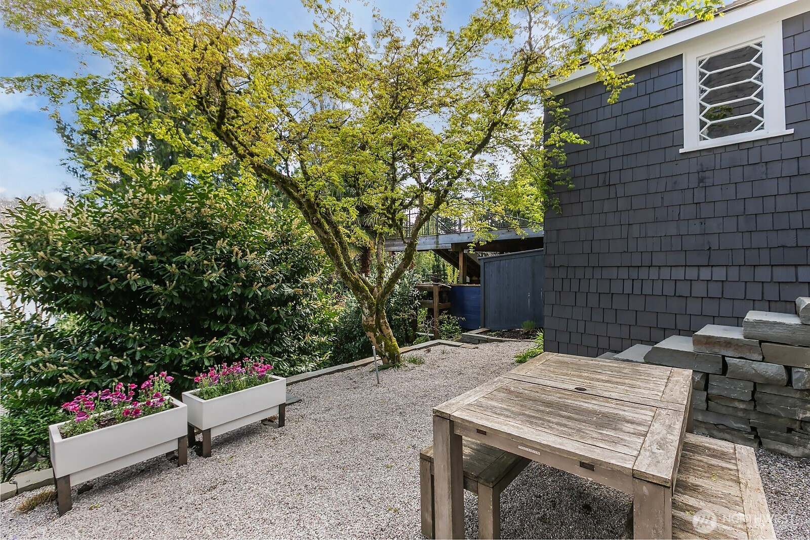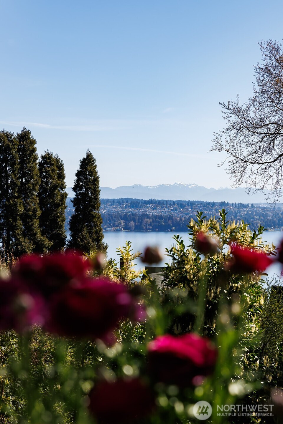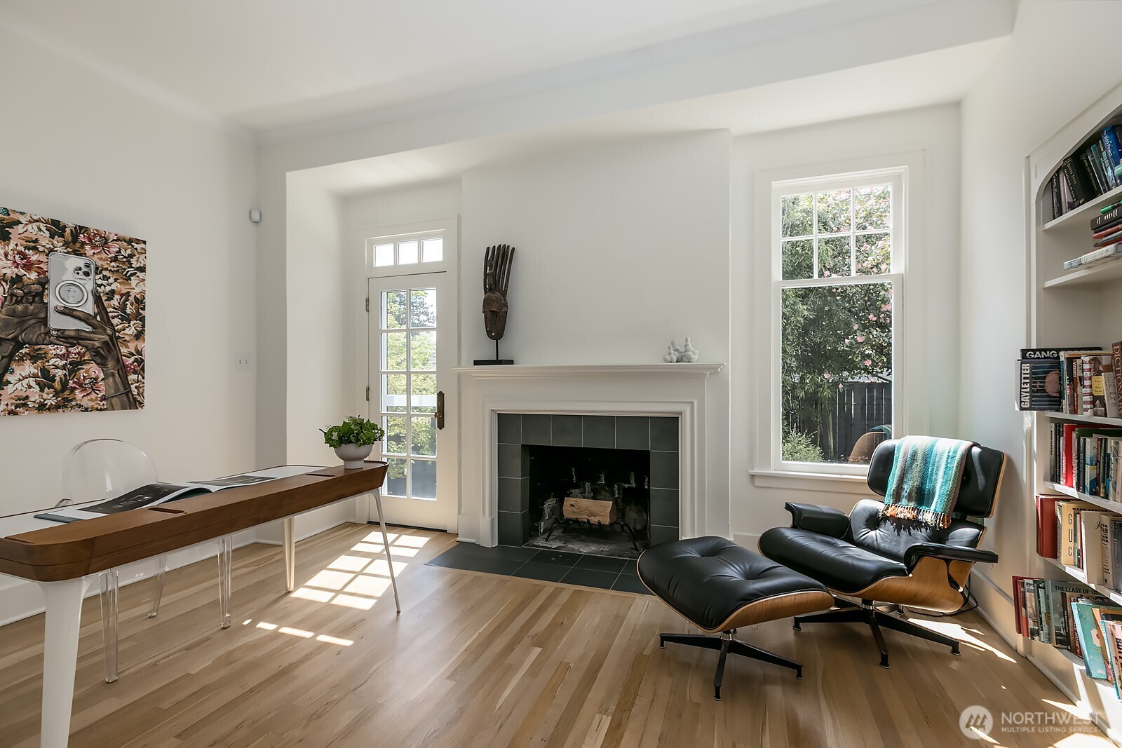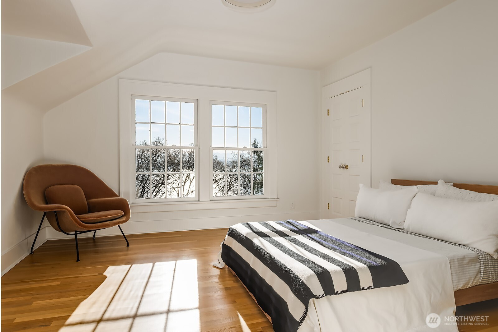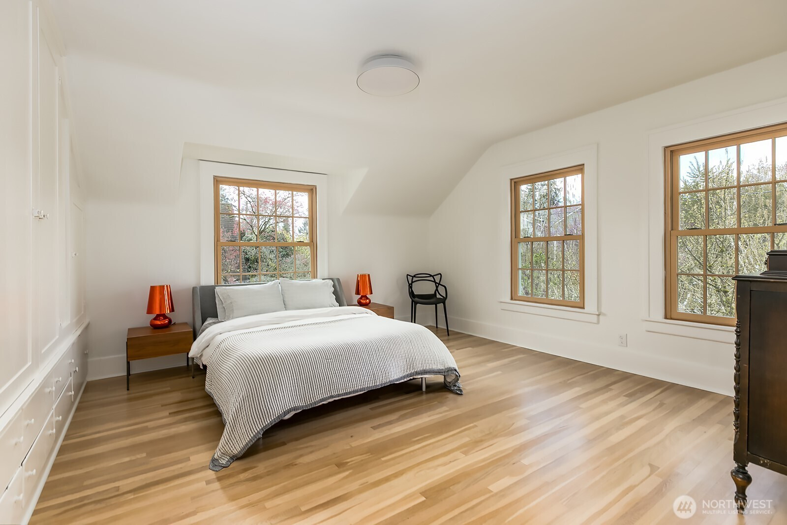 On a quiet, tree-lined street just steps from the lookout point on coveted 35th Avenue in Madrona, this stately 1906 Colonial, architecturally reminiscent of Ellsworth Storey, blends timeless character with refined modern living. Tucked behind a latched gate surrounded by private gardens, the home opens to soaring ceilings and a sweeping staircase. The formal living room features beamed ceilings and a wood-burning fireplace, with French doors opening to an outdoor terrace with treetop and Lake Washington views. A sun-filled study with built-ins and fireplace, elegant powder room, and formal dining room with garden access maintain the character of the home with classic period details. The kitchen offers floor-to-ceiling cabinetry, granite counters, luxury appliances, and western light. Upstairs, two bedrooms share a classic black and white tiled full bath, while the primary suite features a fireplace with original mural intact. A newly installed ensuite bath showcases a walk-in marble shower and elegant porcelain Waterworks tub set beneath a bay of windows with picturesque lake views. The spacious lower level offers a recreation area and a separate entry with ADU potential. Fully enclosed gardens with charming flagstone path, mature plantings, and a lower seating area beneath a majestic maple. A/C, alarm system, electric charging station. Stroll to Madrona shops, trails, and shores of Lake Washington. A sophisticated and private residence in a charming neighborhood setting.