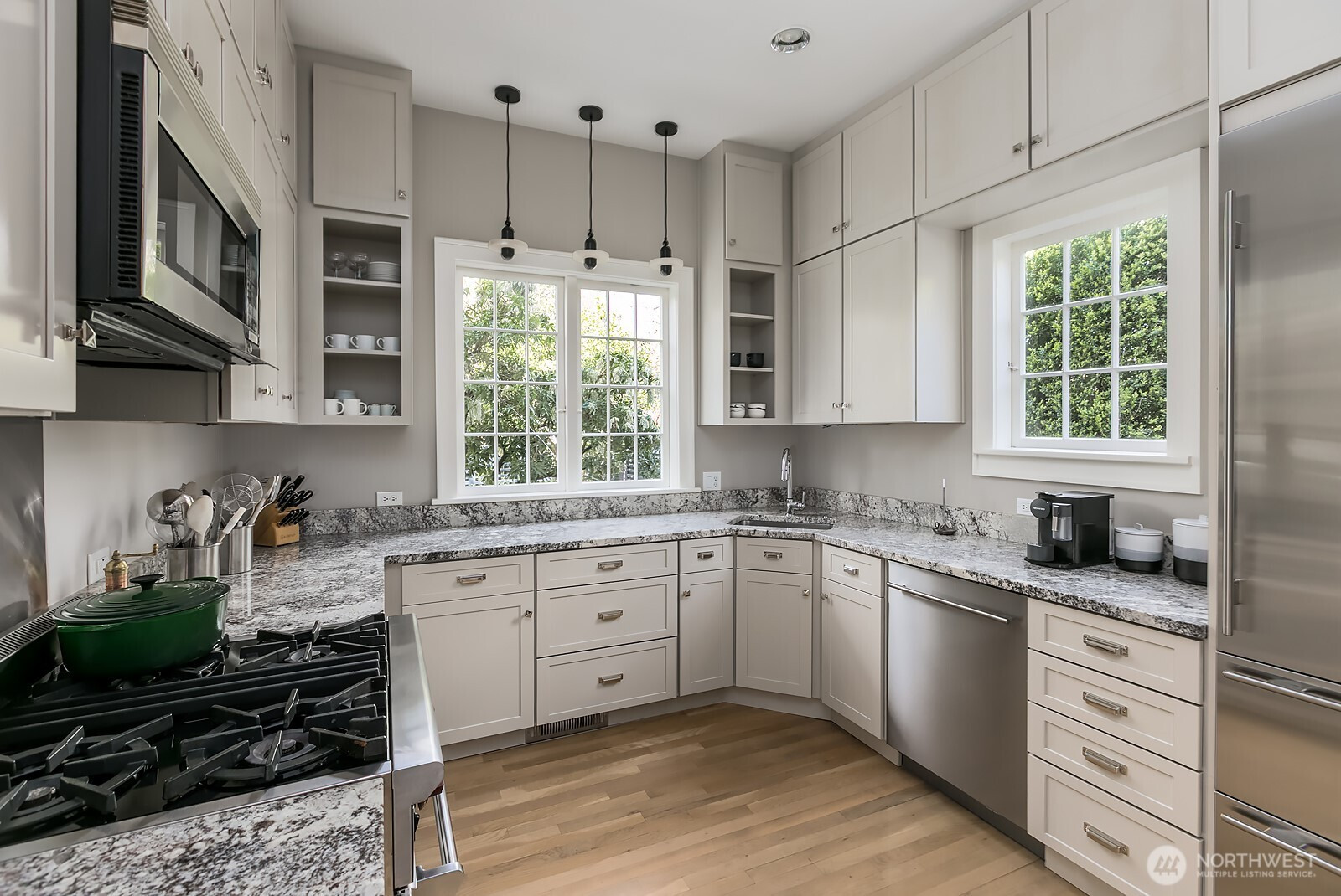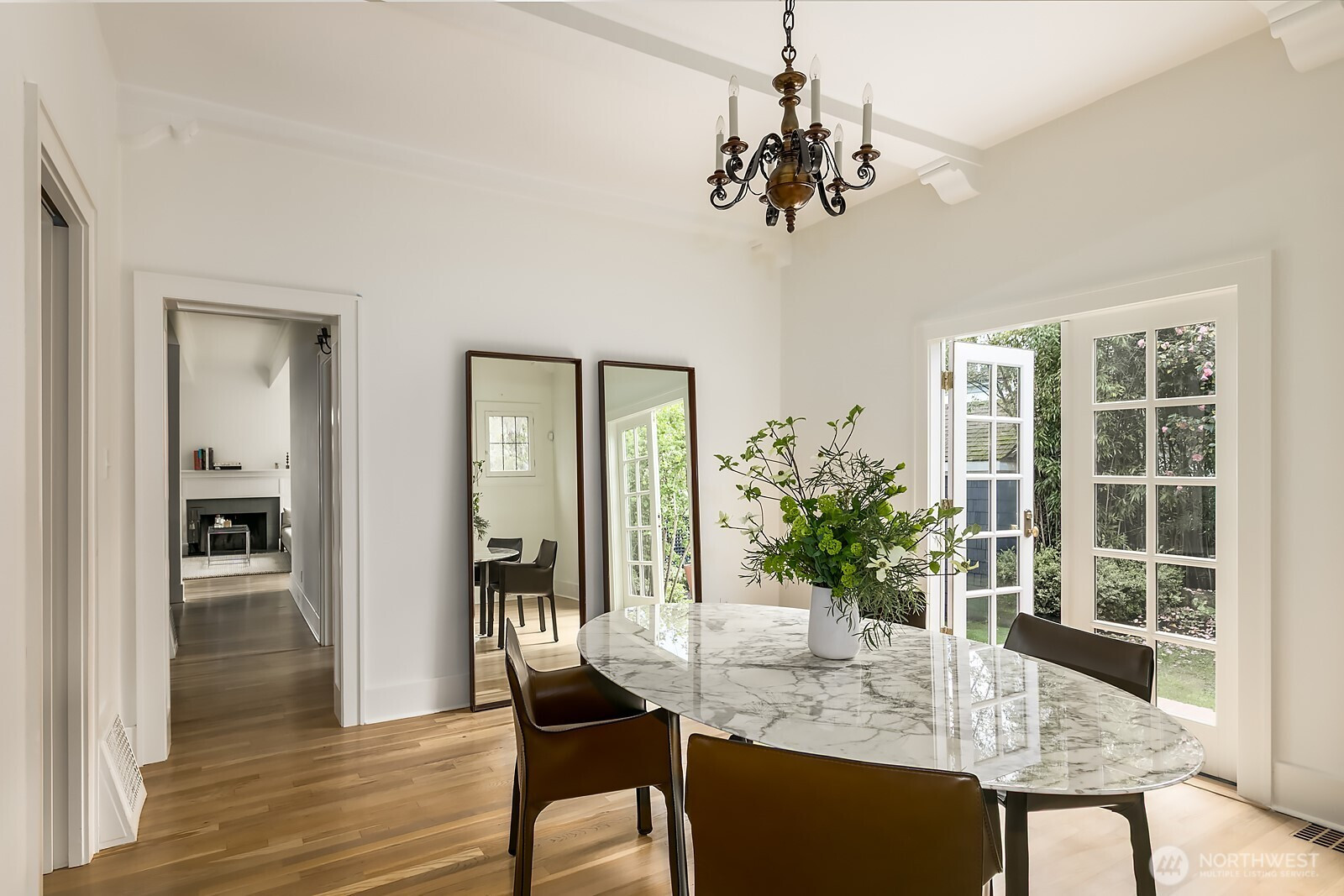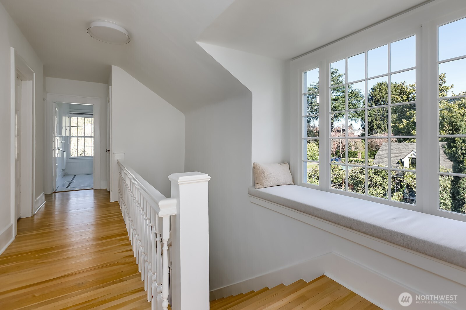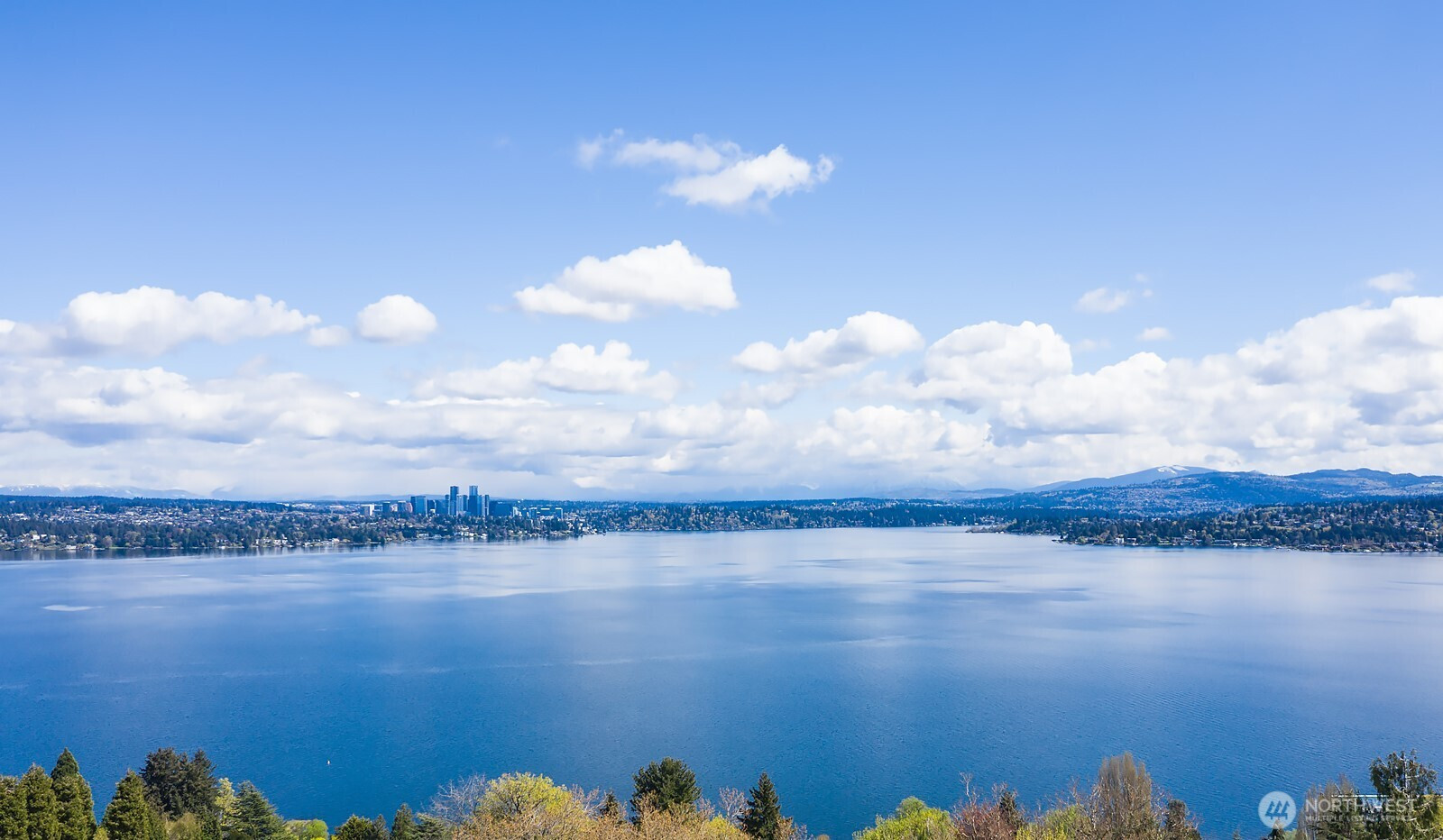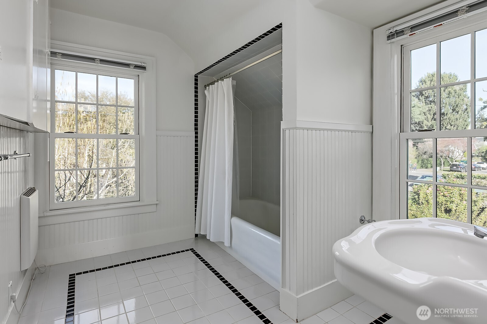 On a quiet, tree-lined street just steps from the lookout point on coveted 35th Avenue in Madrona, this stately 1906 Colonial, architecturally reminiscent of Ellsworth Storey, blends timeless character with refined modern living. Tucked behind a latched gate surrounded by private gardens, the home opens to soaring ceilings and a sweeping staircase. The formal living room features beamed ceilings and a wood-burning fireplace, with French doors opening to an outdoor terrace with treetop and Lake Washington views. A sun-filled study with built-ins and fireplace, elegant powder room, and formal dining room with garden access maintain the character of the home with classic period details. The kitchen offers floor-to-ceiling cabinetry, granite counters, luxury appliances, and western light. Upstairs, two bedrooms share a classic black and white tiled full bath, while the primary suite features a fireplace with original mural intact. A newly installed ensuite bath showcases a walk-in marble shower and elegant porcelain Waterworks tub set beneath a bay of windows with picturesque lake views. The spacious lower level offers a recreation area and a separate entry with ADU potential. Fully enclosed gardens with charming flagstone path, mature plantings, and a lower seating area beneath a majestic maple. A/C, alarm system, electric charging station. Stroll to Madrona shops, trails, and shores of Lake Washington. A sophisticated and private residence in a charming neighborhood setting.