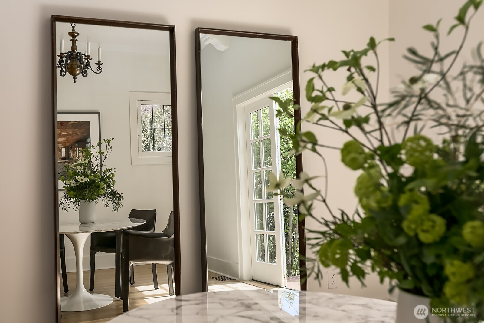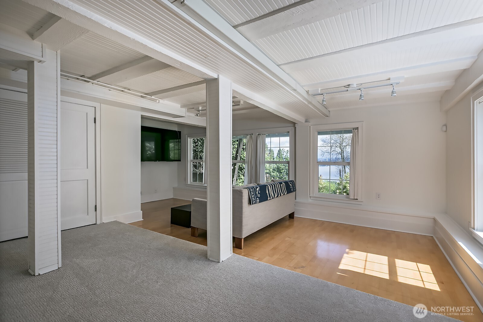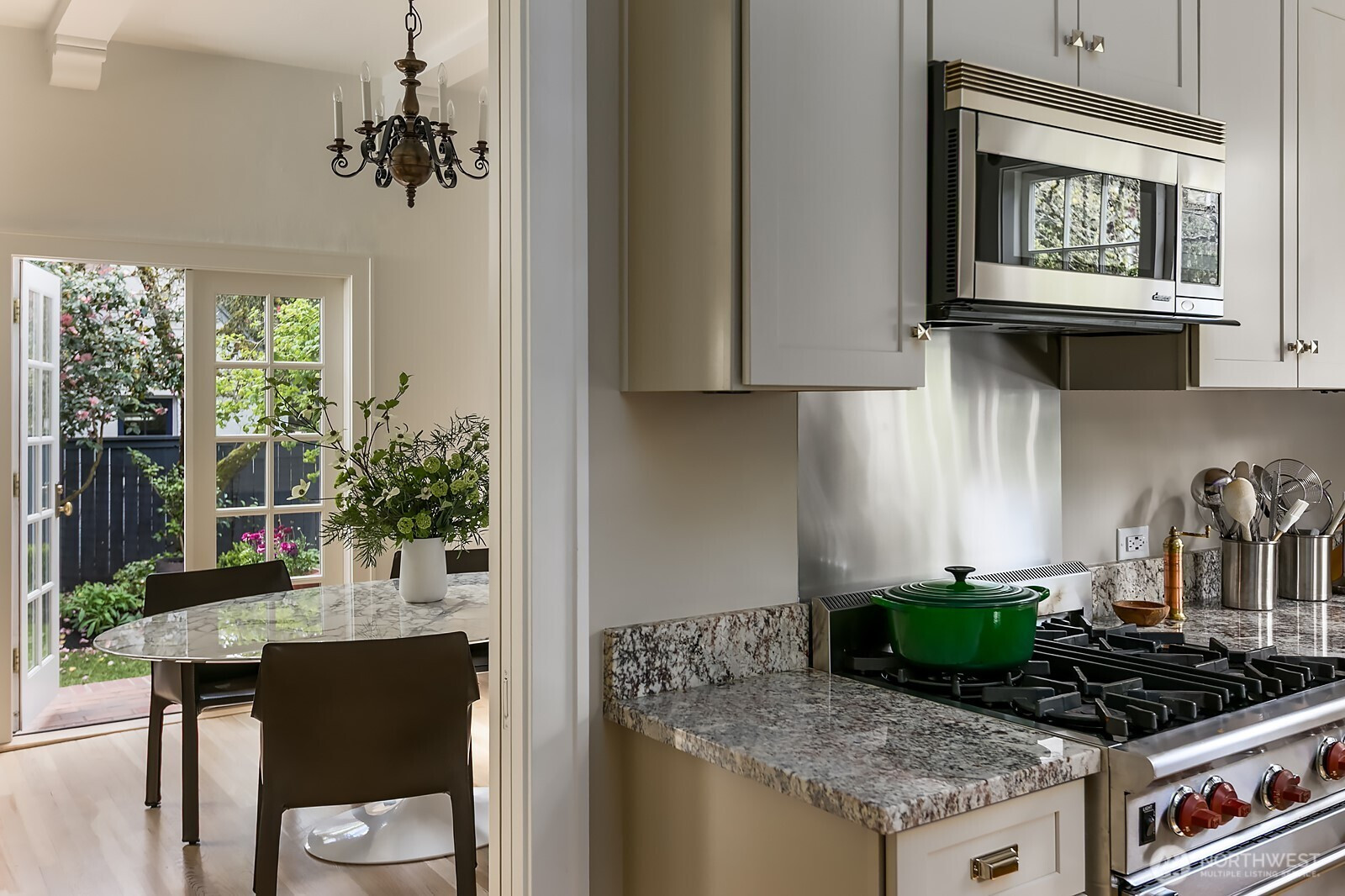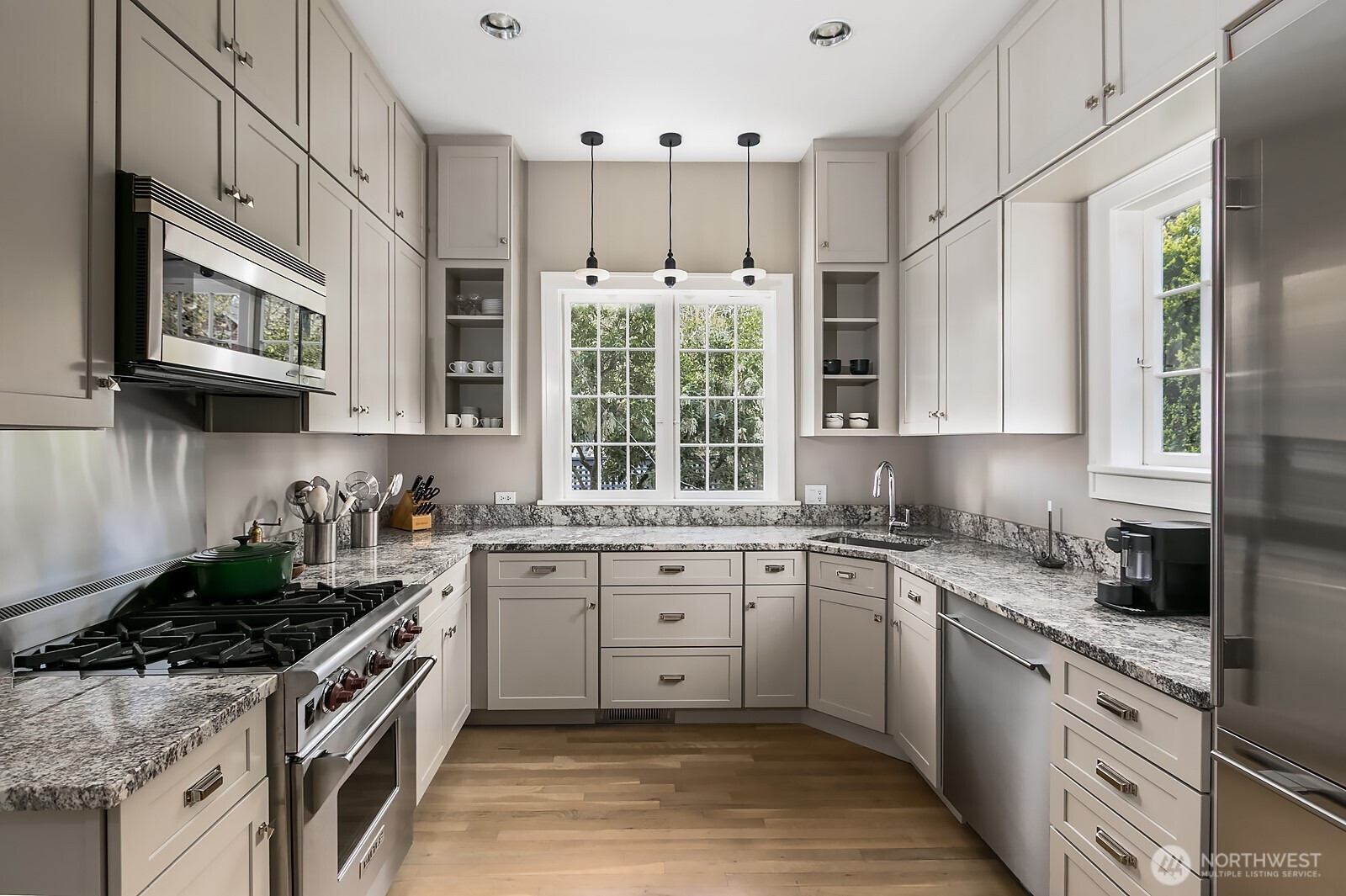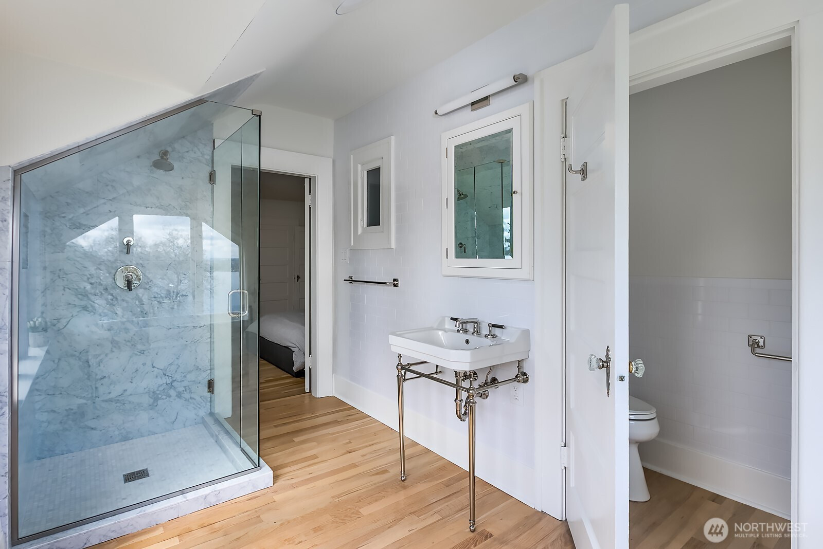 On a quiet, tree-lined street just steps from the lookout point on coveted 35th Avenue in Madrona, this stately 1906 Colonial, architecturally reminiscent of Ellsworth Storey, blends timeless character with refined modern living. Tucked behind a latched gate surrounded by private gardens, the home opens to soaring ceilings and a sweeping staircase. The formal living room features beamed ceilings and a wood-burning fireplace, with French doors opening to an outdoor terrace with treetop and Lake Washington views. A sun-filled study with built-ins and fireplace, elegant powder room, and formal dining room with garden access maintain the character of the home with classic period details. The kitchen offers floor-to-ceiling cabinetry, granite counters, luxury appliances, and western light. Upstairs, two bedrooms share a classic black and white tiled full bath, while the primary suite features a fireplace with original mural intact. A newly installed ensuite bath showcases a walk-in marble shower and elegant porcelain Waterworks tub set beneath a bay of windows with picturesque lake views. The spacious lower level offers a recreation area and a separate entry with ADU potential. Fully enclosed gardens with charming flagstone path, mature plantings, and a lower seating area beneath a majestic maple. A/C, alarm system, electric charging station. Stroll to Madrona shops, trails, and shores of Lake Washington. A sophisticated and private residence in a charming neighborhood setting.