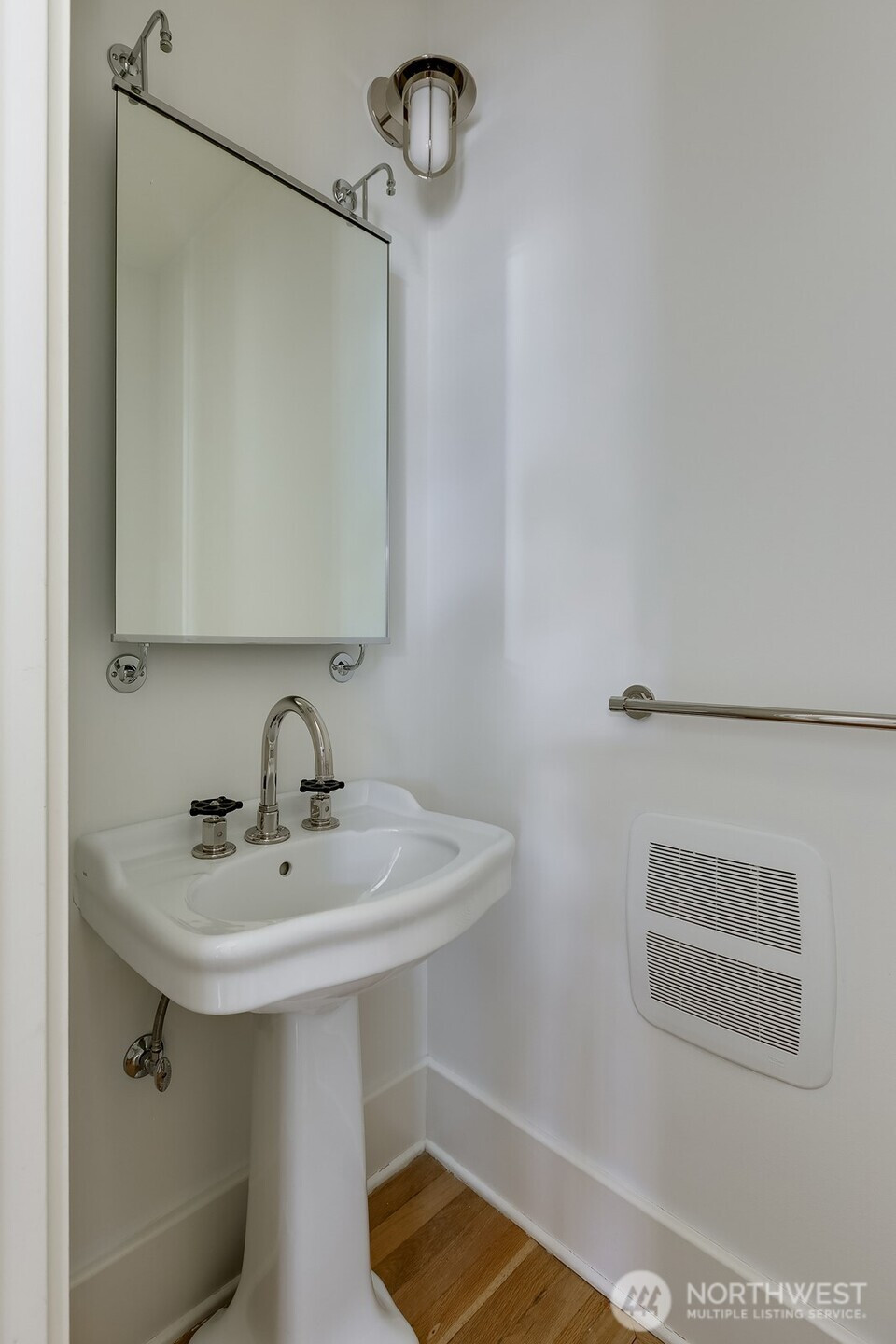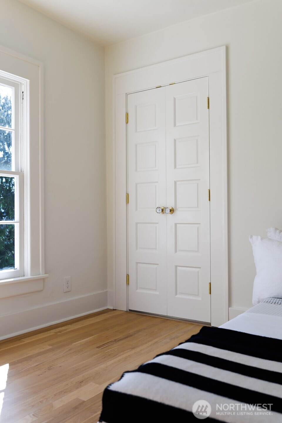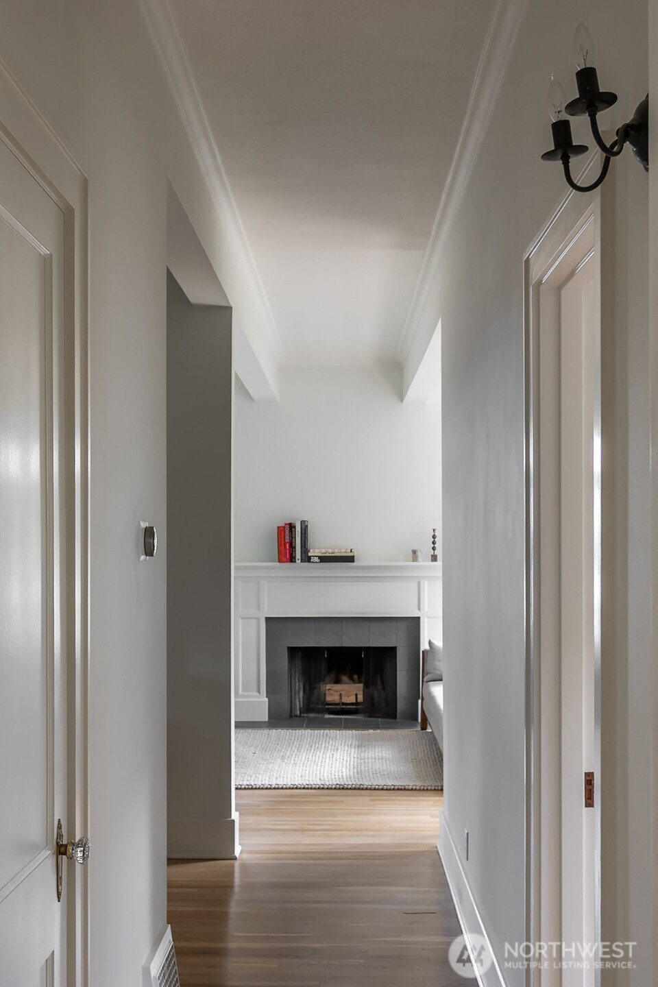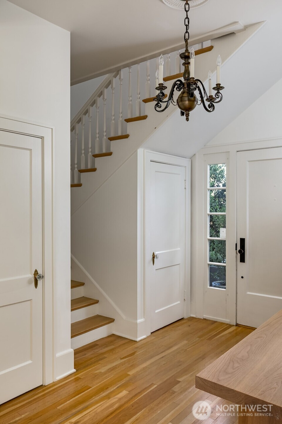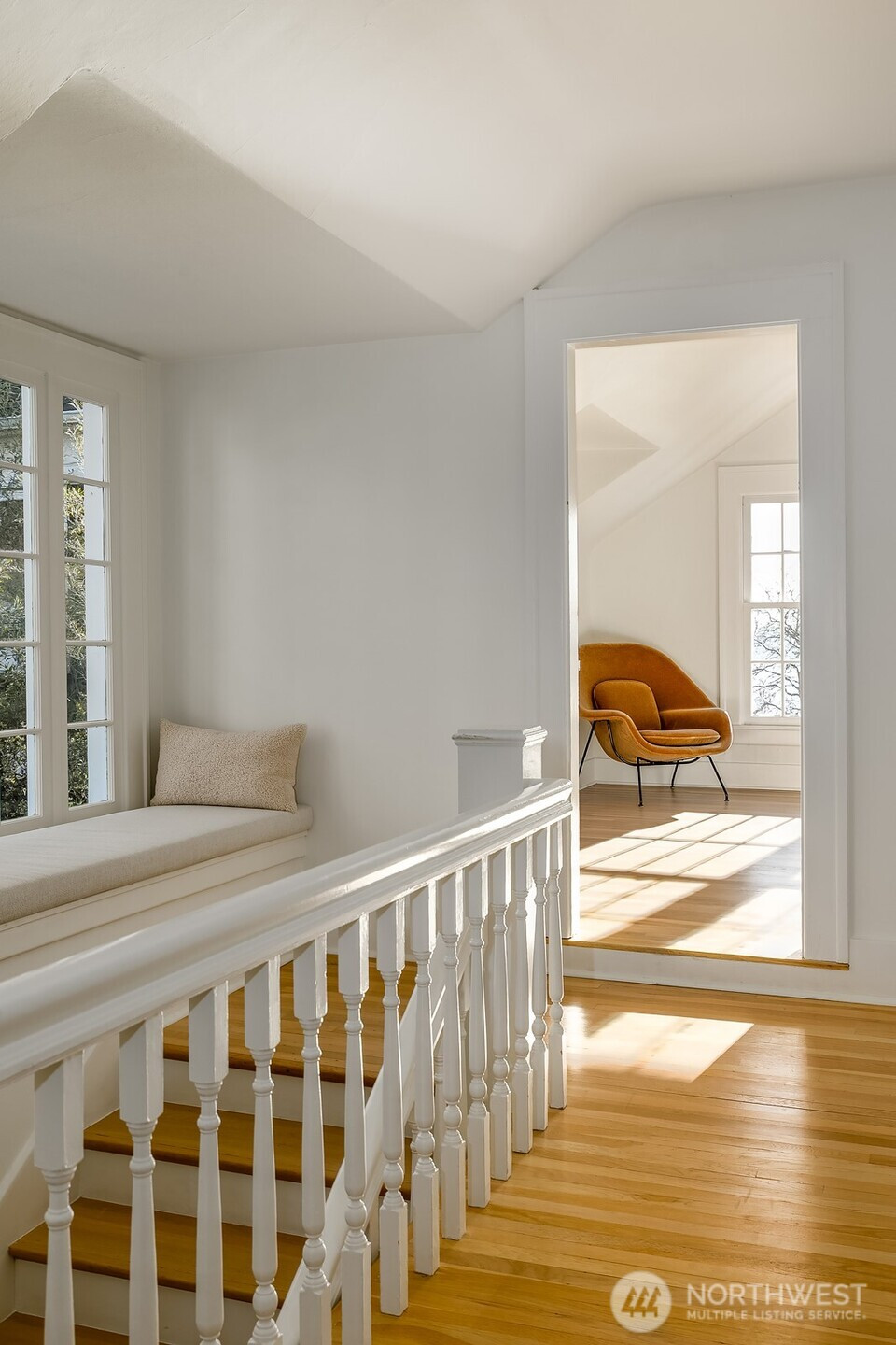 On a quiet, tree-lined street just steps from the lookout point on coveted 35th Avenue in Madrona, this stately 1906 Colonial, architecturally reminiscent of Ellsworth Storey, blends timeless character with refined modern living. Tucked behind a latched gate surrounded by private gardens, the home opens to soaring ceilings and a sweeping staircase. The formal living room features beamed ceilings and a wood-burning fireplace, with French doors opening to an outdoor terrace with treetop and Lake Washington views. A sun-filled study with built-ins and fireplace, elegant powder room, and formal dining room with garden access maintain the character of the home with classic period details. The kitchen offers floor-to-ceiling cabinetry, granite counters, luxury appliances, and western light. Upstairs, two bedrooms share a classic black and white tiled full bath, while the primary suite features a fireplace with original mural intact. A newly installed ensuite bath showcases a walk-in marble shower and elegant porcelain Waterworks tub set beneath a bay of windows with picturesque lake views. The spacious lower level offers a recreation area and a separate entry with ADU potential. Fully enclosed gardens with charming flagstone path, mature plantings, and a lower seating area beneath a majestic maple. A/C, alarm system, electric charging station. Stroll to Madrona shops, trails, and shores of Lake Washington. A sophisticated and private residence in a charming neighborhood setting.