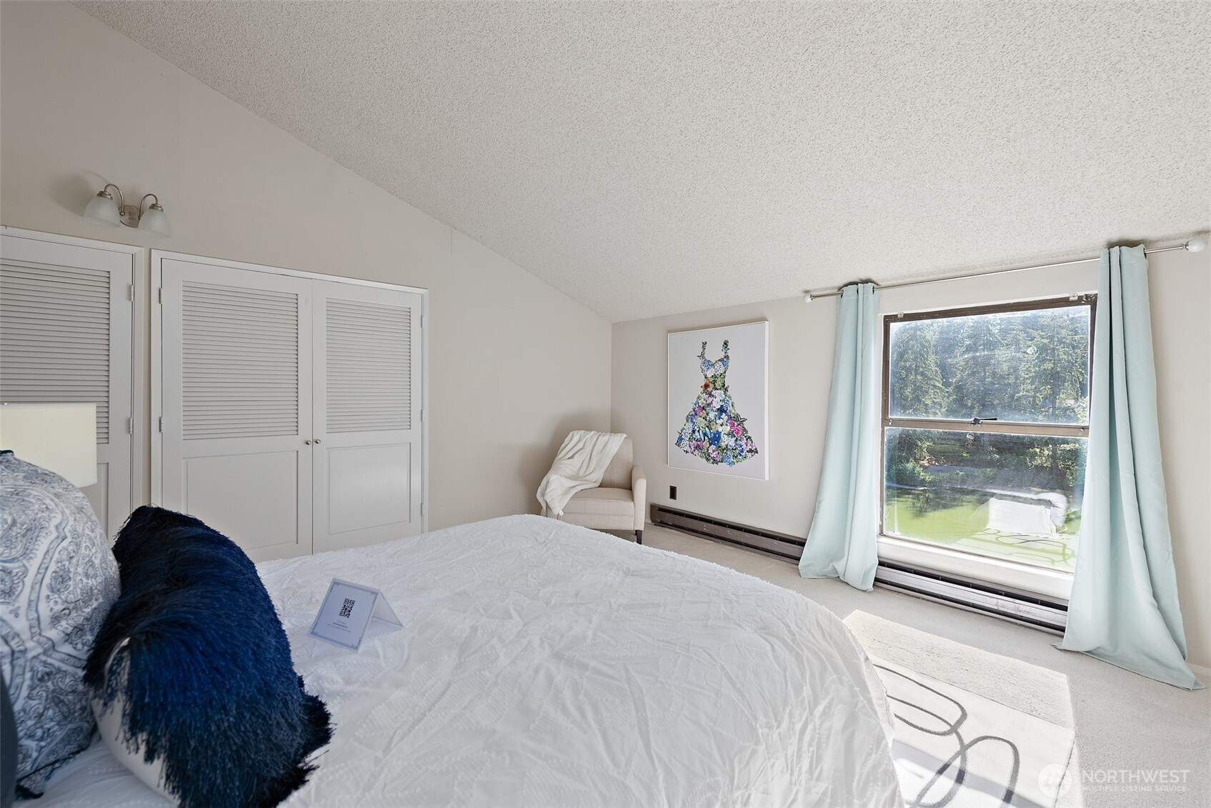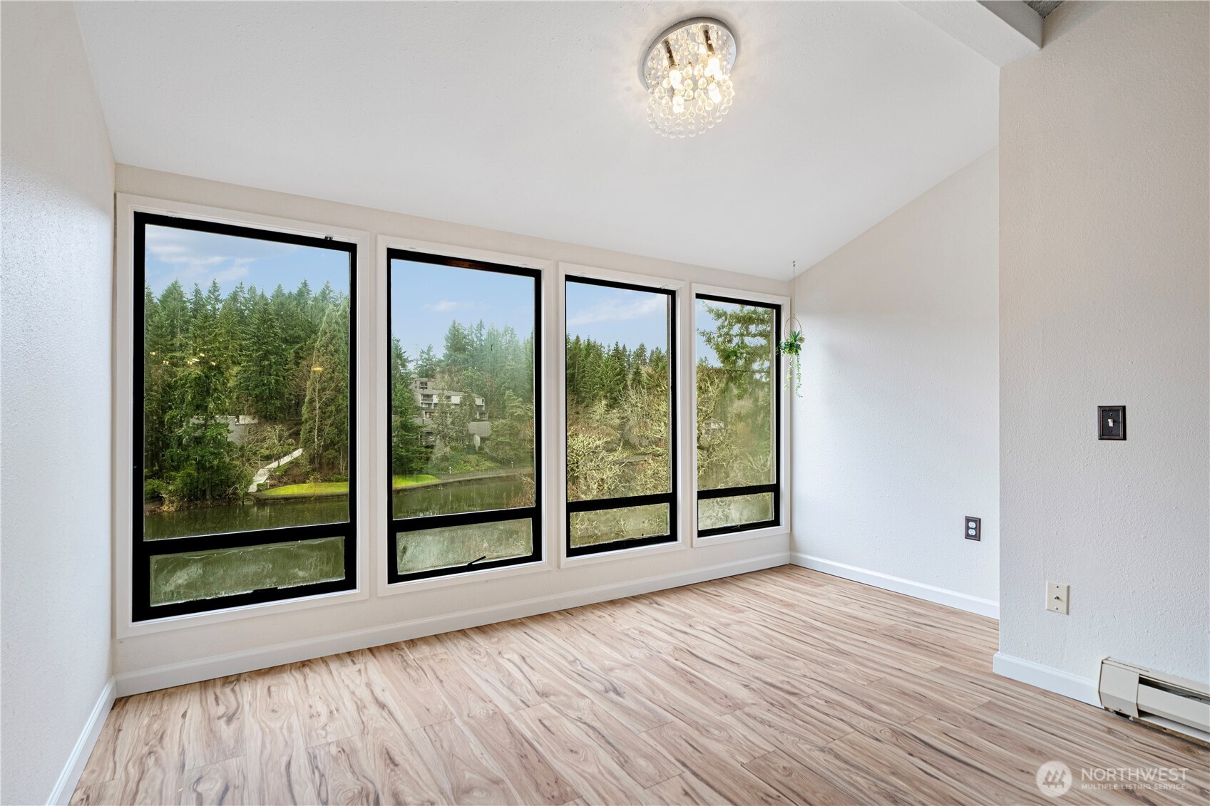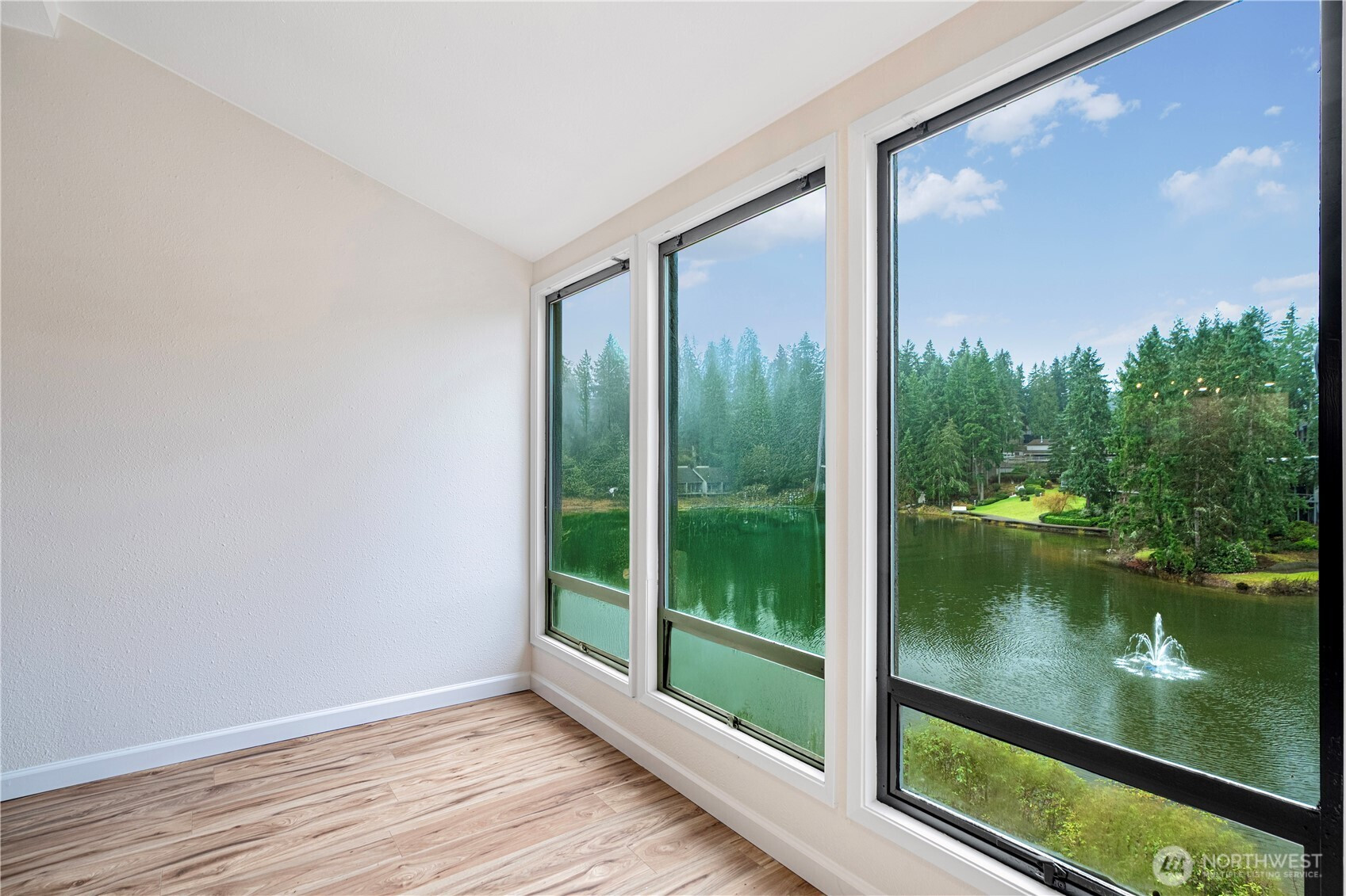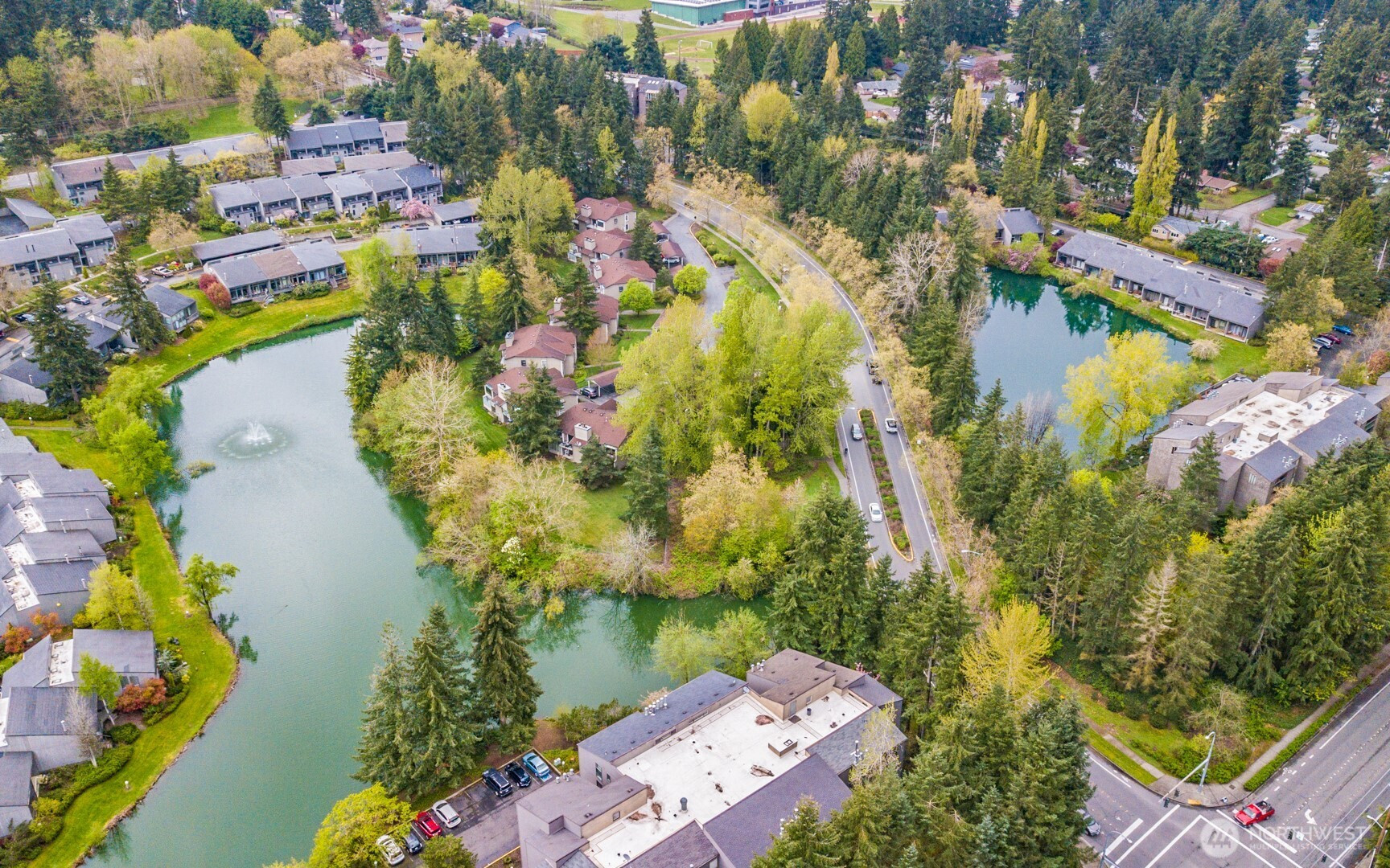 Welcome to this elegant top-floor condo with serene lake views. Vaulted ceilings, expansive windows, and a cozy wood-burning fireplace. The kitchen features granite countertops and European-style white cabinetry. Fresh interior paint, hard-surface flooring, and new luxury carpet in the bedrooms enhance the move-in-ready feel. The spacious primary suite offers multiple closets and a private en-suite bath. Large second bedroom with private balcony. Elevator access, covered parking, storage unit, and ample parking for guests. Enjoy resort-style amenities including lakes, trails, pools, clubhouse, gym, sauna, and athletic courts. Prime Eastside location minutes to Microsoft, Google, shopping, dining, and major commuter routes. No RENTAL CAP.