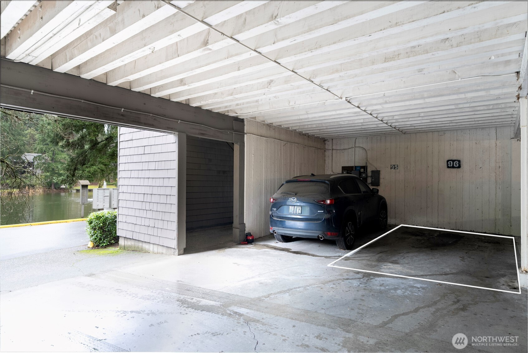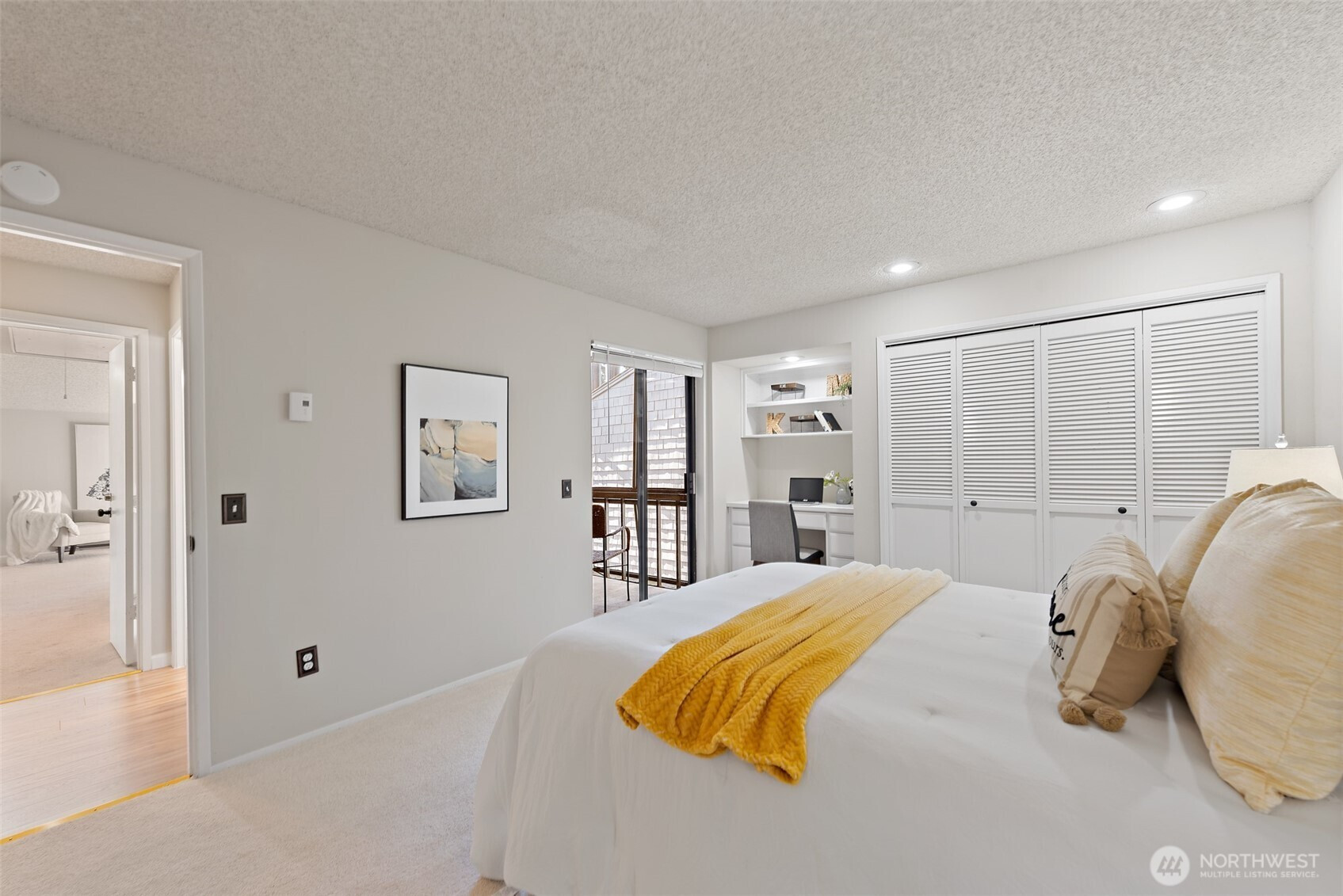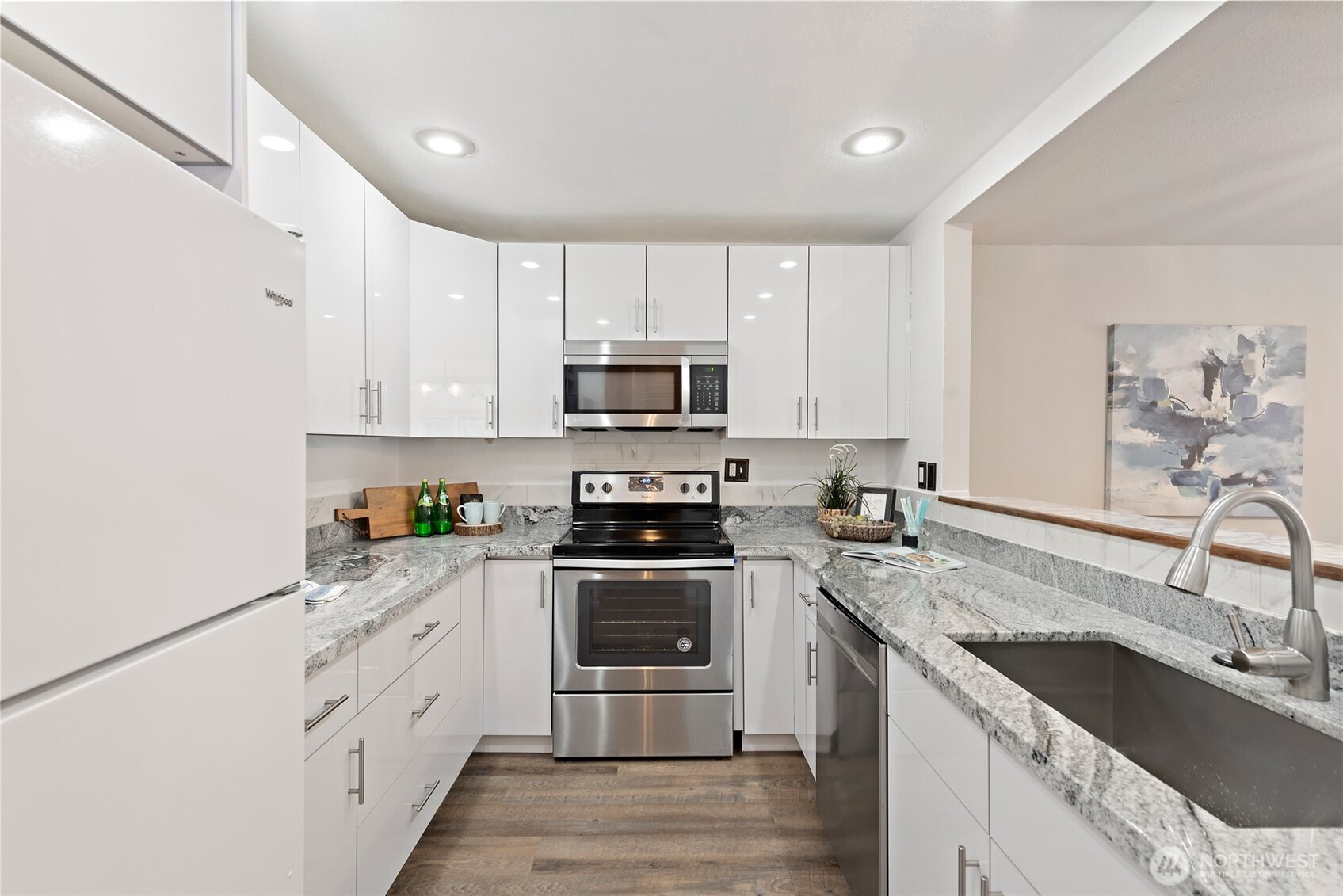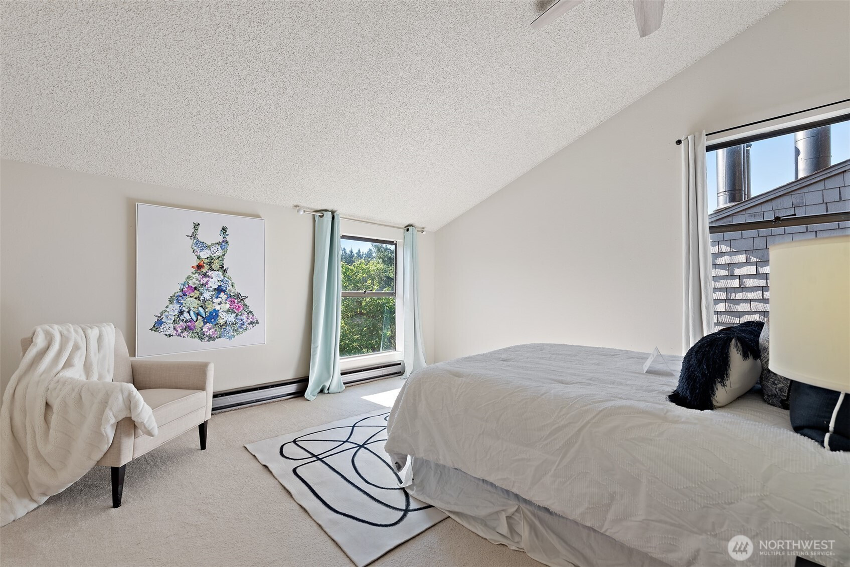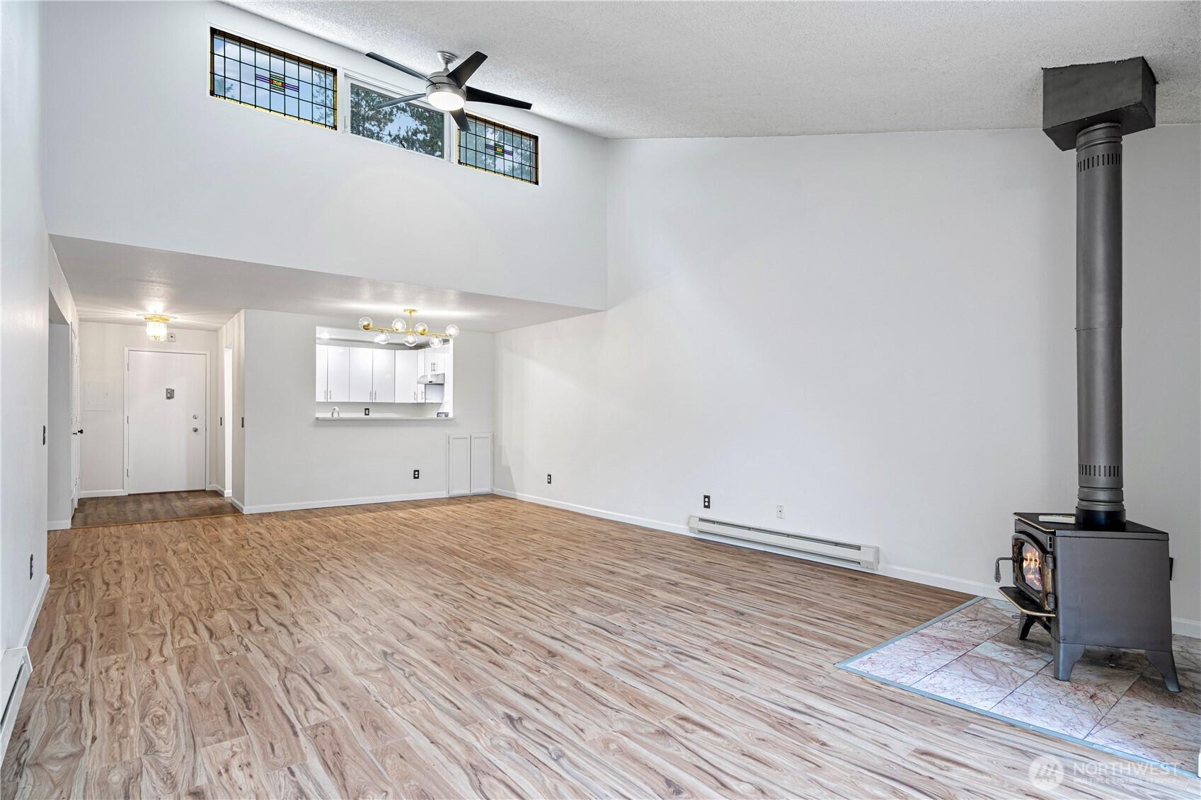 Welcome to this elegant top-floor condo with serene lake views. Vaulted ceilings, expansive windows, and a cozy wood-burning fireplace. The kitchen features granite countertops and European-style white cabinetry. Fresh interior paint, hard-surface flooring, and new luxury carpet in the bedrooms enhance the move-in-ready feel. The spacious primary suite offers multiple closets and a private en-suite bath. Large second bedroom with private balcony. Elevator access, covered parking, storage unit, and ample parking for guests. Enjoy resort-style amenities including lakes, trails, pools, clubhouse, gym, sauna, and athletic courts. Prime Eastside location minutes to Microsoft, Google, shopping, dining, and major commuter routes. No RENTAL CAP.