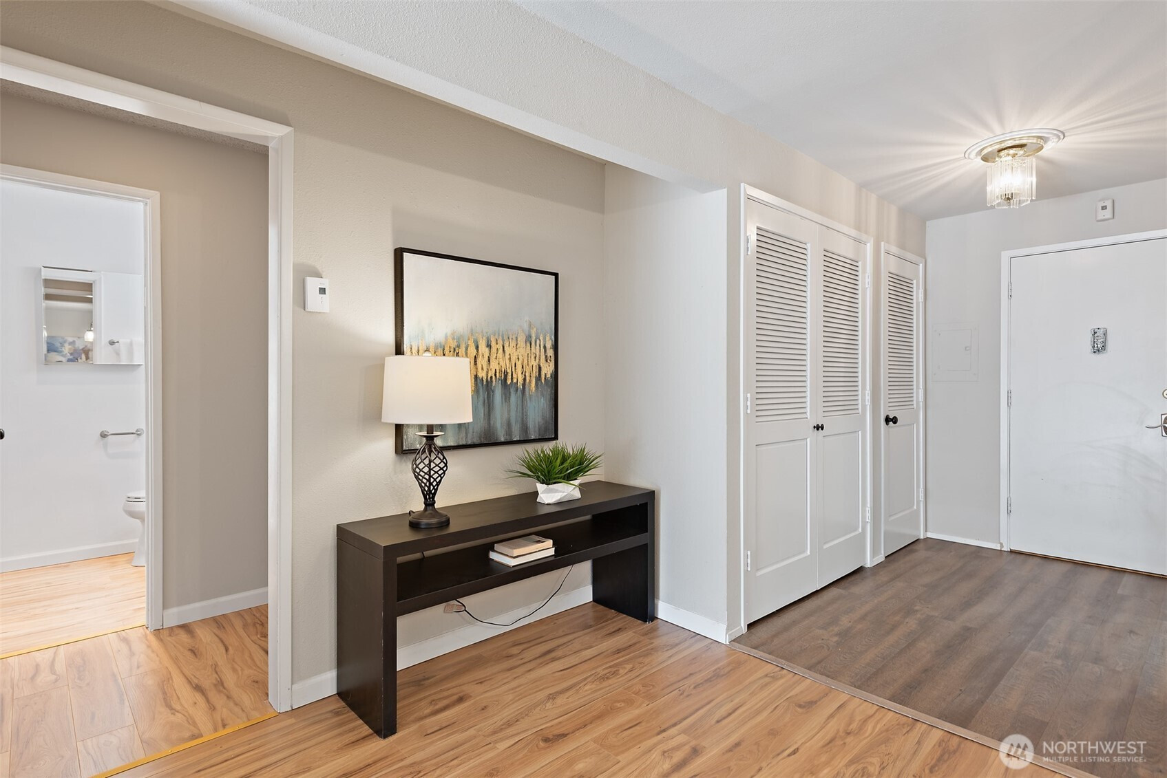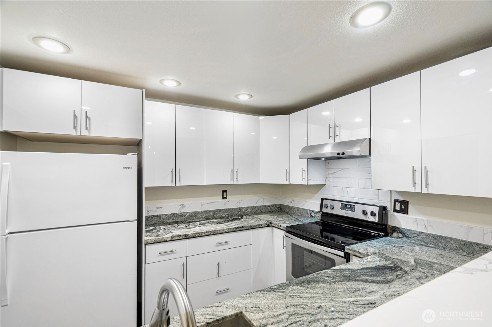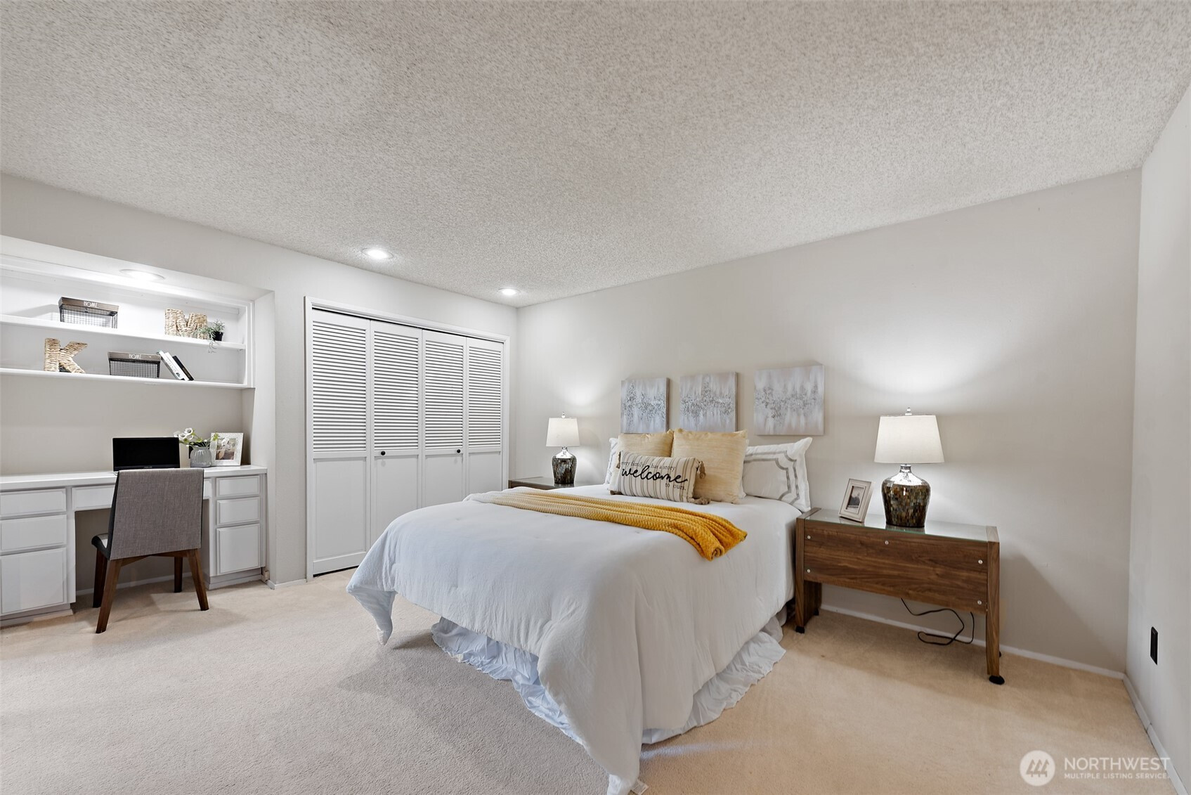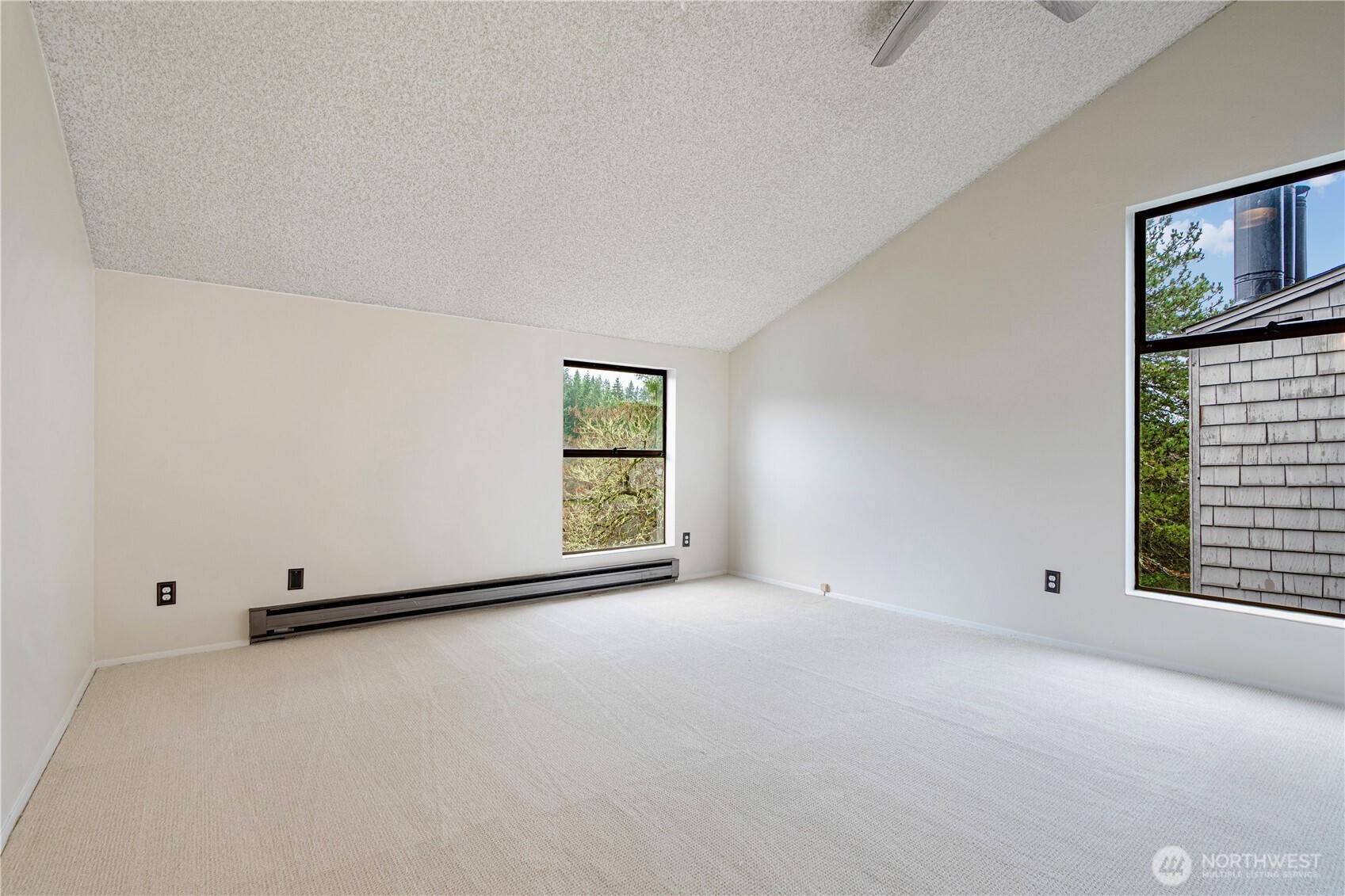 Welcome to this elegant top-floor condo with serene lake views. Vaulted ceilings, expansive windows, and a cozy wood-burning fireplace. The kitchen features granite countertops and European-style white cabinetry. Fresh interior paint, hard-surface flooring, and new luxury carpet in the bedrooms enhance the move-in-ready feel. The spacious primary suite offers multiple closets and a private en-suite bath. Large second bedroom with private balcony. Elevator access, covered parking, storage unit, and ample parking for guests. Enjoy resort-style amenities including lakes, trails, pools, clubhouse, gym, sauna, and athletic courts. Prime Eastside location minutes to Microsoft, Google, shopping, dining, and major commuter routes. No RENTAL CAP.
