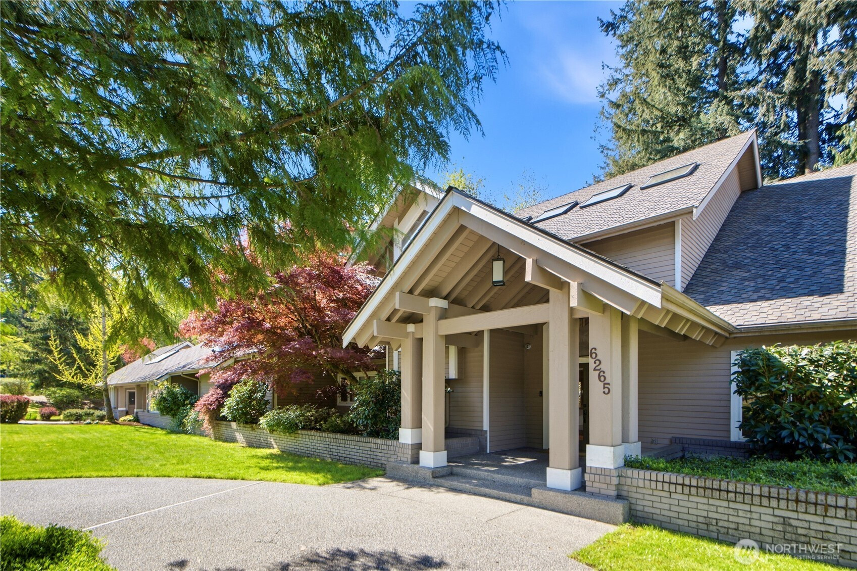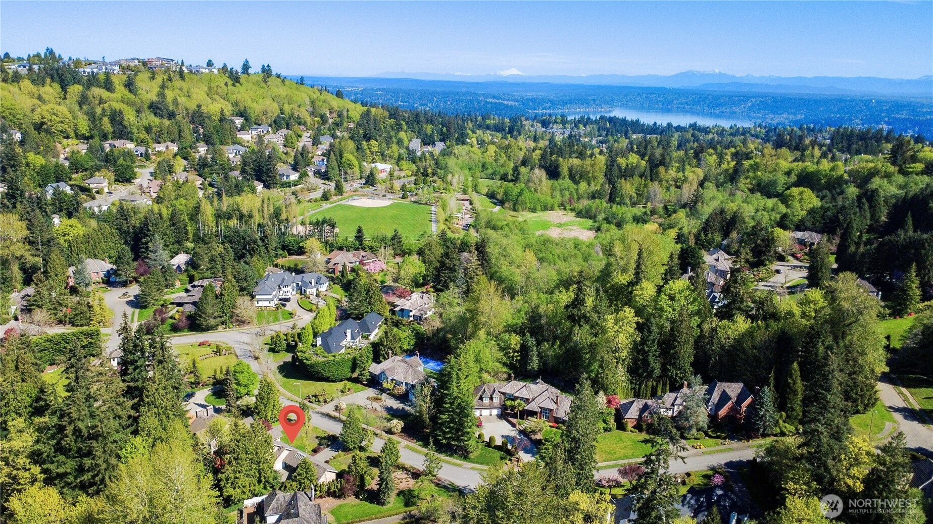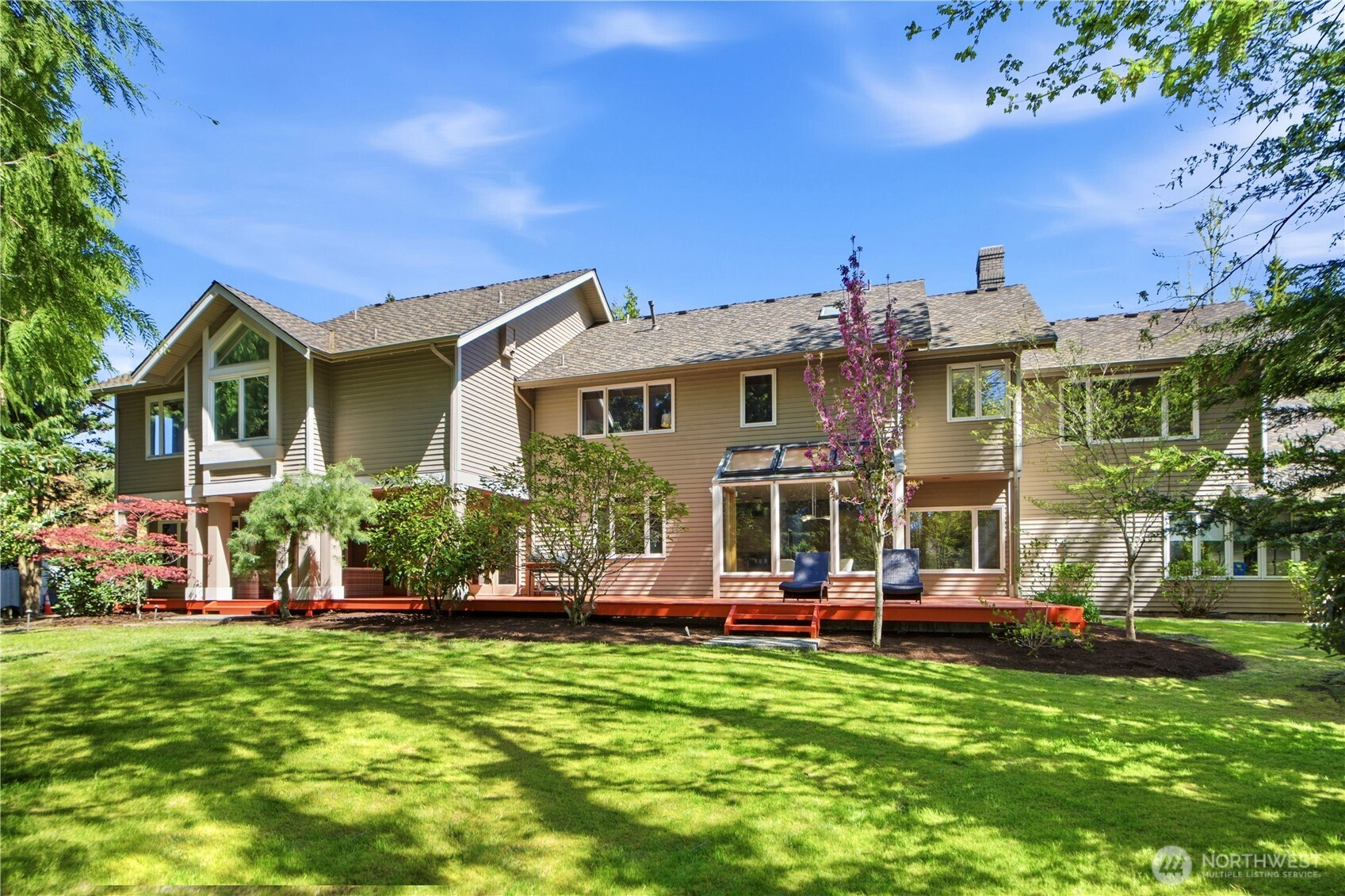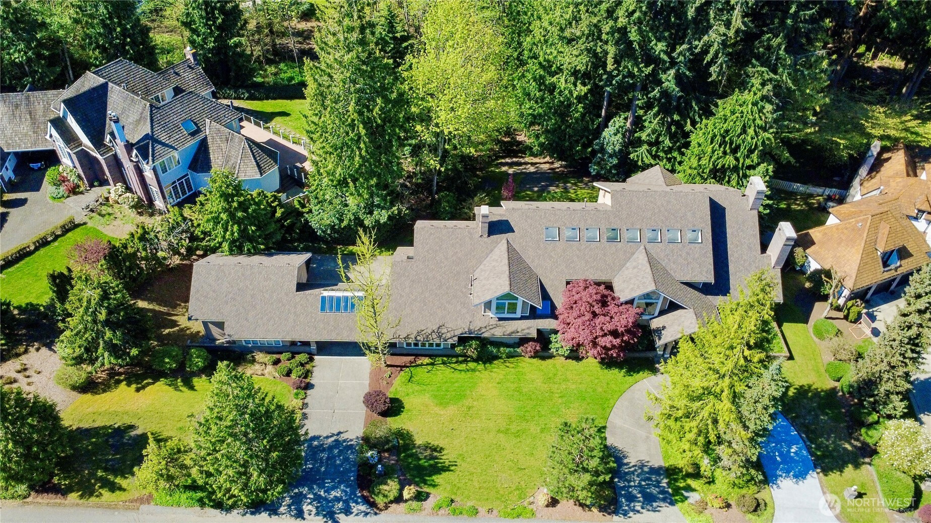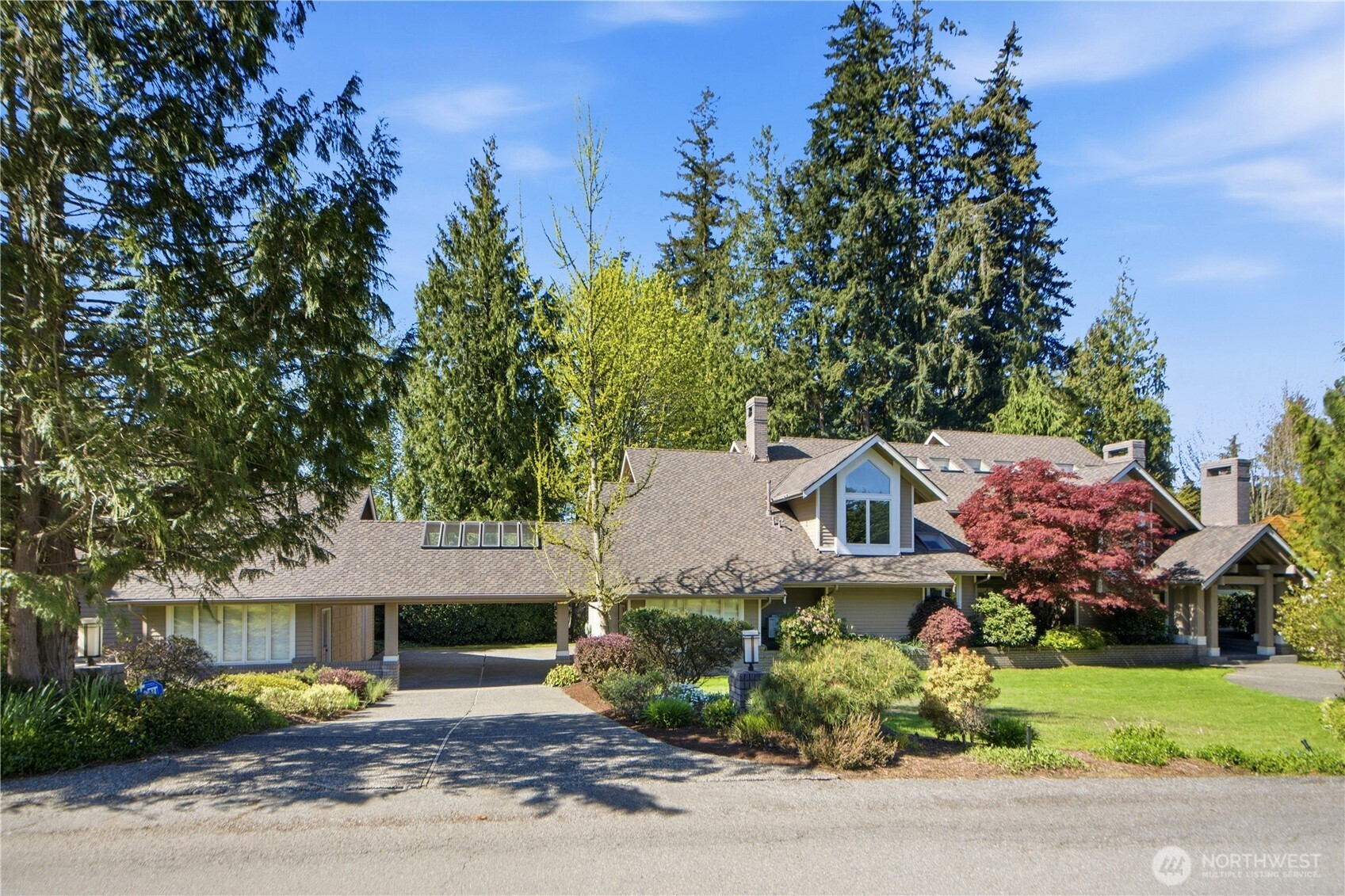 Discover the pinnacle of Pacific Northwest elegance in this iconic residence, masterfully designed by architect Curtis Gelotte. Privately nestled on a sun-drenched 0.79-acre lot in Lakemont Woods, this 5-bedroom, 4.5-bath estate perfectly blends timeless architecture with the serenity of mature evergreens and natural beauty. The grand entry welcomes you into light-filled living and dining areas featuring soaring ceilings and oversized windows that frame the tranquil backdrop. The home offers a seamless, inviting flow, including a cozy family room, a sun-splashed dining nook, and a gourmet kitchen equipped with rich cherry cabinetry, slab granite countertops, and a substantial island. An executive office with a built-in wet bar. Upstairs, the luxurious primary suite serves as a secluded sanctuary, complete with a private fireplace, sitting area, and heated marble floors. Generously sized secondary bedrooms and an oversized bonus room offer exceptional flexibility for guests, media, playroom or creative pursuits. Outside, mature landscaping, expansive decking, and fire pits—perfect for both entertaining and quiet reflection. New carpet, newer roof, water heater and furnace. Extra-wide four-car garage. Top top-rated schools, and easy access to I-90 and I-405, this rare architectural treasure is ready for its next chapter.
