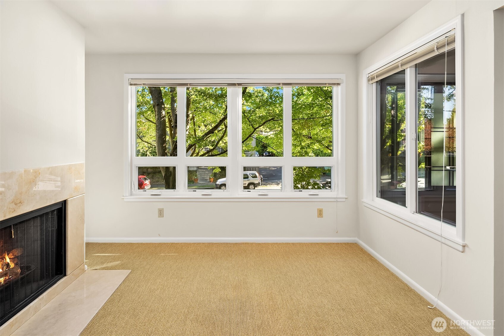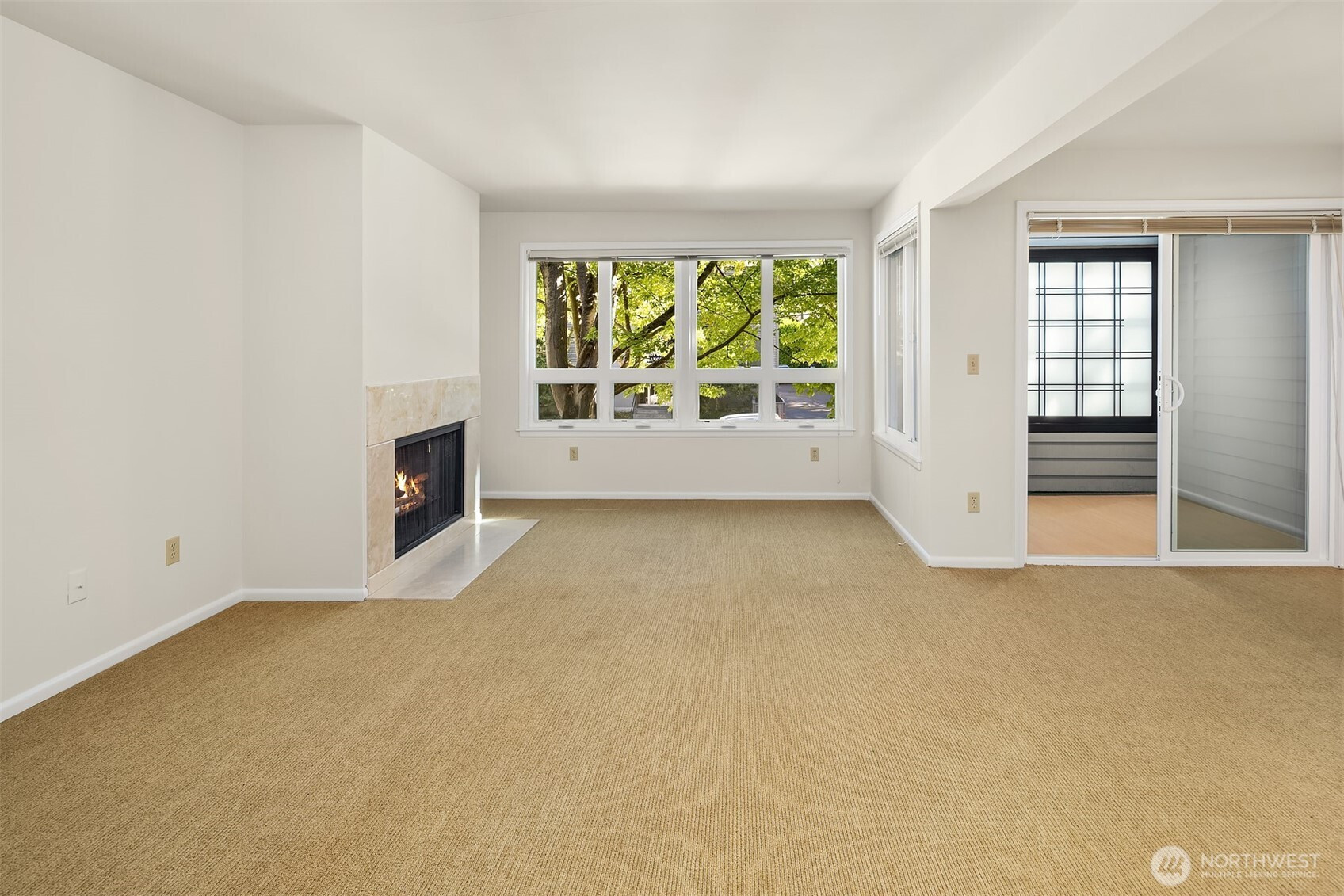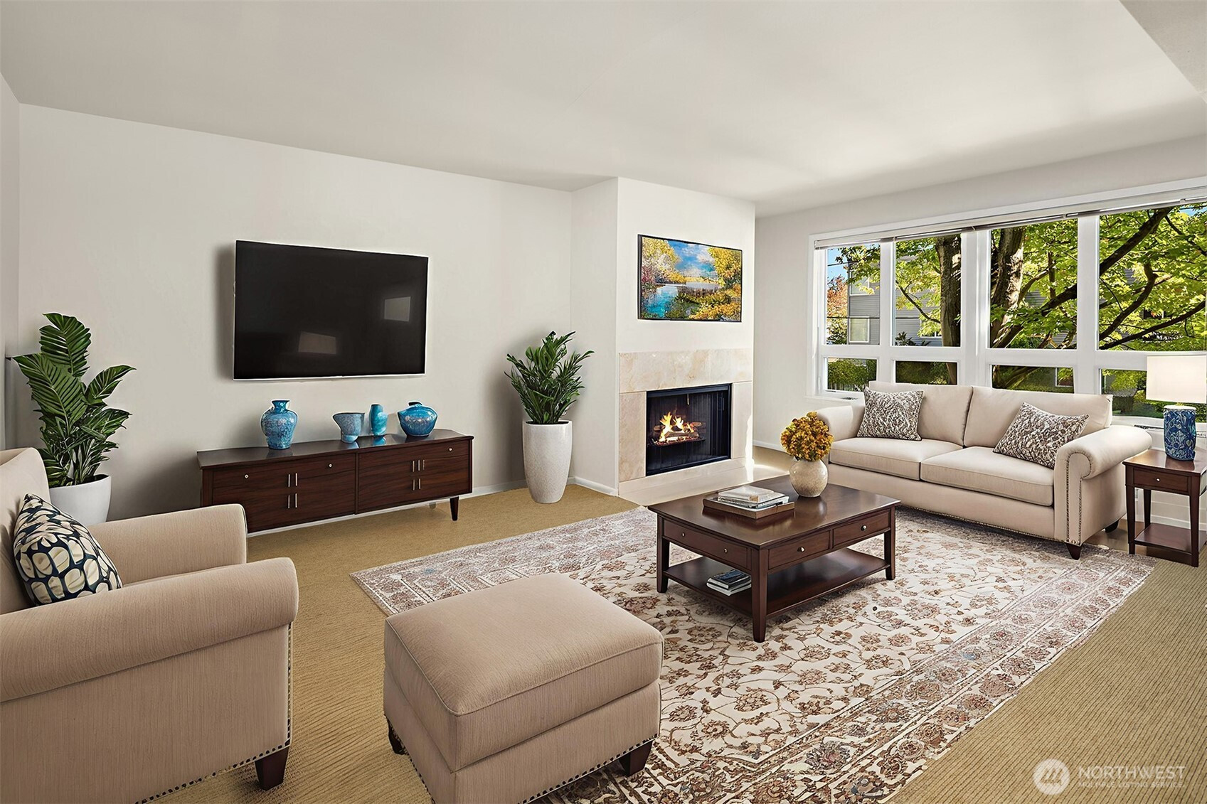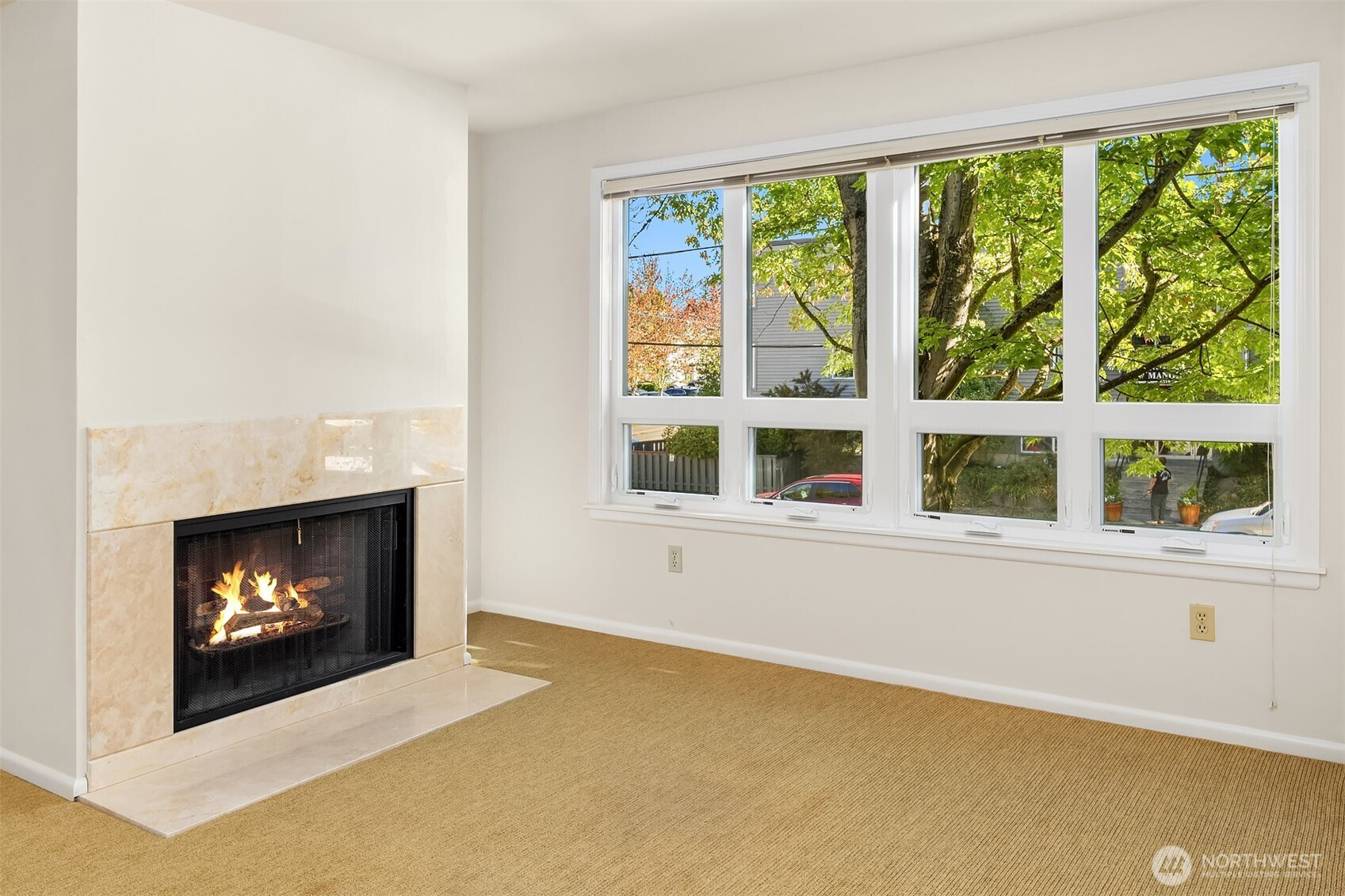 RARE - zero stair entry condo in boutique pet-friendly building w/elevator. Freshly painted & move-in ready, this 831 sq ft unit features a beautiful kitchen with eco-friendly Thai Rubber Wood cabinets, custom ceramic pulls, granite countertops & stainless appliances. Cozy wood-burning fireplace, in-unit laundry, & enclosed porch—ideal for a work-from-home office space. The large bedroom offers space for a reading nook & a generous walk-in closet. Enjoy your private access to a big shared patio perfect for entertaining & BBQs. Community perks include secure entry, gated garage parking, bike storage & big storage space. Newer siding & windows & a prime location near U Village, Burke-Gilman Trail, Magnuson Park, UW, and Children’s Hospital.