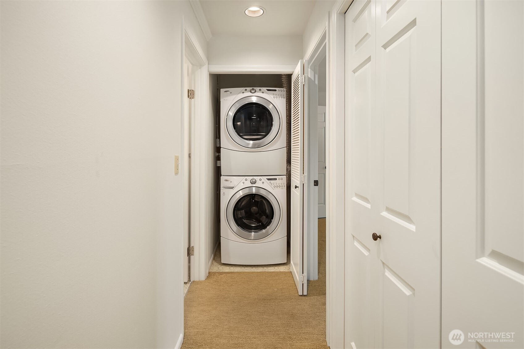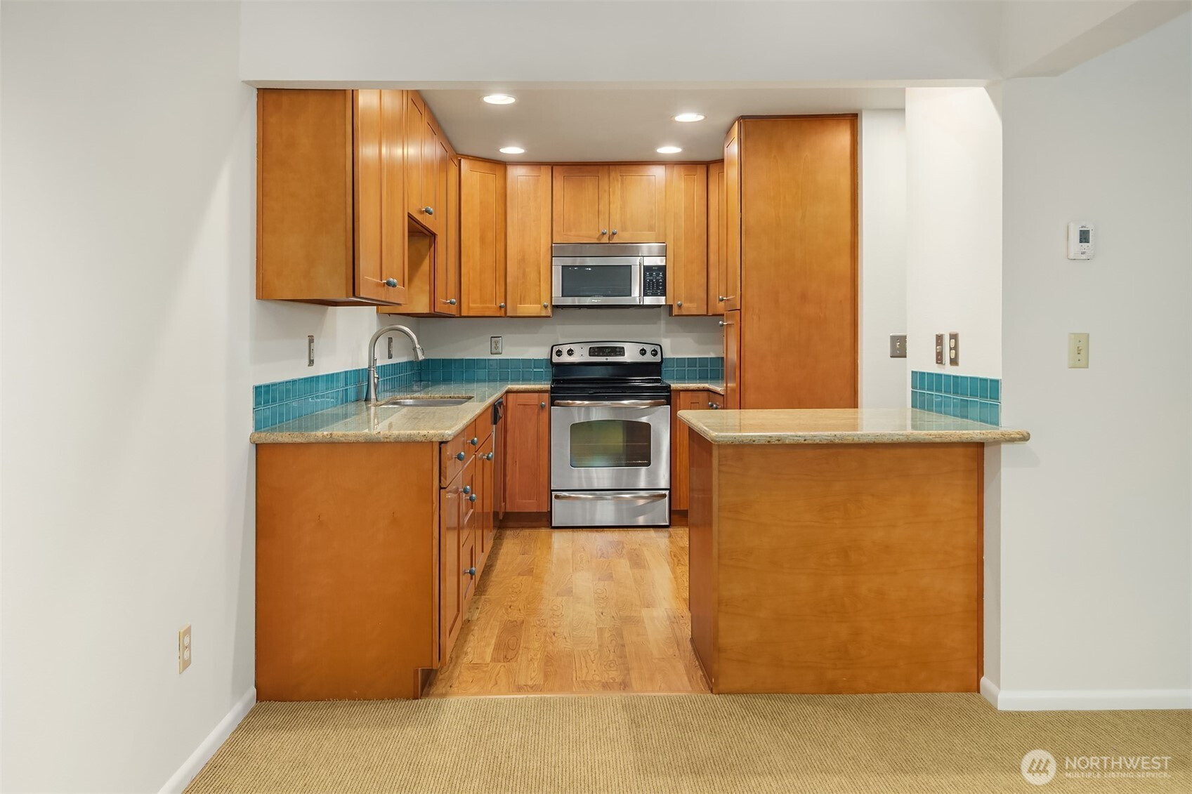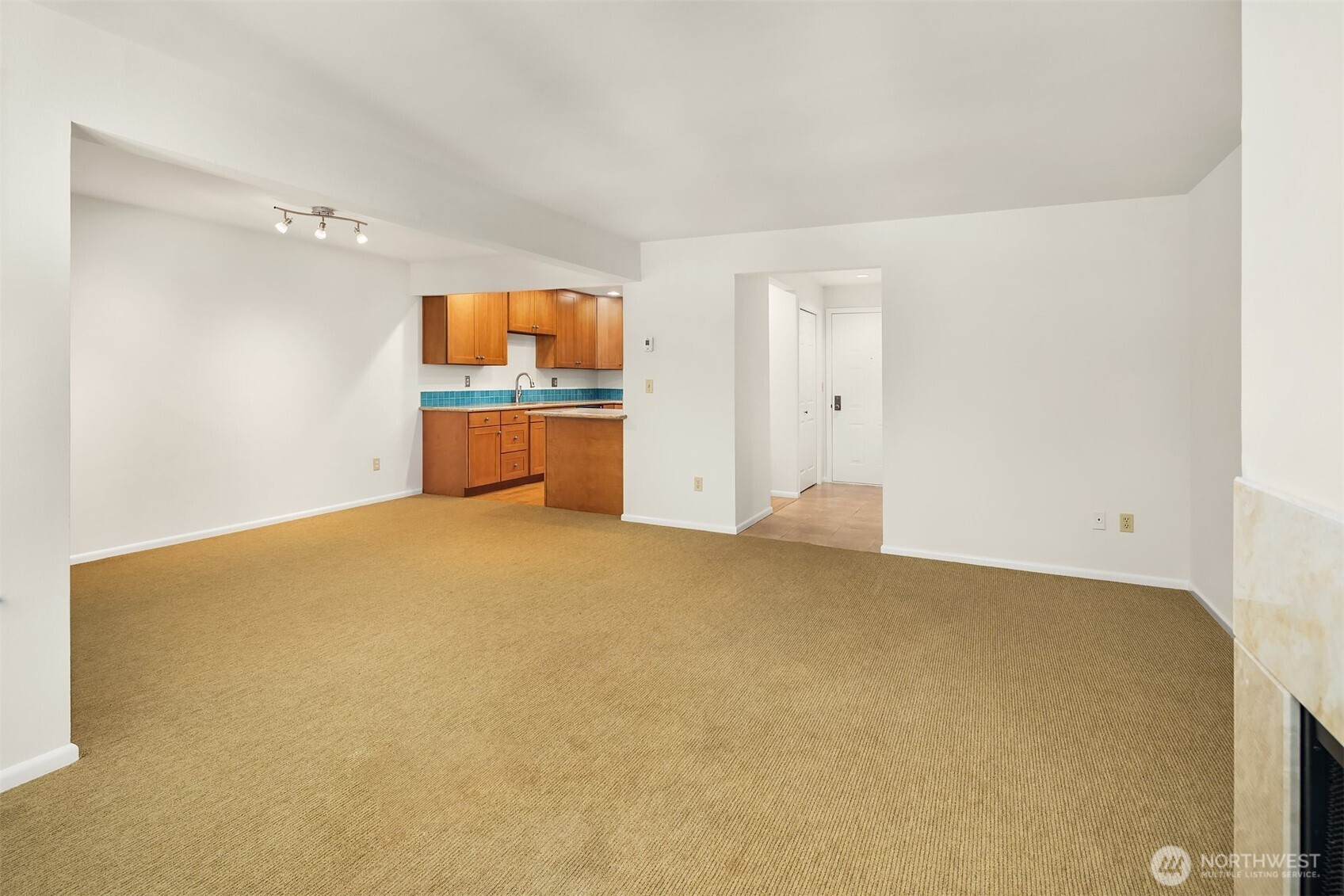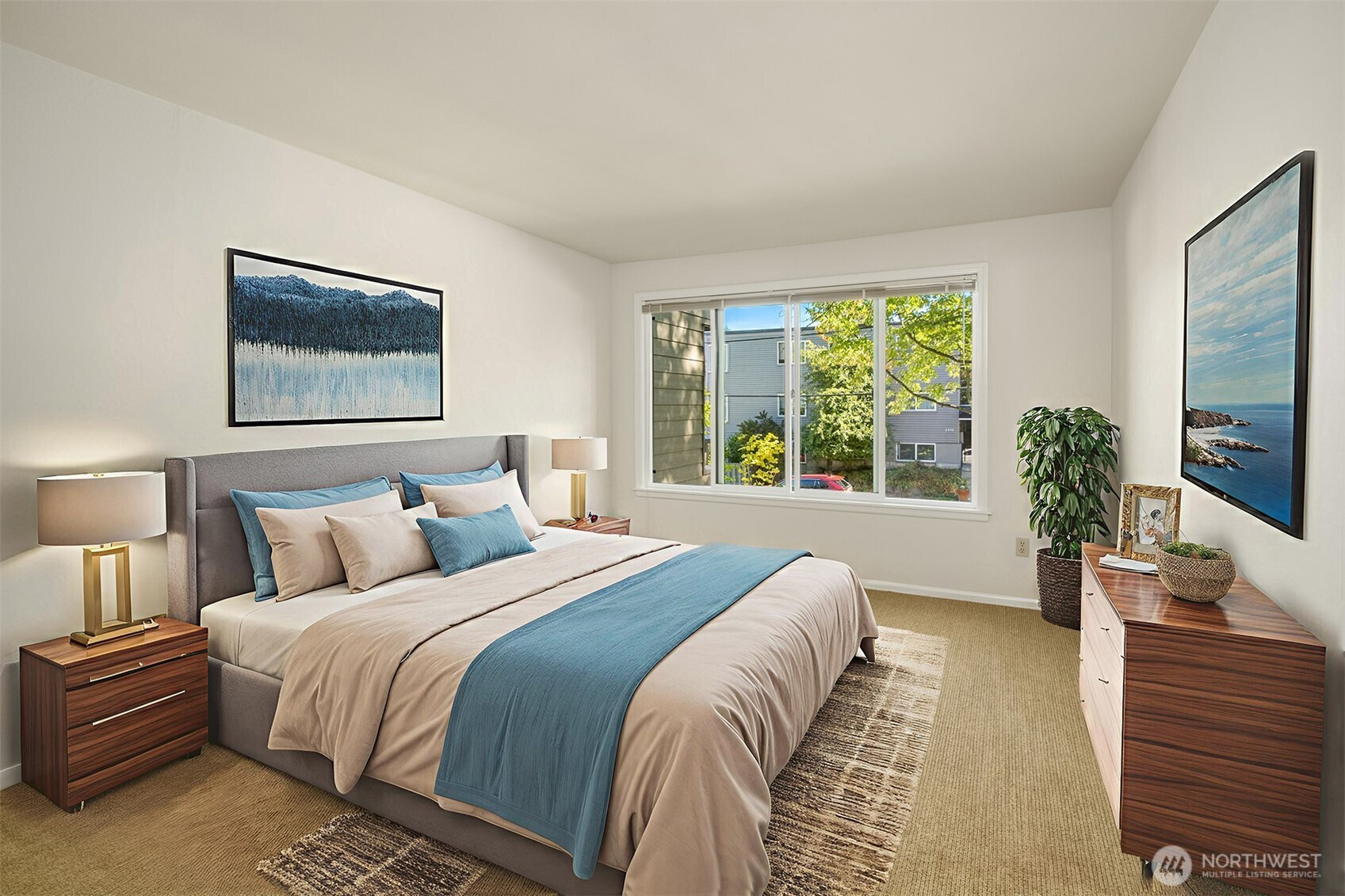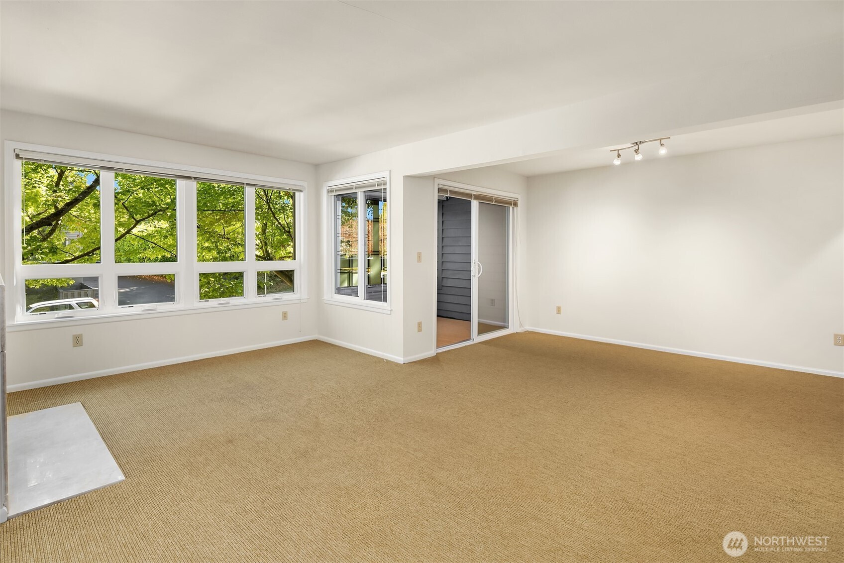 RARE - zero stair entry condo in boutique pet-friendly building w/elevator. Freshly painted & move-in ready, this 831 sq ft unit features a beautiful kitchen with eco-friendly Thai Rubber Wood cabinets, custom ceramic pulls, granite countertops & stainless appliances. Cozy wood-burning fireplace, in-unit laundry, & enclosed porch—ideal for a work-from-home office space. The large bedroom offers space for a reading nook & a generous walk-in closet. Enjoy your private access to a big shared patio perfect for entertaining & BBQs. Community perks include secure entry, gated garage parking, bike storage & big storage space. Newer siding & windows & a prime location near U Village, Burke-Gilman Trail, Magnuson Park, UW, and Children’s Hospital.