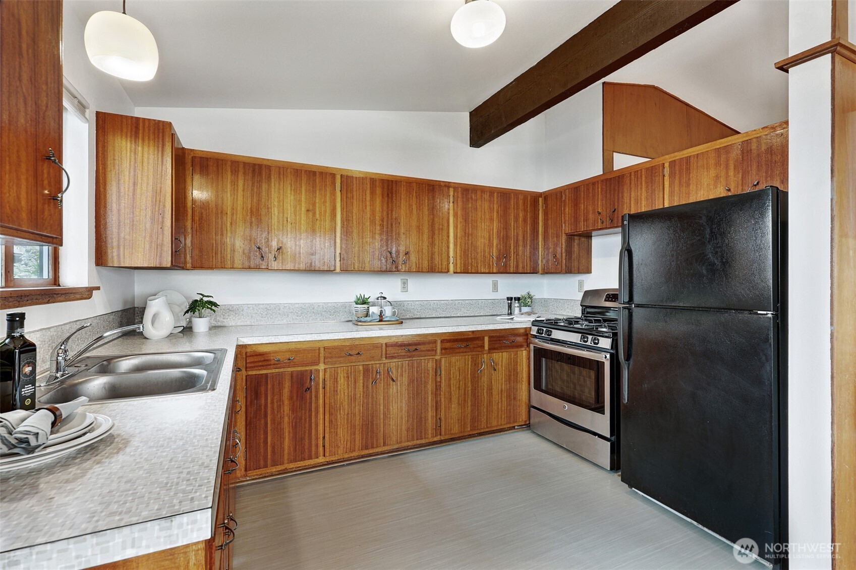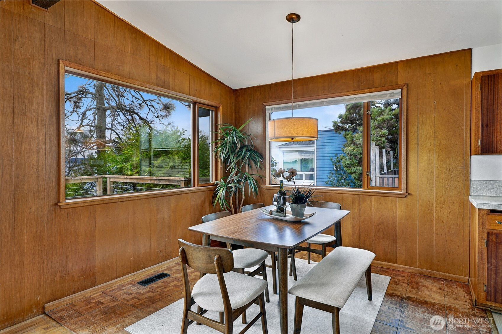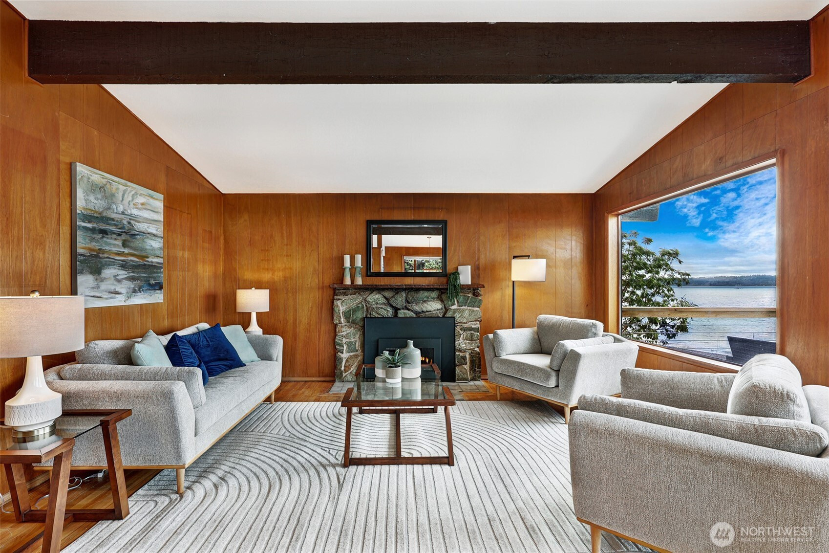 First time on the market! An authentic mid-century delight w/ 50 feet of rare, no-bank waterfront & sweeping 180° west-facing views of Puget Sound, Olympic Mtns & Vashon Island. Enjoy stunning sunsets from nearly every room, the main level deck & the shoreline below. Vaulted ceilings, original mahogany paneling & a wood-burning fireplace define the light-filled living spaces. Expansive windows frame the water, creating a seamless connection between indoor living & the Sound. The main level offers an open living/dining layout, kitchen, 2 spacious bedrooms, a full bath & a utility room. With approximately 2,420 sqft, this home offers exceptional flexibility. The daylight lower level features 8’ ceilings, large open spaces & direct access to the backyard, perfect for expansion, guest quarters, or ADU potential. Step outside to a patio & a level yard that transitions to private beach access, great for entertaining, kayaking, paddleboarding or simply enjoying the waterfront. Recent updates include fresh interior/exterior paint & new Marmoleum flooring. A rare opportunity to preserve & enhance a true mid-century waterfront retreat. Ideally located along Beach Drive, just minutes to Lincoln Park, Alki Beach, & Junction amenities.