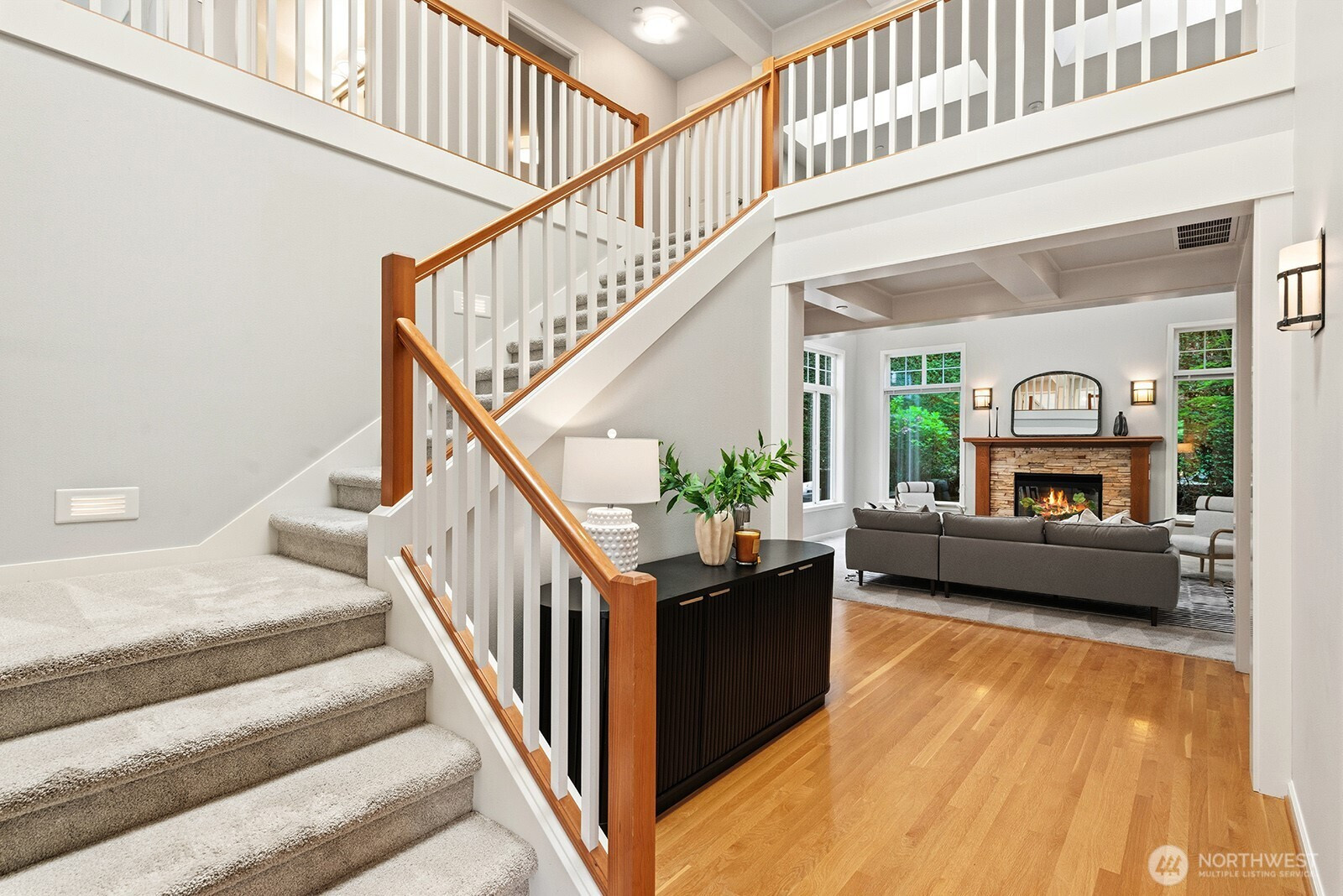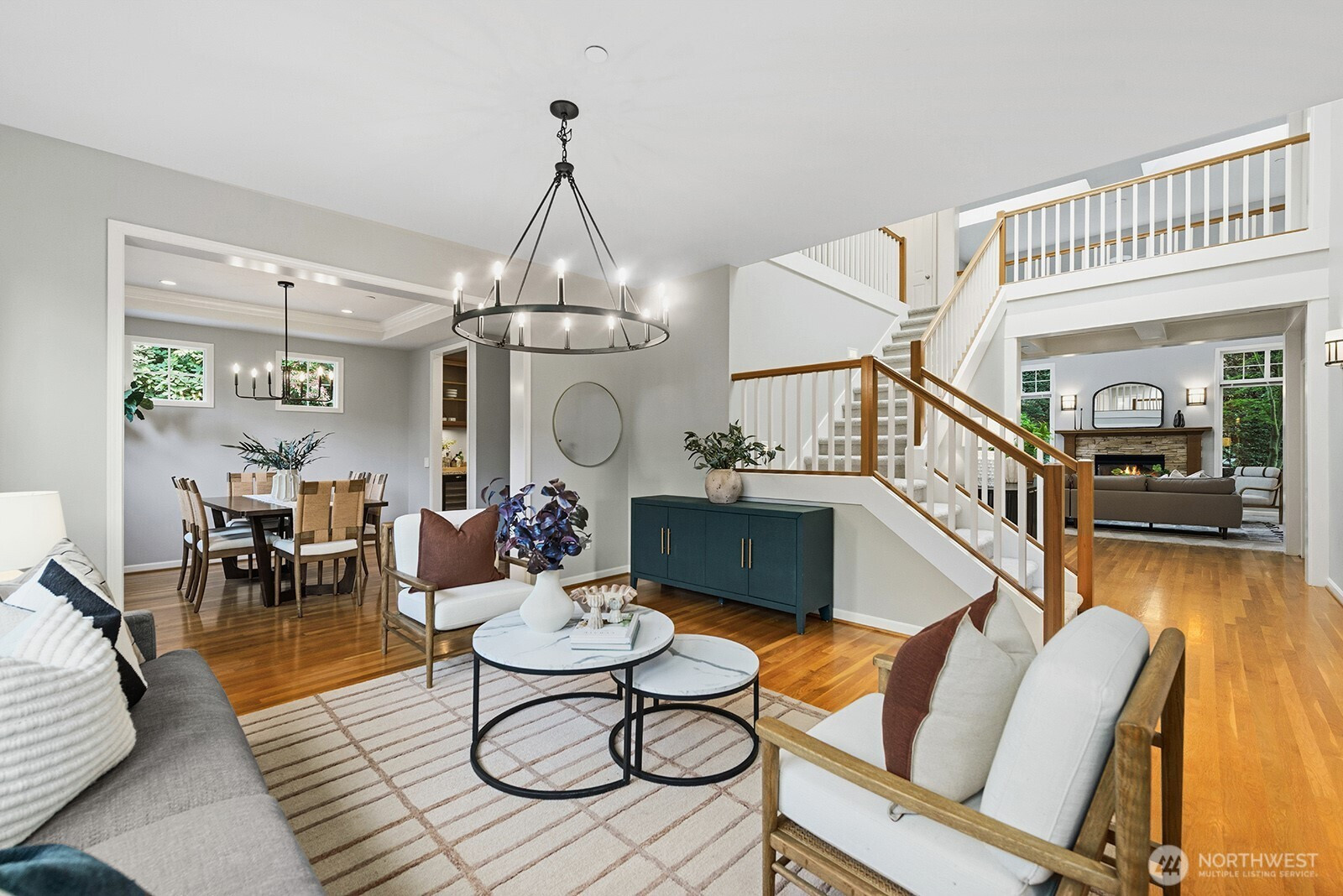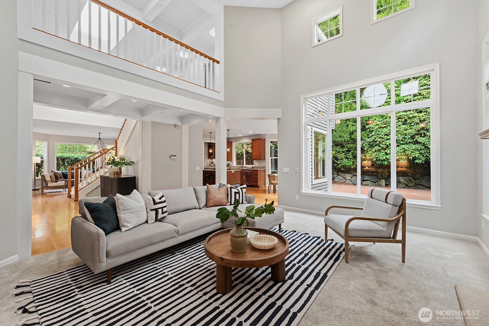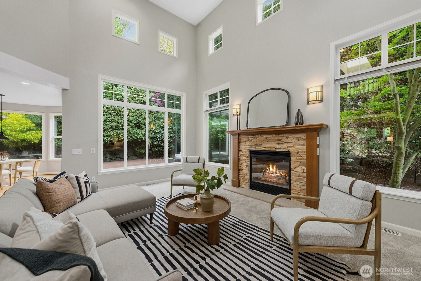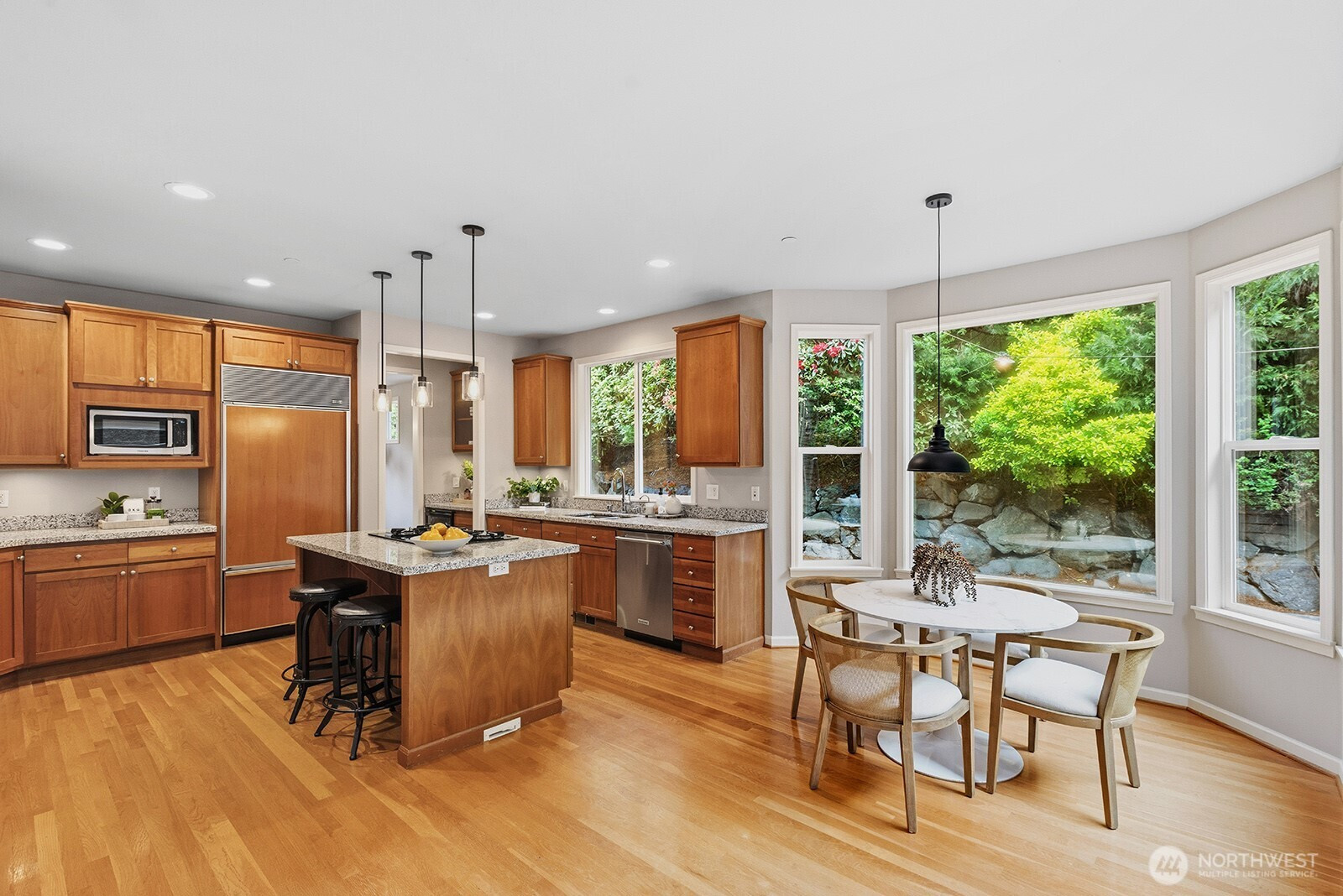 Located on a tranquil corner lot in sought-after Holmes Point, this stunning home offers an exceptional setting with a seamless connection to the outdoors capturing the very best of PNW living. Wrap-around front porch with sunny western exposure welcomes you into a home that balances privacy and connection. Rich oak hardwoods ground the main level, featuring formal living and dining rooms ideal for entertaining. Soaring 18-foot ceilings and walls of glass fill the family room with natural light, anchored by a beautiful gas fireplace for cozy evenings. The chef’s kitchen boasts a Sub-Zero fridge, slab counters, eat-in island, walk-in pantry, and breakfast nook perfect for casual eats. French doors open to a large, private backyard patio surrounded by lush landscaping. A grand staircase flows to an exceptional primary suite with walk-in closet and spa-like 5 piece bath with heated floors. Two additional bedrooms, a full bath, and bonus room complete the upper level. Additional highlights include a fully fenced backyard, sprinkler system, skylights, central vacuum, and oversized 3-car garage. Outdoor adventure awaits just steps away at O.O. Denny Park, the neighborhood boat ramp, and Lake Washington. Enjoy exploring Big Finn Hill Park and Saint Edward State Park, with easy access to Kirkland, I-405, and top-rated schools in the Lake Washington School District. Welcome Home!
