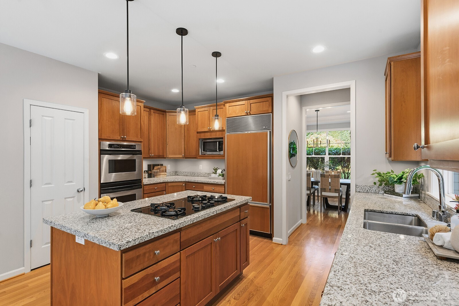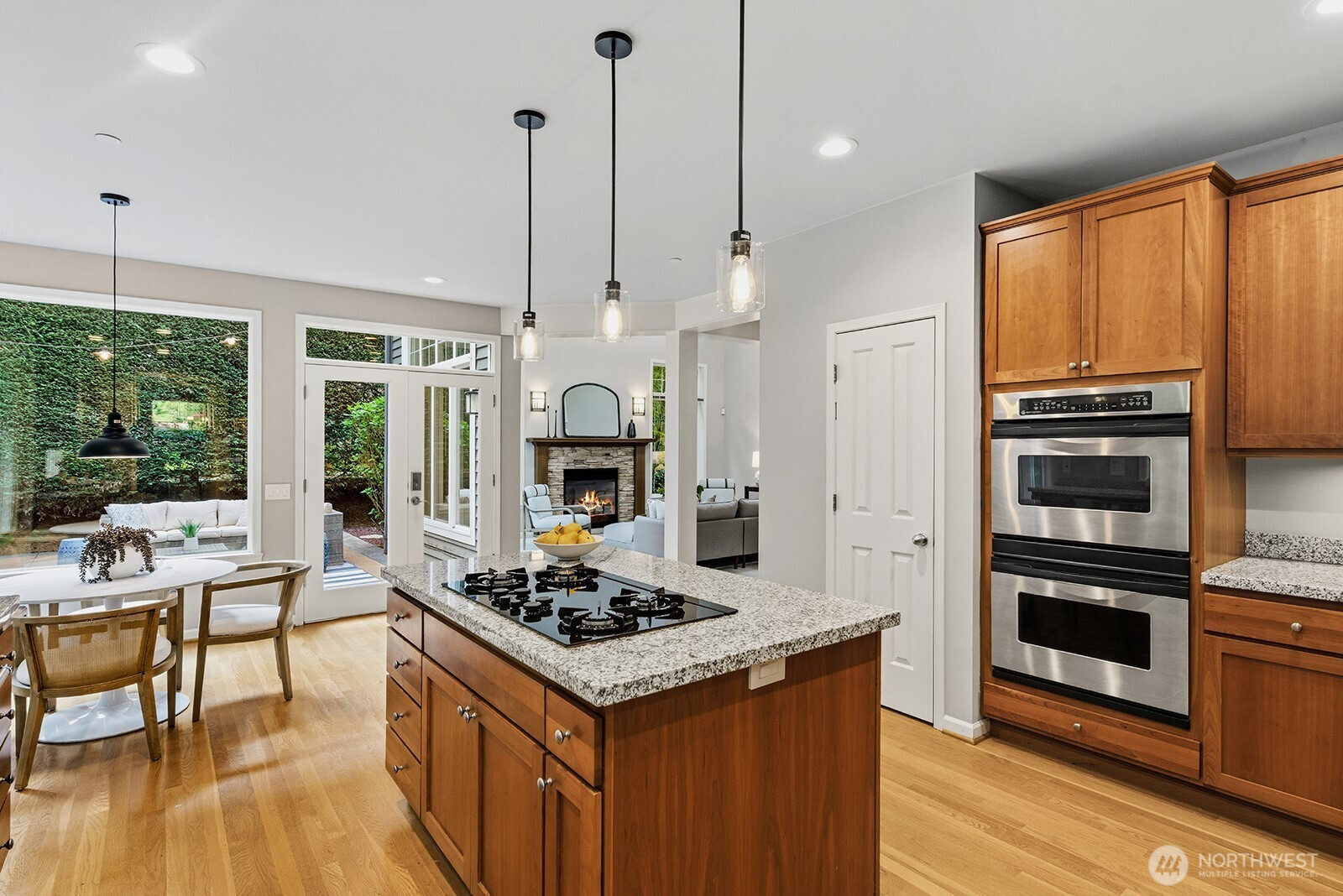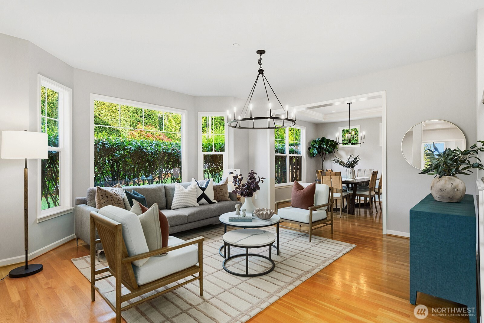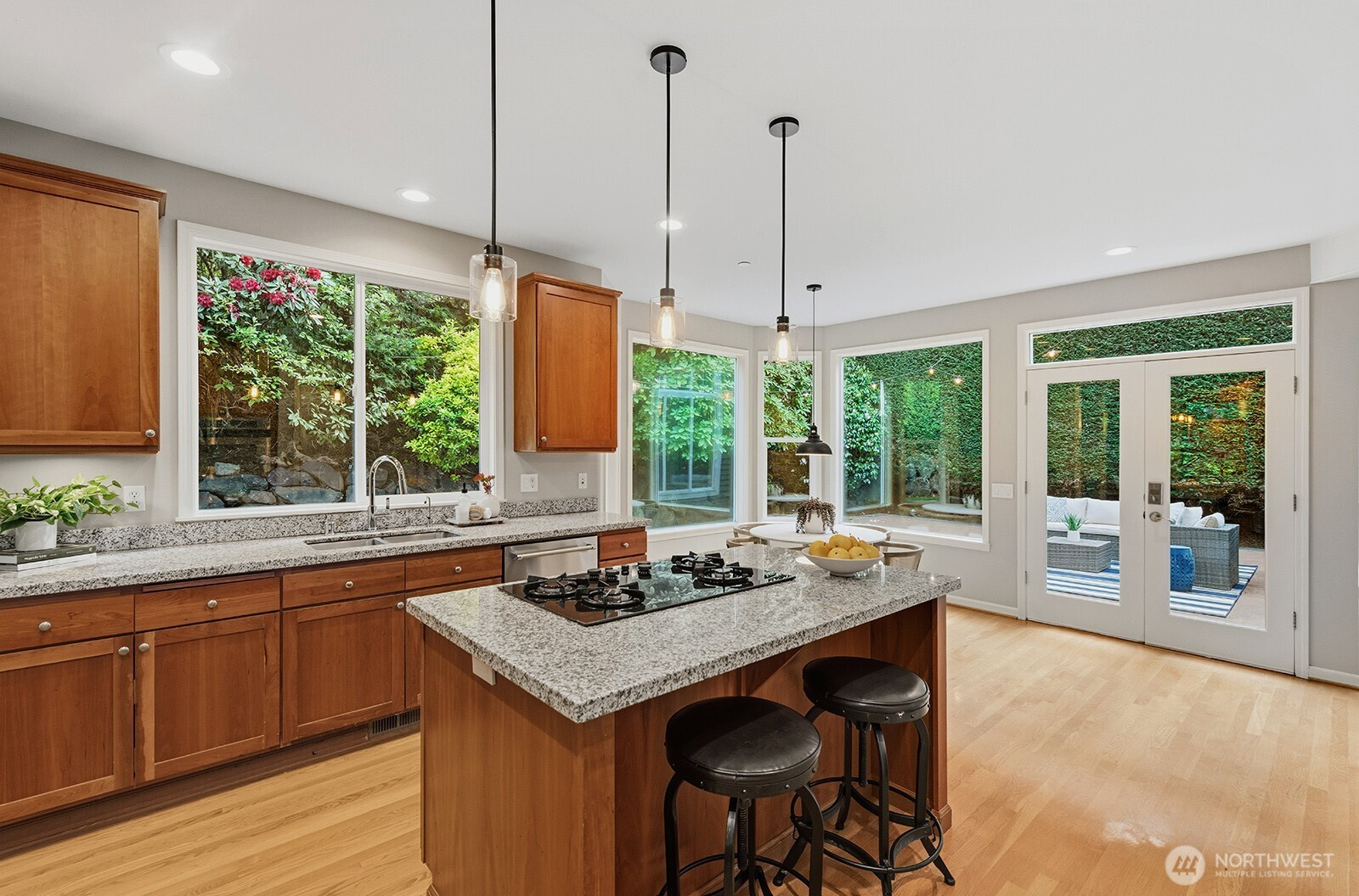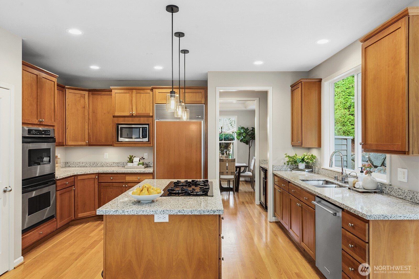 Located on a tranquil corner lot in sought-after Holmes Point, this stunning home offers an exceptional setting with a seamless connection to the outdoors capturing the very best of PNW living. Wrap-around front porch with sunny western exposure welcomes you into a home that balances privacy and connection. Rich oak hardwoods ground the main level, featuring formal living and dining rooms ideal for entertaining. Soaring 18-foot ceilings and walls of glass fill the family room with natural light, anchored by a beautiful gas fireplace for cozy evenings. The chef’s kitchen boasts a Sub-Zero fridge, slab counters, eat-in island, walk-in pantry, and breakfast nook perfect for casual eats. French doors open to a large, private backyard patio surrounded by lush landscaping. A grand staircase flows to an exceptional primary suite with walk-in closet and spa-like 5 piece bath with heated floors. Two additional bedrooms, a full bath, and bonus room complete the upper level. Additional highlights include a fully fenced backyard, sprinkler system, skylights, central vacuum, and oversized 3-car garage. Outdoor adventure awaits just steps away at O.O. Denny Park, the neighborhood boat ramp, and Lake Washington. Enjoy exploring Big Finn Hill Park and Saint Edward State Park, with easy access to Kirkland, I-405, and top-rated schools in the Lake Washington School District. Welcome Home!