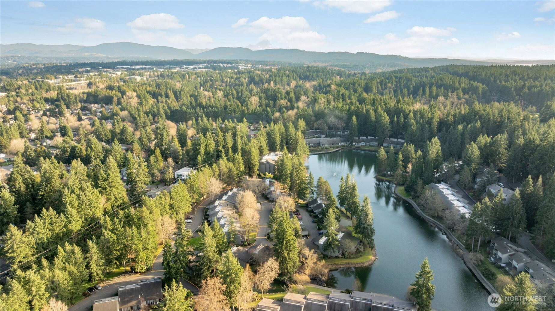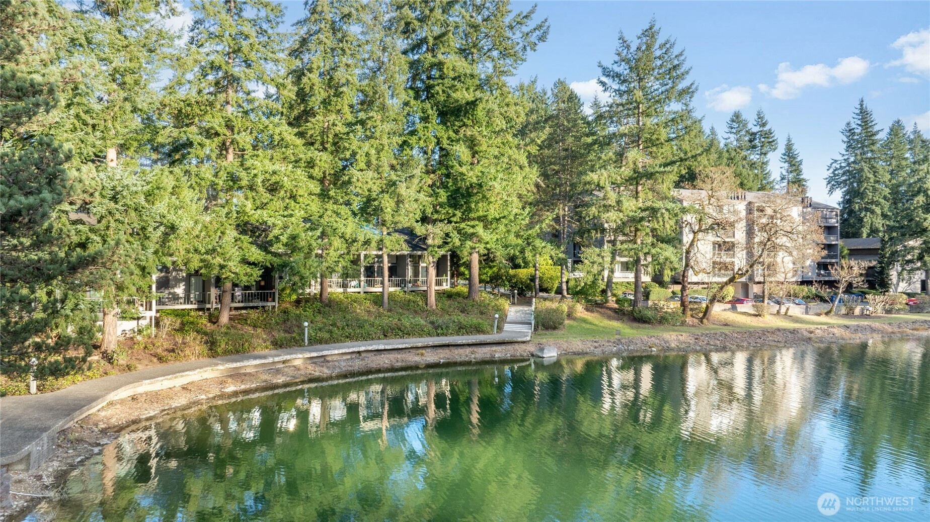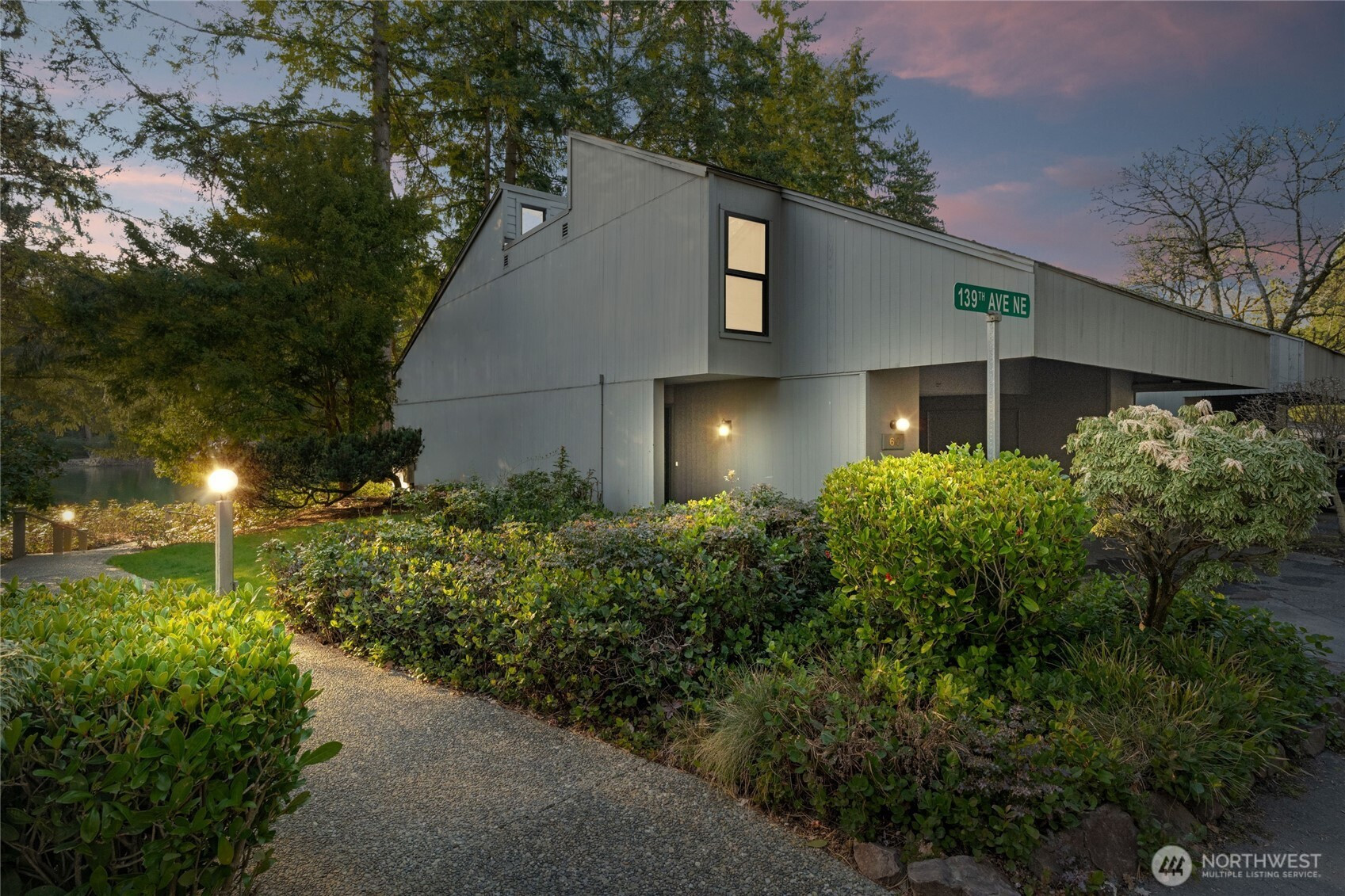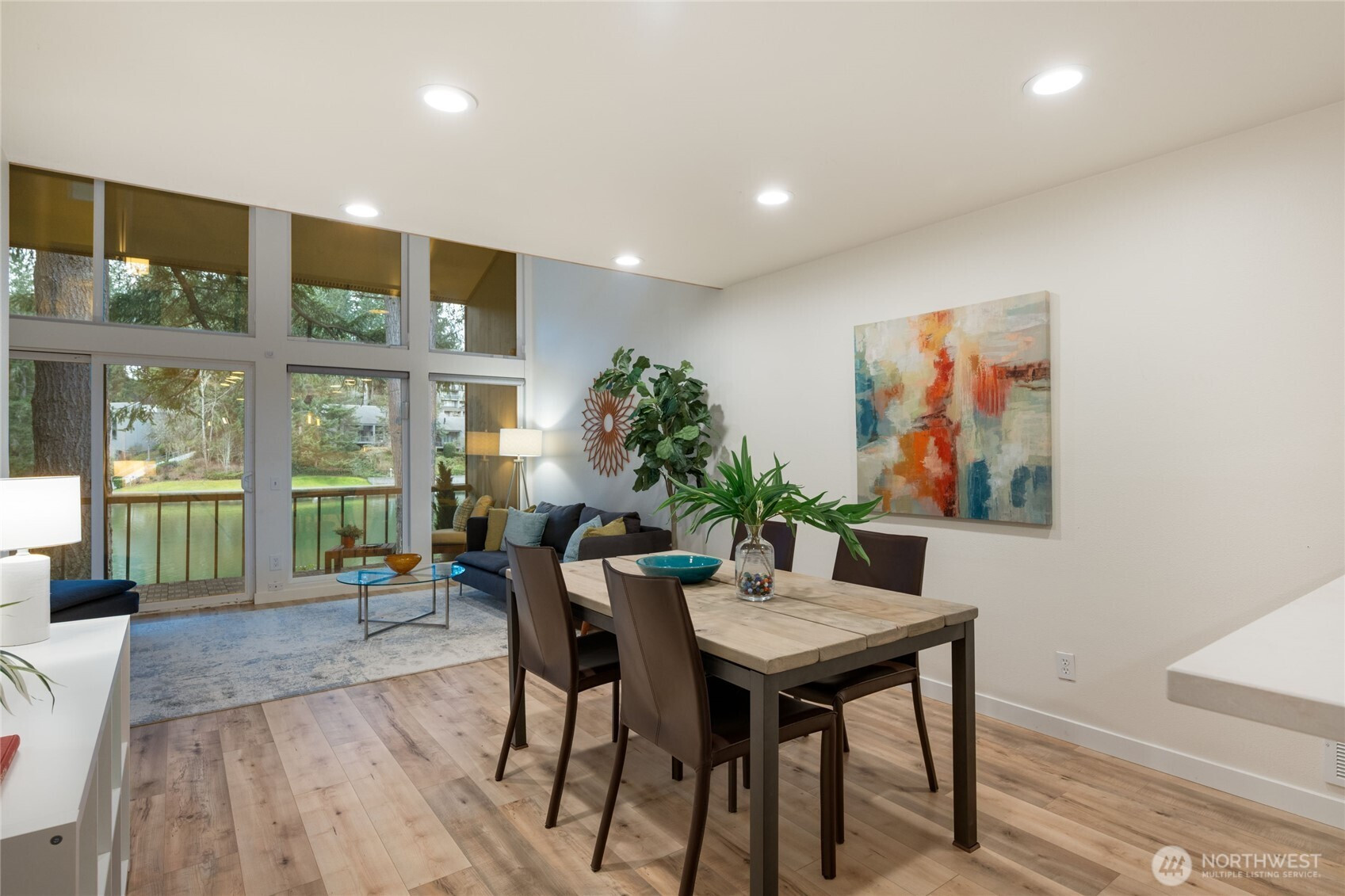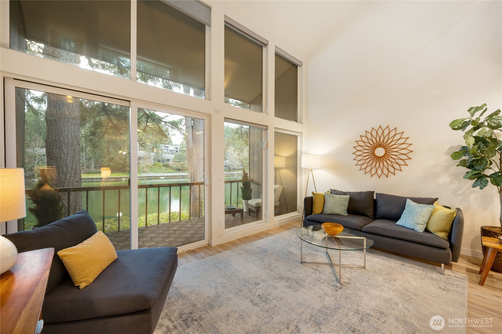 Set at the front of Sixty-01 is this stunning lakefront townhome. End unit home is conveniently located near the entrance of complex but feels private, set amongst the towering trees and walking paths. Enjoy beautiful vistas from the floor to ceiling windows in the spacious Living Room. Skylights and clerestory windows allow soft light on upper level bedrooms and hallway. Light colored, wide plank engineered hardwood flooring throughout home add to the modern and uniform feel of this home. Stylish kitchen is both elegant and functional with warm wood tone cabinetry with lighted drawers. Sleek quartz countertops are combined with stainless steel appliances in the remodeled kitchen. Open floor plan flows to large dining area, perfect for entertaining dinner guests. 1/2 bath and laundry located on main floor. The two bedrooms on upper level are both very spacious with ample closets with new doors. Primary bedroom has interesting architectural elements set into the vaulted ceiling. The second bedroom features a custom horizontal railing with wood and metal. The full bath is conveniently placed between the bedrooms. Carport parking and extra storage complete the package. The condo complex brings the residents together with an amazing amount of amenities. Enjoy the outdoor pool in summer or have a beverage with your neighbors at the Clubhouse. Play a game of pool or tennis or take a stroll through the acres of trails. Super location near high tech corridor, Redwest campus and 520.