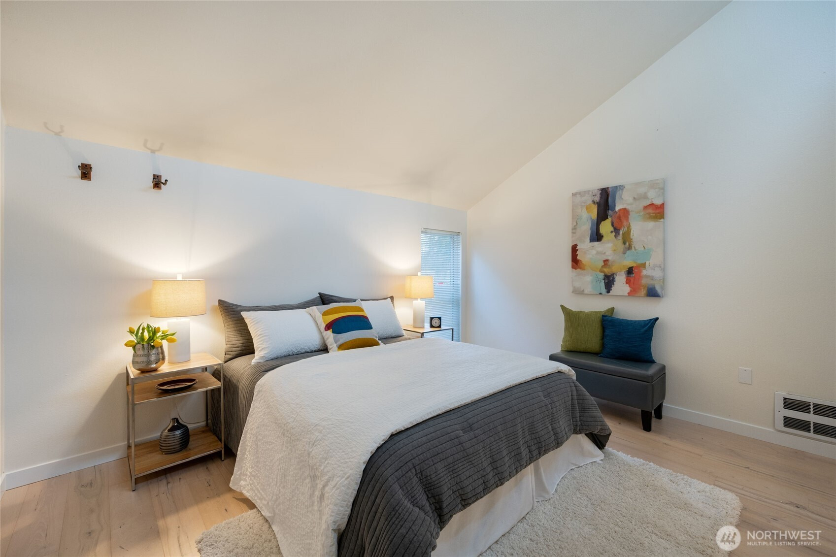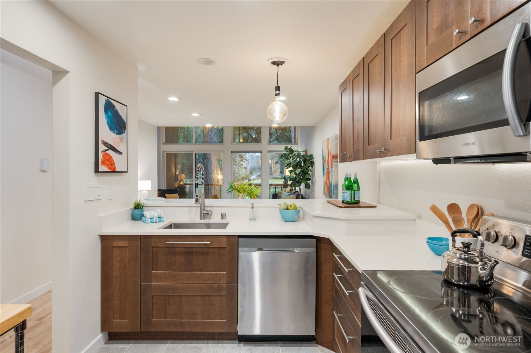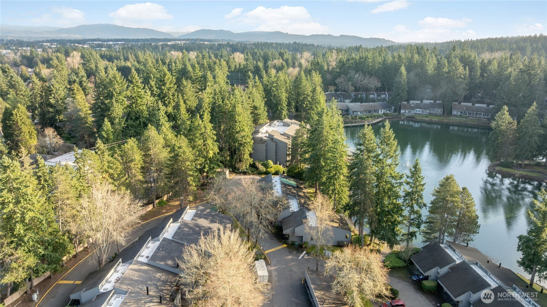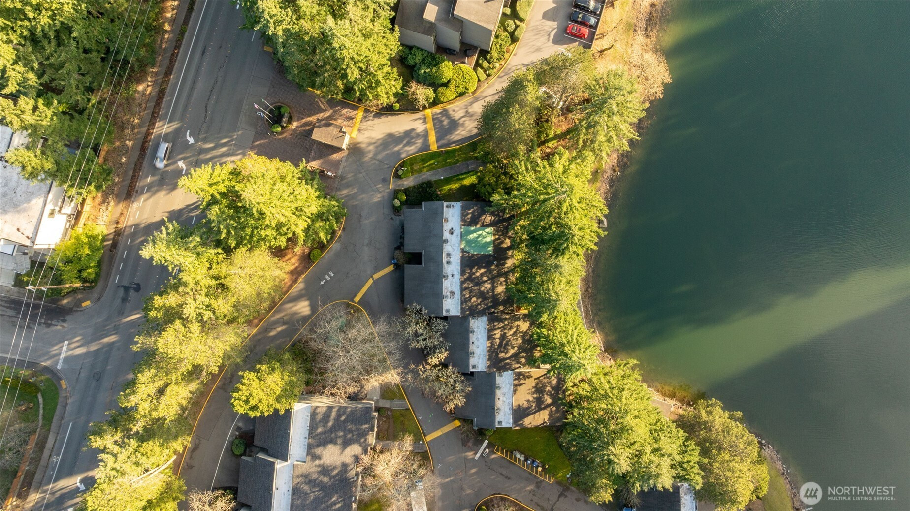 Set at the front of Sixty-01 is this stunning lakefront townhome. End unit home is conveniently located near the entrance of complex but feels private, set amongst the towering trees and walking paths. Enjoy beautiful vistas from the floor to ceiling windows in the spacious Living Room. Skylights and clerestory windows allow soft light on upper level bedrooms and hallway. Light colored, wide plank engineered hardwood flooring throughout home add to the modern and uniform feel of this home. Stylish kitchen is both elegant and functional with warm wood tone cabinetry with lighted drawers. Sleek quartz countertops are combined with stainless steel appliances in the remodeled kitchen. Open floor plan flows to large dining area, perfect for entertaining dinner guests. 1/2 bath and laundry located on main floor. The two bedrooms on upper level are both very spacious with ample closets with new doors. Primary bedroom has interesting architectural elements set into the vaulted ceiling. The second bedroom features a custom horizontal railing with wood and metal. The full bath is conveniently placed between the bedrooms. Carport parking and extra storage complete the package. The condo complex brings the residents together with an amazing amount of amenities. Enjoy the outdoor pool in summer or have a beverage with your neighbors at the Clubhouse. Play a game of pool or tennis or take a stroll through the acres of trails. Super location near high tech corridor, Redwest campus and 520.