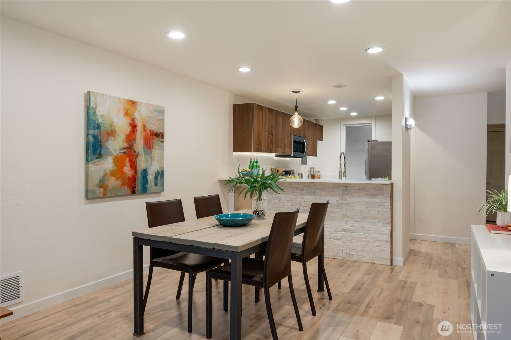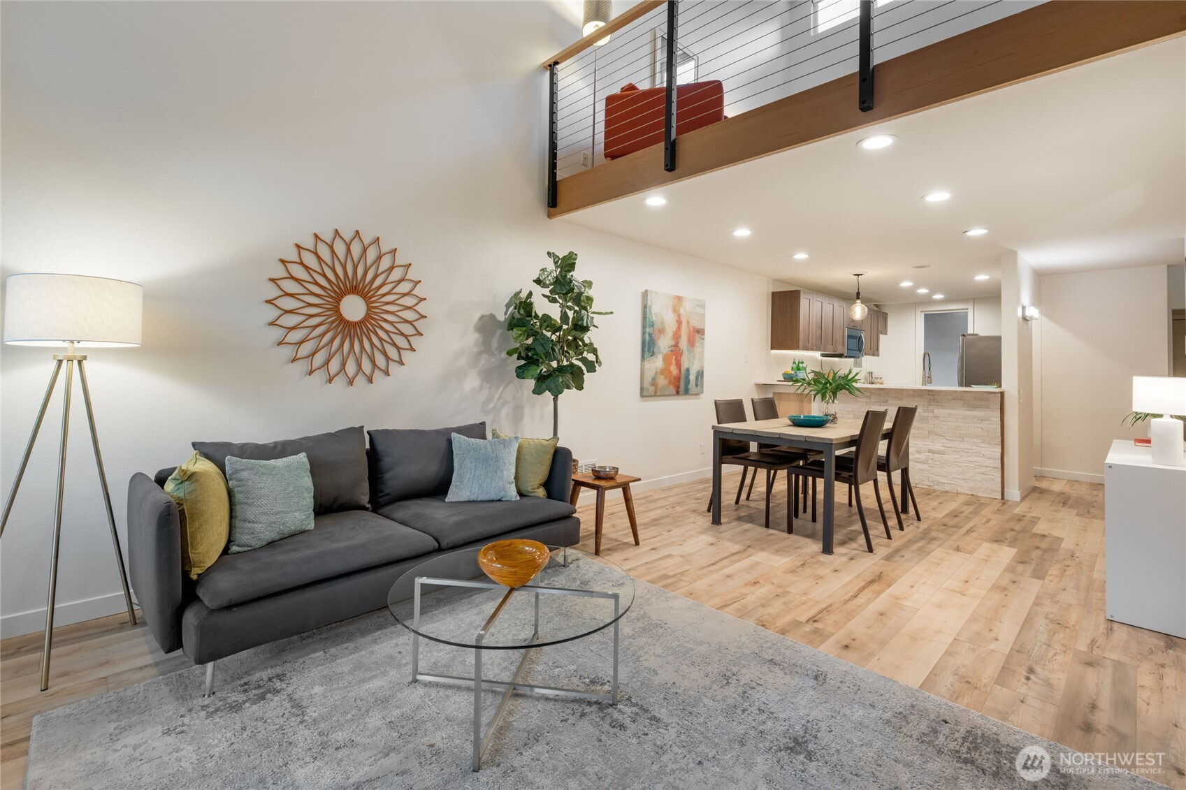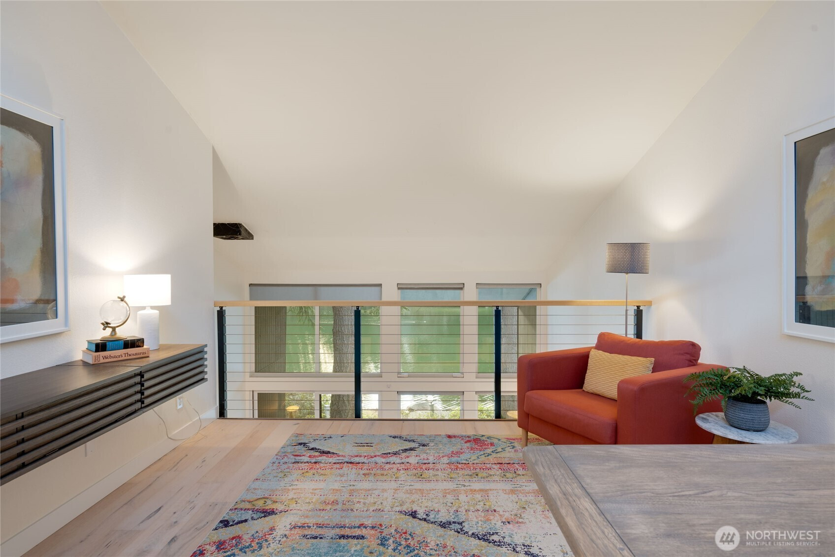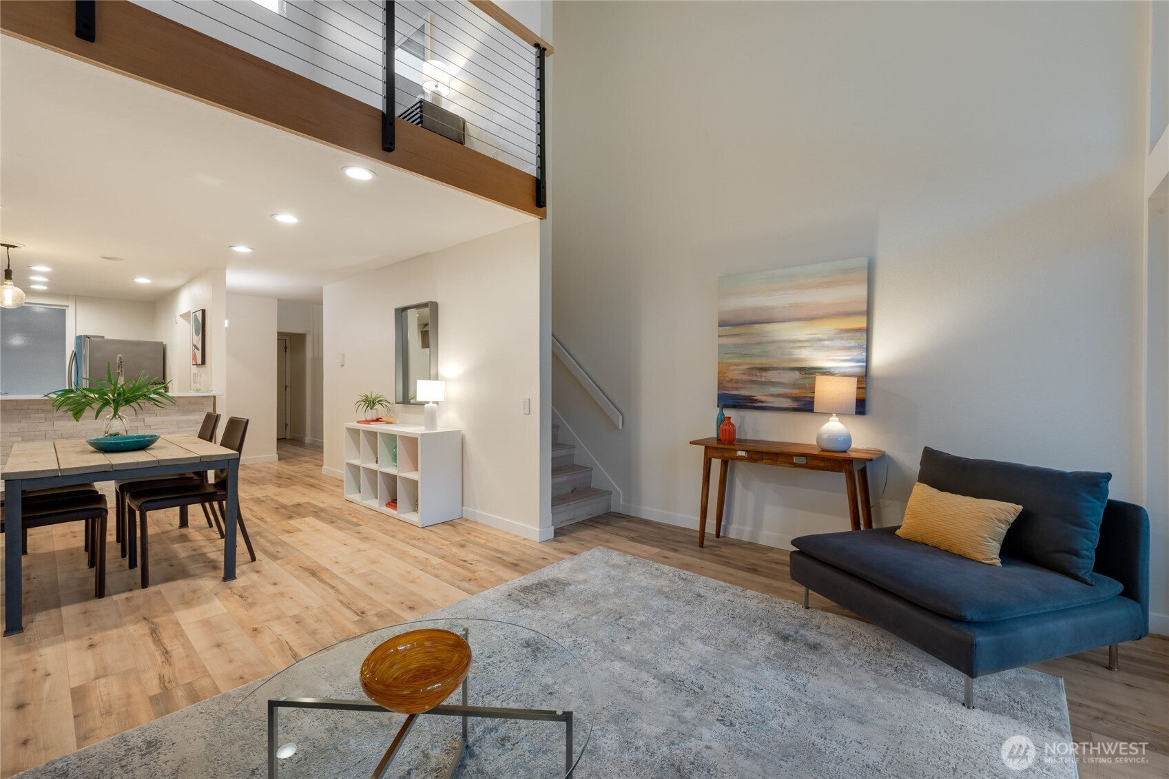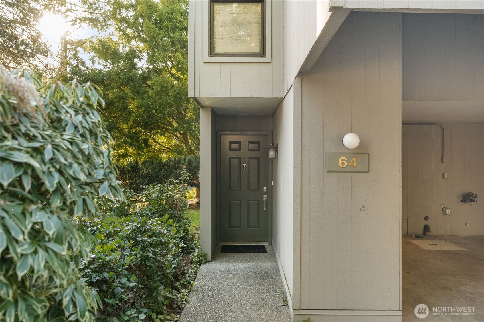 Set at the front of Sixty-01 is this stunning lakefront townhome. End unit home is conveniently located near the entrance of complex but feels private, set amongst the towering trees and walking paths. Enjoy beautiful vistas from the floor to ceiling windows in the spacious Living Room. Skylights and clerestory windows allow soft light on upper level bedrooms and hallway. Light colored, wide plank engineered hardwood flooring throughout home add to the modern and uniform feel of this home. Stylish kitchen is both elegant and functional with warm wood tone cabinetry with lighted drawers. Sleek quartz countertops are combined with stainless steel appliances in the remodeled kitchen. Open floor plan flows to large dining area, perfect for entertaining dinner guests. 1/2 bath and laundry located on main floor. The two bedrooms on upper level are both very spacious with ample closets with new doors. Primary bedroom has interesting architectural elements set into the vaulted ceiling. The second bedroom features a custom horizontal railing with wood and metal. The full bath is conveniently placed between the bedrooms. Carport parking and extra storage complete the package. The condo complex brings the residents together with an amazing amount of amenities. Enjoy the outdoor pool in summer or have a beverage with your neighbors at the Clubhouse. Play a game of pool or tennis or take a stroll through the acres of trails. Super location near high tech corridor, Redwest campus and 520.