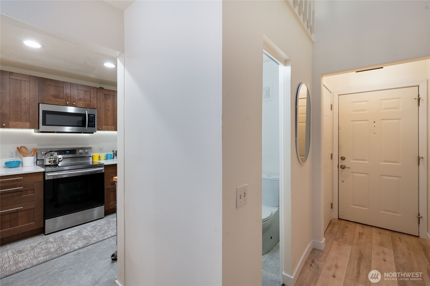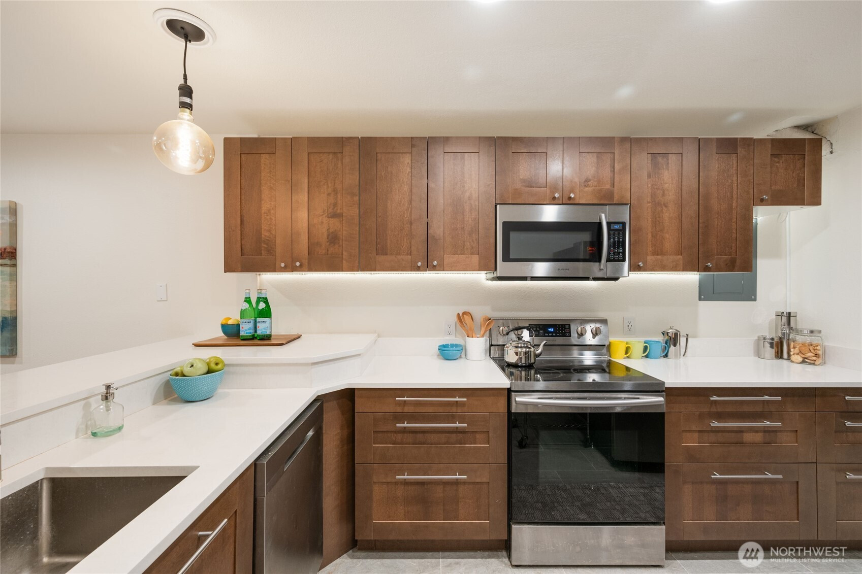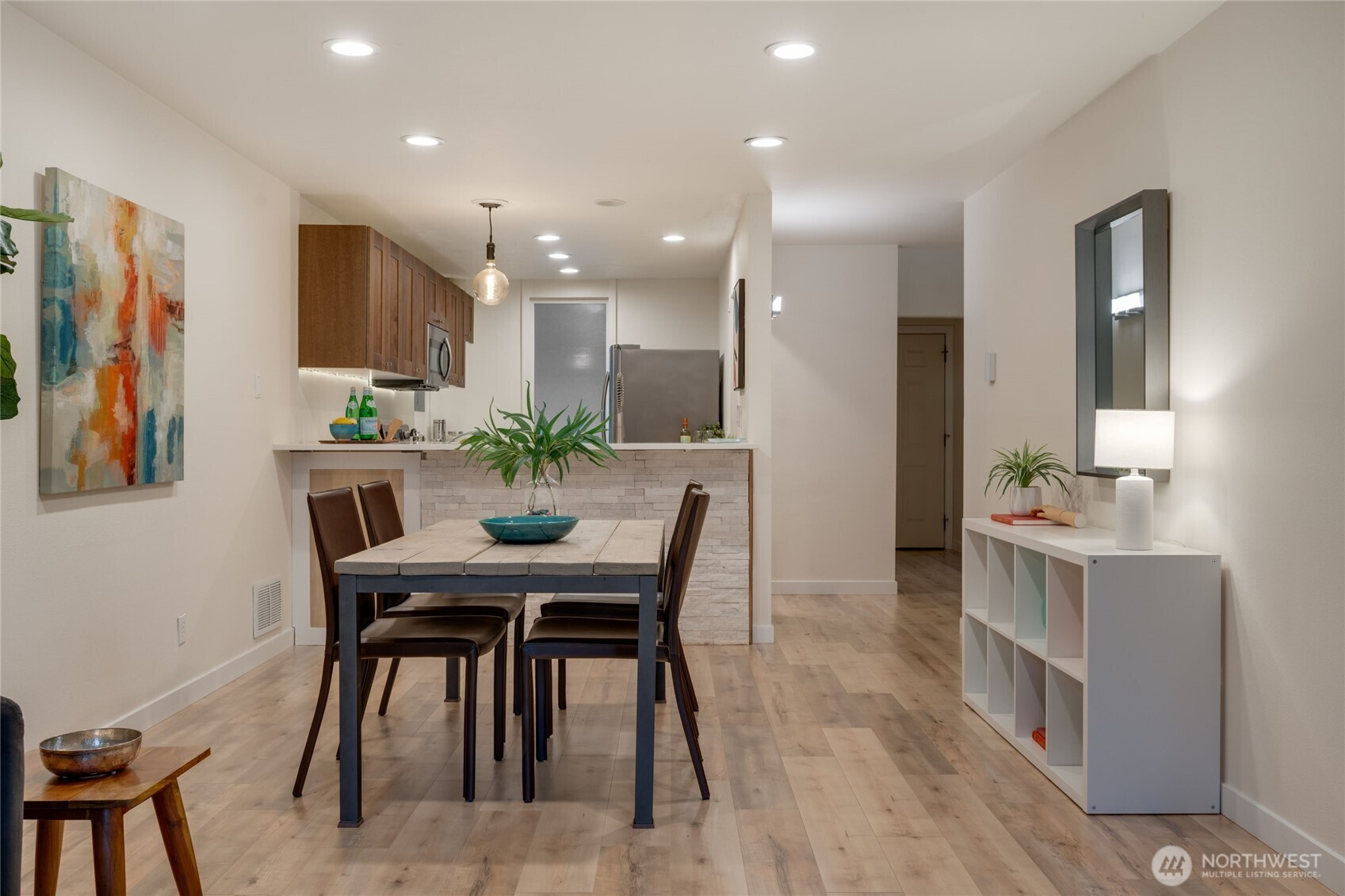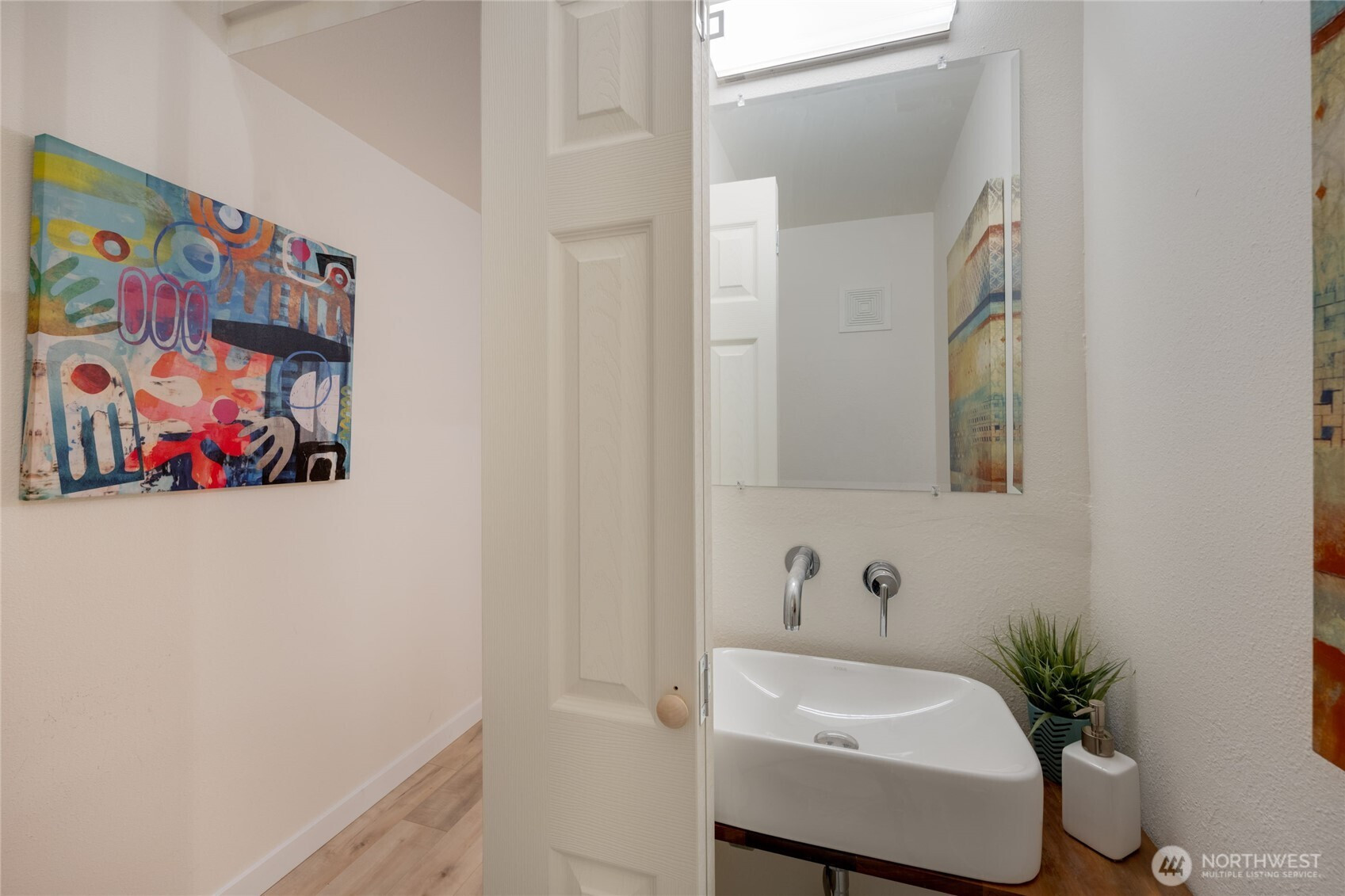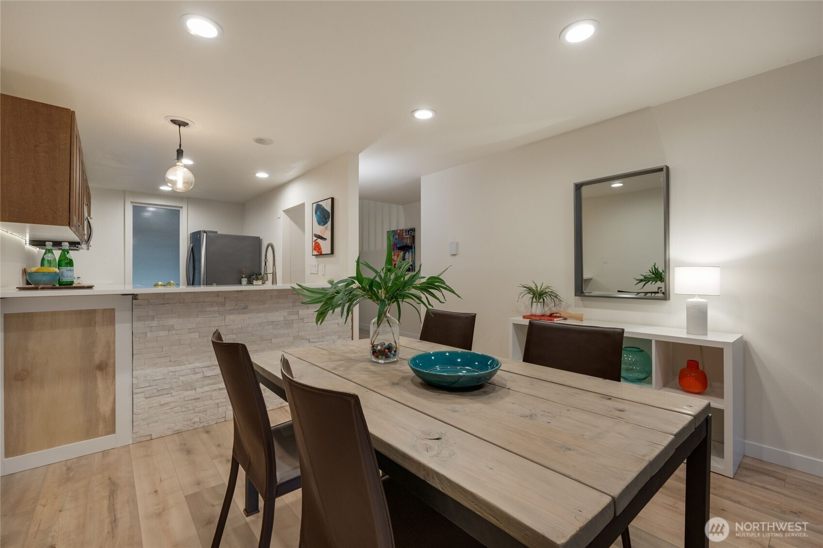 Set at the front of Sixty-01 is this stunning lakefront townhome. End unit home is conveniently located near the entrance of complex but feels private, set amongst the towering trees and walking paths. Enjoy beautiful vistas from the floor to ceiling windows in the spacious Living Room. Skylights and clerestory windows allow soft light on upper level bedrooms and hallway. Light colored, wide plank engineered hardwood flooring throughout home add to the modern and uniform feel of this home. Stylish kitchen is both elegant and functional with warm wood tone cabinetry with lighted drawers. Sleek quartz countertops are combined with stainless steel appliances in the remodeled kitchen. Open floor plan flows to large dining area, perfect for entertaining dinner guests. 1/2 bath and laundry located on main floor. The two bedrooms on upper level are both very spacious with ample closets with new doors. Primary bedroom has interesting architectural elements set into the vaulted ceiling. The second bedroom features a custom horizontal railing with wood and metal. The full bath is conveniently placed between the bedrooms. Carport parking and extra storage complete the package. The condo complex brings the residents together with an amazing amount of amenities. Enjoy the outdoor pool in summer or have a beverage with your neighbors at the Clubhouse. Play a game of pool or tennis or take a stroll through the acres of trails. Super location near high tech corridor, Redwest campus and 520.