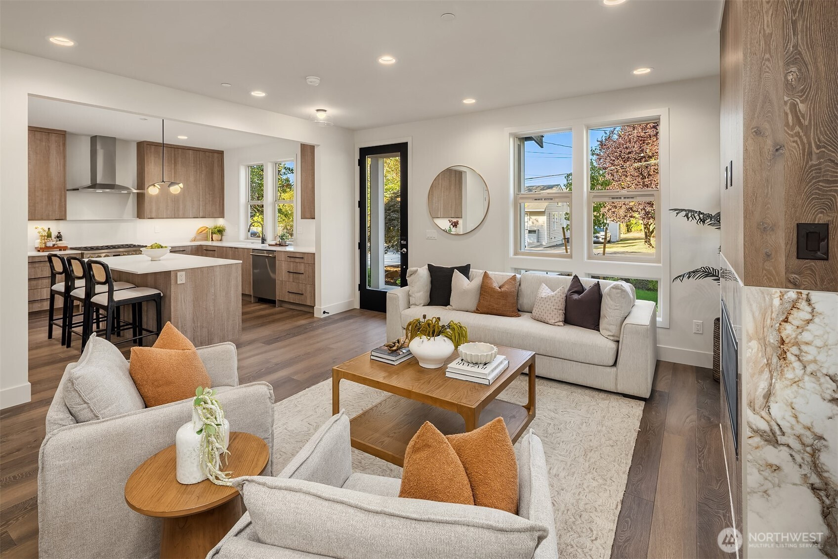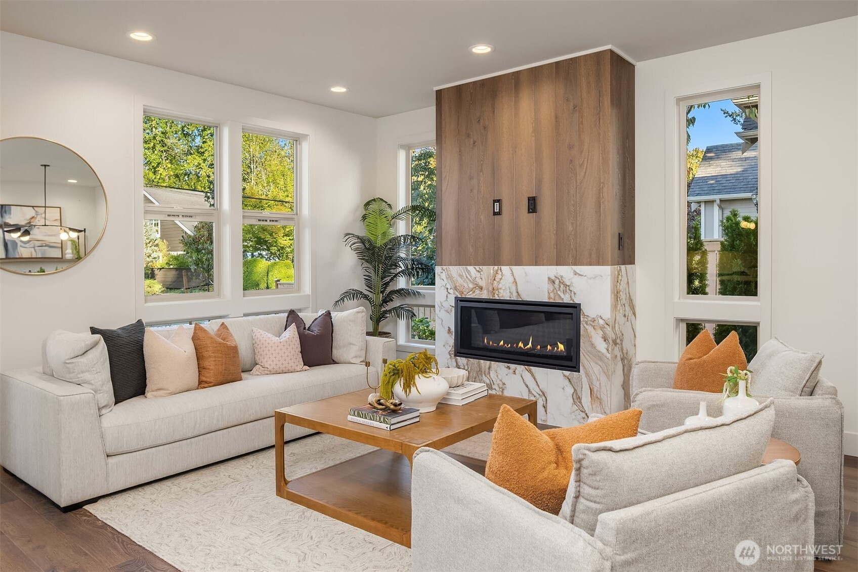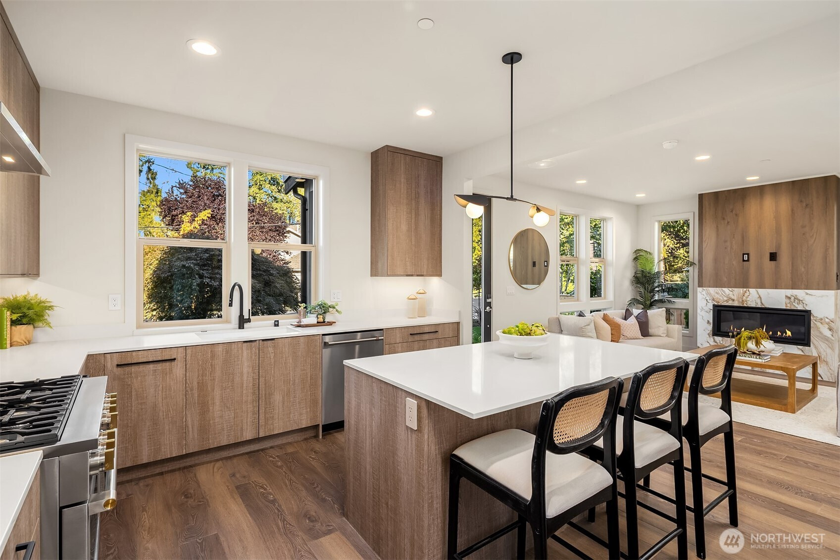 Spacious new construction home in Kirkland's coveted West of Market neighborhood. This fantastic two-story layout has it all including wonderful curb appeal. Main level features open dining and living room with cozy gas fireplace. Functional kitchen is centered around convenient island plus ample storage and pantry space. Powder bath rounds out main floor - making hosting guests a breeze. Upstairs offers a serene primary suite with unique built-in coffee bar with beverage fridge, luxurious bath & WIC. Three additional bedrooms, full bath, and oversized laundry with extensive storage complete second level. Enjoy proximity to Lake Washington, Waverly Beach Park, and downtown Kirkland. Two-car EV-ready garage completes this remarkable home!