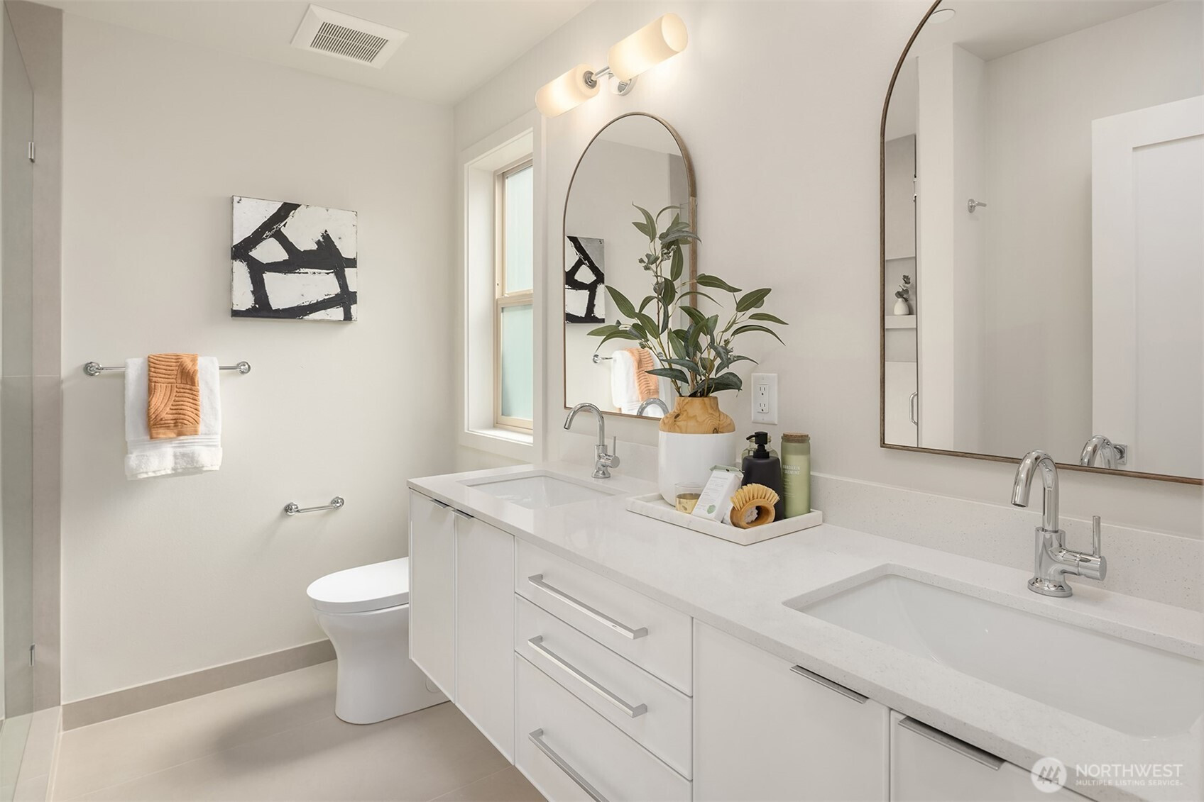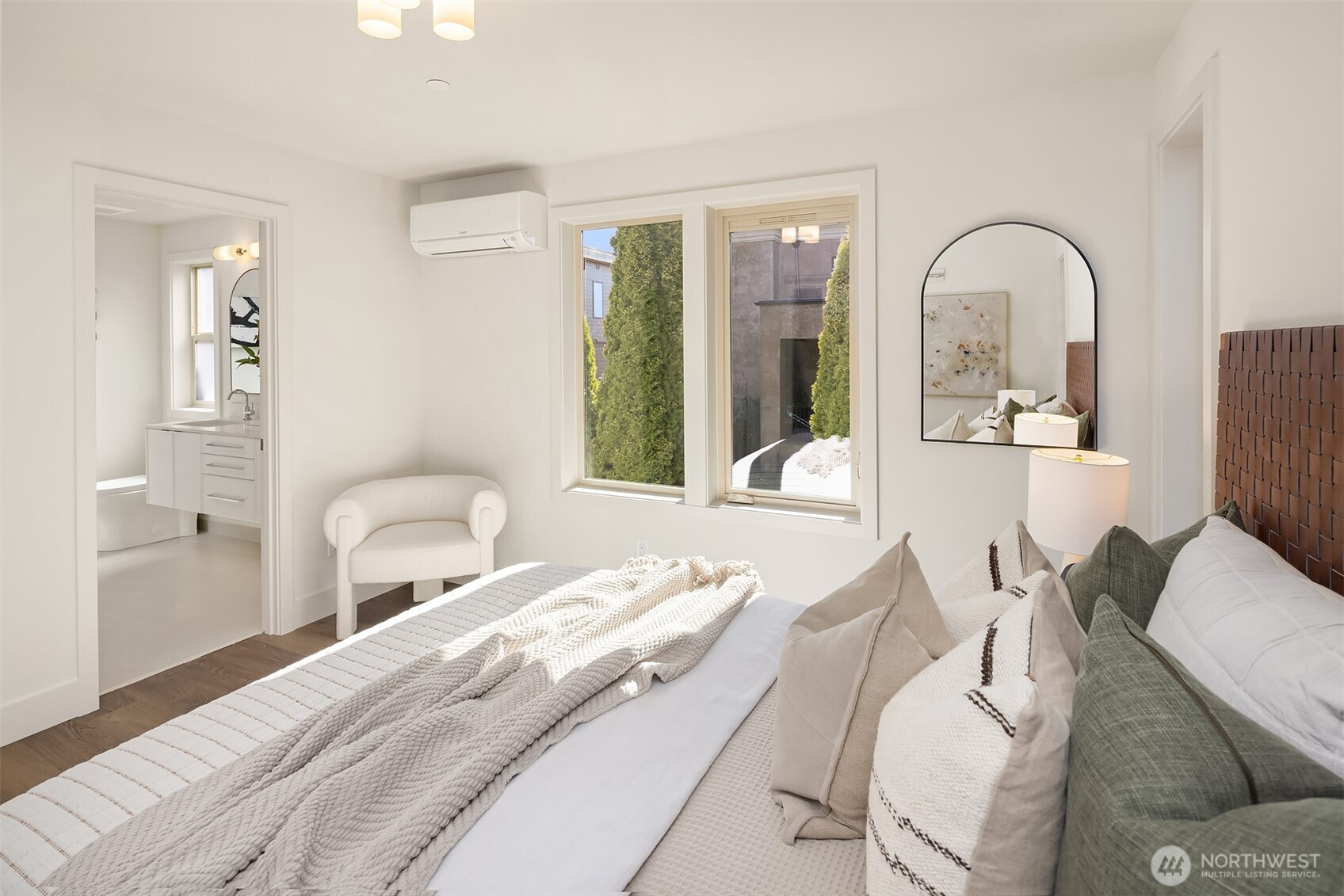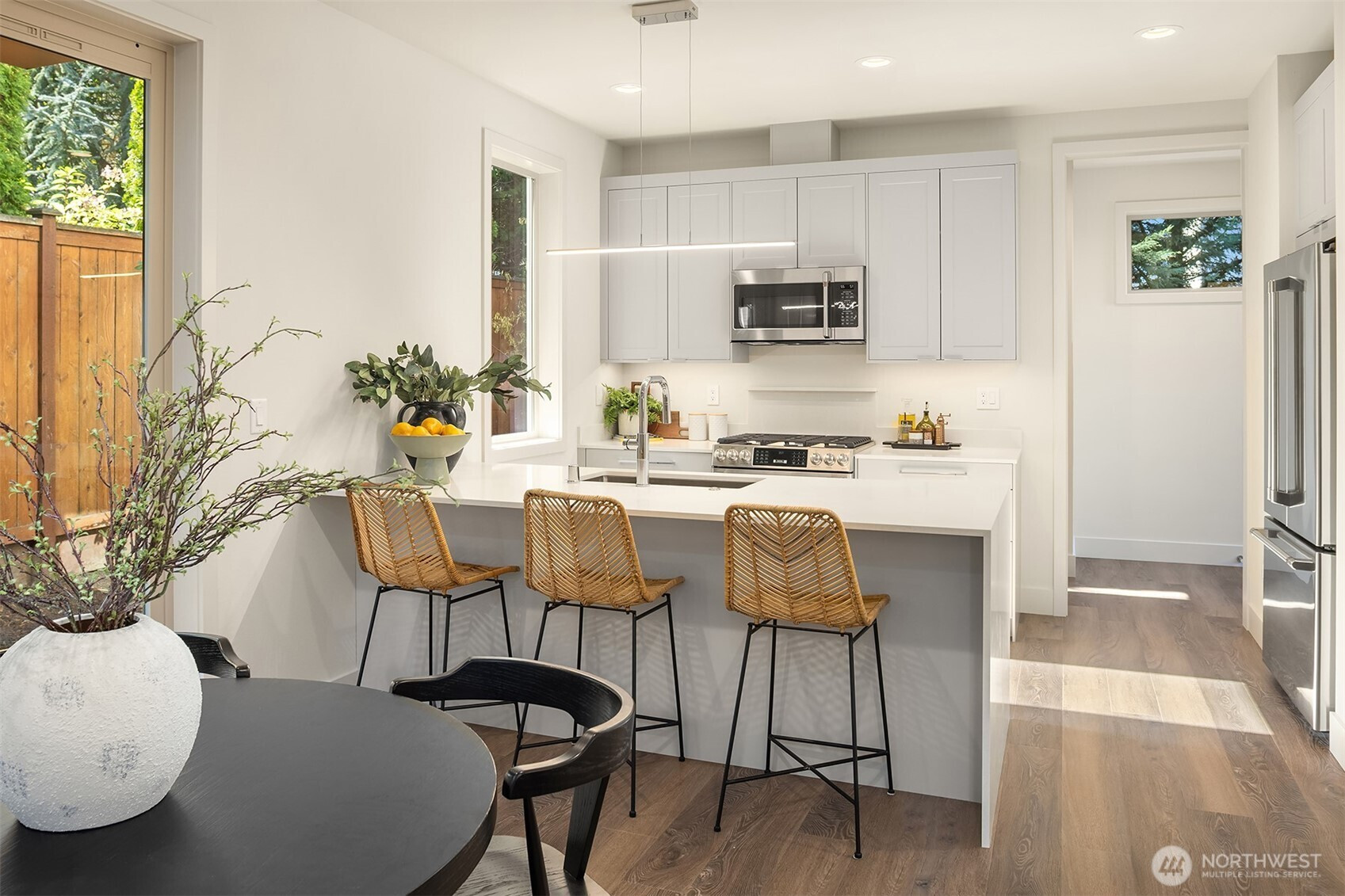 Welcome to this new construction, stand-alone home in Kirkland's West of Market neighborhood. Main floor features cozy fireplace and open concept living and dining area. Large kitchen peninsula adds functional counter space additional storage, and convenient seating. Private yard space is perfect for BBQs or pets. Two entrances, ample storage and powder bath all add to the highly functional design. Upstairs, both bedrooms feature an ensuite bath, making this home both practical and exceptionally comfortable. Enjoy proximity to Lake Washington, Waverly Beach Park, and downtown Kirkland. Included off-street parking adds to convenience of this amazing home.