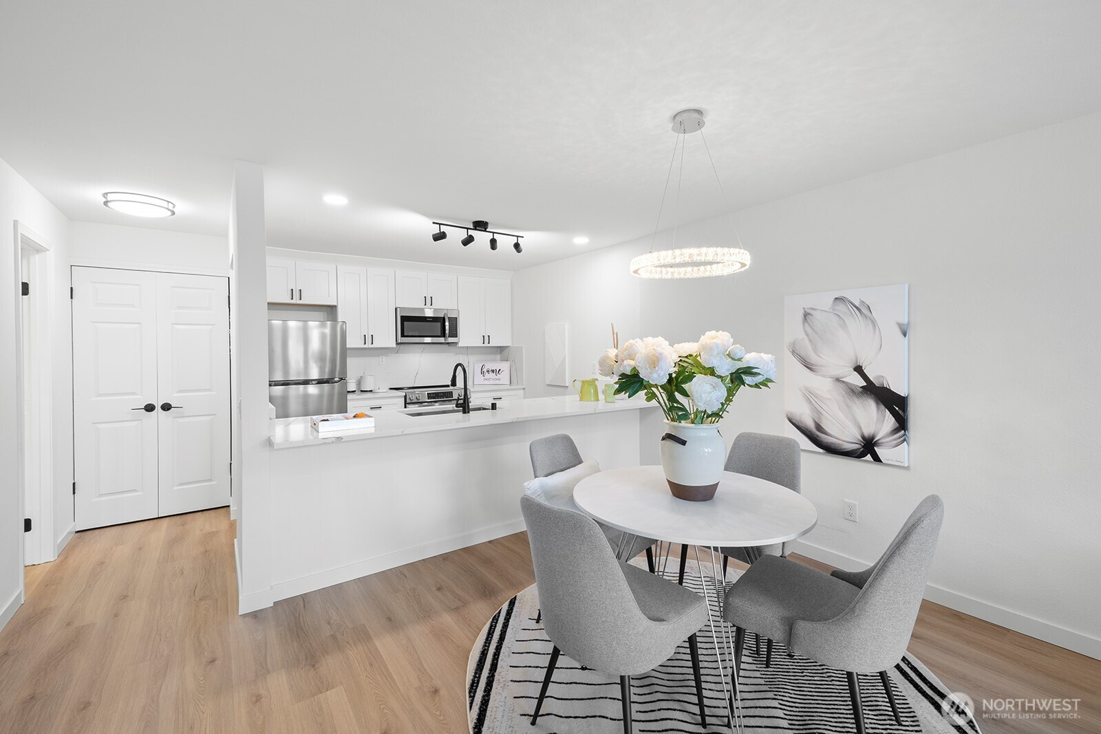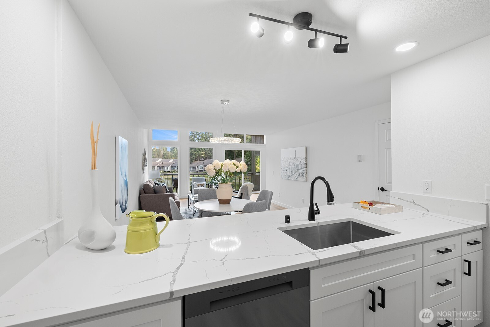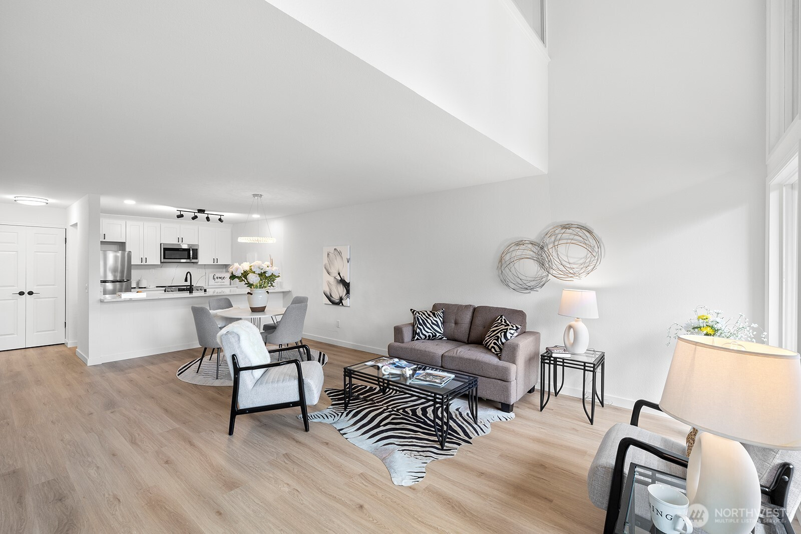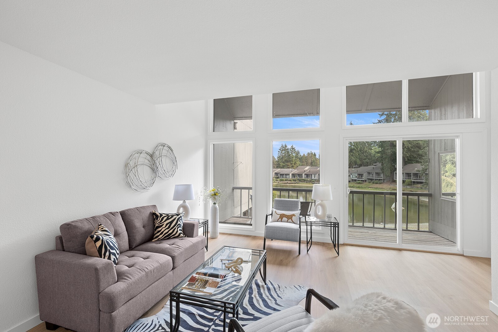 Welcome to this completely remodeled lakefront townhome! The interior is light and airy with new plank floors/carpeting, new lighting, wall of windows to highlight the view! Kitchen is impressive with new stainless appliances, new cabinets, quartz countertops/seating bar. Bathrooms updated with new vanities, new tile in shower. Relax on the large view deck! Primary bedroom has vaulted ceilings & high windows. 2nd bedroom would be perfect for den or office. W/D included. Enjoy the Clubhouse, just seconds away with large pool, restaurant, gym, sauna, more! Carport parking w/ locked storage + ample extra parking nearby. Sixty-01 has gated entry, 4 pools, 3 lakes, 83 acres of trails/parks, more! Well-funded, strong HOA. NO Special Assessments.
