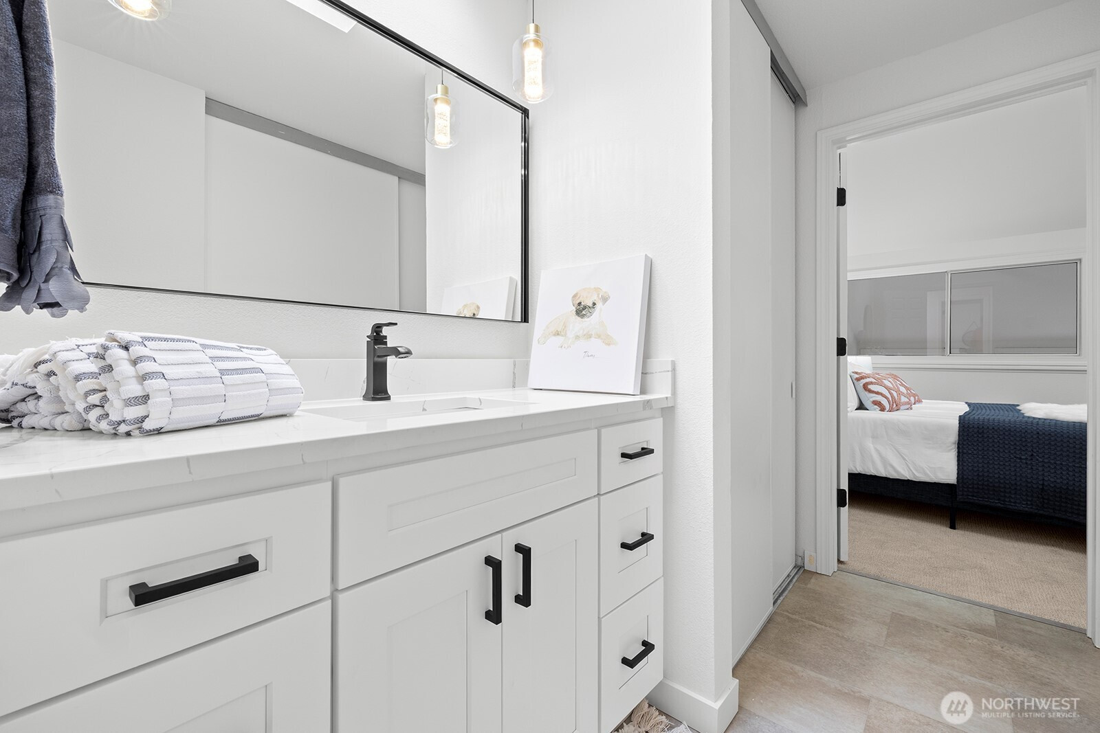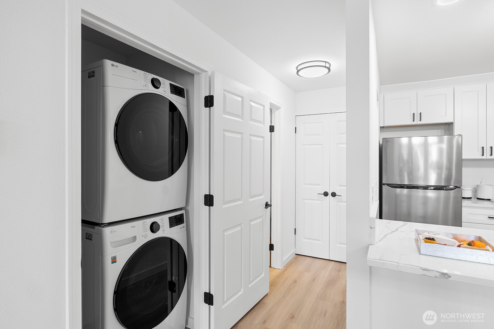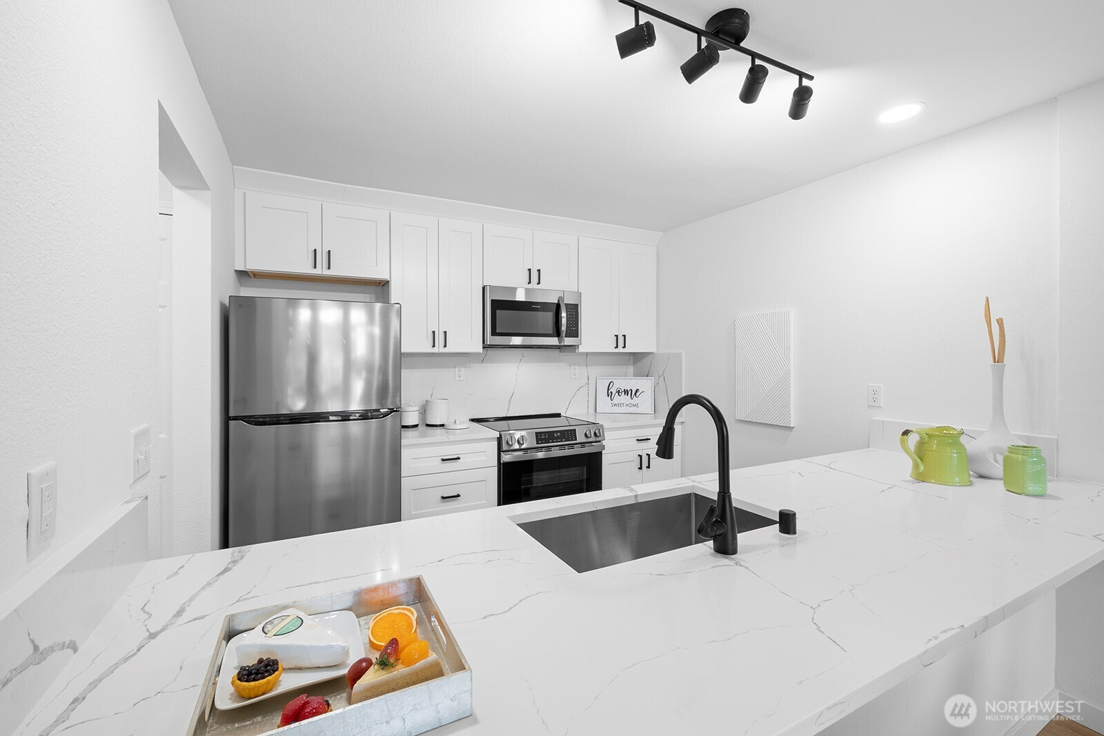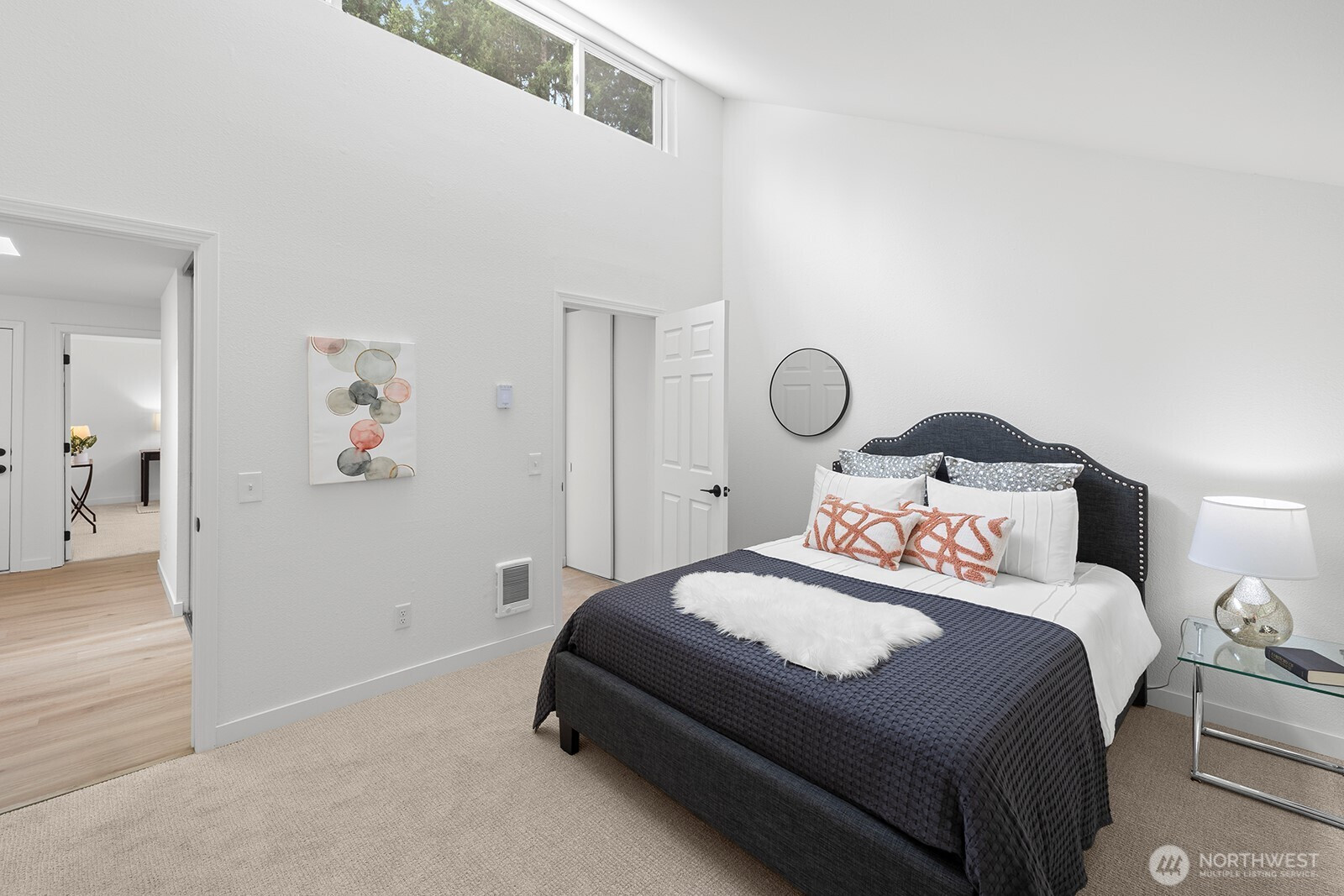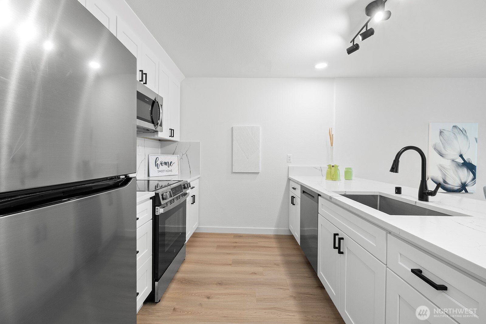 Welcome to this completely remodeled lakefront townhome! The interior is light and airy with new plank floors/carpeting, new lighting, wall of windows to highlight the view! Kitchen is impressive with new stainless appliances, new cabinets, quartz countertops/seating bar. Bathrooms updated with new vanities, new tile in shower. Relax on the large view deck! Primary bedroom has vaulted ceilings & high windows. 2nd bedroom would be perfect for den or office. W/D included. Enjoy the Clubhouse, just seconds away with large pool, restaurant, gym, sauna, more! Carport parking w/ locked storage + ample extra parking nearby. Sixty-01 has gated entry, 4 pools, 3 lakes, 83 acres of trails/parks, more! Well-funded, strong HOA. NO Special Assessments.