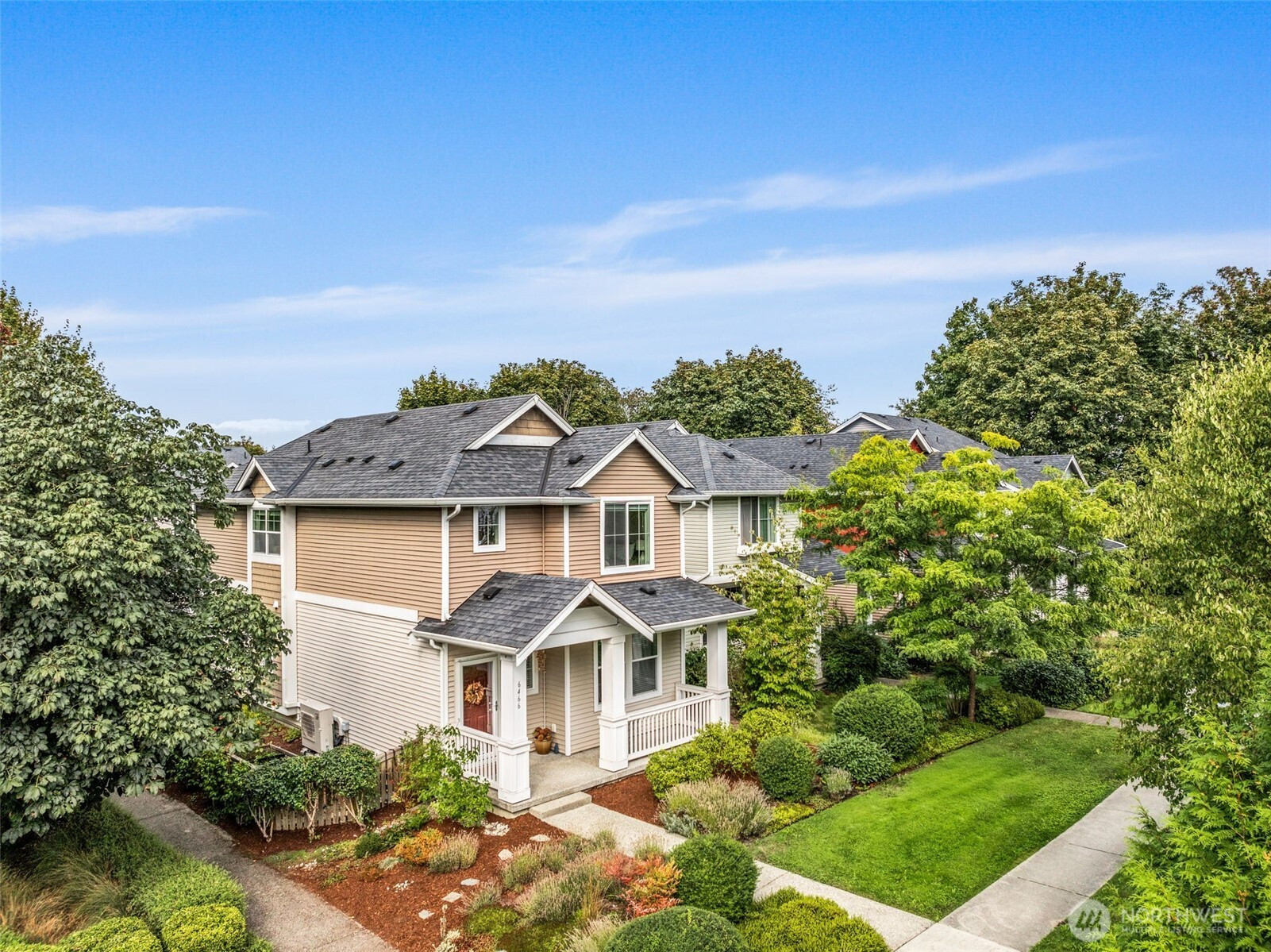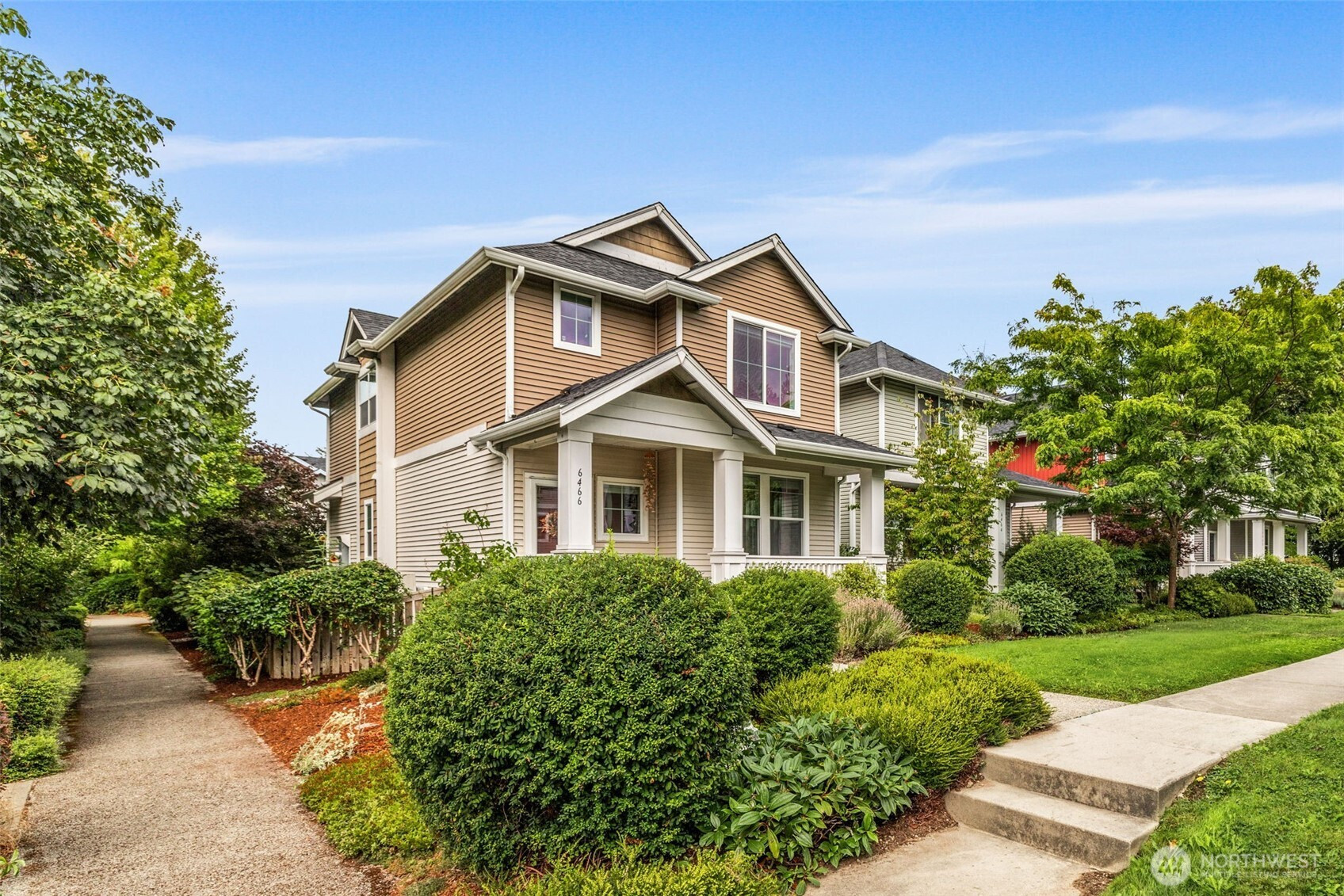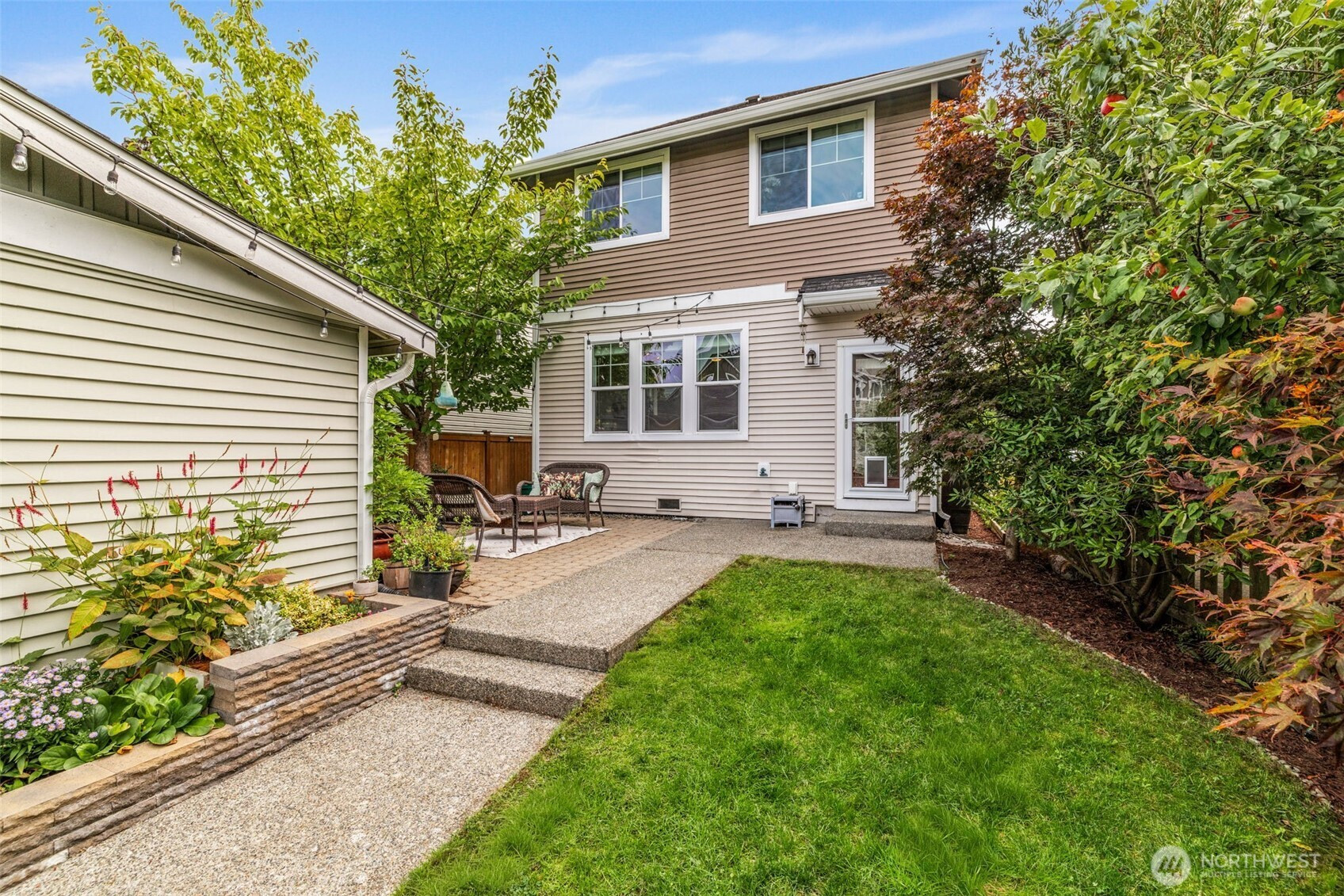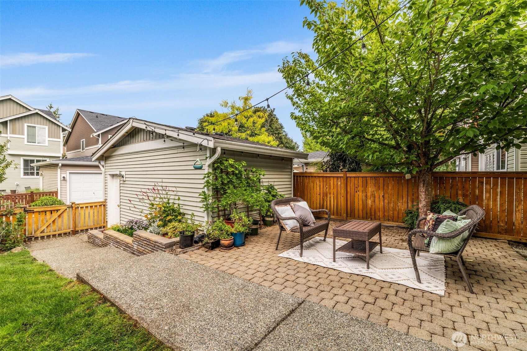 Step into this sunlit retreat, set on a large corner lot — a rare combo for this neighborhood. The detached home balances privacy with community charm. The main level features soaring ceilings, abundant natural light, and an open kitchen with oversized island, stainless appliances, and ample storage, all flowing seamlessly into the dining and living areas anchored by a cozy fireplace. Upstairs, three bedrooms include a spacious primary suite with walk-in closet and private bath. Outside, enjoy a fully fenced backyard with patio, apple trees, grapevines, and your own strawberries and blueberries. A detached garage adds both security and convenience. With an easy commute to downtown Seattle, this turn-key home blends comfort and lifestyle.