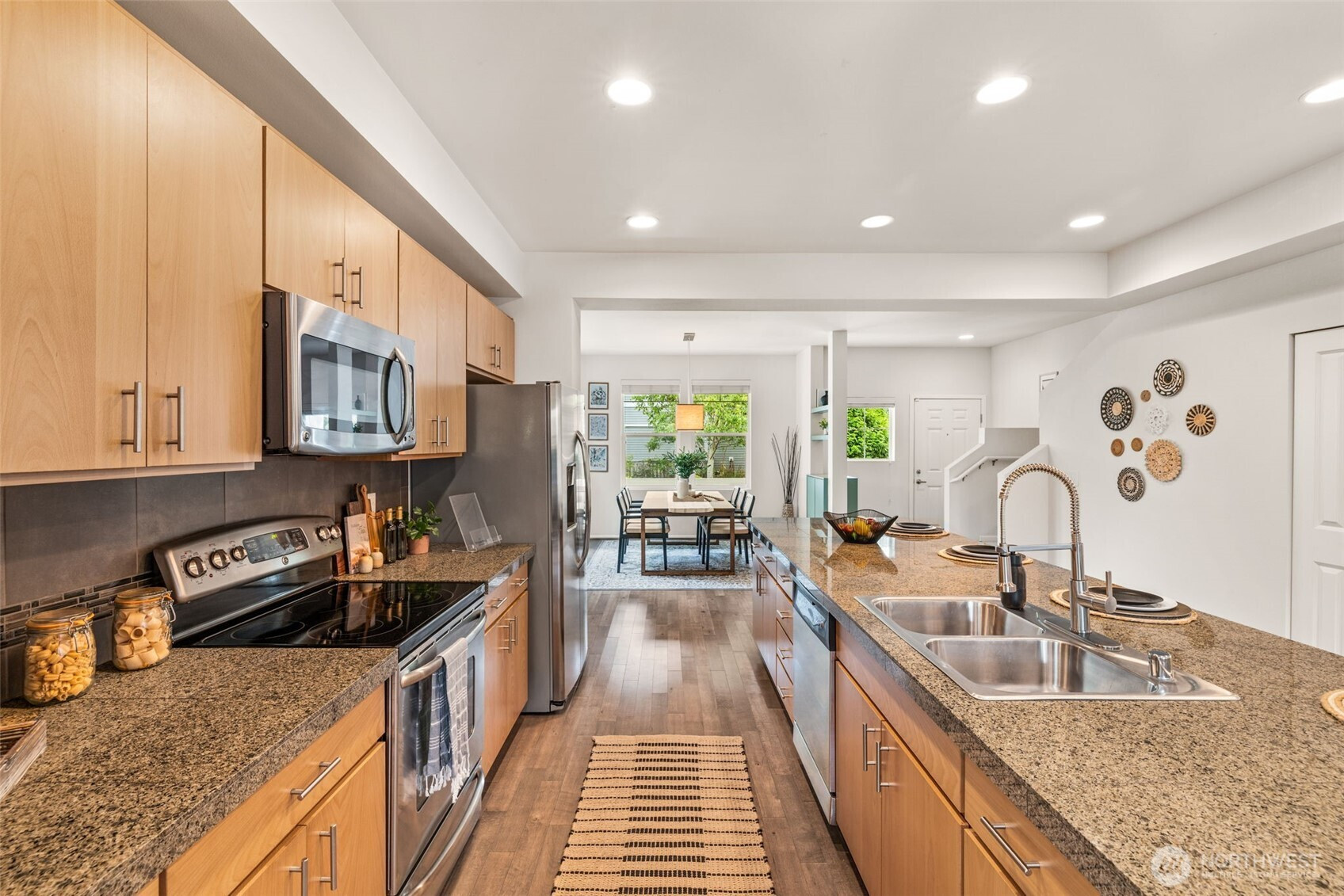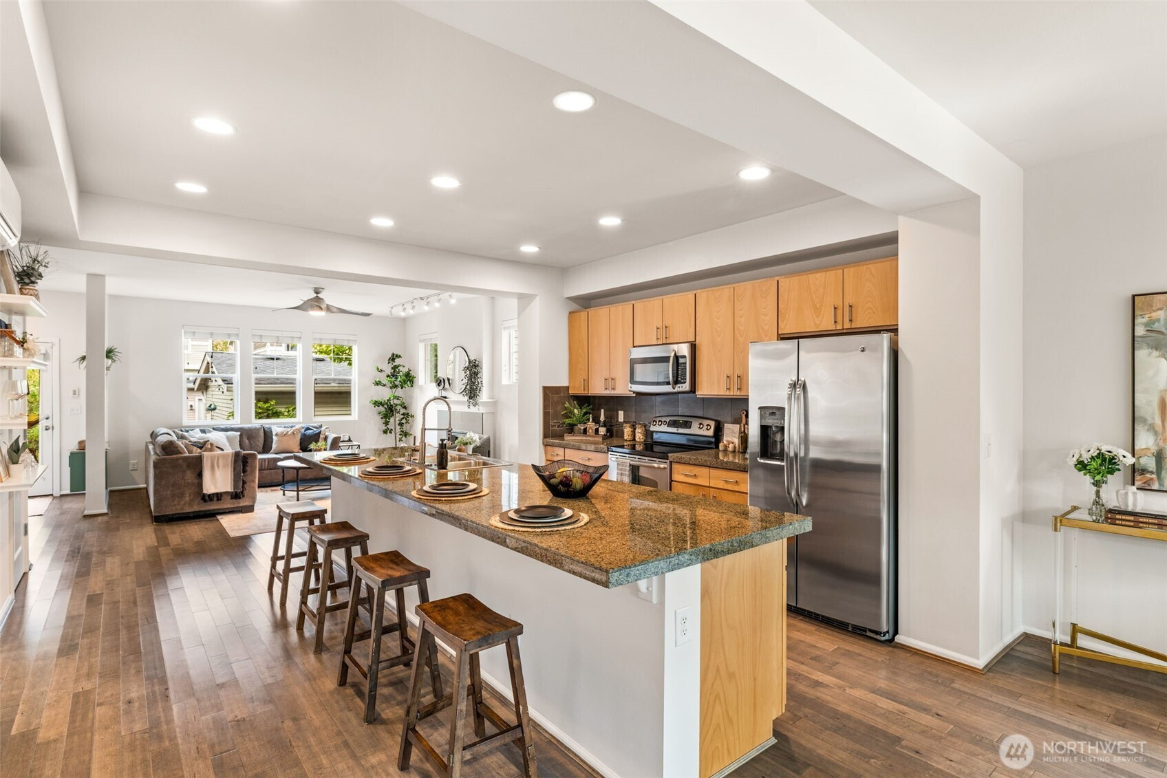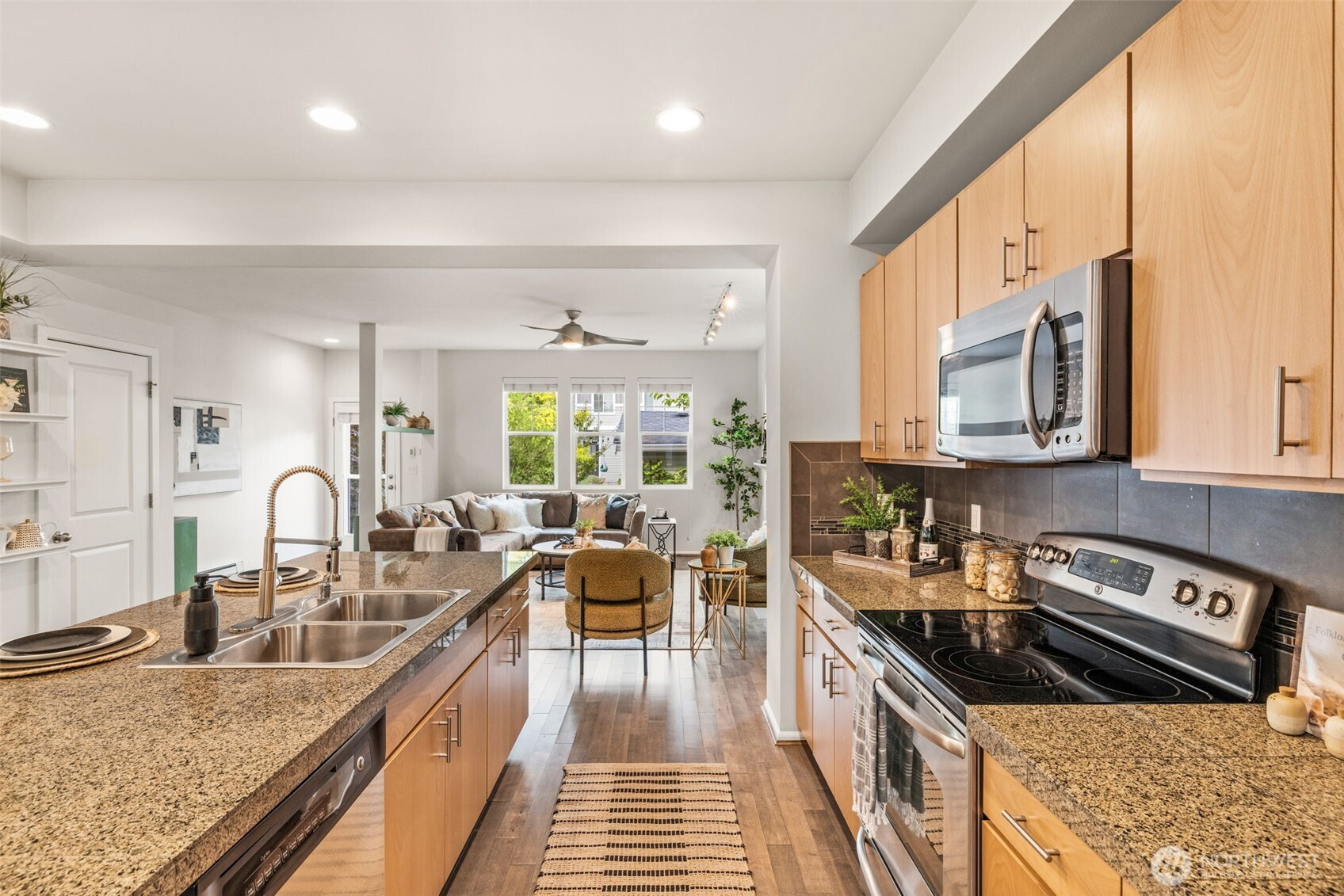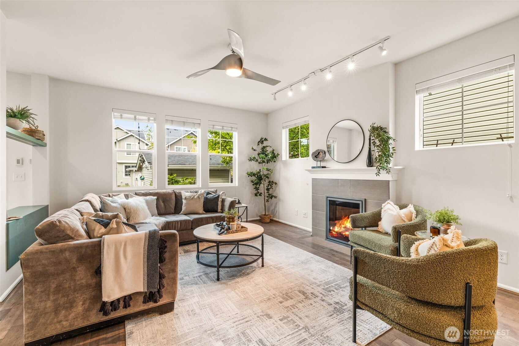 Step into this sunlit retreat, set on a large corner lot — a rare combo for this neighborhood. The detached home balances privacy with community charm. The main level features soaring ceilings, abundant natural light, and an open kitchen with oversized island, stainless appliances, and ample storage, all flowing seamlessly into the dining and living areas anchored by a cozy fireplace. Upstairs, three bedrooms include a spacious primary suite with walk-in closet and private bath. Outside, enjoy a fully fenced backyard with patio, apple trees, grapevines, and your own strawberries and blueberries. A detached garage adds both security and convenience. With an easy commute to downtown Seattle, this turn-key home blends comfort and lifestyle.