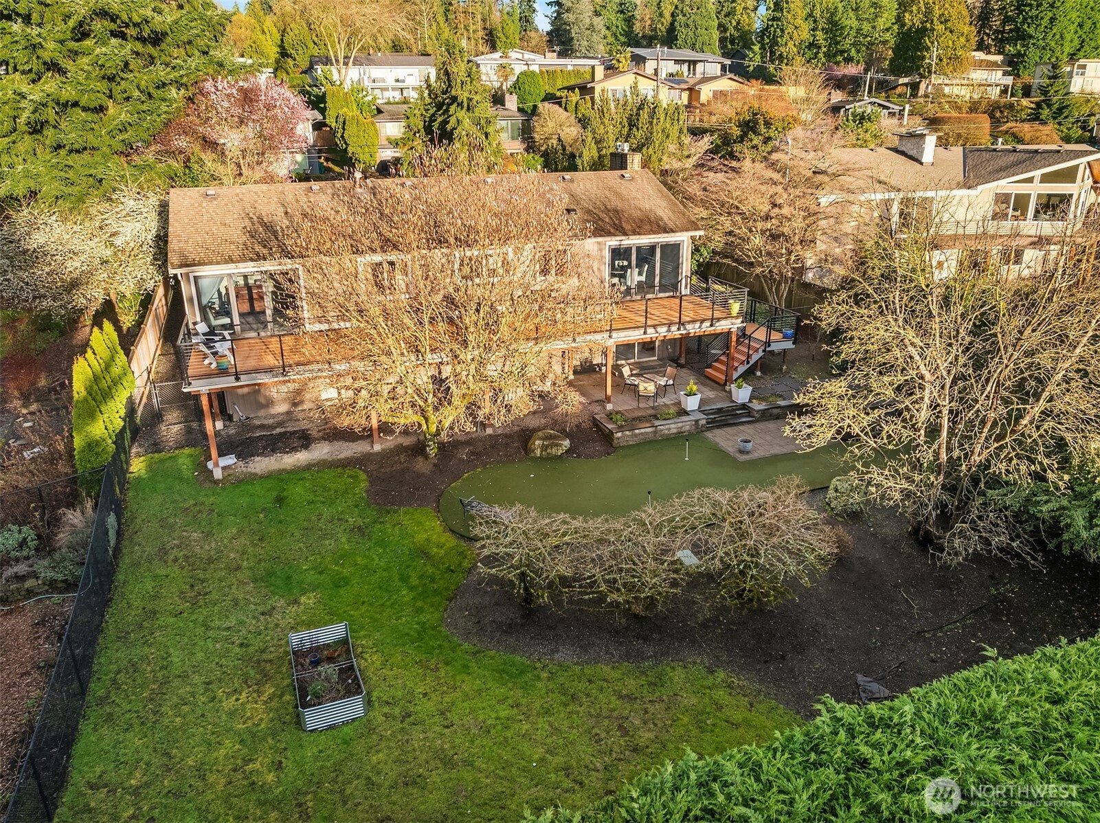 Stellar Houghton location and beautiful, luxurious updates make this 5BR Kirkland home a 'must-see'. The entryway leads to the stunning living room space boasting shiplap wood vaulted ceiling, a grand stacked stone gas fireplace with hearth, and rich hardwood floors. The large kitchen with eating space has new quartz countertops & backsplash, a beautiful accent to the generous wood cabinetry and top end chef's grade SS appliance package. Nano doors open the dining room to seamlessly connect with the beautiful outdoors. A maintenance free composite deck runs the full length of the house and shares western skies with a stunning mature Magnolia. The Primary, two more bedrooms and full bath complete the main floor. A completely finished/renovated lower level invites the fun to begin. A custom, stacked stone and wood block Wet Bar with seating is the centerpiece of the Great Room. The brick, gas fireplace adds ambience to the multiple 'play' spaces. Sliding doors open to the stone patio with heaters, a 60ft turf putting green, fire pit & hot tub. Also on lower level, the temperature controlled, 500+ bottle wine cellar, laundry room & two more bedrooms. A stunning custom Bath w/double vanity, seamless shower w/full quartz surround & heated floors complete the luxury experience. Located close to I-405 and 520 gives you premier access to Redmond/Microsoft, Bellevue and DT Seattle. Google, Met Market and DT Kirkland are minutes away. Top ranked LW Schools and Lakeview Elementary.