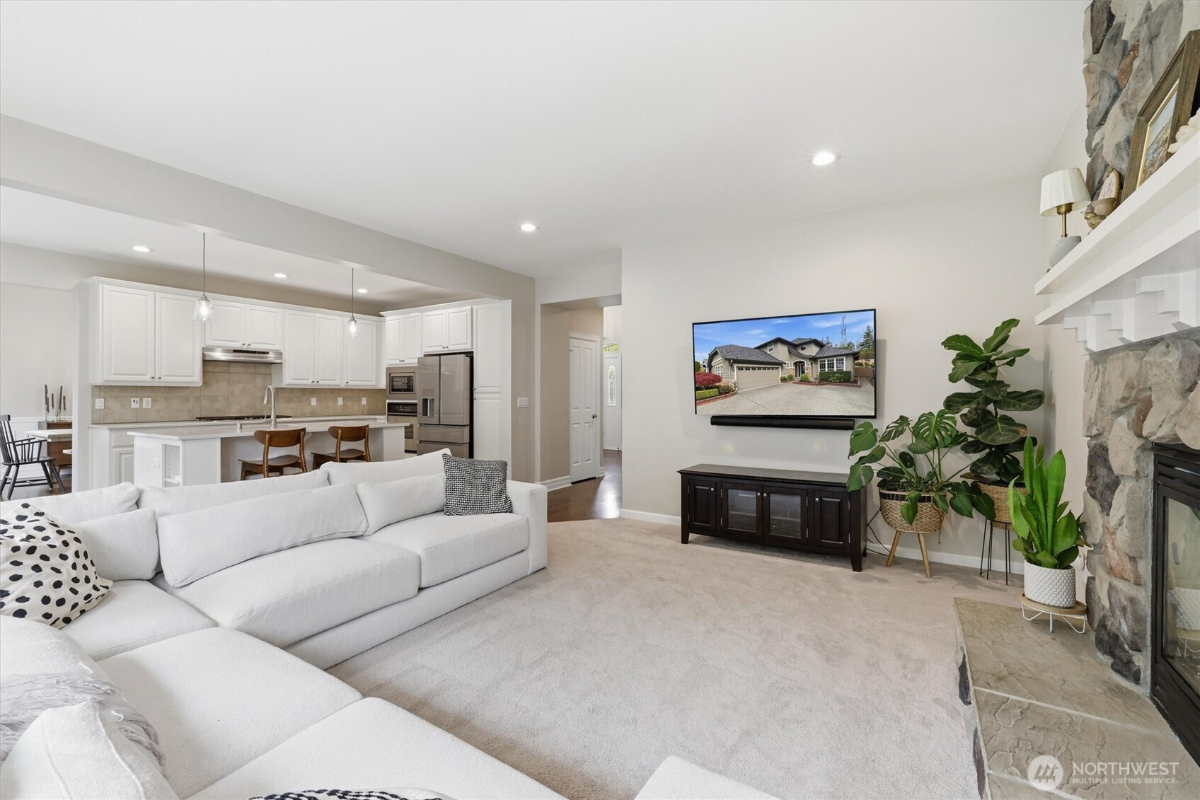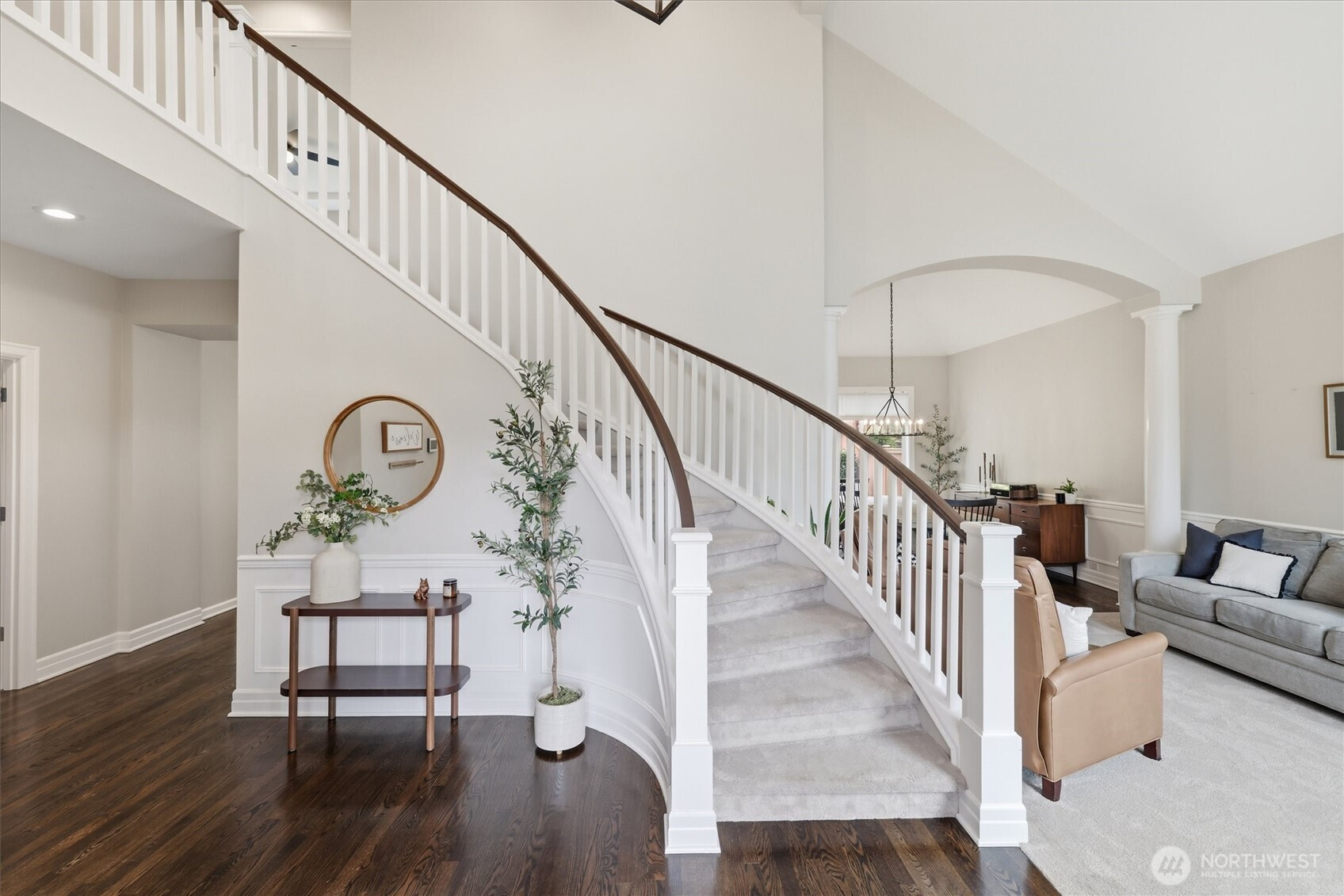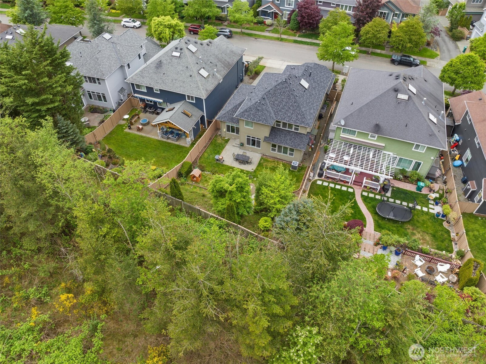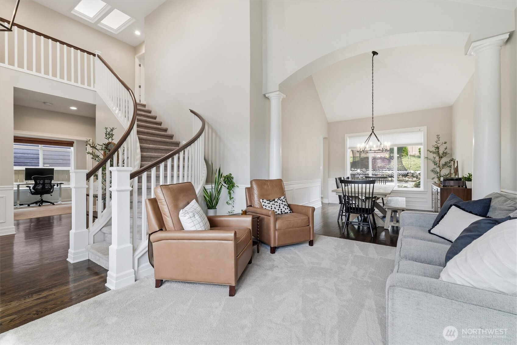 Highly Coveted Crest View Loop charmer! Sits perfectly at the end of the loop providing ample privacy on greenbelt lot. Enter & be greeted w/ rare vaulted ceilings & grand spiral staircase + office on main. Remodeled kitchen flows perfectly for entertaining w/ refinished hardwood floors, SS appliances, new quartz countertops & island w/ seating & storage. Grand wrap around staircase leads you to spacious bedrooms + primary suite w/ custom walk-in closet & 5-piece bath w/ brand new flooring. A/C, updated paint & light fixtures throughout. Greenbelt lot w/ fully-fenced yard + gardening & entertaining space. Additional updates include new solar panels, EV charger in 2-car garage w/ extra storage, new heat pump, Air Scrubber filtration system & furnace + updated roof w/ transferable warranty. Top rated Snoqualmie schools including CVES & Mt. Si HS, community park + walking distance to The Club at Snoqualmie Ridge.