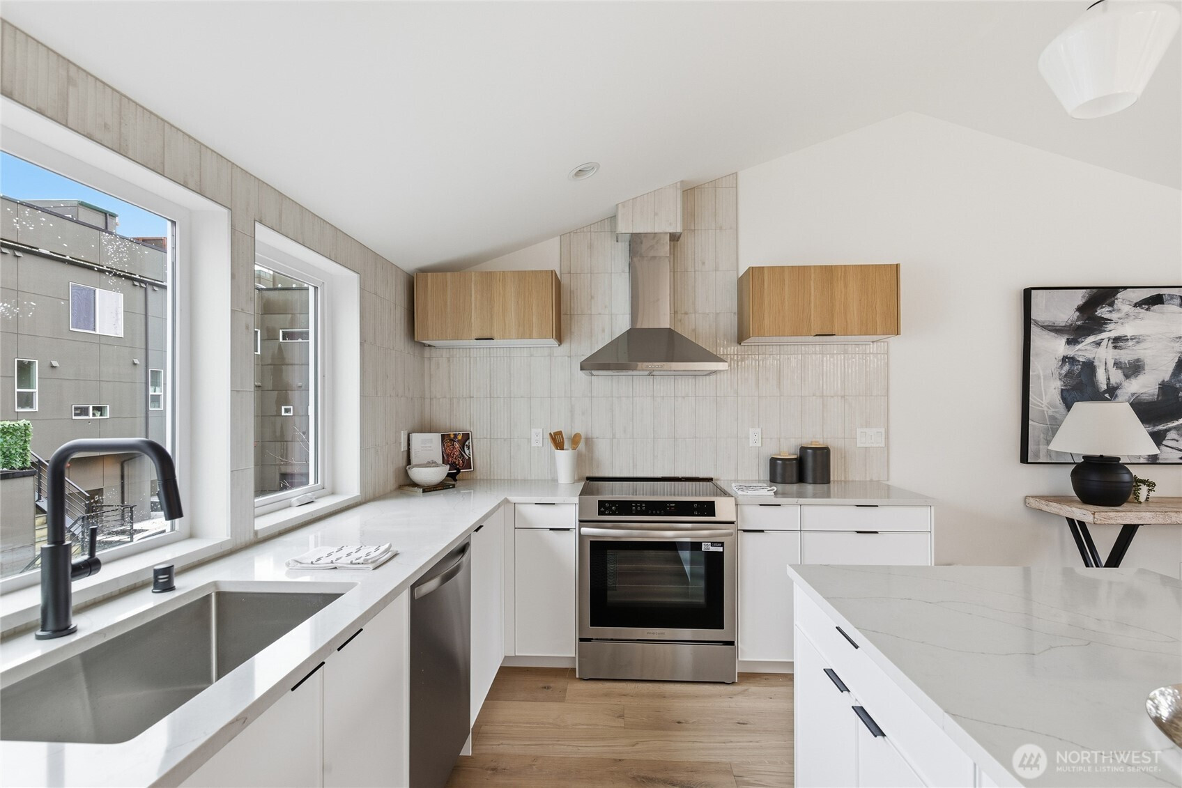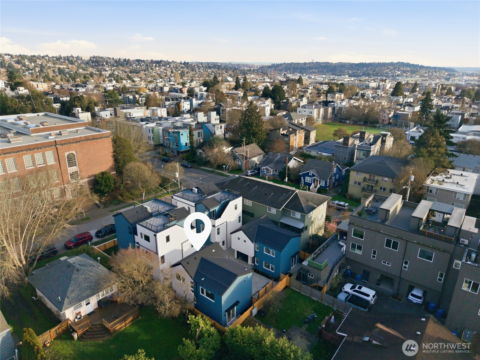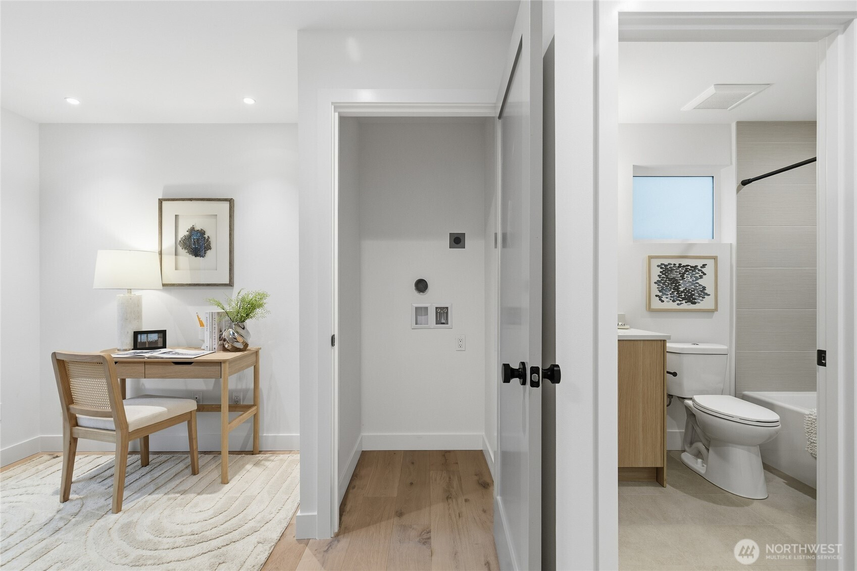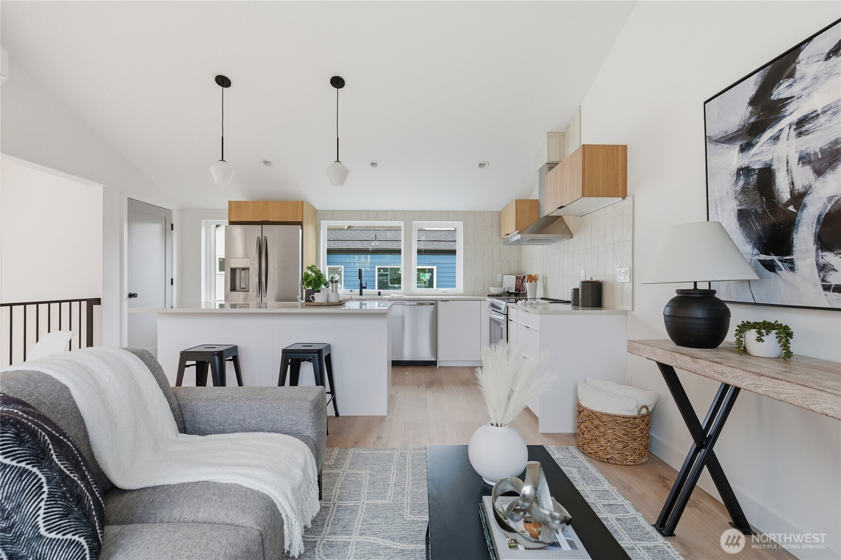 Sophisticated Ballard detached cottage offering 1,057sf of thoughtfully designed living space plus a heated 208sf garage/flex room. This 2-bedroom, 2-bath home features a dedicated office—ideal for remote work or creative pursuits. Soaring ceilings and generous windows flood the interior with natural light, while premium finishes elevate everyday living. Enjoy Bellmont cabinets, engineered hardwood throughout (no carpet), and heated floors in both bathrooms. Mini-split A/C in every room provides year-round comfort. The primary bathroom includes motion sensor lights and a dedicated bidet outlet for modern convenience. The heated garage offers flexible space for parking, storage, or a hobby room. Private backyard retreat with easy access to NW 65th dining and Downtown Ballard—88 Walk Score and 95 Bike Score. Quick routes to Golden Gardens and 15th/99 for SLU/Downtown commutes. Top-ranked schools!