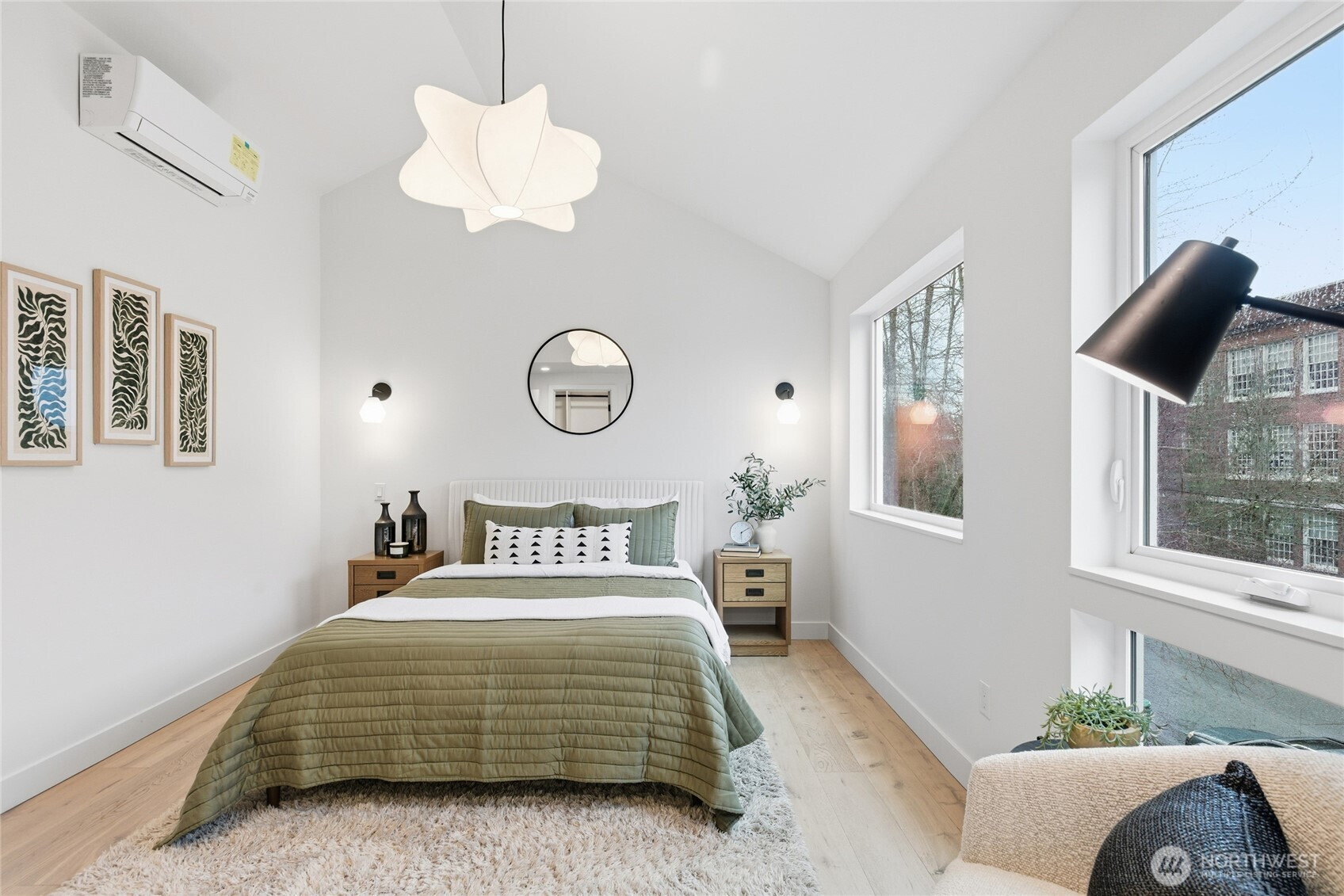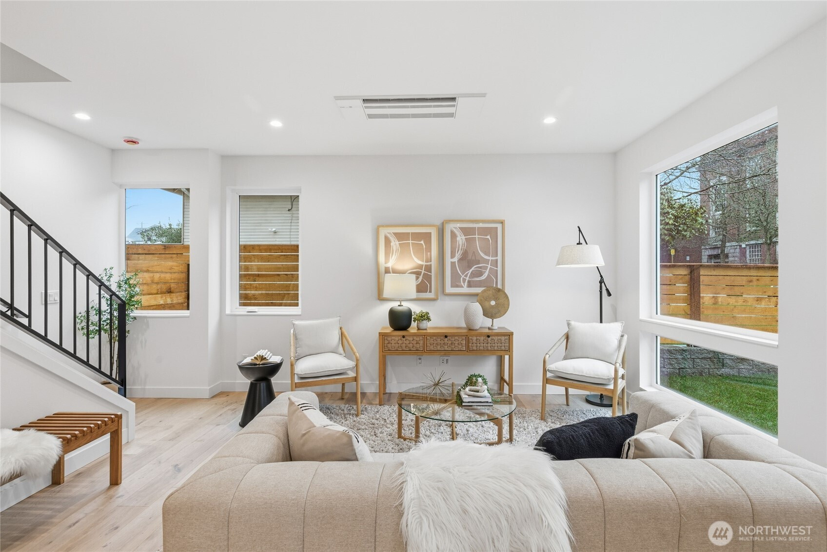New construction Ballard home with exceptional street presence and thoughtful design throughout. A spacious front yard enhances curb appeal and provides a welcoming entry. Soaring ceilings and large windows bathe every room in natural light, creating an open and inviting atmosphere. The 3-bedroom, 2-bath layout offers versatile living spaces perfect for those who work from home. Premium finishes include Bellmont cabinets, engineered hardwood throughout—no carpet—and heated floors in both bathrooms for year-round comfort. Mini-split A/C in every room ensures climate control through Seattle's warmer months. The primary bathroom features motion sensor lights and a dedicated bidet outlet for added convenience. Walk to NW 65th eateries and Downtown Ballard's vibrant shops and restaurants with an impressive 88 Walk Score and 95 Bike Score. Quick access to Golden Gardens Park and 15th/99 makes SLU/Downtown commutes a breeze. Top-ranked schools nearby!