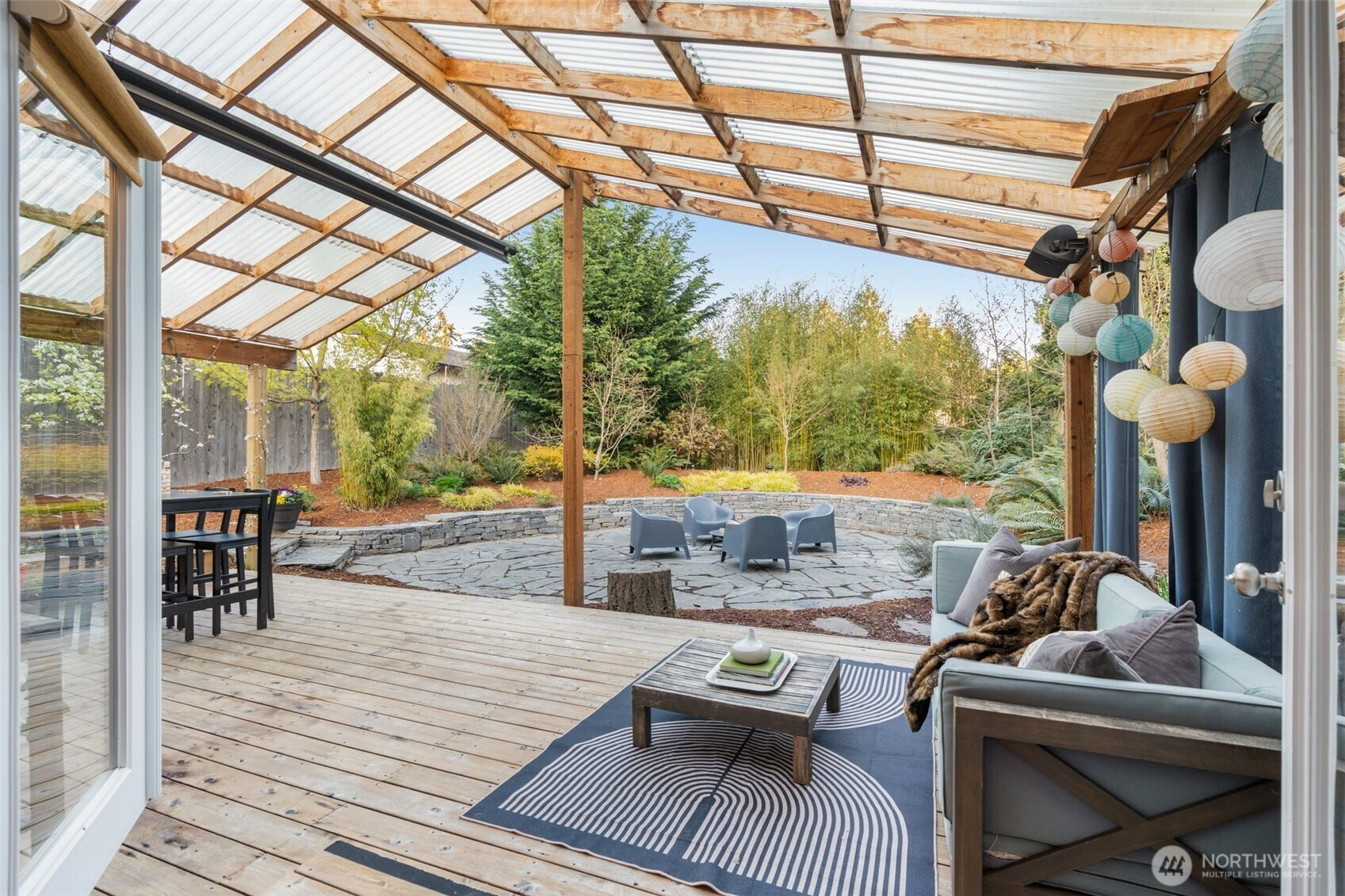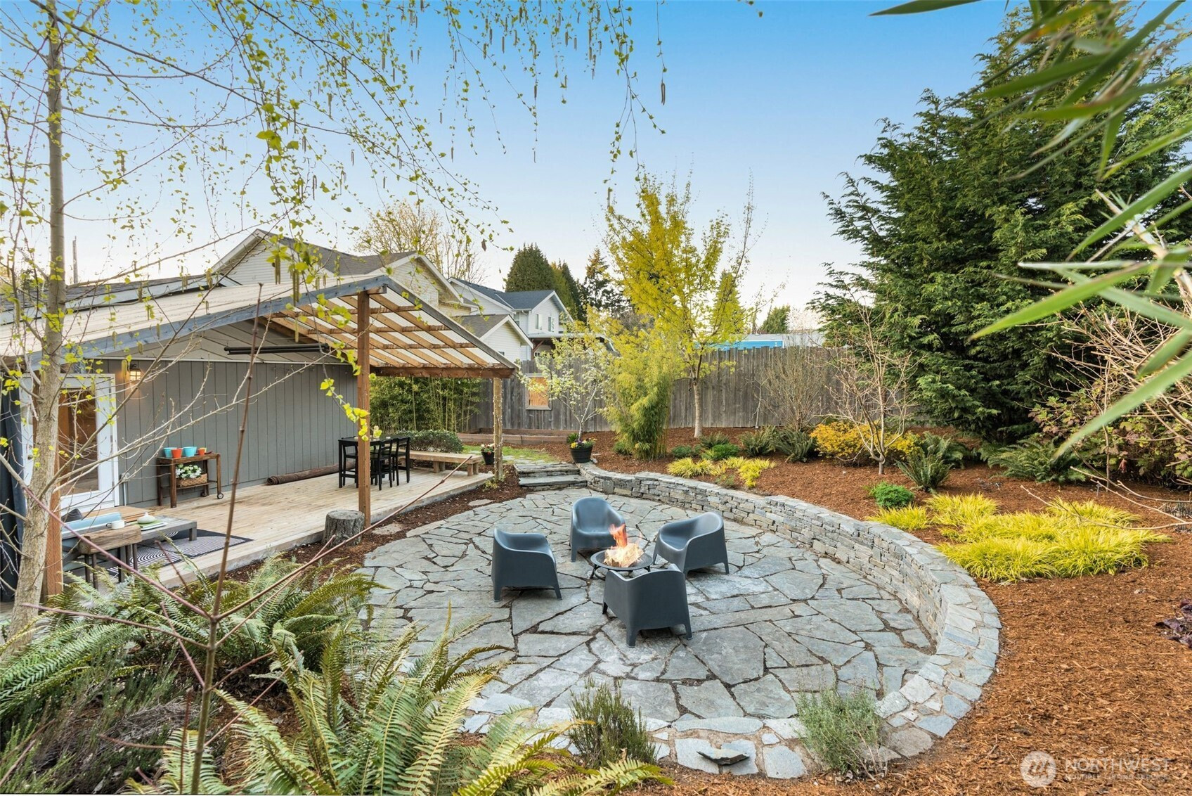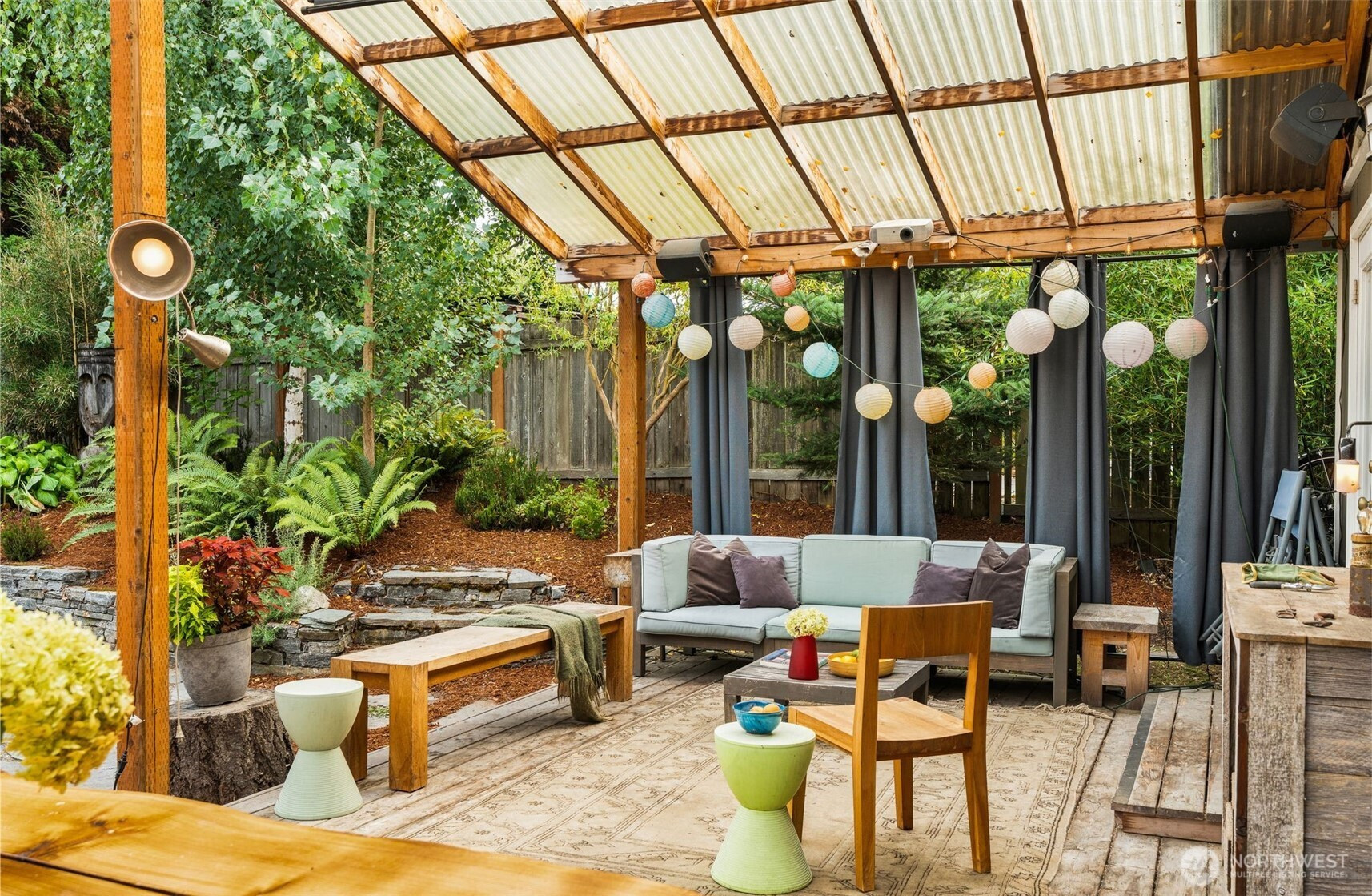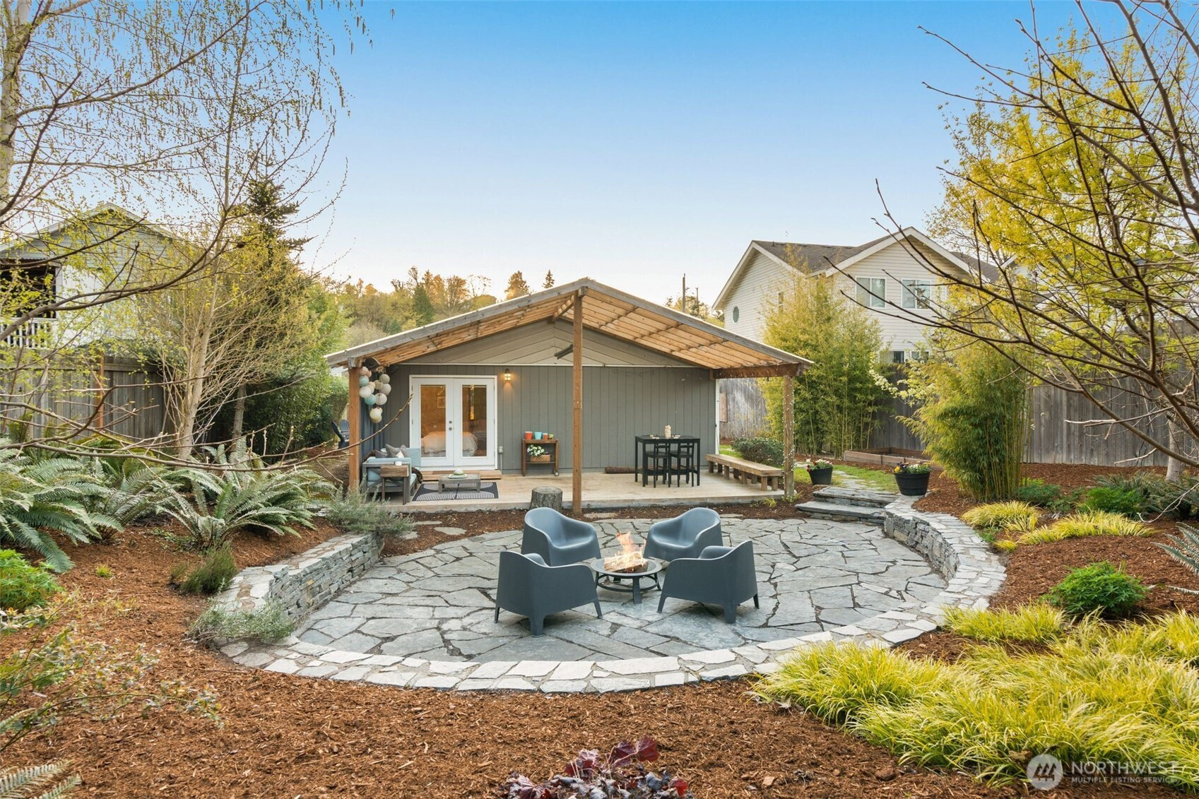A modern rambler enveloped by lush vegetation, fruit trees, berry plants and bamboo. Step beyond the gate and enter a calm, intentional, nature-forward environment. The 1970-built dwelling was wholly renovated in 2016. Open kitchen with slab counters and stainless steel appliances. An adjacent dining area with glass doors to a sunny side patio (great for BBQing). A living room with wood-burning fireplace. A newer, massive skylight illuminates this great-room. Beyond are three large bedrooms with generous closets. Two are served by a hall bthrm. The third has an ensuite full bathroom and glass doors to the treasures out back. There's a 550sf rec room that may have been a two-car garage in a previous life but is now a fully insulated, finished bonus room that begs for a more meaningful existence, such as a media room and art studio. Roll up the west-facing door and let the warm evening light spill in. Out back, a pergola spans the entire width of the house. Its light-emitting cover facilitates year-round enjoyment. The back third of this 7,250sf lot was built up with tons of transported soil which now serves as the base for mature bamboo, persimmon & apple trees, ferns & more. A circular flagstone patio is the centerpiece to all this beauty. Host a fire pit & some Adirondacks here. Sizable side yards for storing kayaks, SUPs and outdoor gear. Off-street parking for four vehicles in the driveway. Mins to White Center, Westwood Village & the Alaska St Junction. Pre-inspected.