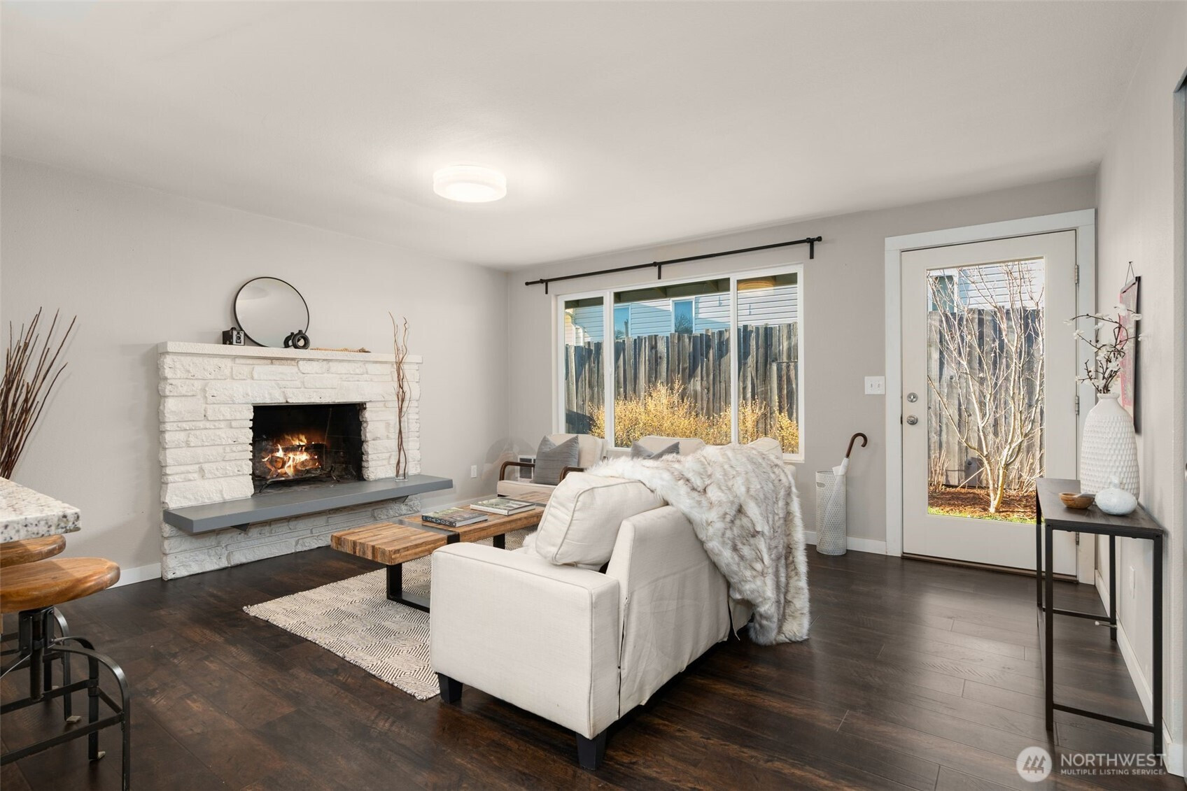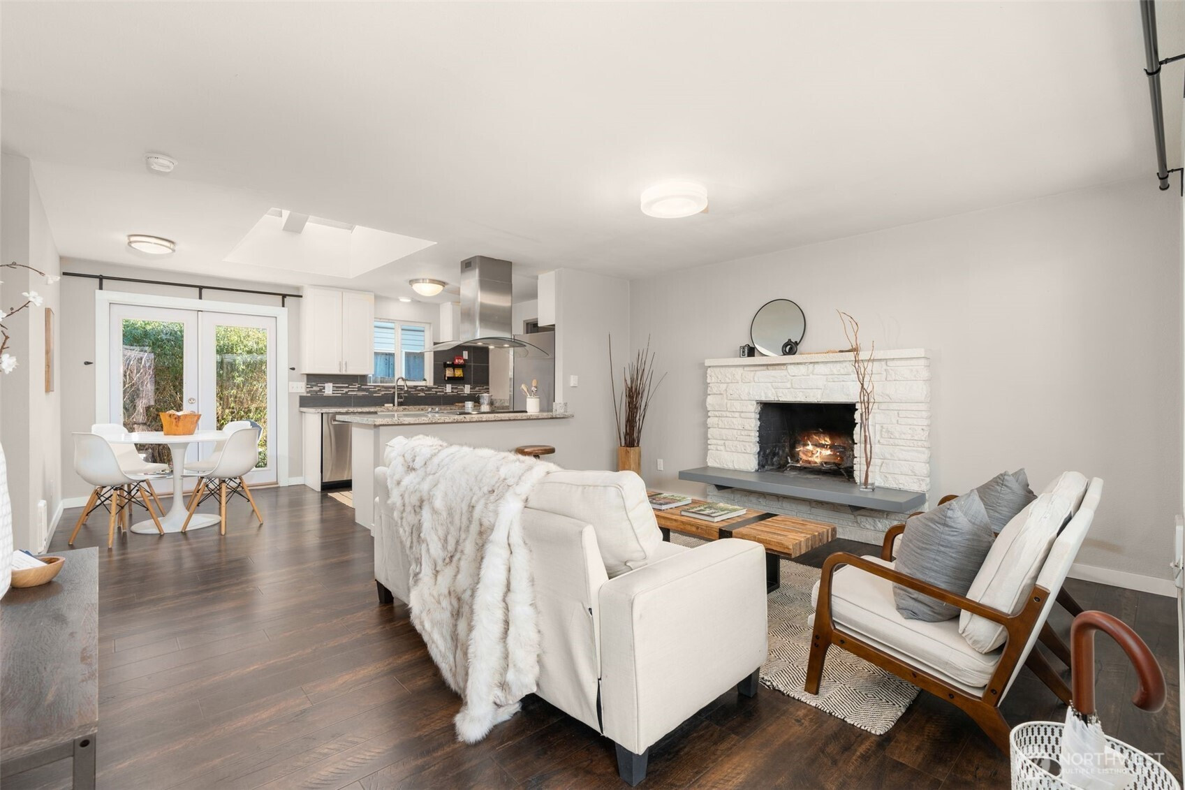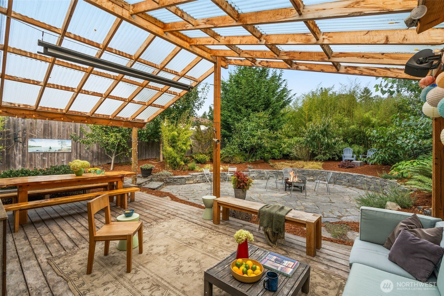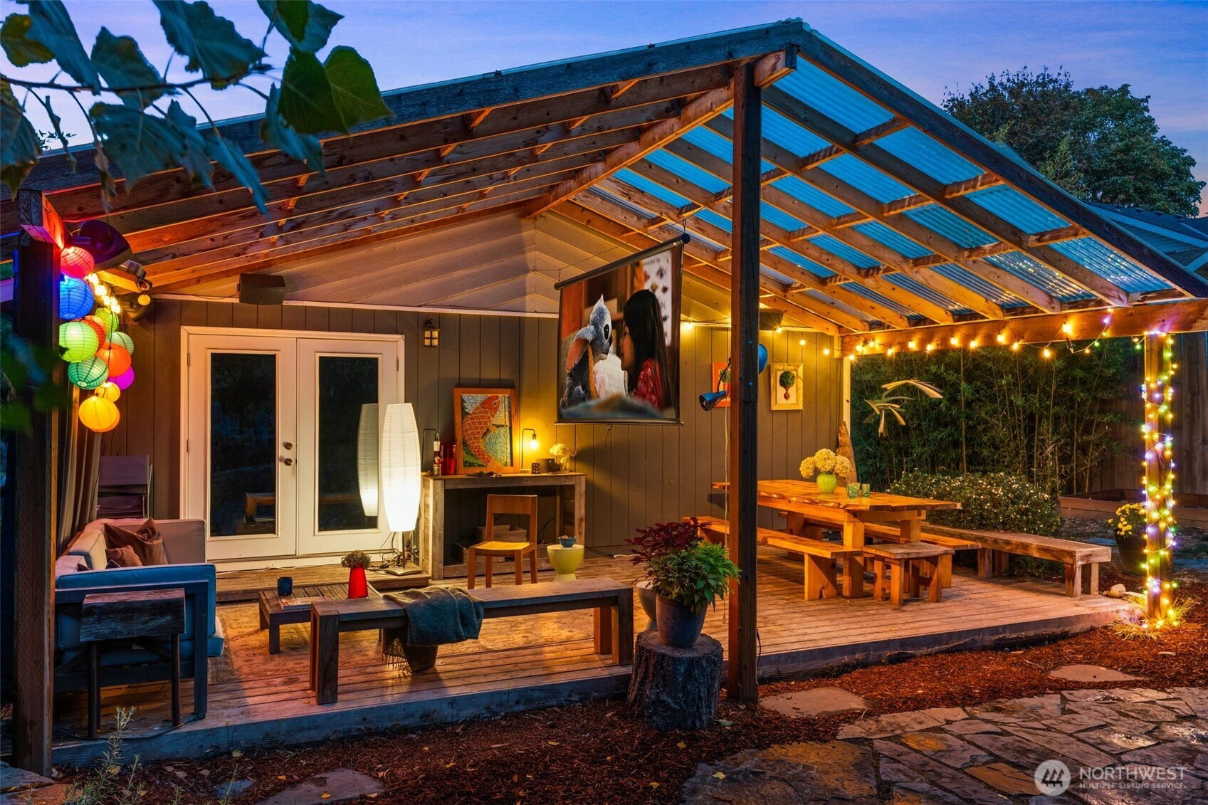 A modern rambler enveloped by lush vegetation, fruit trees, berry plants and bamboo. Step beyond the gate and enter a calm, intentional, nature-forward environment. The 1970-built dwelling was wholly renovated in 2016. Open kitchen with slab counters and stainless steel appliances. An adjacent dining area with glass doors to a sunny side patio (great for BBQing). A living room with wood-burning fireplace. A newer, massive skylight illuminates this great-room. Beyond are three large bedrooms with generous closets. Two are served by a hall bthrm. The third has an ensuite full bathroom and glass doors to the treasures out back. There's a 550sf rec room that may have been a two-car garage in a previous life but is now a fully insulated, finished bonus room that begs for a more meaningful existence, such as a media room and art studio. Roll up the west-facing door and let the warm evening light spill in. Out back, a pergola spans the entire width of the house. Its light-emitting cover facilitates year-round enjoyment. The back third of this 7,250sf lot was built up with tons of transported soil which now serves as the base for mature bamboo, persimmon & apple trees, ferns & more. A circular flagstone patio is the centerpiece to all this beauty. Host a fire pit & some Adirondacks here. Sizable side yards for storing kayaks, SUPs and outdoor gear. Off-street parking for four vehicles in the driveway. Mins to White Center, Westwood Village & the Alaska St Junction. Pre-inspected.