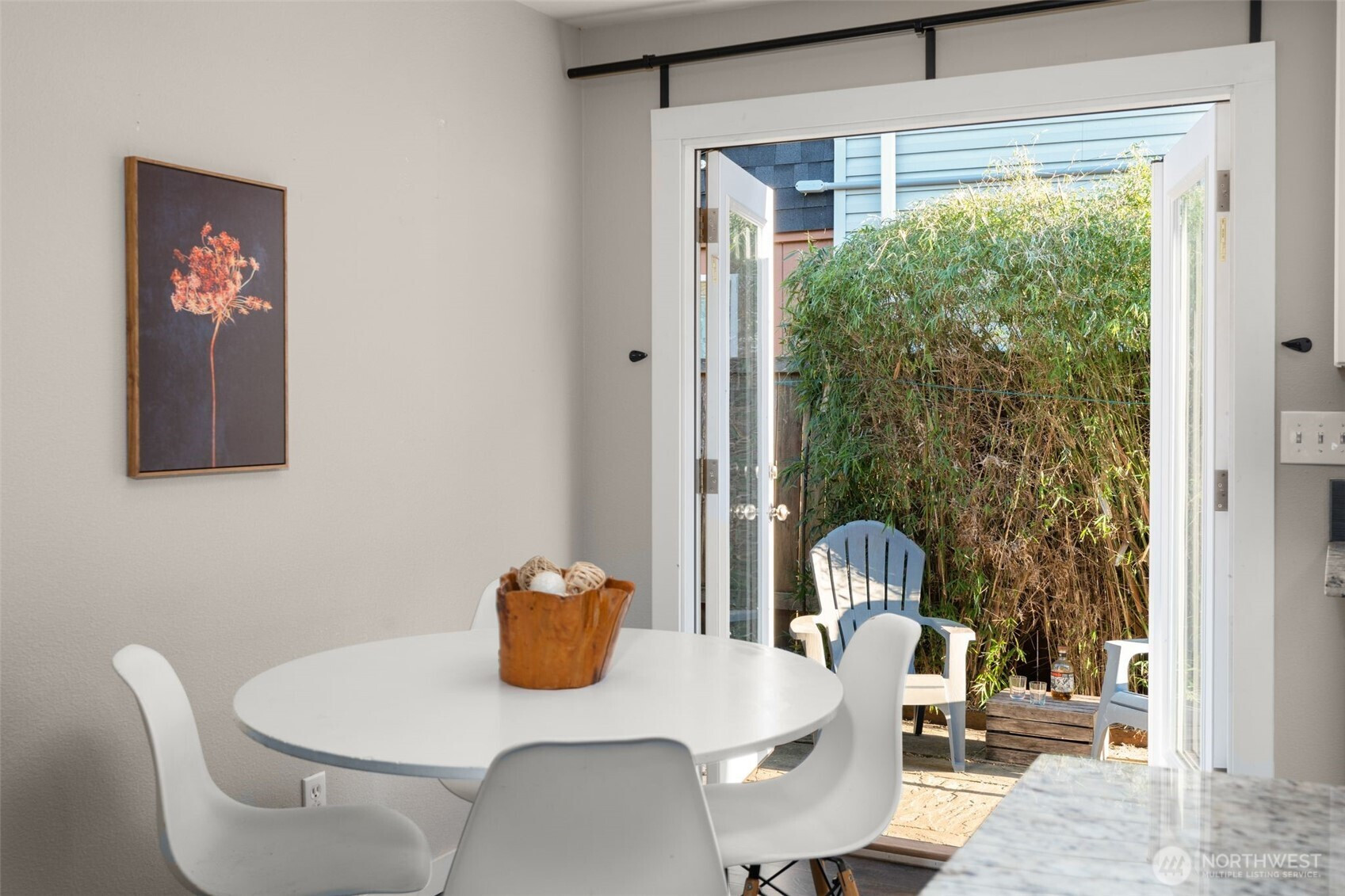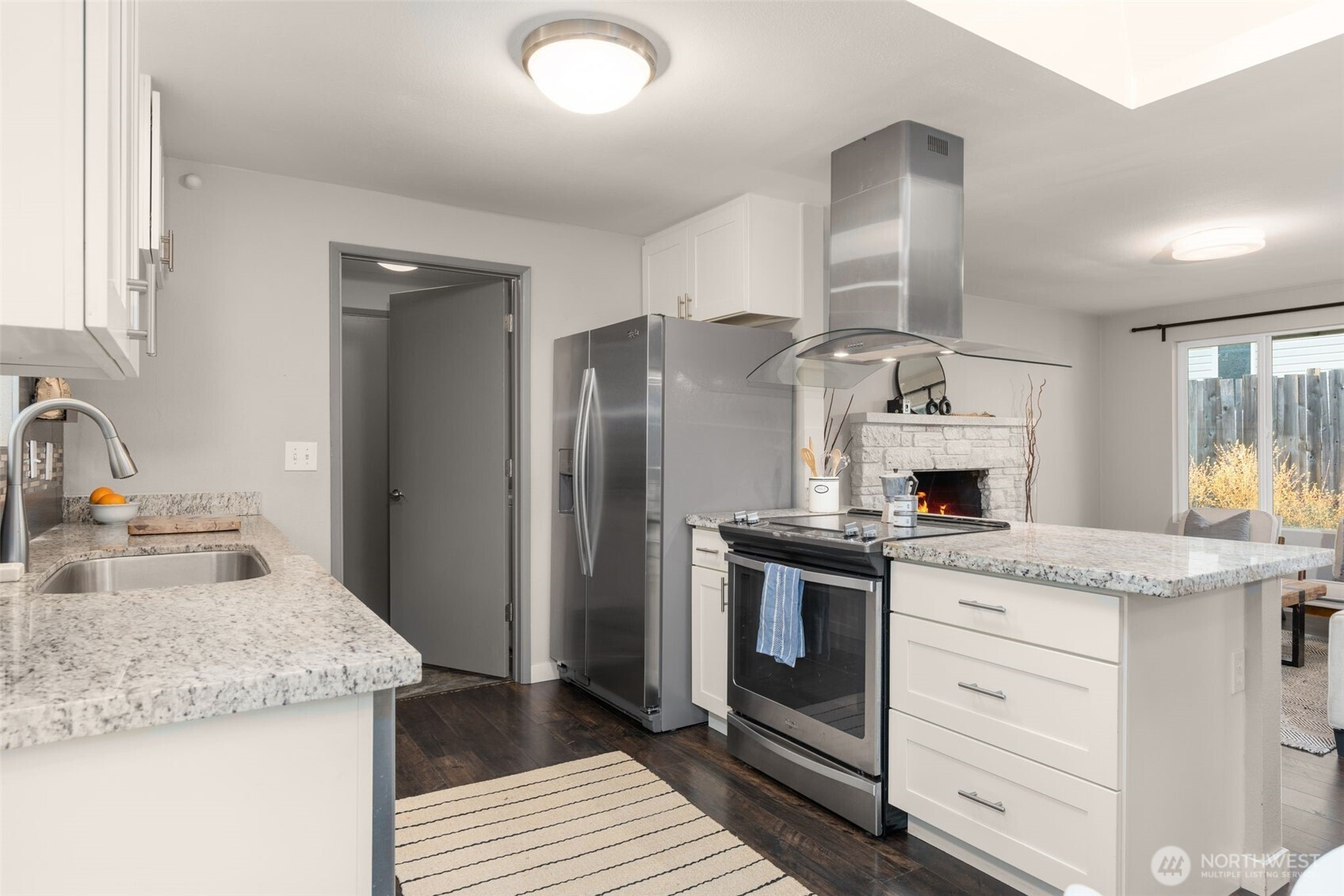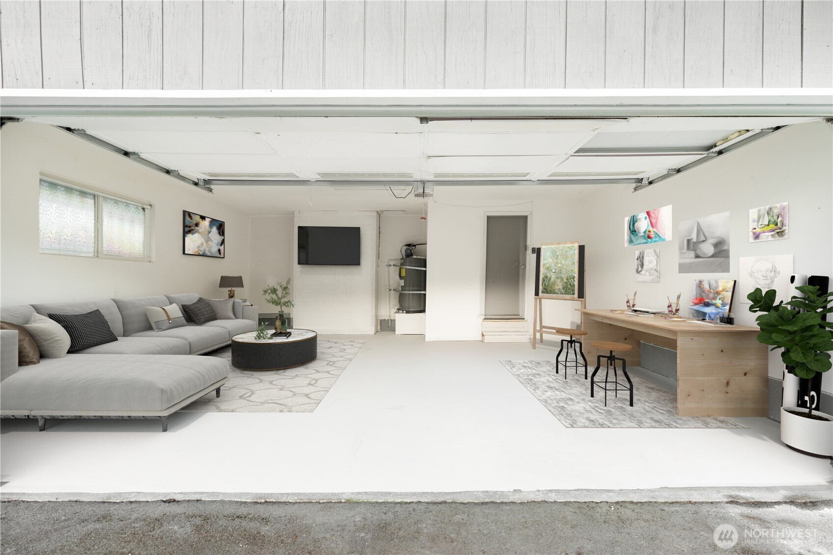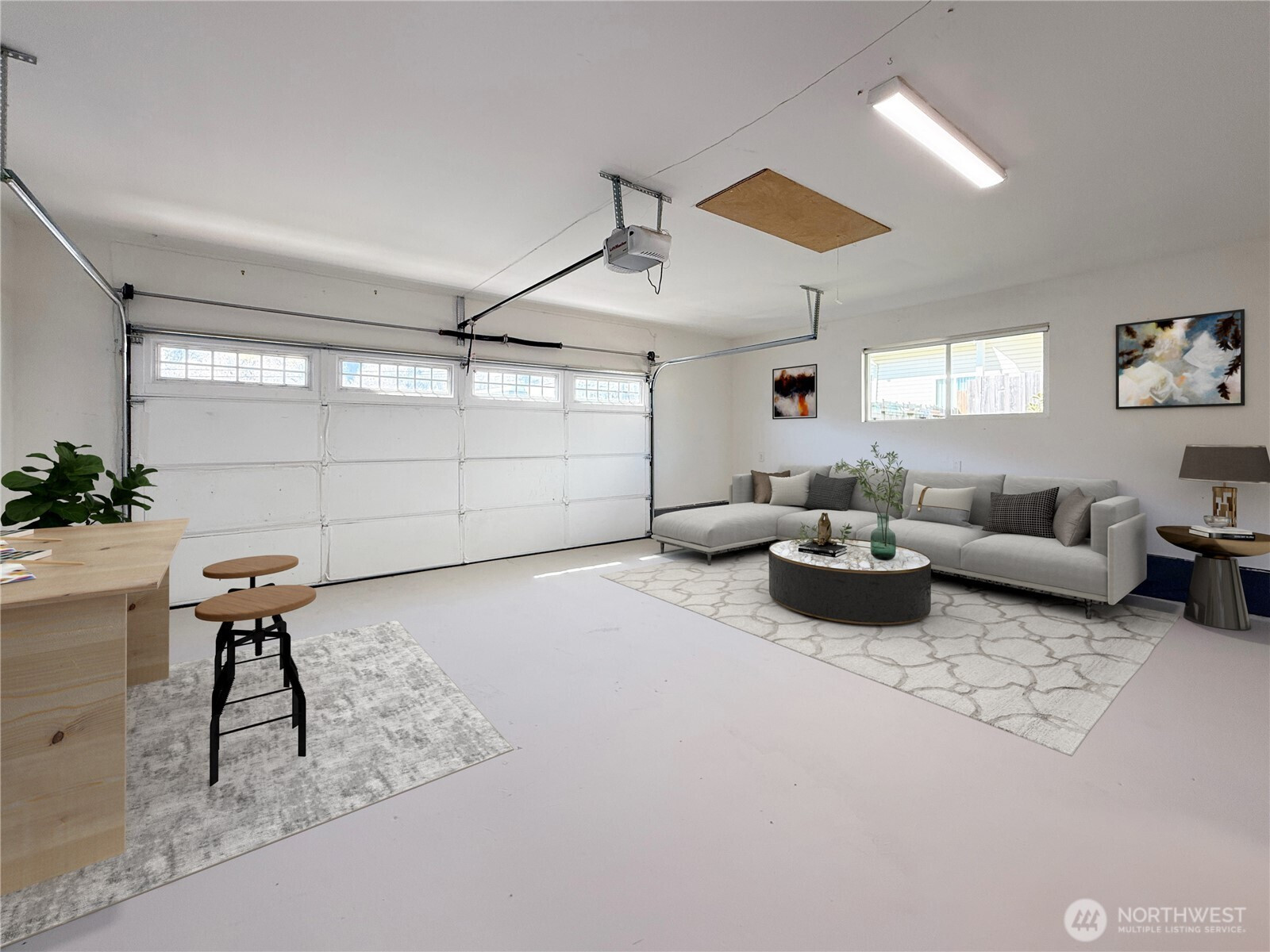 A modern rambler enveloped by lush vegetation, fruit trees, berry plants and bamboo. Step beyond the gate and enter a calm, intentional, nature-forward environment. The 1970-built dwelling was wholly renovated in 2016. Open kitchen with slab counters and stainless steel appliances. An adjacent dining area with glass doors to a sunny side patio (great for BBQing). A living room with wood-burning fireplace. A newer, massive skylight illuminates this great-room. Beyond are three large bedrooms with generous closets. Two are served by a hall bthrm. The third has an ensuite full bathroom and glass doors to the treasures out back. There's a 550sf rec room that may have been a two-car garage in a previous life but is now a fully insulated, finished bonus room that begs for a more meaningful existence, such as a media room and art studio. Roll up the west-facing door and let the warm evening light spill in. Out back, a pergola spans the entire width of the house. Its light-emitting cover facilitates year-round enjoyment. The back third of this 7,250sf lot was built up with tons of transported soil which now serves as the base for mature bamboo, persimmon & apple trees, ferns & more. A circular flagstone patio is the centerpiece to all this beauty. Host a fire pit & some Adirondacks here. Sizable side yards for storing kayaks, SUPs and outdoor gear. Off-street parking for four vehicles in the driveway. Mins to White Center, Westwood Village & the Alaska St Junction. Pre-inspected.