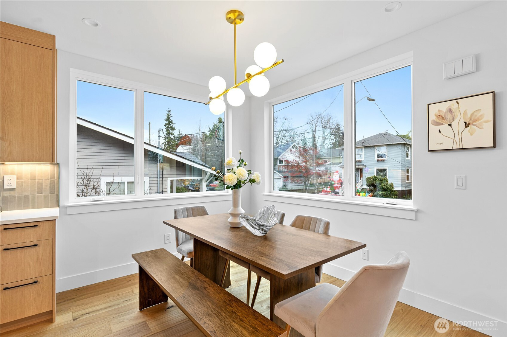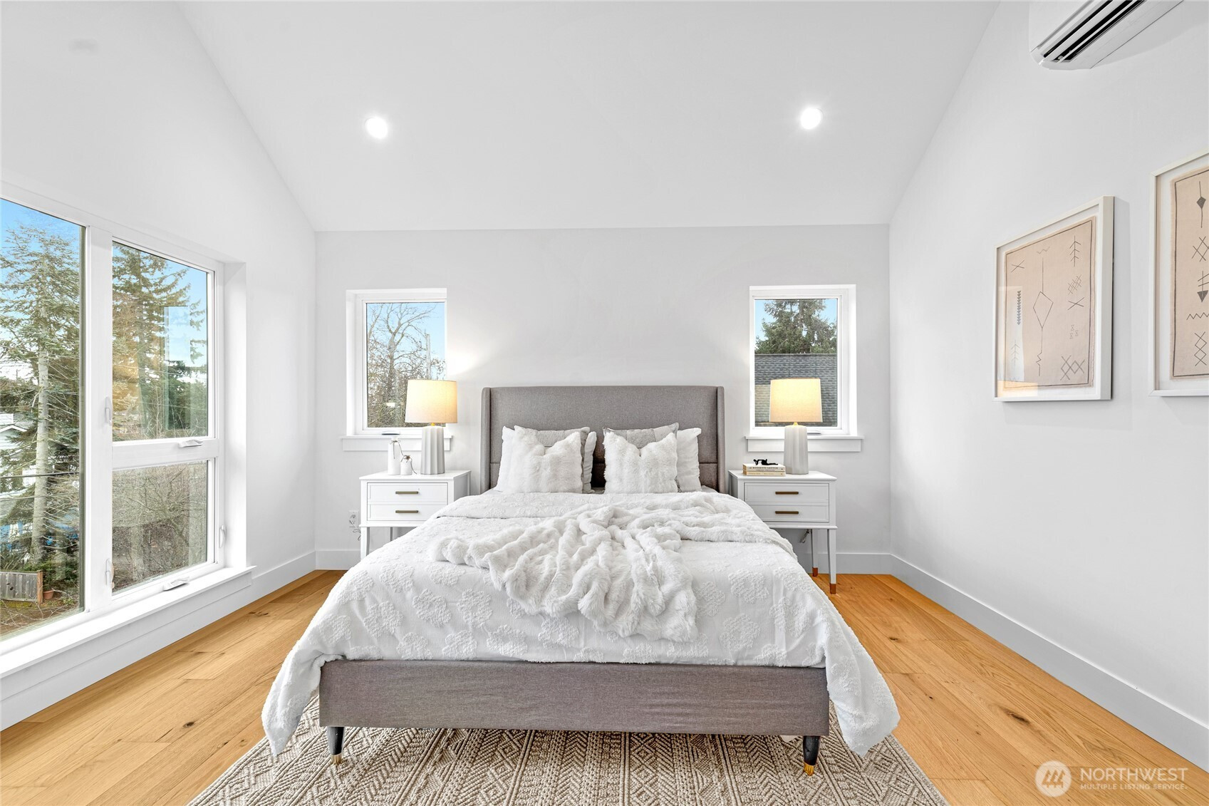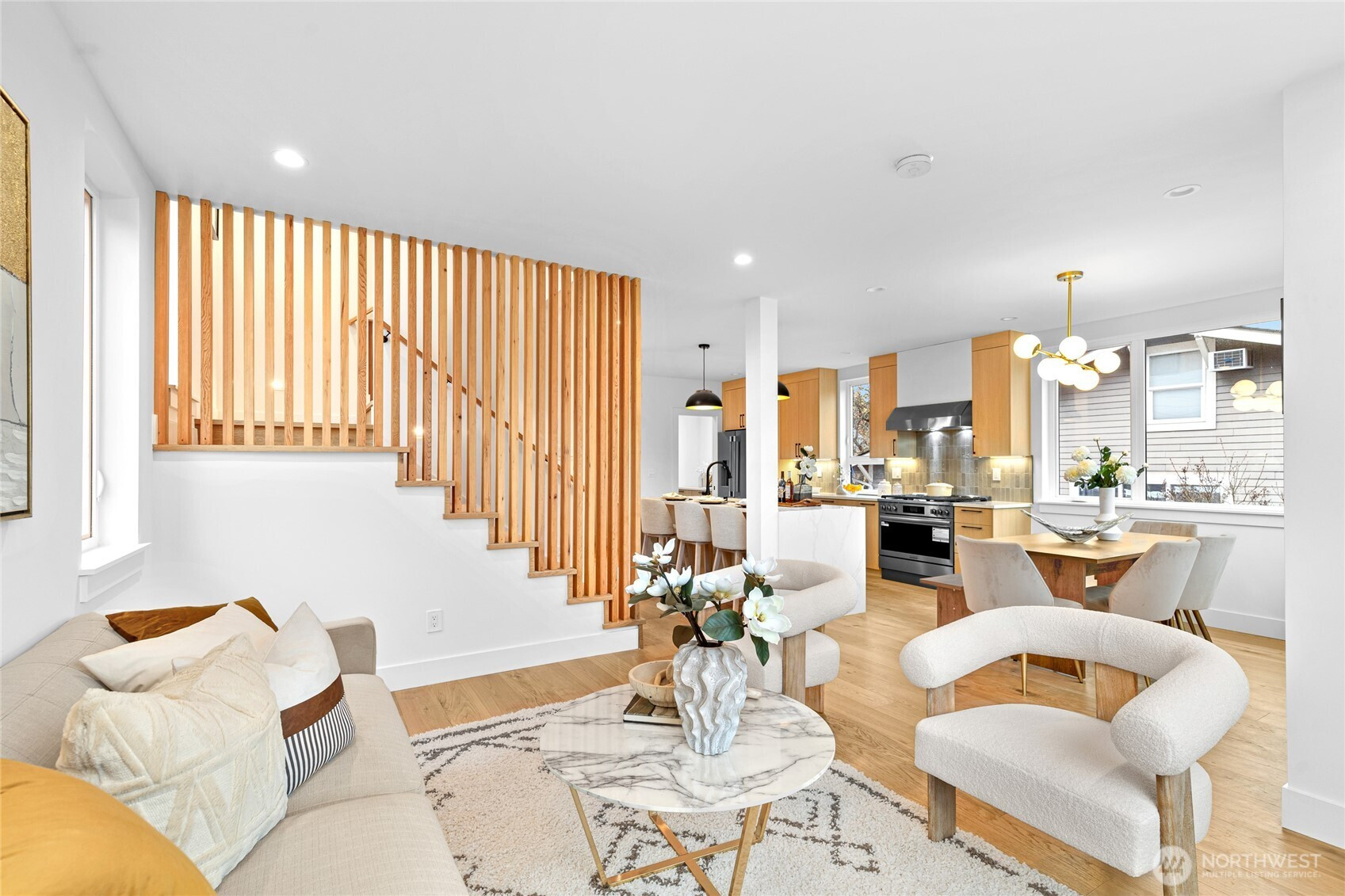 New 3-bed/3.5-bath Ballard home with exceptional street presence. Soaring ceilings and large windows bathe every room in natural light. Main level excels for entertaining with seamless flow between TWO distinct living rooms (or convert one to office), dining room, chef's kitchen with white oak cabinetry, gas range, custom hood, premium appliances plus dedicated prep kitchen. Top floor primary suite with spa bath and second bedroom. Rooftop deck with sweeping views. Ground level: private office, guest suite and heated garage/flex space. Mini-split A/C throughout. Heated floors in bathrooms. Engineered hardwood throughout—no carpet. Walk to NW 65th eateries. Quick access to Golden Gardens, 15th/99 for easy SLU/DT commutes. Top-ranked schools!