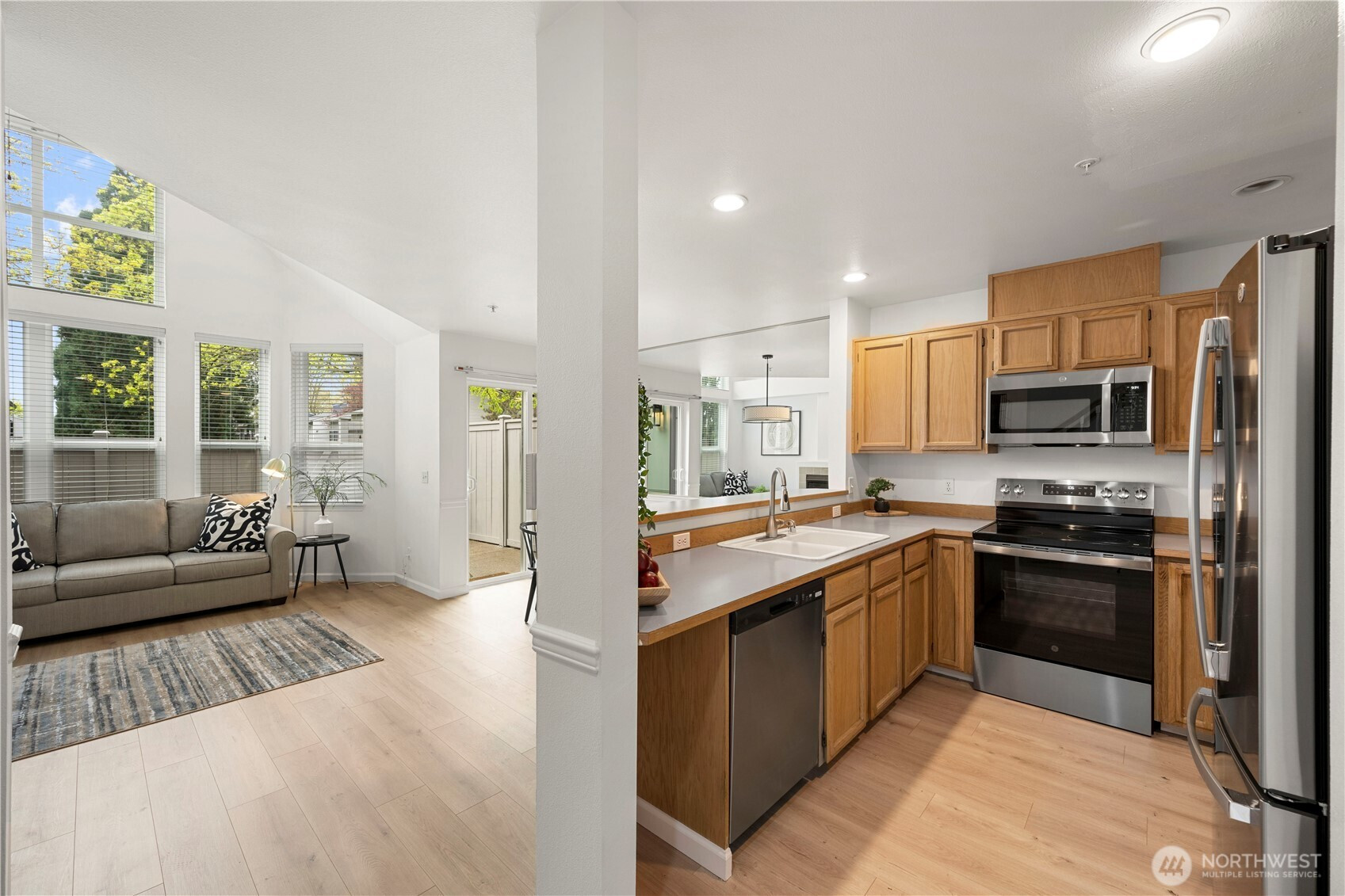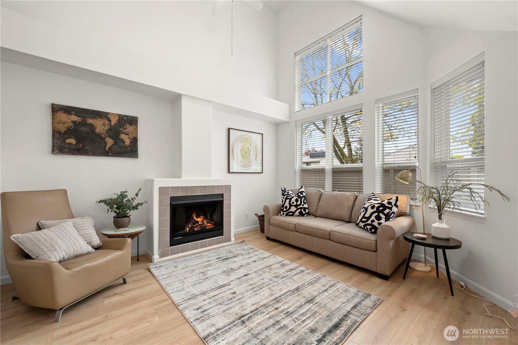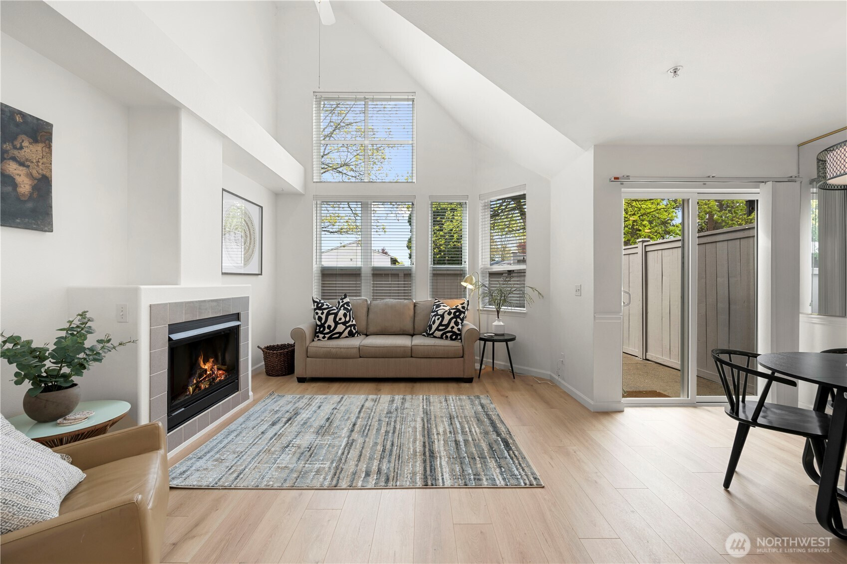 Welcome to this bright and inviting two-story condo located in the desirable Village on James. A gated community known for convenience and comfort. HOA dues include water, sewer, natural gas, garbage, road maintenance, and access to community amenities. The main level features an open, light-filled layout with all-new kitchen appliances, a comfortable living room with a gas fireplace, and vaulted ceilings that create an airy feel. Enjoy all-new flooring throughout, adding a fresh, modern touch. Step outside to your private patio, perfect for morning coffee or evening relaxation. An individual one-car garage offers plenty of storage. Upstairs, you’ll find two well-appointed bedrooms, each with its own bathroom, including a generous primary suite with a walk-in closet. Community amenities include an outdoor pool, hot tub, cabana, and exercise room, ideal for year-round enjoyment. All of this in a fantastic location near Kent Station, shopping, dining, and major freeways, making commuting and daily errands a breeze. All furniture currently in the home is available to stay with the home.