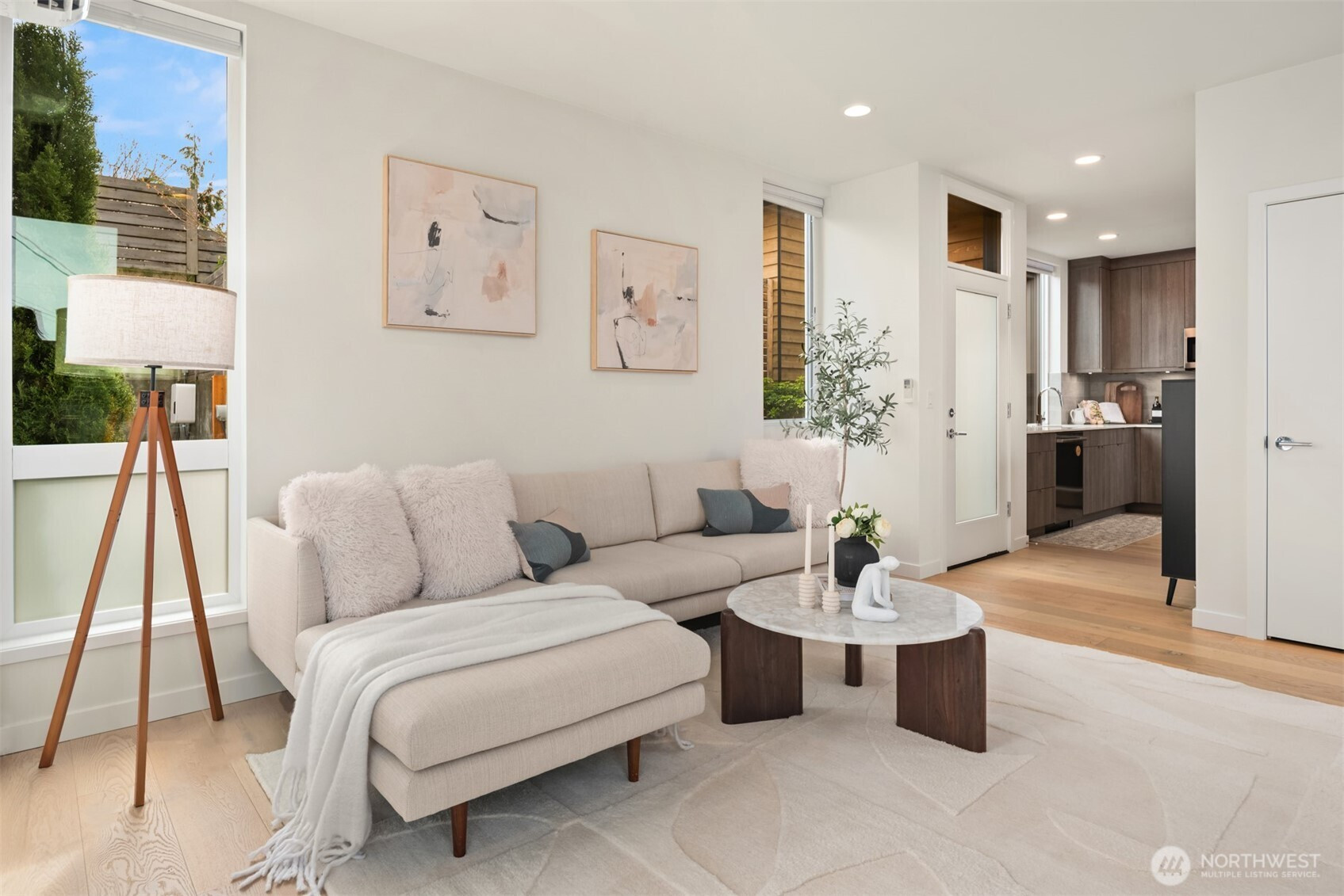 A standout from the typical West Seattle townhome crowd, this 2022-built Gatewood home lives above the ordinary. Perched high on the hill, it offers the rare combo of near-new condition, elevated design, & a more single-family-home feel than buyers typically expect. It offers the space, separation, & layout buyers are often searching for, with the value, low maintenance & lock-and-leave appeal of newer construction. A true main-floor entry opens directly into the living space—an uncommon & highly livable feature that sets this home apart. Sleek interiors pair beautifully w/ a rooftop deck showcasing sweeping 360-degree views of Puget Sound, the Olympics, downtown Seattle, sunsets, & city lights. Natural light fills the open main level, which flows to a landscaped fenced yard, 2 private patios, & the rooftop deck—delivering the kind of indoor-outdoor lifestyle rarely found at this level. Quartz counters, tiled backsplash, stainless appliances, induction cooking, & wide-plank hardwoods create a polished, current feel. With each bedroom on its own floor & its own heated floor bath, the layout offers smart flexibility for guests, roommates, work-from-home living, or simply more privacy. The top-floor primary suite feels like a true retreat w/ city views & a spa-like bath w/ walk-in rain shower. A/C, EV-ready parking, & outdoor storage complete the package. Just up the block is a neighborhood park, RapidRide is close, & easy access to Lincoln Park, Morgan & Alaska Junctions.