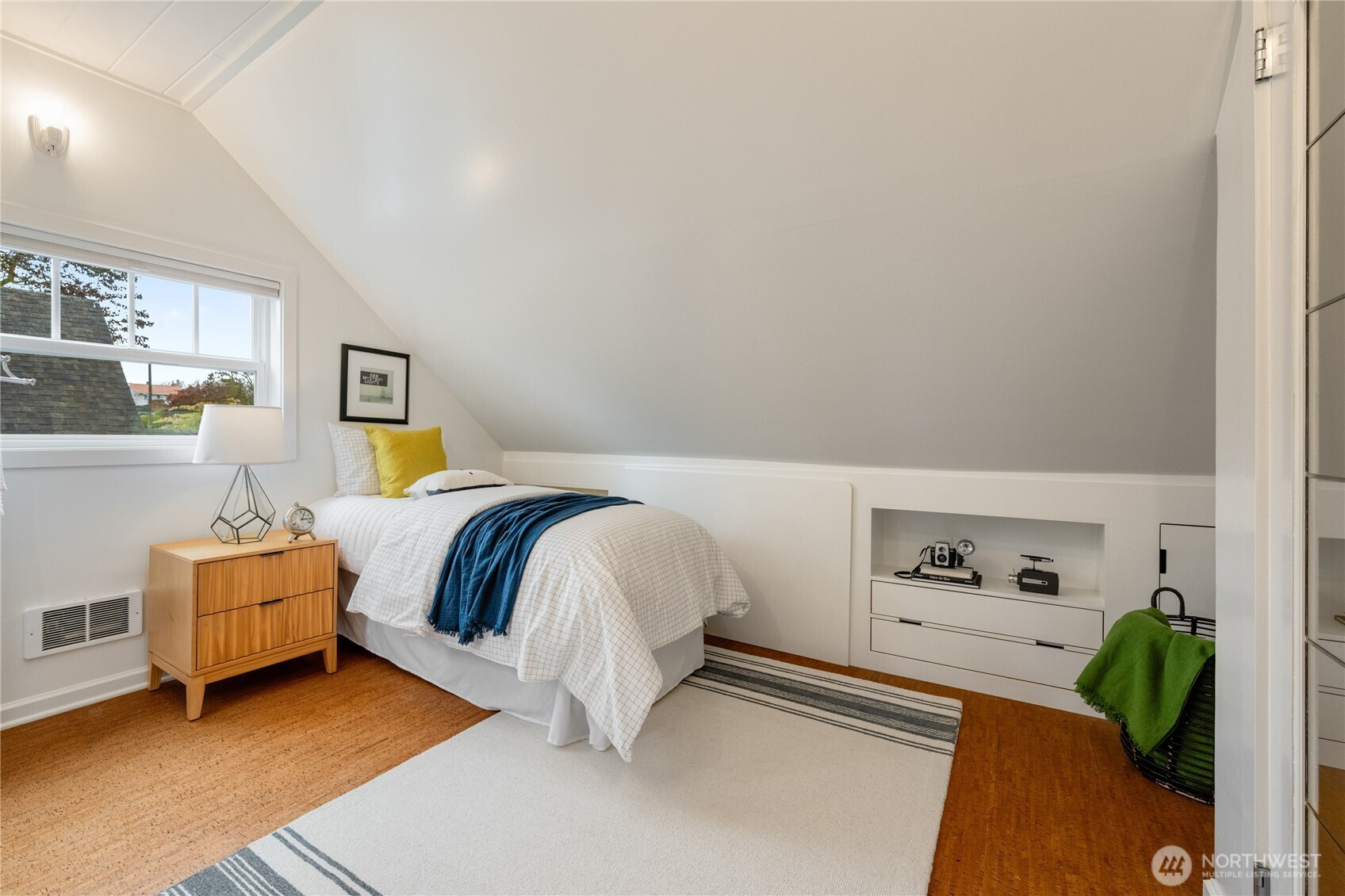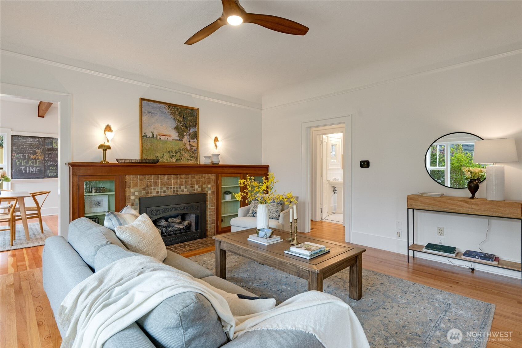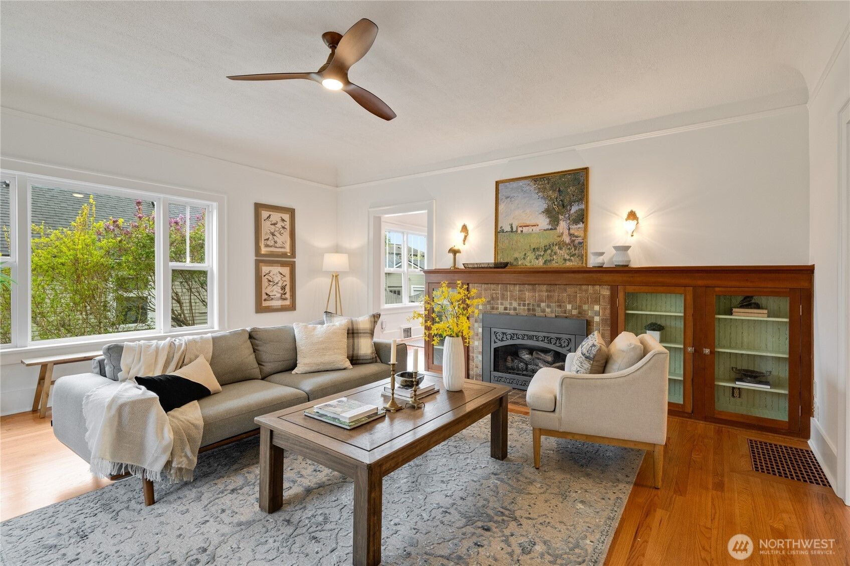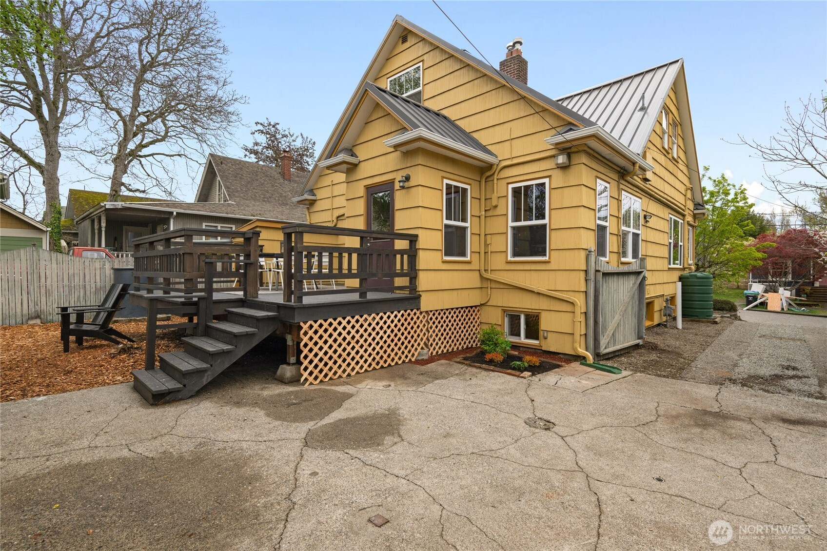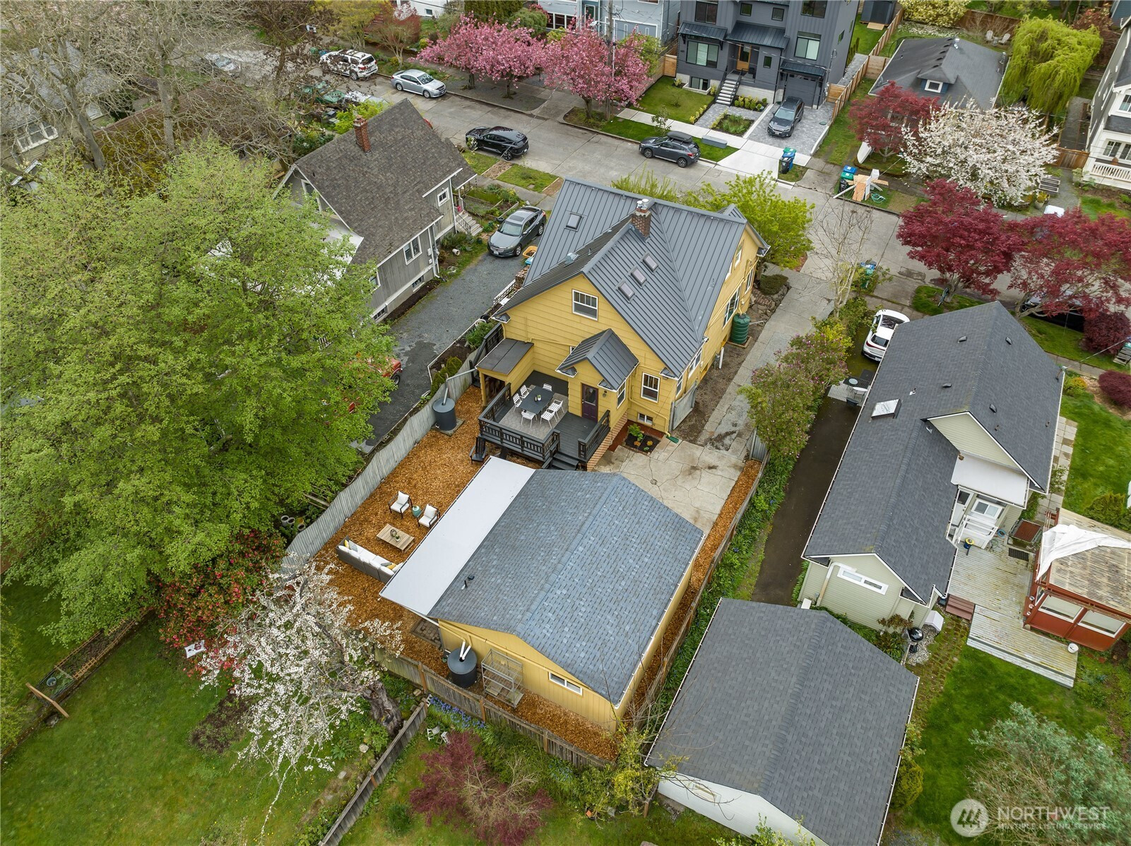 Step into this spacious, light-filled home where charm and craftsmanship meet modern living. This captivating 1927 gem exudes character and warmth, starting with inviting sunburst millwork and an enclosed front porch with leaded glass windows. Blending historic elegance with impeccable updates, from the exposed brick chimney, the refinished fir and oak wood floors, to the picture-rail molding, and metal roof. The south-facing kitchen opens to the sunny deck which overlooks the fully-fenced back yard and DADU. This gorgeous space provides the perfect backdrop for entertaining; a natural gathering place. An inviting bedroom, tv room/library, and a beautifully appointed bathroom complete the main level. Quiet and private, the upper level retreat features two bedrooms, a full bath, an inspired flex/office area with vaulted ceilings, skylights, and a washer/dryer. While the home is connected by traditional interior stairs from top to bottom, it also has a dedicated basement entrance, where you’ll find a kitchenette, 2 bedrooms, a TV room, and a washer/dryer. So many ways to utilize this space! A 50 ft long driveway and courtyard lead to the 480 sq. ft. DADU, taking things to the next level! So many options, including income generation, multi-generational living, or used as a personal space. Nestled in vibrant Loyal Heights, in a community of amazing neighbors, you are steps to Golden Gardens, Bakers, Picolino’s and all that Ballard has to offer. Prepare to fall in love.