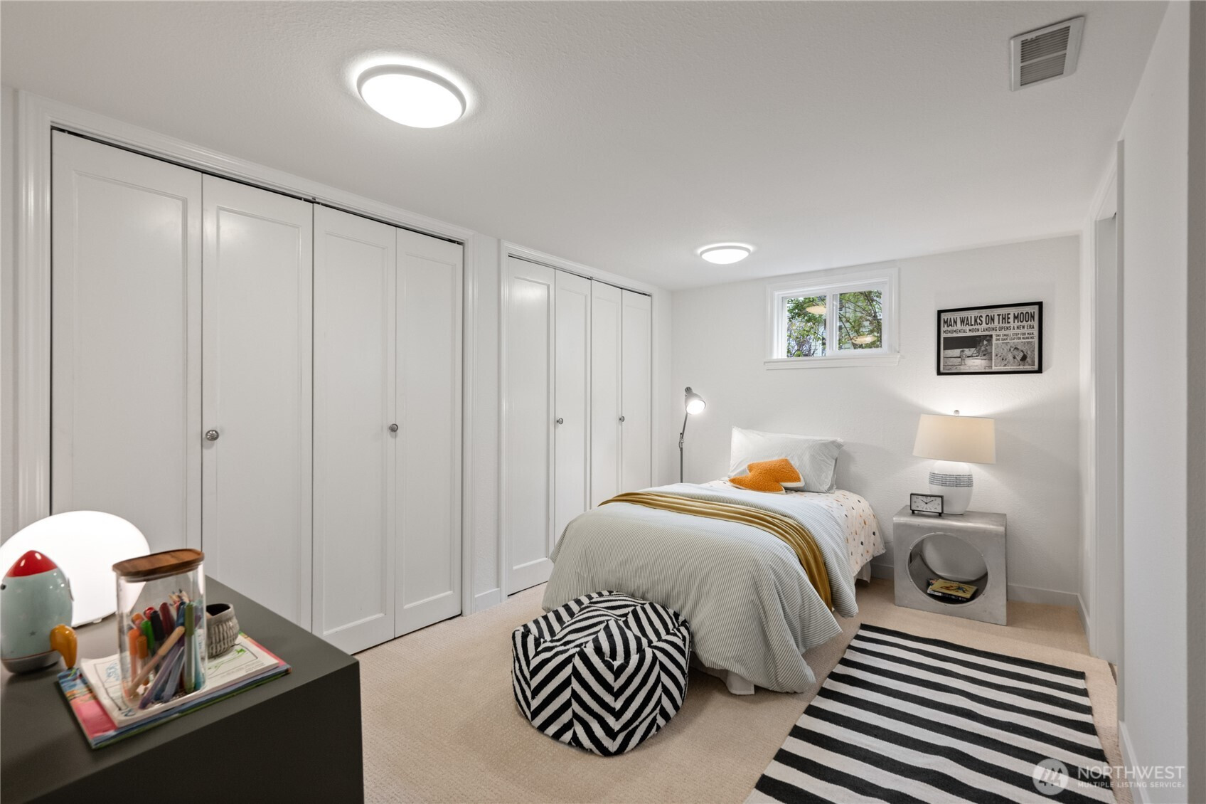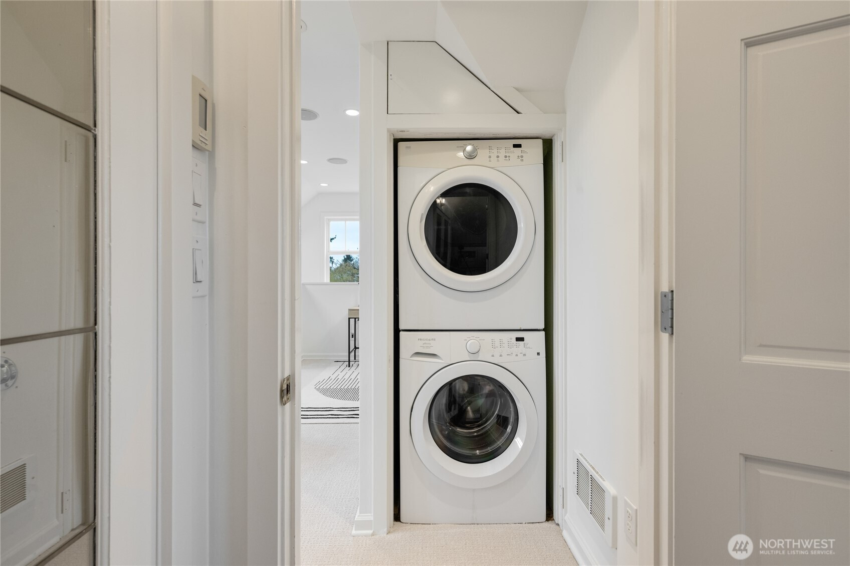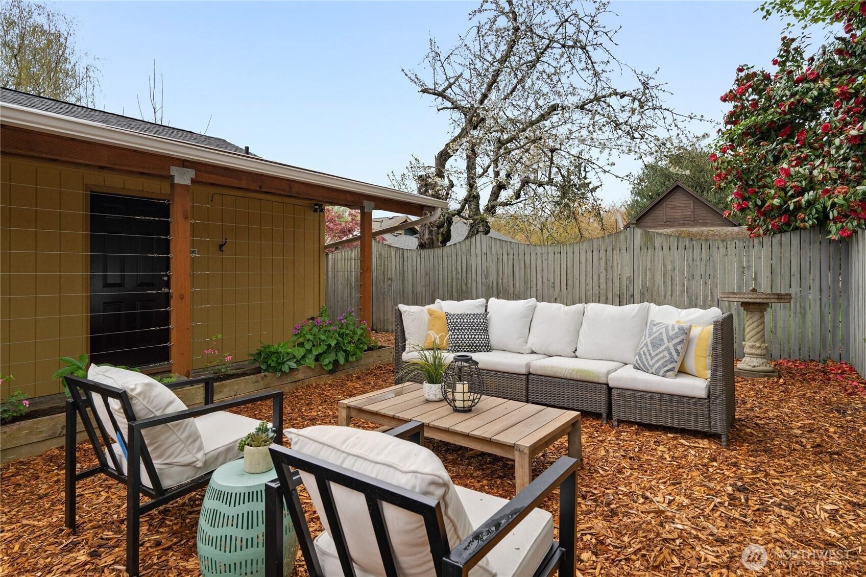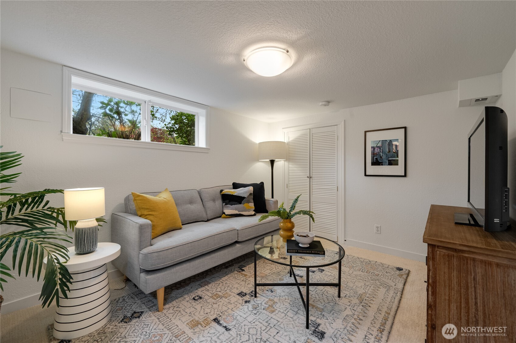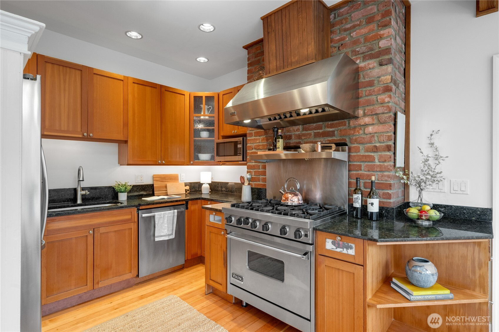 Step into this spacious, light-filled home where charm and craftsmanship meet modern living. This captivating 1927 gem exudes character and warmth, starting with inviting sunburst millwork and an enclosed front porch with leaded glass windows. Blending historic elegance with impeccable updates, from the exposed brick chimney, the refinished fir and oak wood floors, to the picture-rail molding, and metal roof. The south-facing kitchen opens to the sunny deck which overlooks the fully-fenced back yard and DADU. This gorgeous space provides the perfect backdrop for entertaining; a natural gathering place. An inviting bedroom, tv room/library, and a beautifully appointed bathroom complete the main level. Quiet and private, the upper level retreat features two bedrooms, a full bath, an inspired flex/office area with vaulted ceilings, skylights, and a washer/dryer. While the home is connected by traditional interior stairs from top to bottom, it also has a dedicated basement entrance, where you’ll find a kitchenette, 2 bedrooms, a TV room, and a washer/dryer. So many ways to utilize this space! A 50 ft long driveway and courtyard lead to the 480 sq. ft. DADU, taking things to the next level! So many options, including income generation, multi-generational living, or used as a personal space. Nestled in vibrant Loyal Heights, in a community of amazing neighbors, you are steps to Golden Gardens, Bakers, Picolino’s and all that Ballard has to offer. Prepare to fall in love.