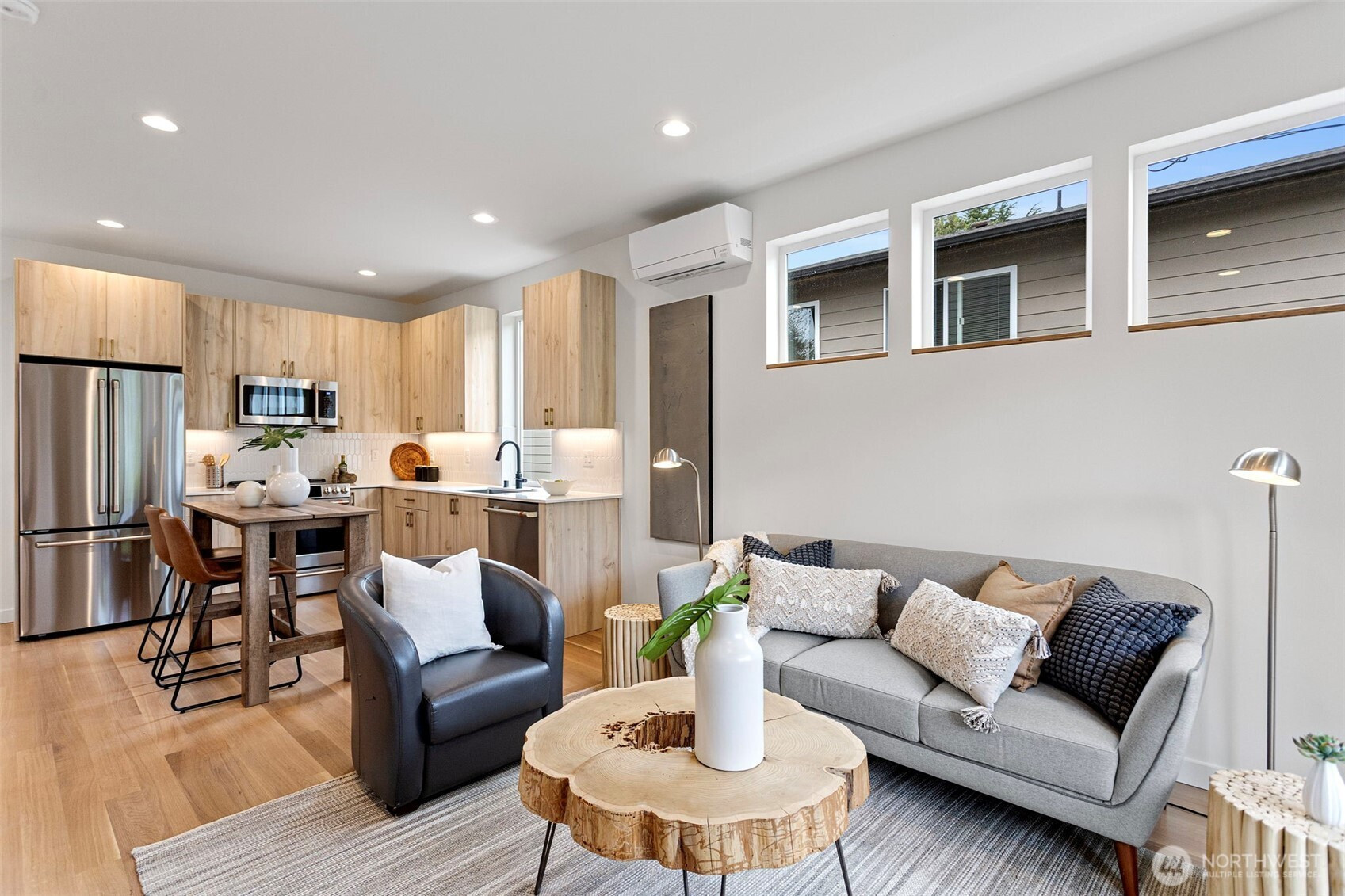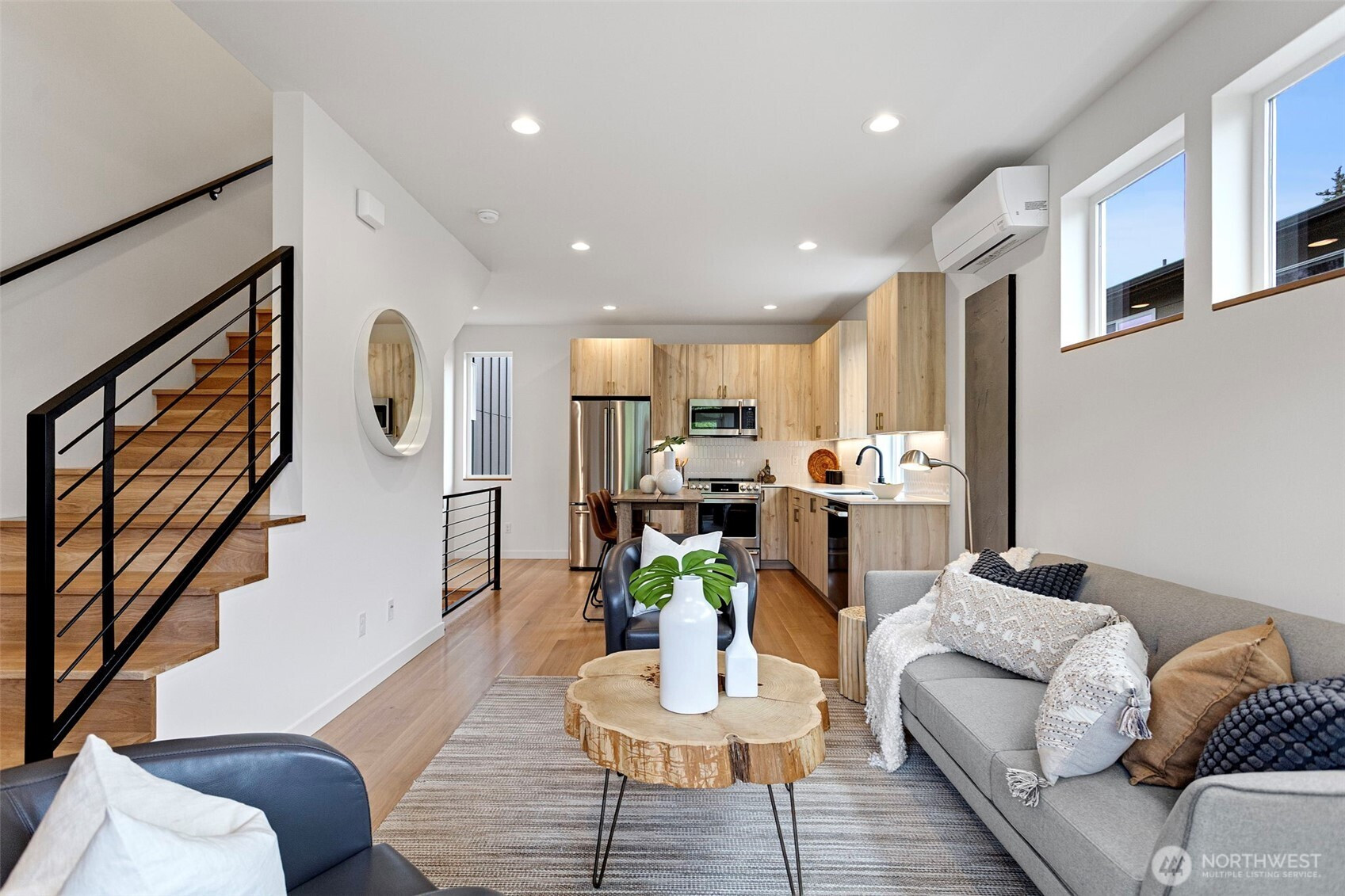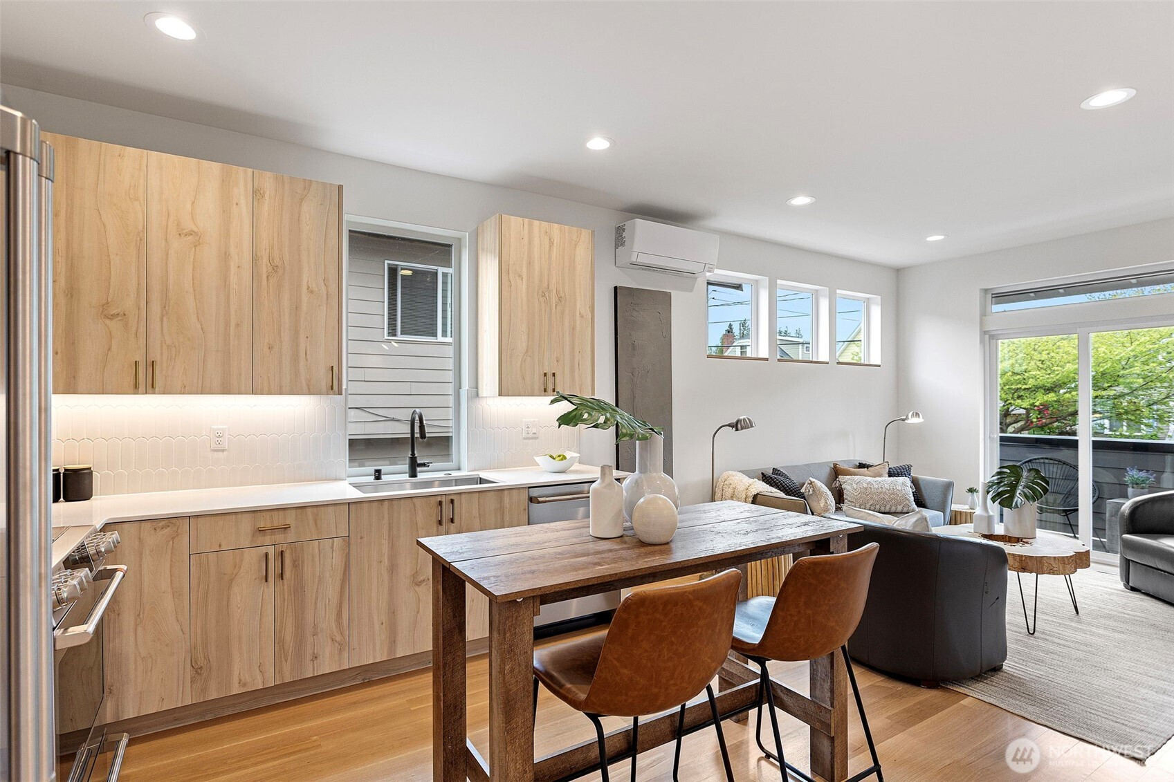 Experience elevated modern living in this impeccably crafted and perfectly located new construction home in the sought-after Loyal Heights neighborhood by Pivotal Homes. Designed with both sophistication and practicality in mind, this residence features 2 bedrooms and 2.25 baths, offering a seamless blend of contemporary style and everyday livability. Dramatic vaulted ceilings and expansive full-height windows bathe the home in natural light, enhancing the open-concept design and showcasing the beautiful real hardwood floors throughout. The thoughtfully appointed kitchen has high-quality finishes and effortlessly connects to the main living area—ideal for both entertaining and unwinding. On the main level, a flexible space serves perfectly as a storage area/office/or play room, adding versatility to the layout. Additional features include A/C units in the bedrooms, convenient parking with EV charging, and an unbeatable location just minutes from Ballard’s vibrant shops, dining, and nightlife. A rare opportunity to enjoy modern design, sustainable living, and urban convenience in one exceptional home.