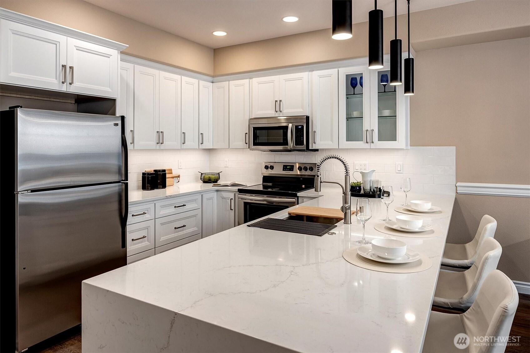 If you’ve been waiting for the one that truly stands apart - this is it! Fully remodeled and finished to a higher standard, this stunning second-floor condo goes beyond turnkey and outshines brand-new construction. Nestled in a quiet boutique building with ELEVATOR access & step-free entry, it offers refined single-level living with soaring 9’ ceilings & abundant natural light. Luxury vinyl plank flooring flows throughout, anchored by a cozy gas fireplace & opening to a bright, inviting balcony. The chef-inspired kitchen features dramatic quartz waterfall countertops, gorgeous new cabinetry, ample prep space, plus a stainless appliance package. Super expansive primary suite includes an enormous walk-in closet & a fully renovated bath with double sinks, quartz counters, tile flooring, and a large walk-in shower. The second bath is also fully remodeled with matching high-end finishes. Every room is equipped with a sleek, ceiling-mounted mini-split system for remote-controlled heating & A/C. Additional upgrades include brand new water heater, fresh paint, updated millwork, switches & outlets, new washer/dryer. Two assigned parking spaces (secured garage + uncovered) & a large indoor storage room add rare convenience. Perfectly located across from Rhododendron Park & moments from Inglewood Golf Club, city center amenities, boat launch access, the Sammamish River & the Burke-Gilman Trail. Bonus: seller is prepaying one full year of HOA dues for the buyer. It can’t get any better!