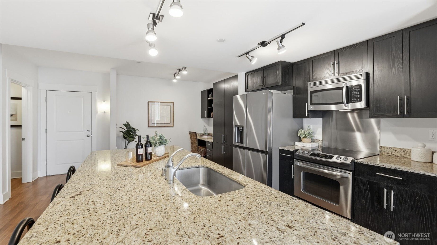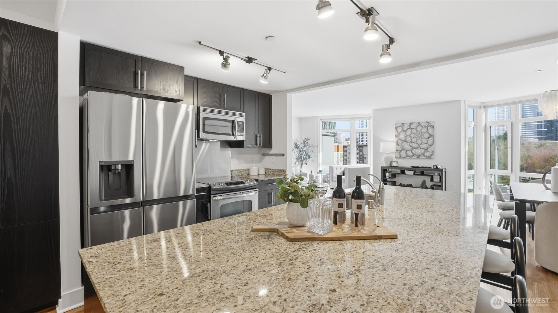 W I D E...O P E N...Not your average condo...Step through the front door to a greatroom style kitchen you would expect to find in a 5,000 sqft house. Centering the residence is a 4' x 9' kitchen island with slab granite counters, expansive cabinets, storage & prep space. Enjoy city views & ample natural light from the floor-to-ceiling windows which cantilever over a tree-lined boulevard. Brilliant floorplan with newly refinished walnut floors, bedroom "wings" on either end of the living & dining area includes an owners suite with huge walk-in closet & attached bathroom with frameless walk-in shower. Epicenter location where Belltown, Queen Anne & SLU meet; you are only a couple blocks from Seattle Center, Space Needle, Apple, Amazon, Meta & Google. Two secured garage parking spaces, storage unit & lobby entry. Amenities include a gym & yoga studio, 3 rooftop view decks with BBQ, pet-relief area & community lounge. Prime investment with on-site property manager & no rental cap.