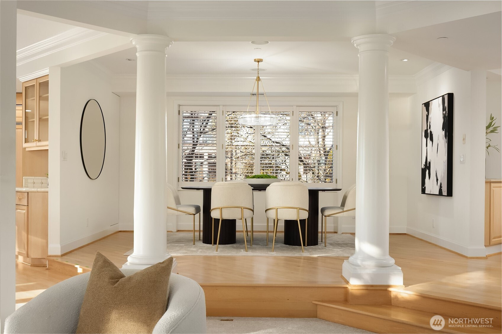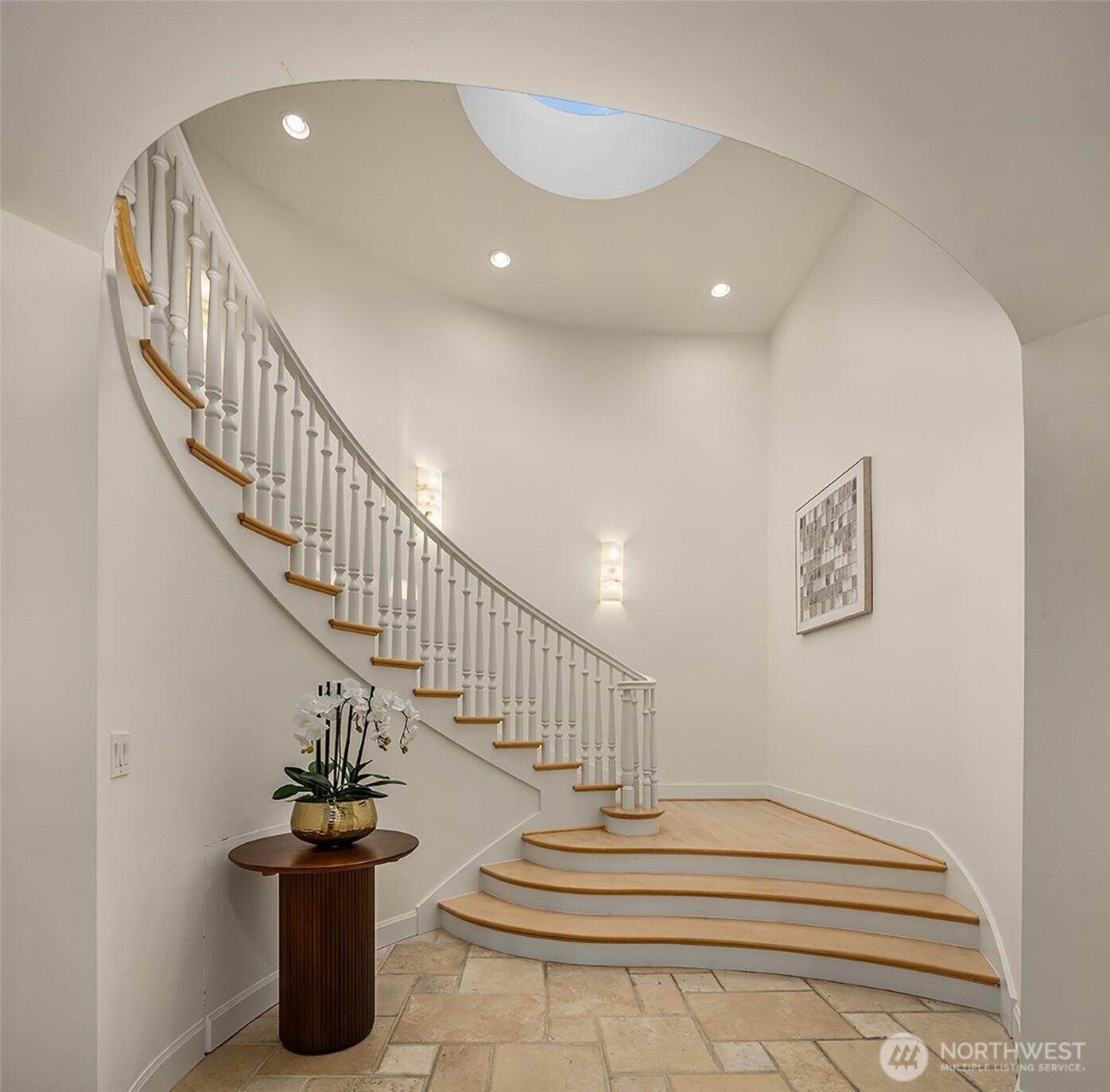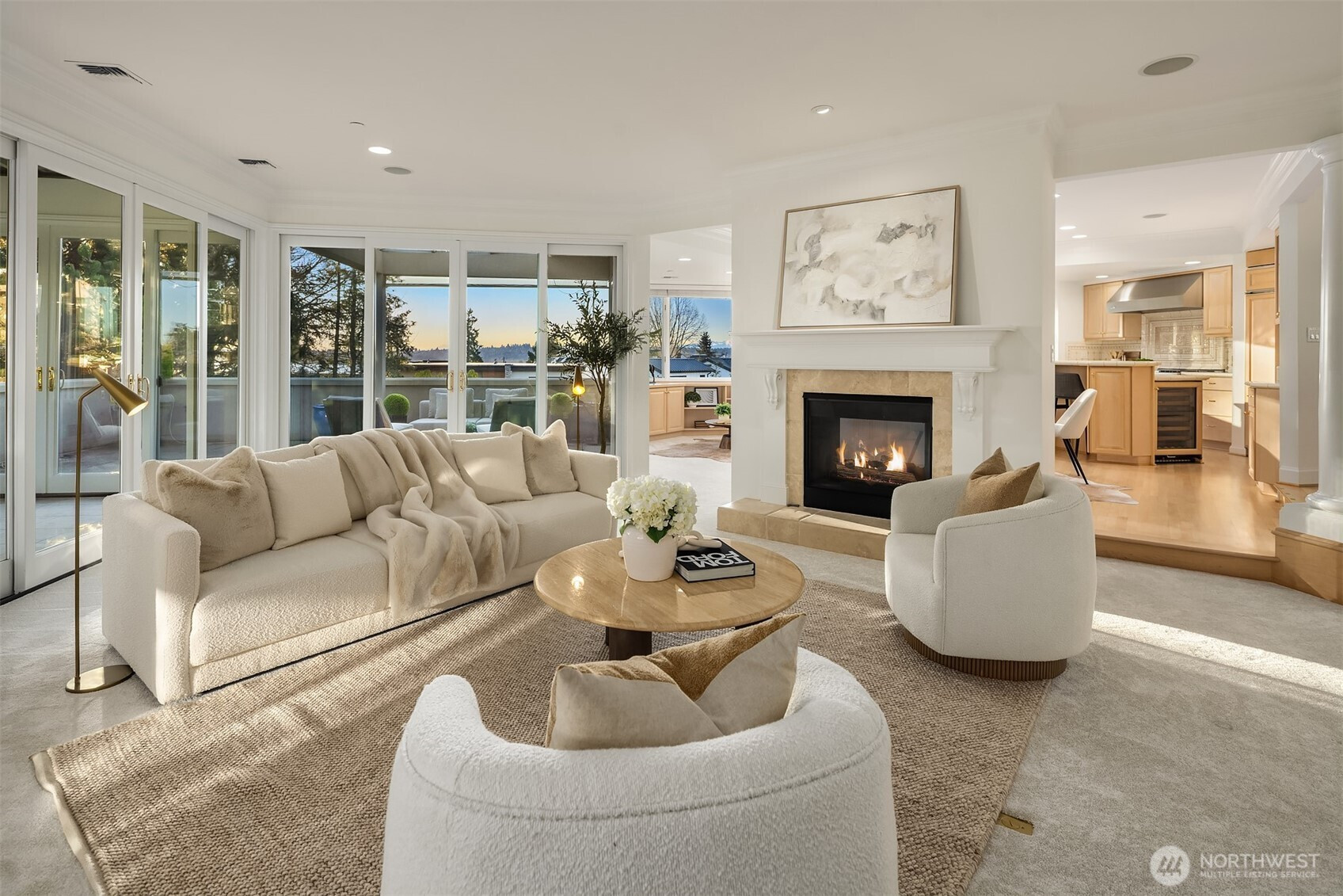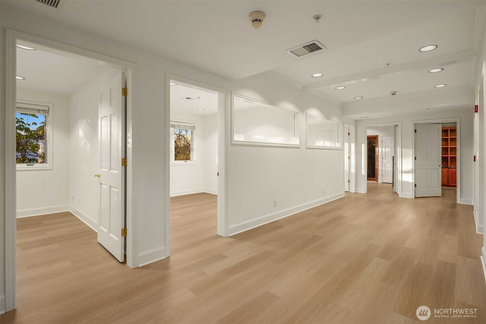 Functioning as one of the Eastside’s only true live-and-work buildings, this Market Street address is purpose-built in Downtown Kirkland. Designed for an owner seeking both residential luxury and professional functionality, the property offers rare flexibility without compromise. The top-floor penthouse residence makes a lasting first impression. A sculptural entry unfolds beneath a soaring curved ceiling, illuminated by natural light. A sweeping staircase traces the wall above layered stone flooring, setting the tone for what follows. Spanning three versatile levels to suit a dual purpose owner, the home is finished in hardwood and surrounded by expansive windows capturing Market Street outlooks. The living room is set by architectural pillars and a statement fireplace, while the sky deck opens to panoramic views of Lake Washington. The primary suite features a sitting area, fireplace, and refined five-piece spa bath. A private office completes the penthouse level. Each floor has a secure entrance, allowing separation of residential and professional use. The professional space begins with a formal hallway for private clients from the parking area into a reception area, 4 private offices & a boardroom. The ground level has four ensuite bedrooms and plumbing in place for a second full kitchen. Offering over 7,000 square feet of scale, this is an offering rarely seen in Kirkland.