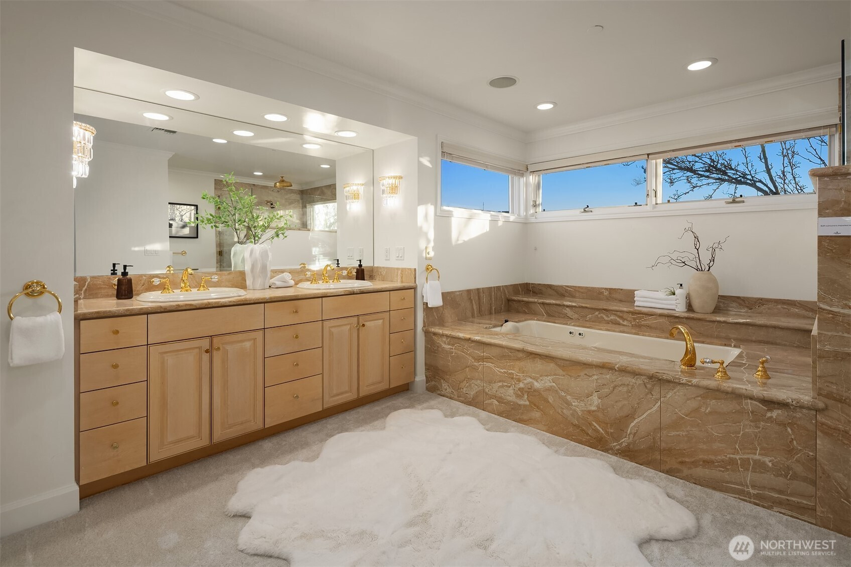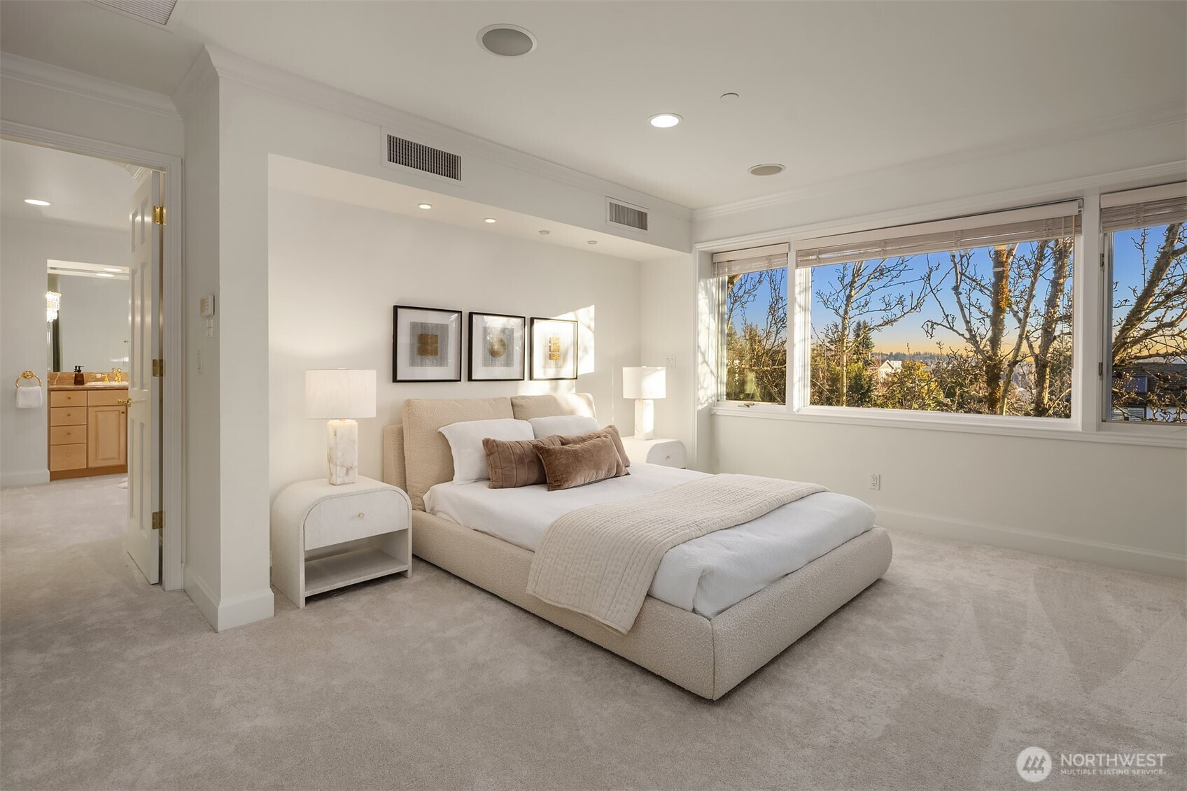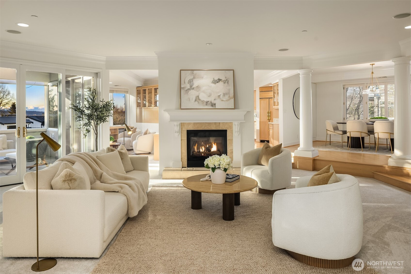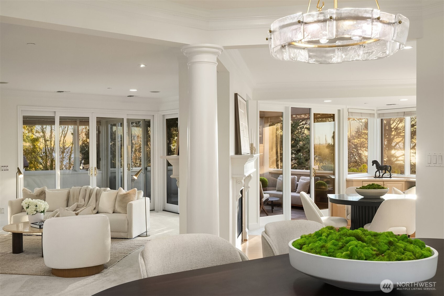 Functioning as one of the Eastside’s only true live-and-work buildings, this Market Street address is purpose-built in Downtown Kirkland. Designed for an owner seeking both residential luxury and professional functionality, the property offers rare flexibility without compromise. The top-floor penthouse residence makes a lasting first impression. A sculptural entry unfolds beneath a soaring curved ceiling, illuminated by natural light. A sweeping staircase traces the wall above layered stone flooring, setting the tone for what follows. Spanning three versatile levels to suit a dual purpose owner, the home is finished in hardwood and surrounded by expansive windows capturing Market Street outlooks. The living room is set by architectural pillars and a statement fireplace, while the sky deck opens to panoramic views of Lake Washington. The primary suite features a sitting area, fireplace, and refined five-piece spa bath. A private office completes the penthouse level. Each floor has a secure entrance, allowing separation of residential and professional use. The professional space begins with a formal hallway for private clients from the parking area into a reception area, 4 private offices & a boardroom. The ground level has four ensuite bedrooms and plumbing in place for a second full kitchen. Offering over 7,000 square feet of scale, this is an offering rarely seen in Kirkland.