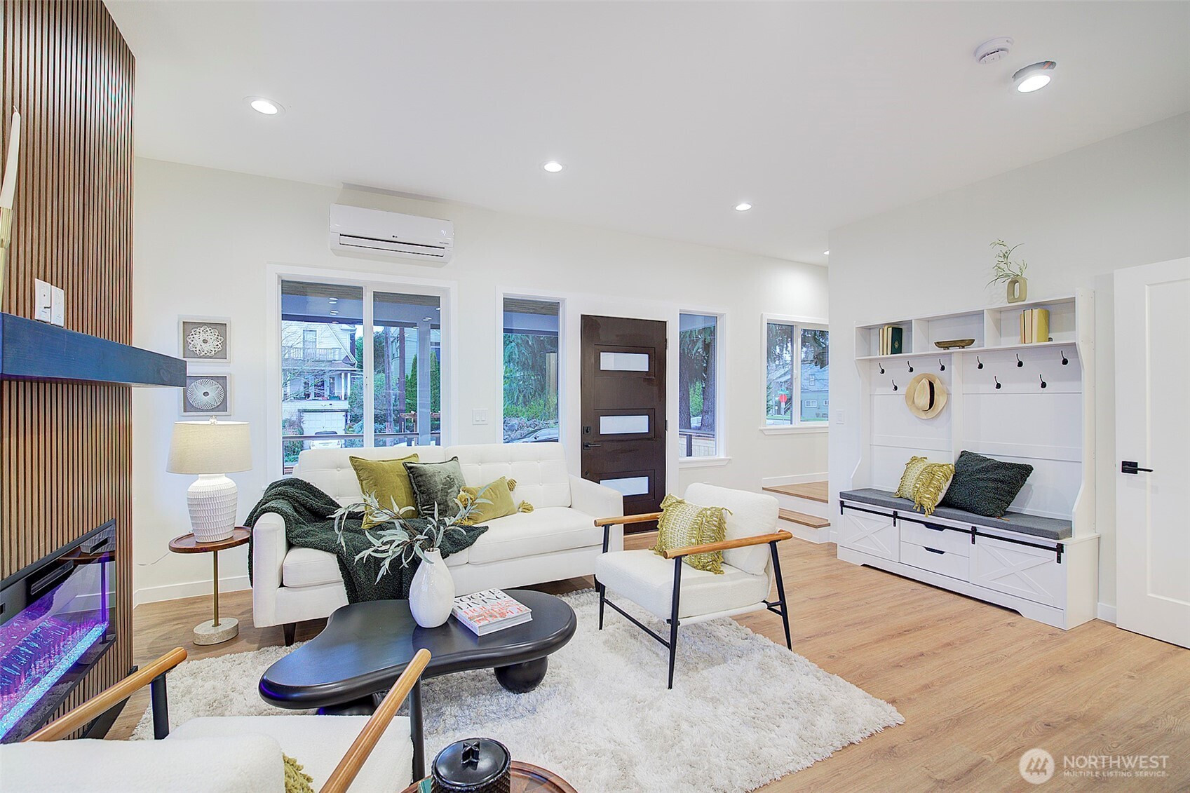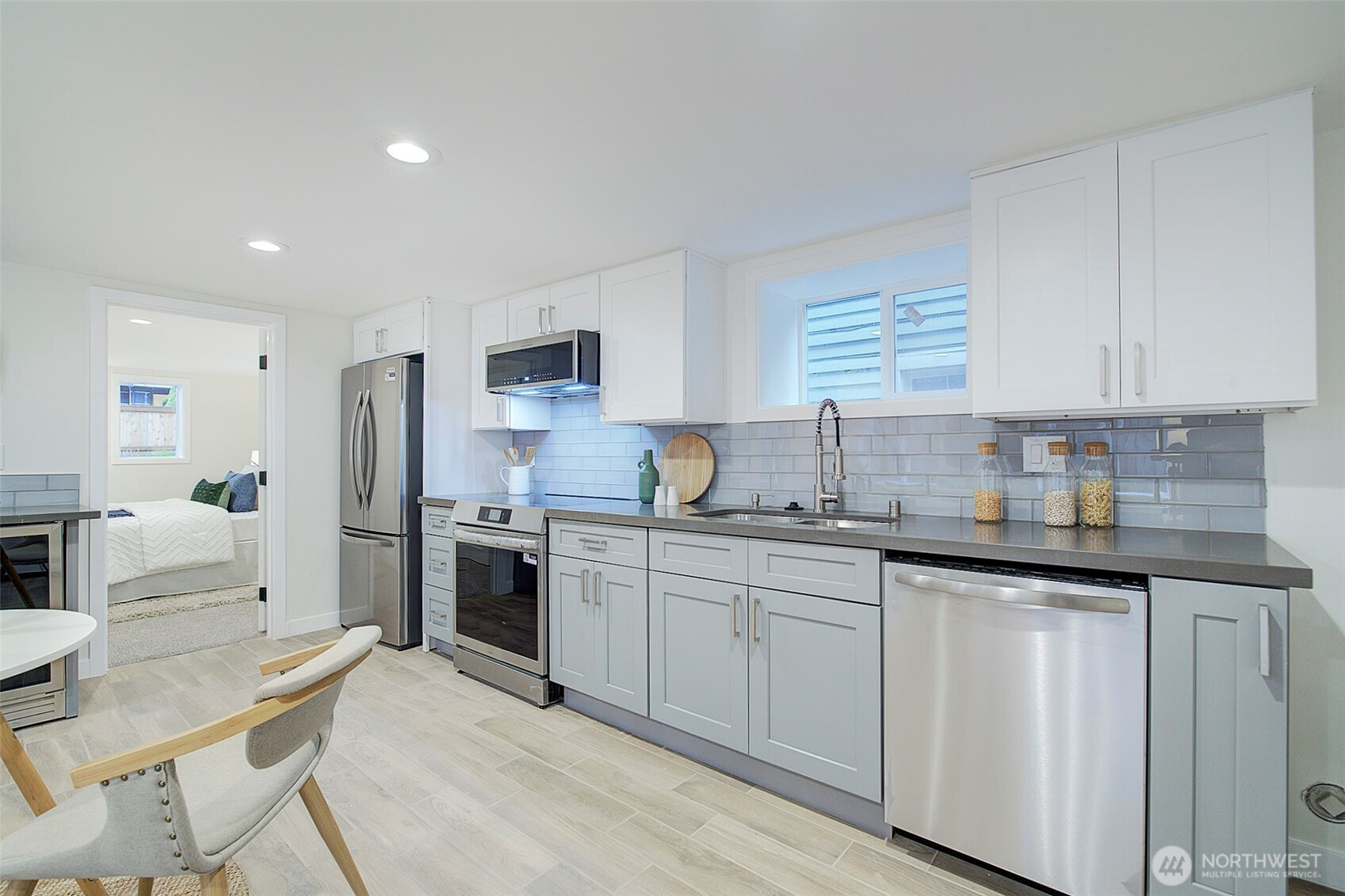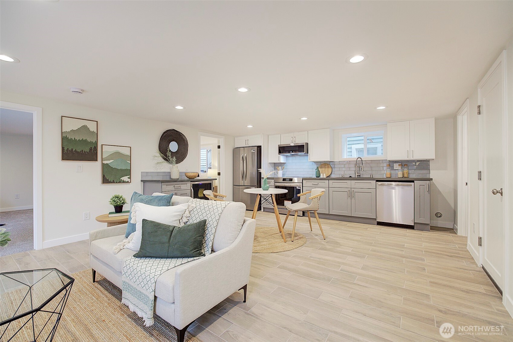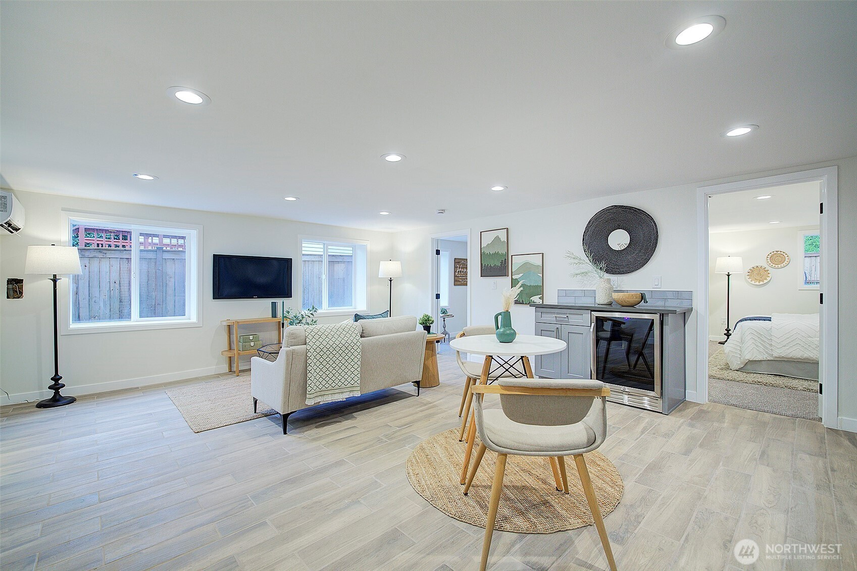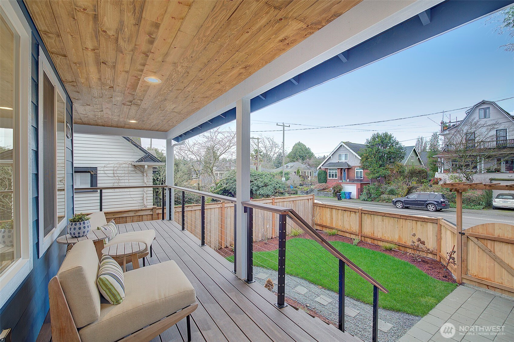 Re-imagined Craftsman, thoughtfully updated to meet today’s discerning tastes. This fully permitted, legal duplex features a 4 bed/3.25 bath main home and a private-entry ADU offering two bedrooms and one full bath—perfect for multi-generational living or added rental income you can leverage for the upcoming FIFA World Cup. Inside the main home, 9+ ft ceilings and western exposure create a bright, open feel. The chef-inspired kitchen features quartz countertops and mostly WiFi-enabled stainless steel appliances, blending style with modern convenience. The serene primary suite includes a walk-in closet and a private deck, ideal for cozy evenings with lake views, along with heated flooring in the primary bath for added comfort. Private-entry ADU offers 2 bed/1 bath, providing flexibility for guests, extended living, or income potential. Intentional outdoor living with 480 sq ft deck + 120 sq ft of storage beneath. Alley access provides parking for four to five vehicles. The full renovation showcases new electrical, HVAC, plumbing, roofing, framing, and siding, along with efficient mini-split heating and cooling rated for sub-zero weather, dedicated dog washing station for fur babies, Milgard windows, two electric meters, hybrid water heaters for each unit, and car charger readiness. Smart transparency technology on the kitchen and deck doors adds modern, functional touch. Just a few minutes’ walk to Green Lake, and easy access to parks, the zoo, shops, and more.