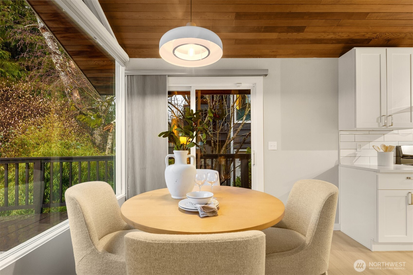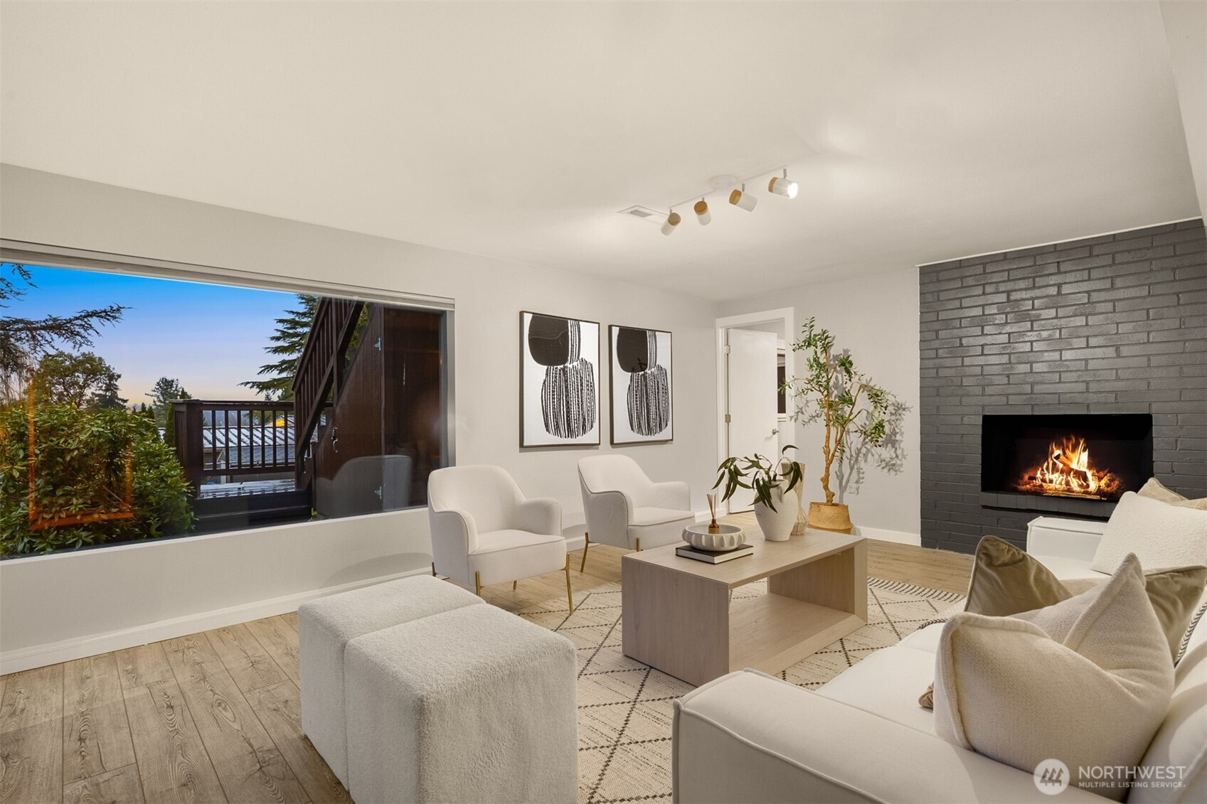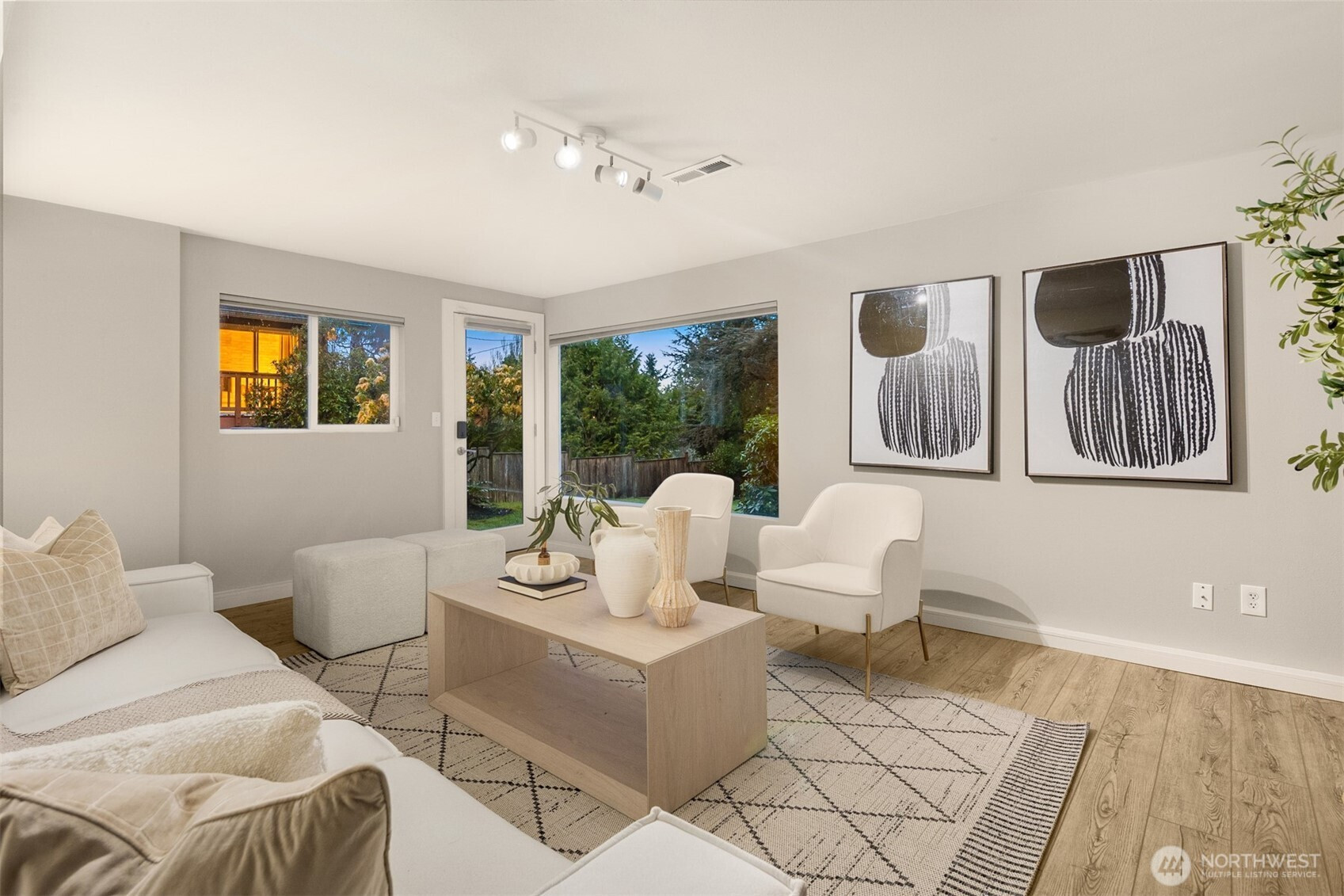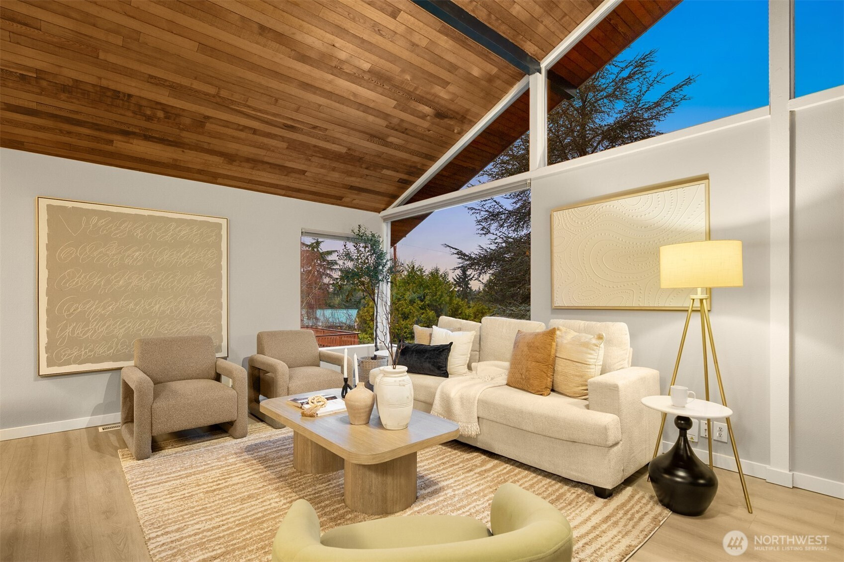 Stunning Mid-Century home with sweeping territorial views and effortless style. Soaring ceilings, oversized windows, and an open floor plan introduce so much light into the home. The chef’s kitchen dazzles — breakfast bar, serving counter, gas range, tile backsplash, & quartz counter tops. Very functional floor plan includes: four beds, 2 full baths and one 3/4 bath, master suite on main floor, two fireplaces, living, dining, rec room, office, bonus room, and large laundry room. Updates include: new flooring, new carpet, new lighting package, interior paint, yard refresh, and more! Private backyard with generous deck, garden space, patio, plus a two-car garage with workshop space. Enjoy territorial views as you watch the eagles soar across tree tops. Walking distance to top-rated Arrowhead Elementary (Northshore SD), walkable to a fantastic restaurant, and minutes from 326-acre St. Edward State Park — 9+ miles of forested trails leading to Lake Washington’s undeveloped shoreline, or enjoy the restaurants at The Lodge!