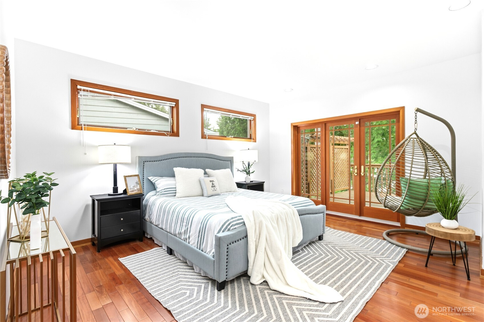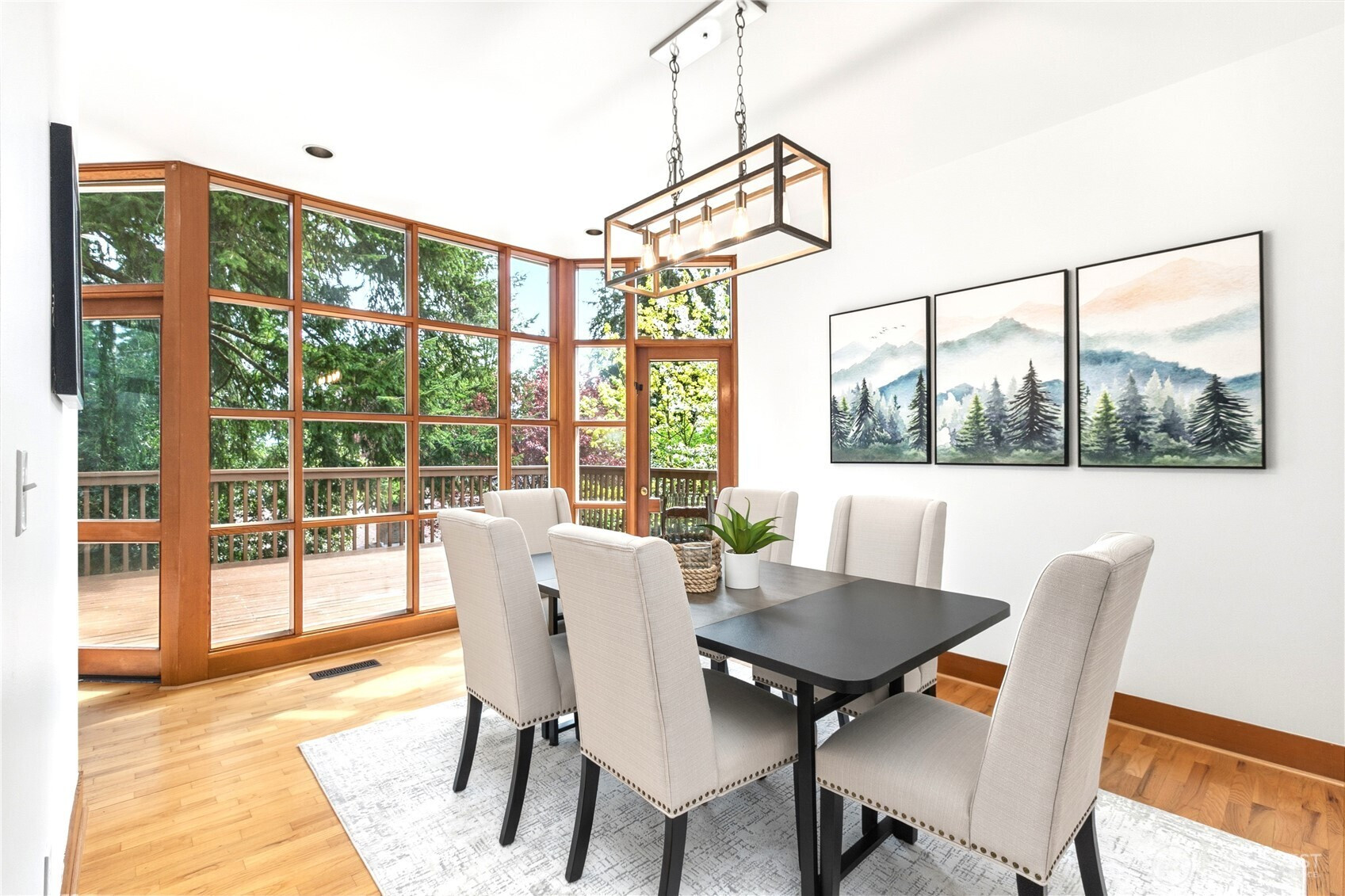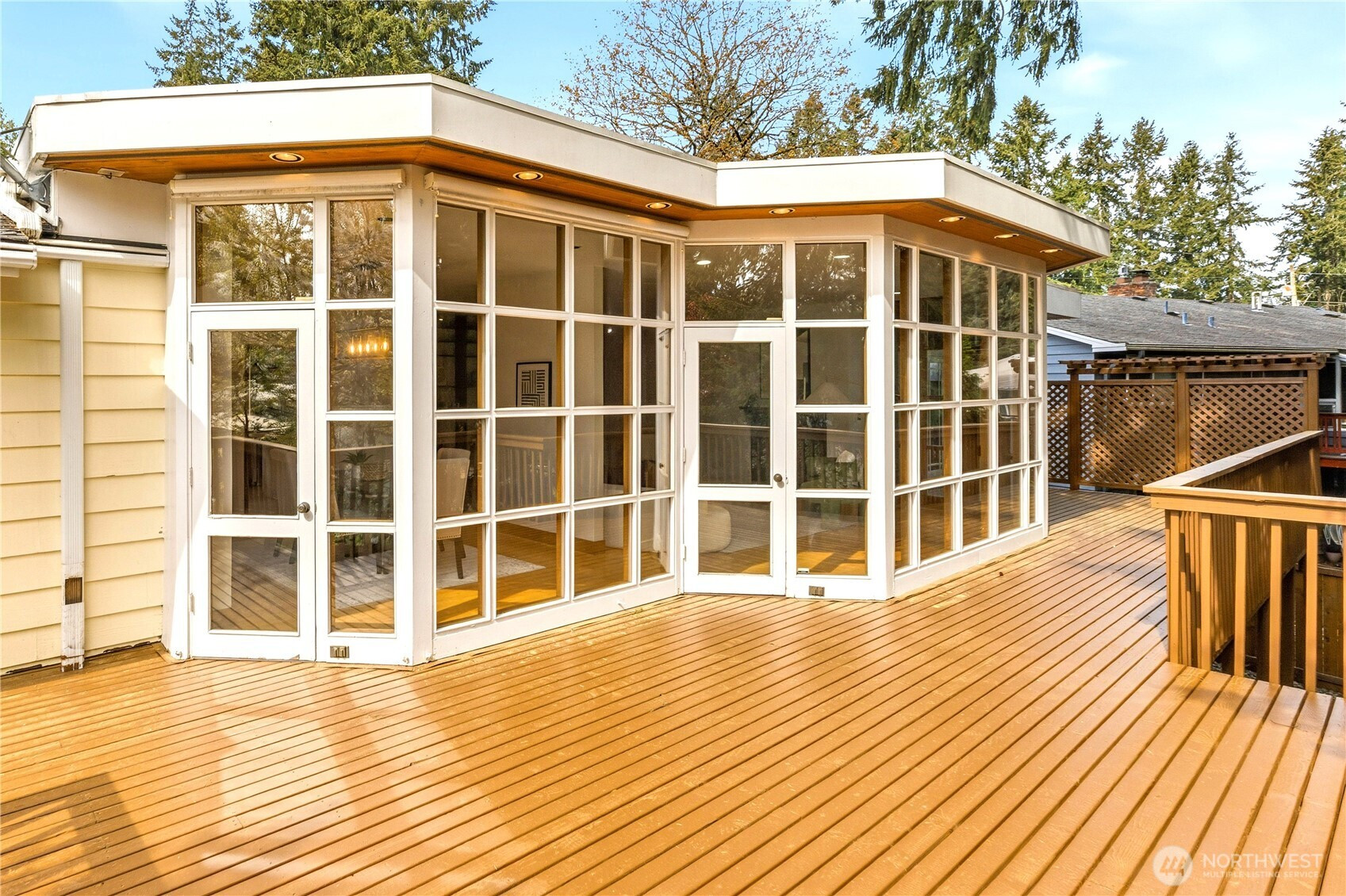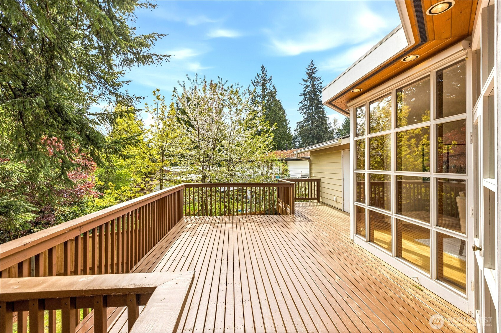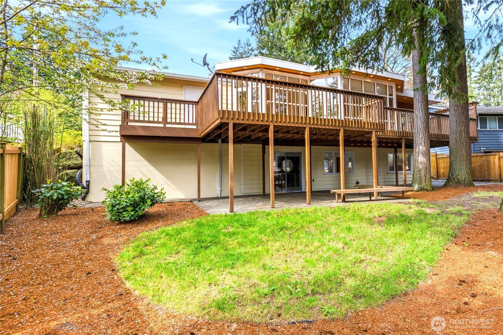 Beautifully updated contemporary home in a prime Redmond location in the heart of the Eastside tech hub. This 3,000 sq ft South-East facing home offers expansive living spaces, abundant natural light, and seamless indoor-outdoor flow. Vaulted ceilings and dramatic wood-framed windows, including a stunning glass wall, create a bright and airy atmosphere throughout. Sun-filled living and dining areas feature hardwood floors, built-ins, and French doors that open to a spacious deck—ideal for entertaining and enjoying the private, tree-lined setting. The updated kitchen features white cabinetry, stainless steel appliances, a wine cooler, and quartz countertops, offering ample prep and storage space. The main-level primary suite includes a well-appointed bath with a custom glass block shower, heated tile floors, steam shower, and jetted tub. The lower level offers a generous rec room with patio access, providing flexible space for guests, media, or a second living area. Recent updates include a new paint, fully redone deck, new HVAC, water heater, washer, dryer, and kitchen flooring. Huge, flat, usable front and backyard. Located just blocks from Grass Lawn Park with tennis courts, playgrounds, and picnic areas. Conveniently situated in the heart of the Eastside tech corridor, minutes to Microsoft, major employers, shopping, dining, and easy access to SR-520. Top rated LWSD schools. Pre-inspected and move-in ready.