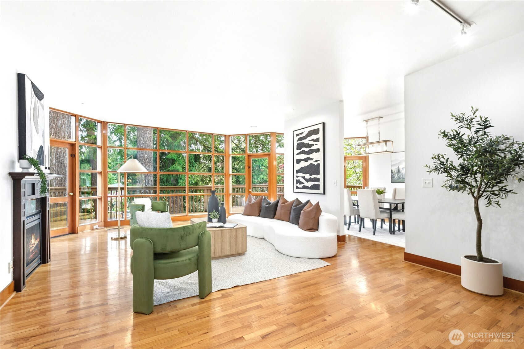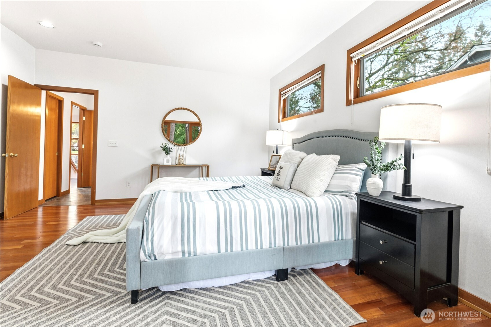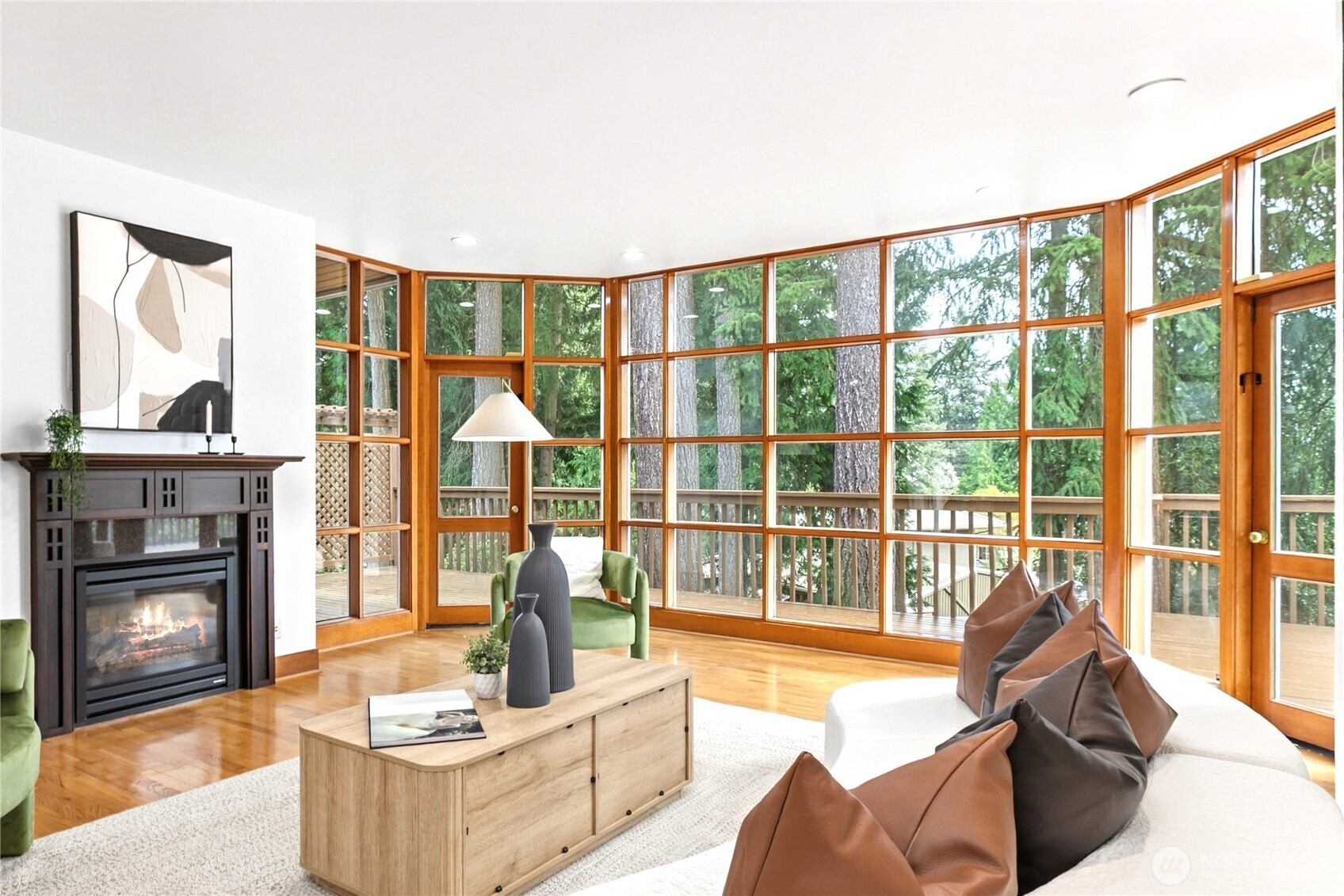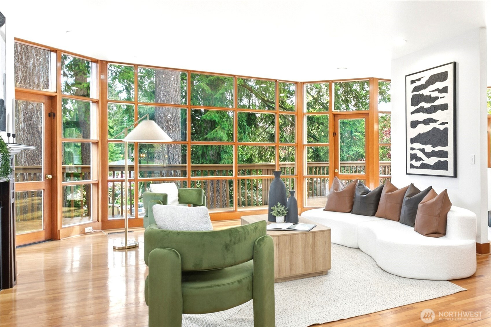 Beautifully updated contemporary home in a prime Redmond location in the heart of the Eastside tech hub. This 3,000 sq ft South-East facing home offers expansive living spaces, abundant natural light, and seamless indoor-outdoor flow. Vaulted ceilings and dramatic wood-framed windows, including a stunning glass wall, create a bright and airy atmosphere throughout. Sun-filled living and dining areas feature hardwood floors, built-ins, and French doors that open to a spacious deck—ideal for entertaining and enjoying the private, tree-lined setting. The updated kitchen features white cabinetry, stainless steel appliances, a wine cooler, and quartz countertops, offering ample prep and storage space. The main-level primary suite includes a well-appointed bath with a custom glass block shower, heated tile floors, steam shower, and jetted tub. The lower level offers a generous rec room with patio access, providing flexible space for guests, media, or a second living area. Recent updates include a new paint, fully redone deck, new HVAC, water heater, washer, dryer, and kitchen flooring. Huge, flat, usable front and backyard. Located just blocks from Grass Lawn Park with tennis courts, playgrounds, and picnic areas. Conveniently situated in the heart of the Eastside tech corridor, minutes to Microsoft, major employers, shopping, dining, and easy access to SR-520. Top rated LWSD schools. Pre-inspected and move-in ready.