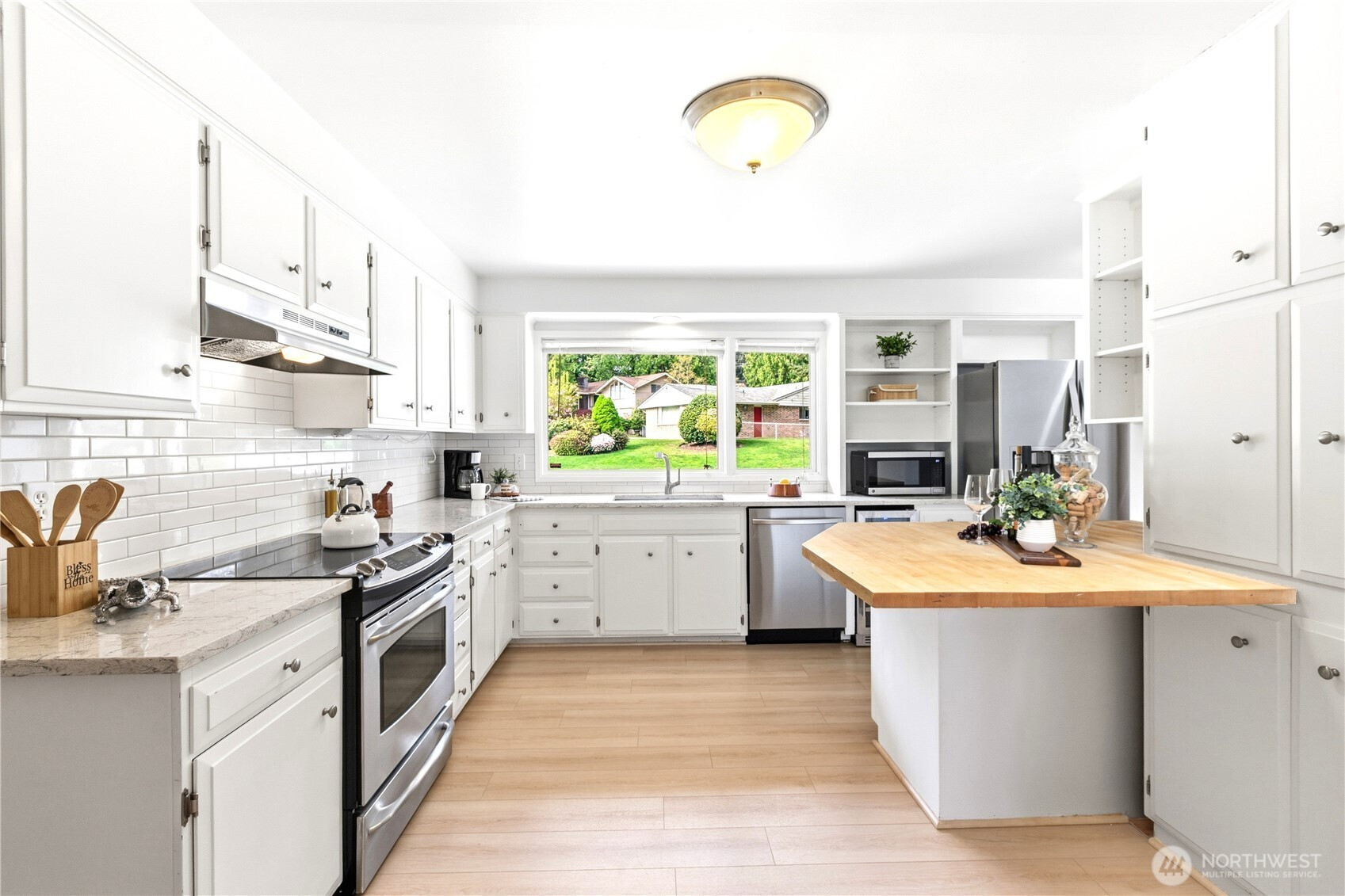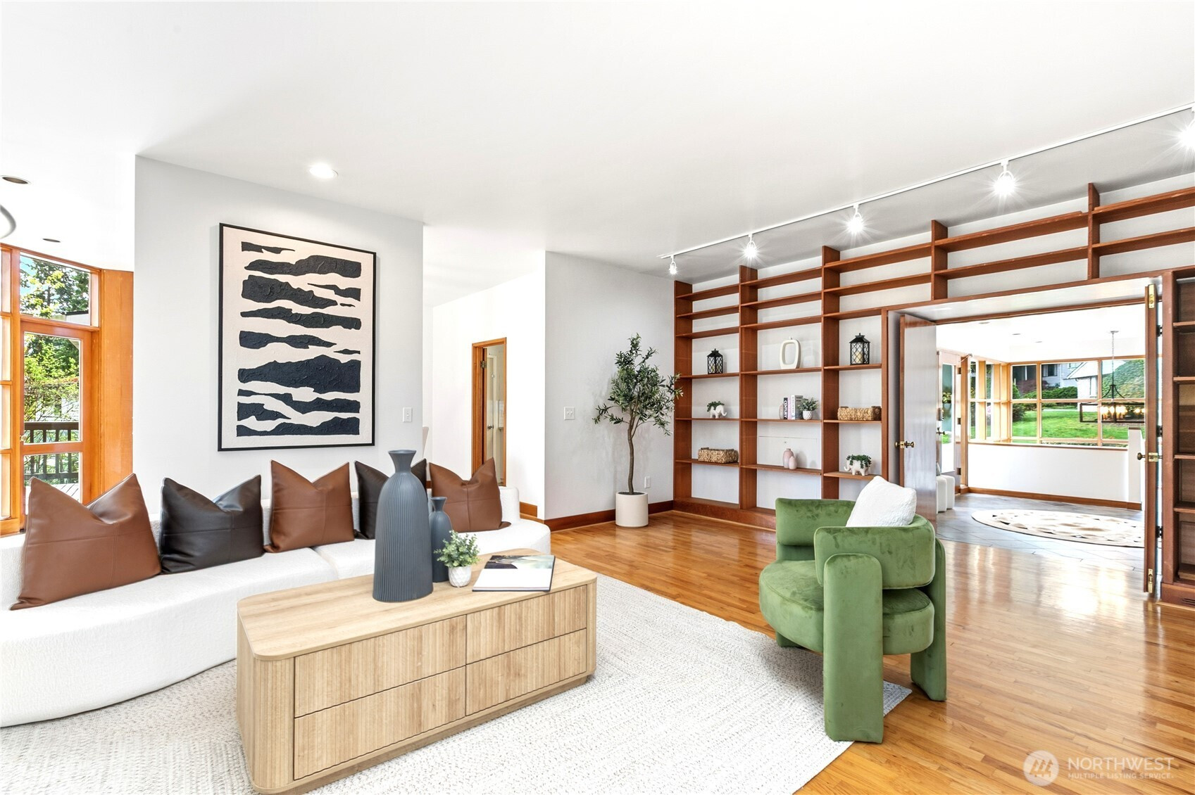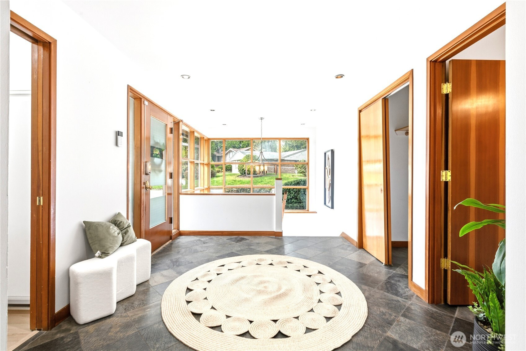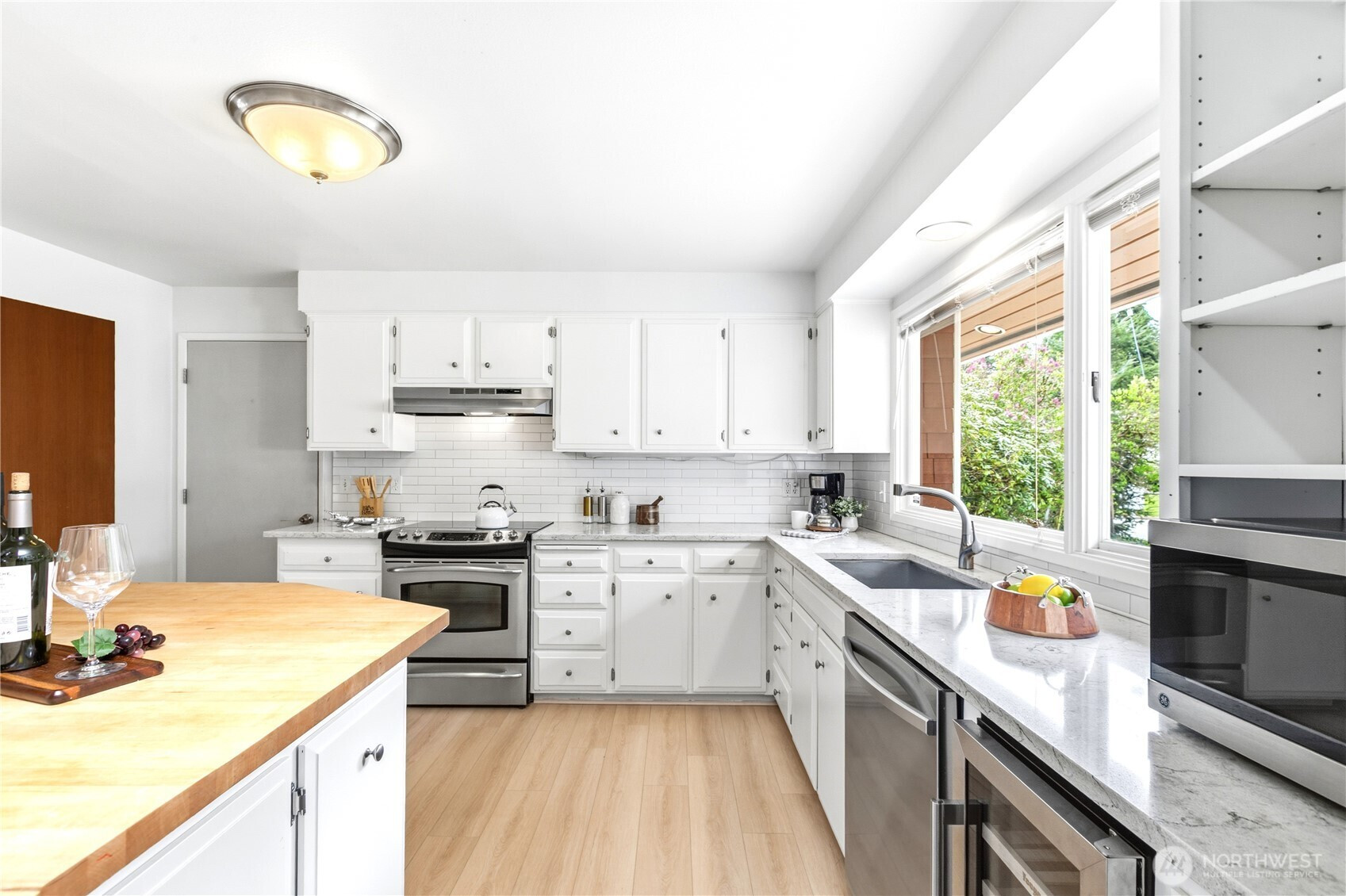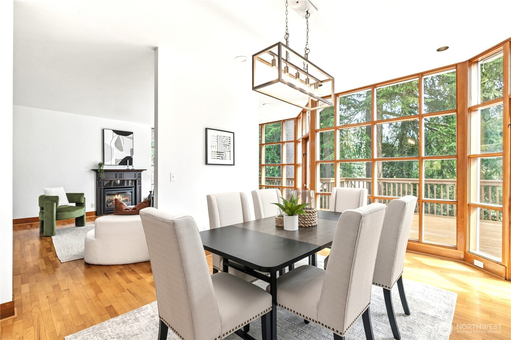 Beautifully updated contemporary home in a prime Redmond location in the heart of the Eastside tech hub. This 3,000 sq ft South-East facing home offers expansive living spaces, abundant natural light, and seamless indoor-outdoor flow. Vaulted ceilings and dramatic wood-framed windows, including a stunning glass wall, create a bright and airy atmosphere throughout. Sun-filled living and dining areas feature hardwood floors, built-ins, and French doors that open to a spacious deck—ideal for entertaining and enjoying the private, tree-lined setting. The updated kitchen features white cabinetry, stainless steel appliances, a wine cooler, and quartz countertops, offering ample prep and storage space. The main-level primary suite includes a well-appointed bath with a custom glass block shower, heated tile floors, steam shower, and jetted tub. The lower level offers a generous rec room with patio access, providing flexible space for guests, media, or a second living area. Recent updates include a new paint, fully redone deck, new HVAC, water heater, washer, dryer, and kitchen flooring. Huge, flat, usable front and backyard. Located just blocks from Grass Lawn Park with tennis courts, playgrounds, and picnic areas. Conveniently situated in the heart of the Eastside tech corridor, minutes to Microsoft, major employers, shopping, dining, and easy access to SR-520. Top rated LWSD schools. Pre-inspected and move-in ready.